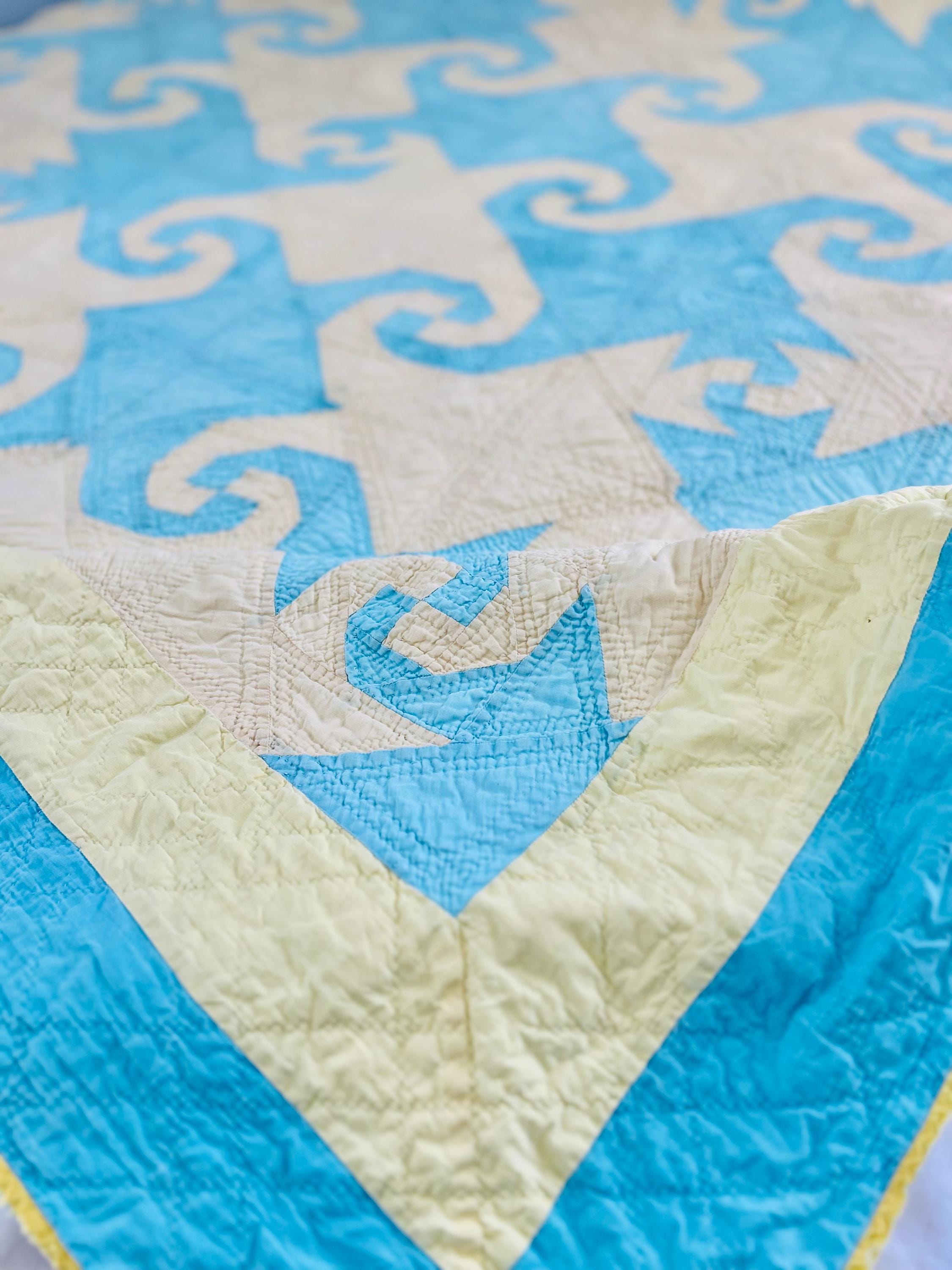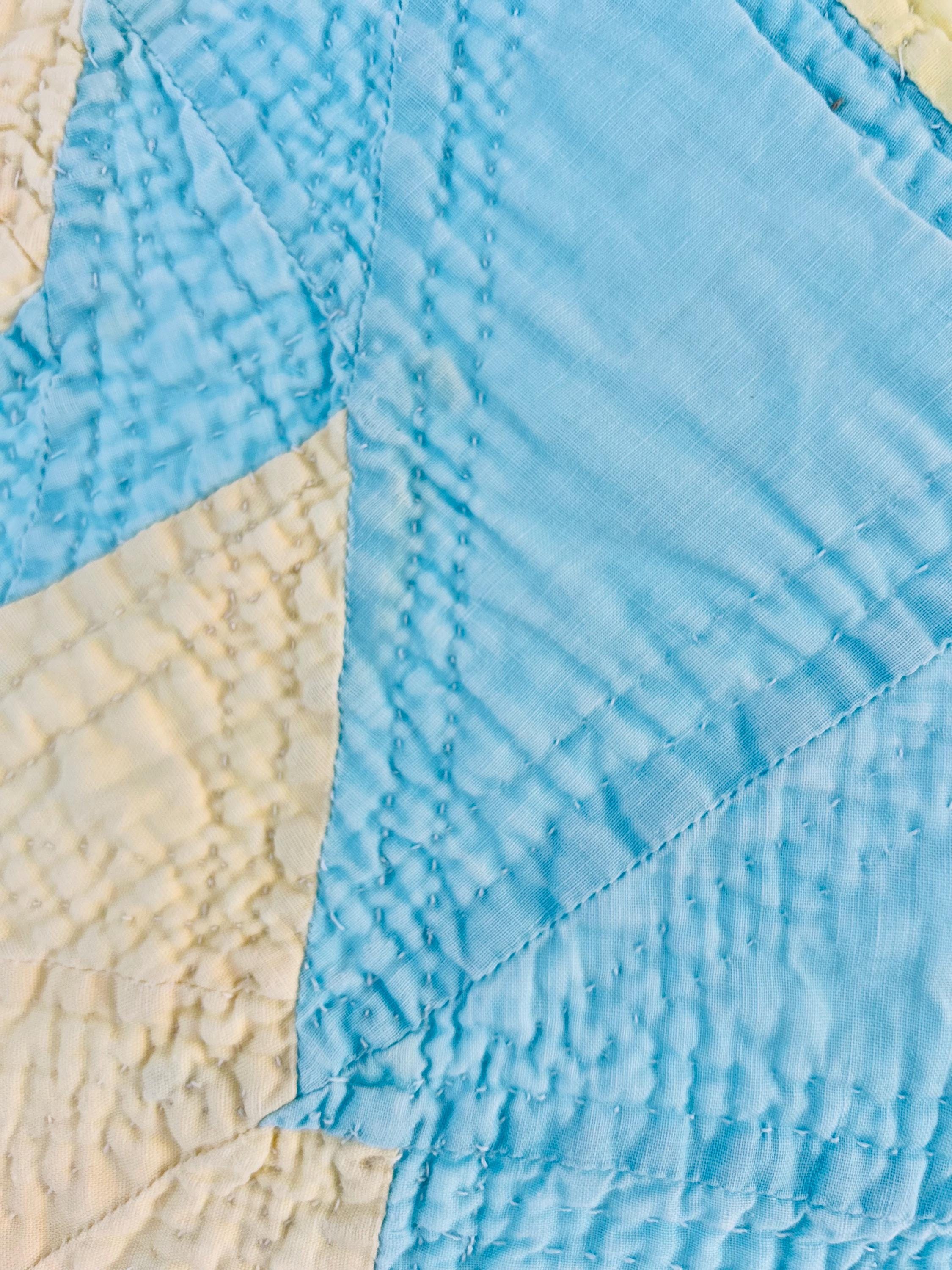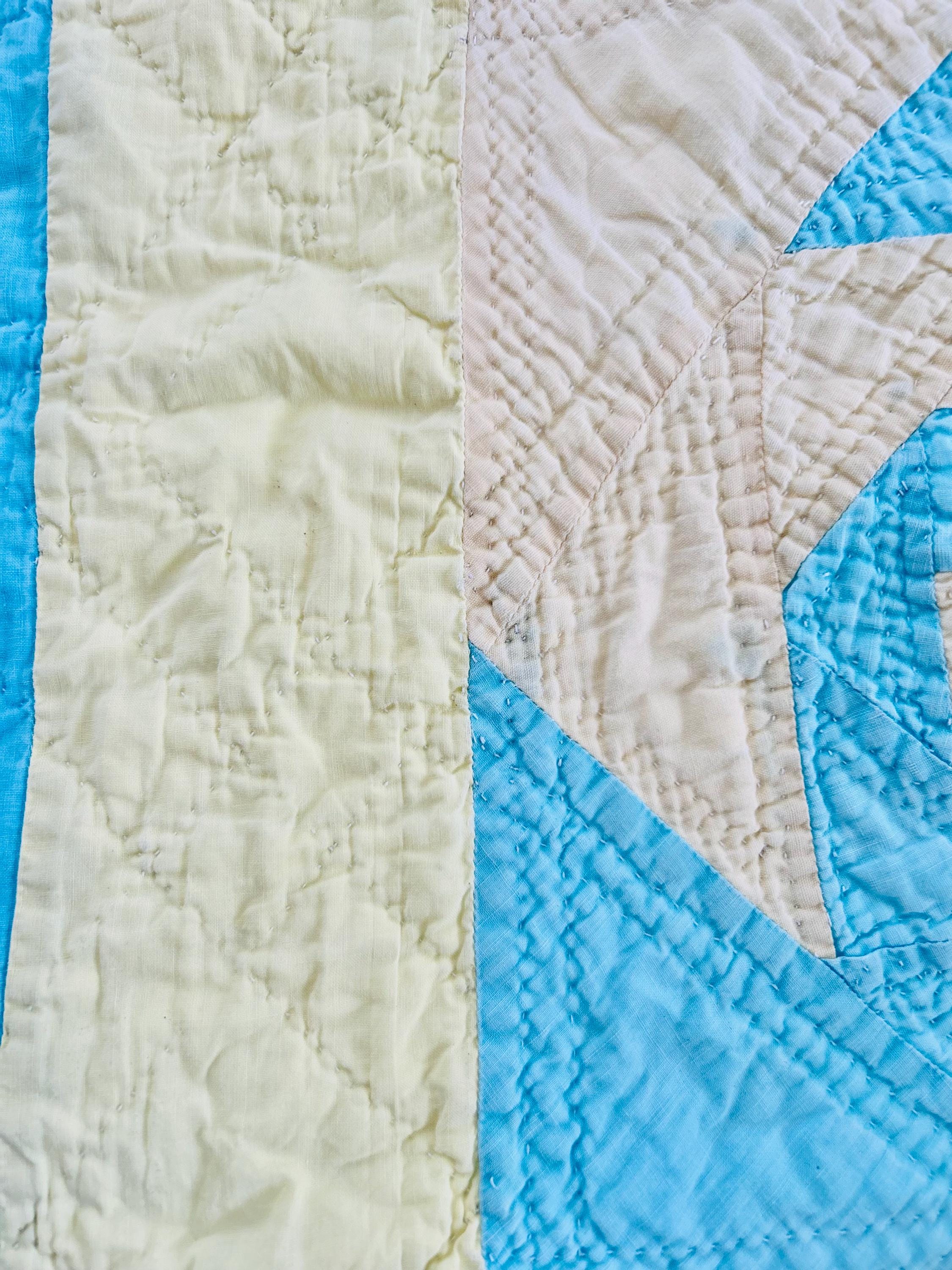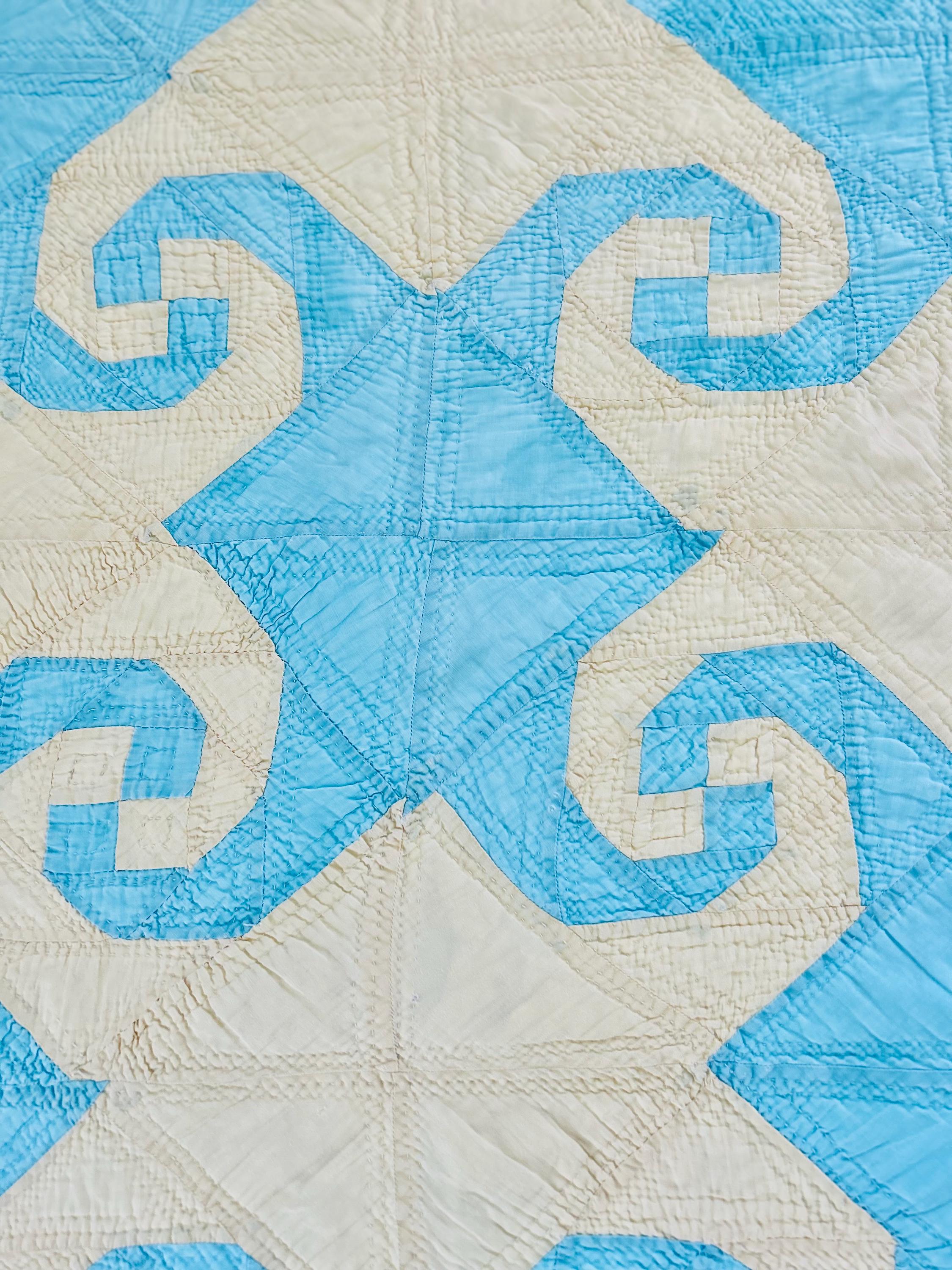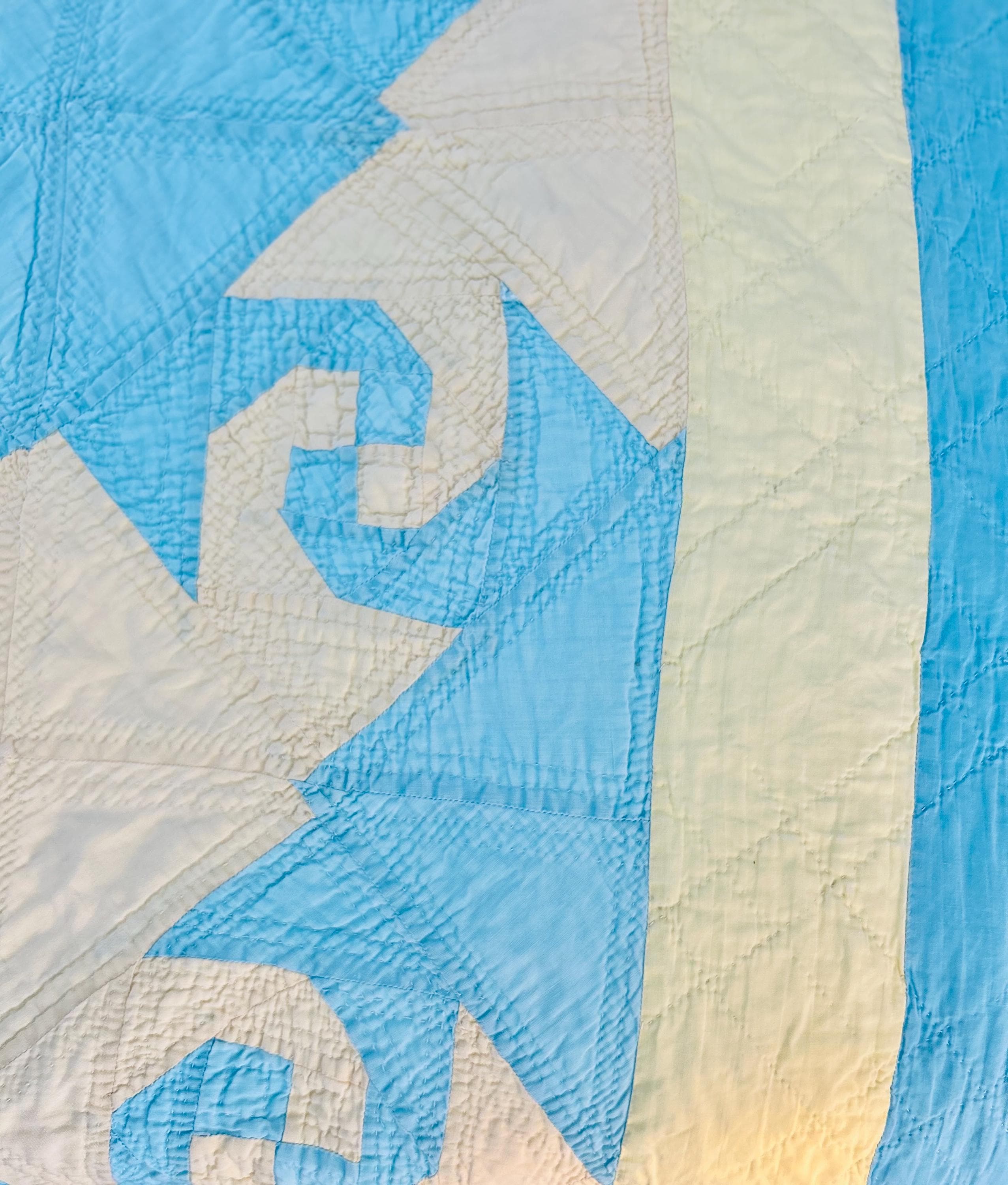 This striking and rare Indiana Puzzle or Snail Trail Quilt, circa 1900, has a whirlwind feel to it, with its sky-blue and buttercream fabrics shaped like waves cresting and breaking. It has been so densely hand-quilted that in some locations it is stippled. The quilting is in double and triple diagonals and repeating outlines of the patchwork. The four-sided border is sky blue and yellow and has been quilted in diamonds.