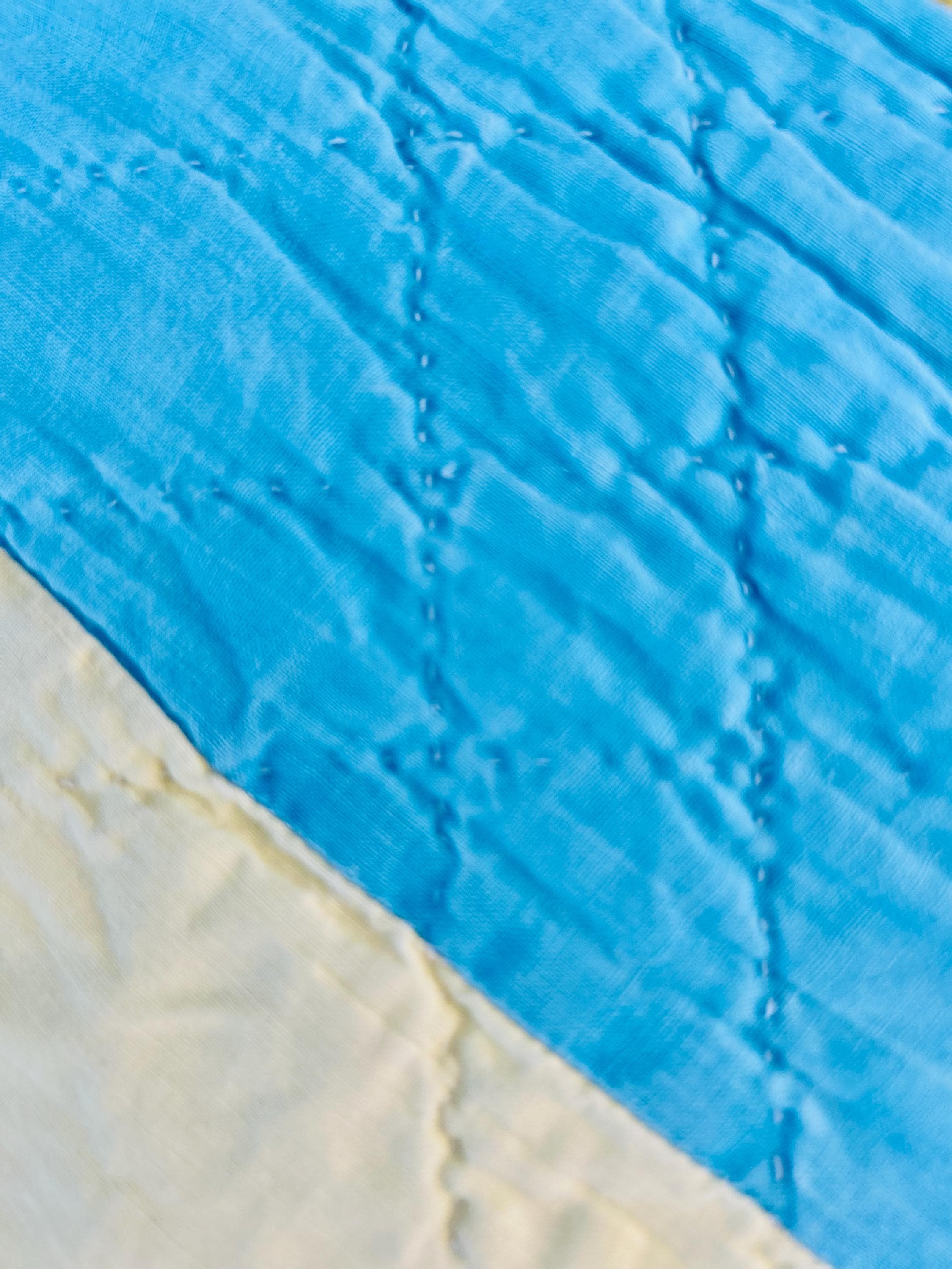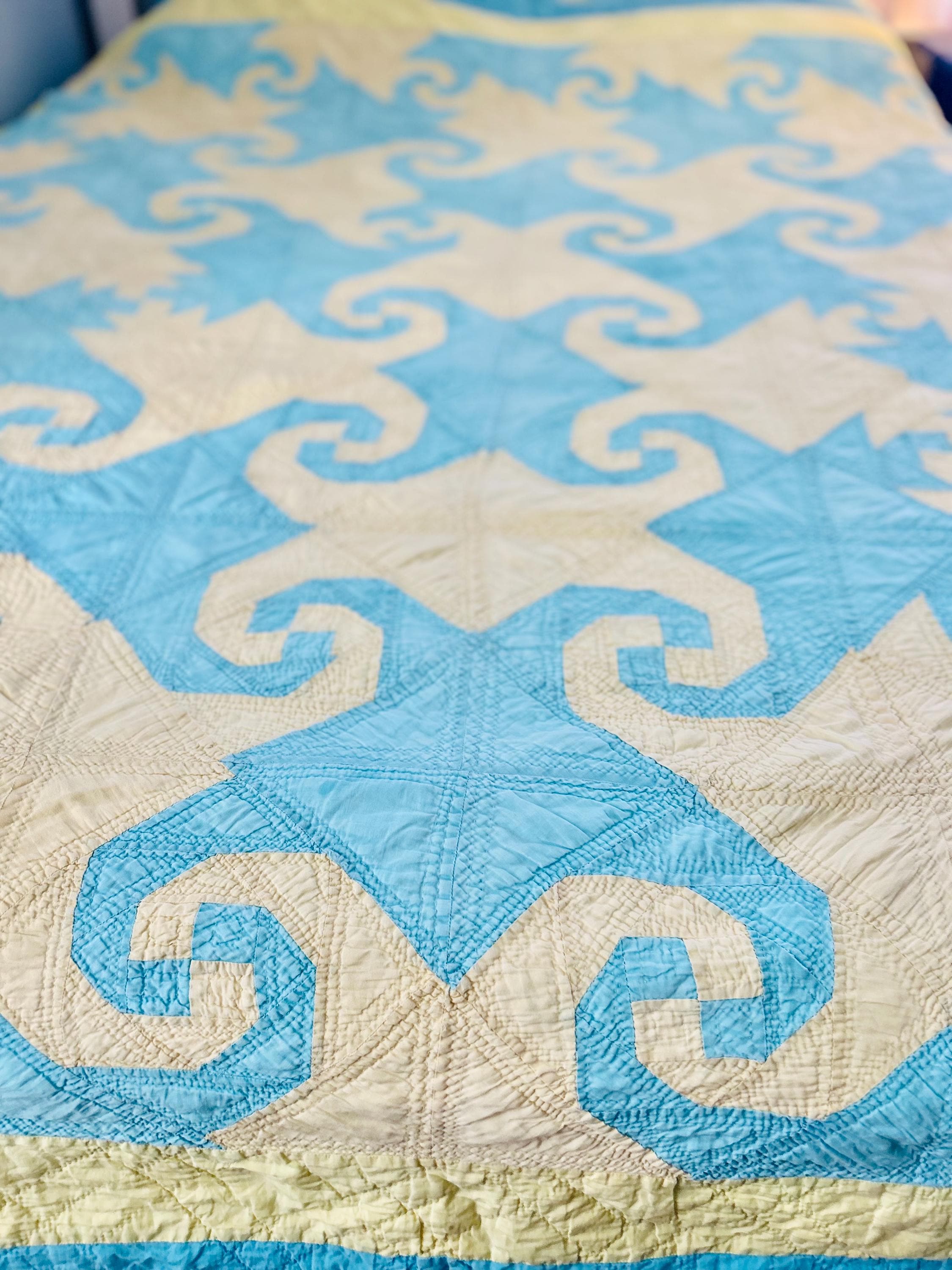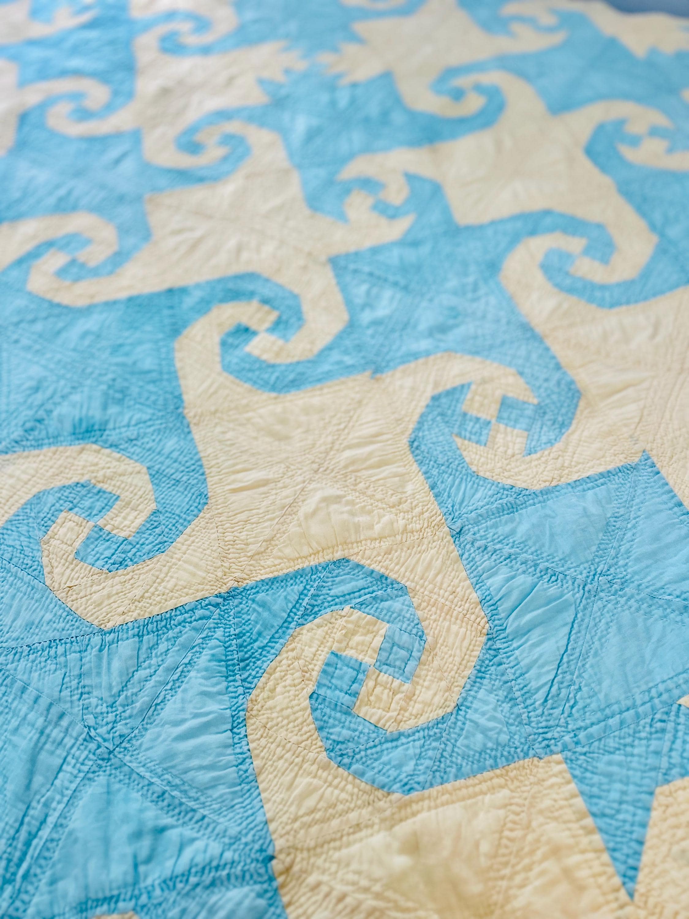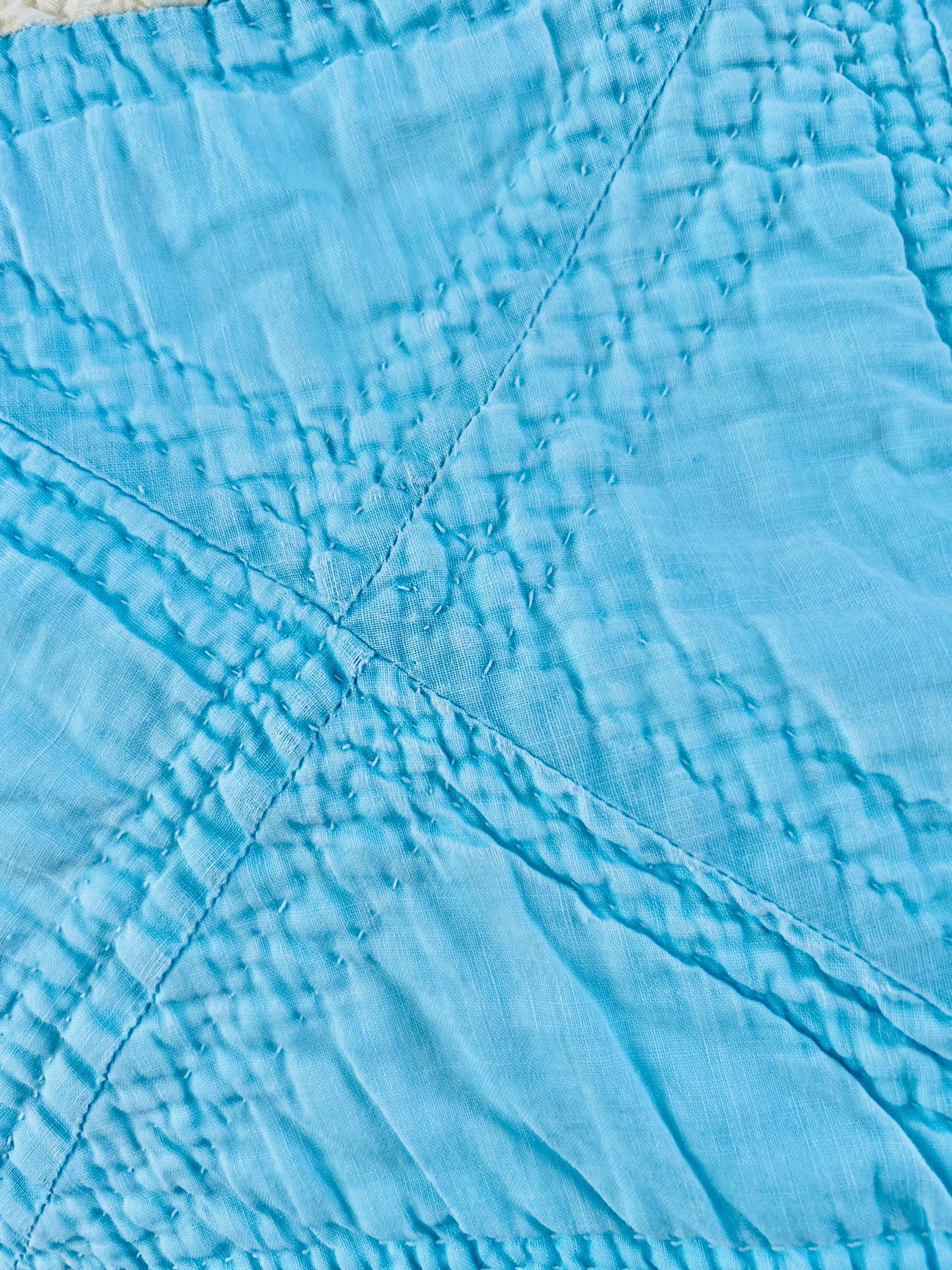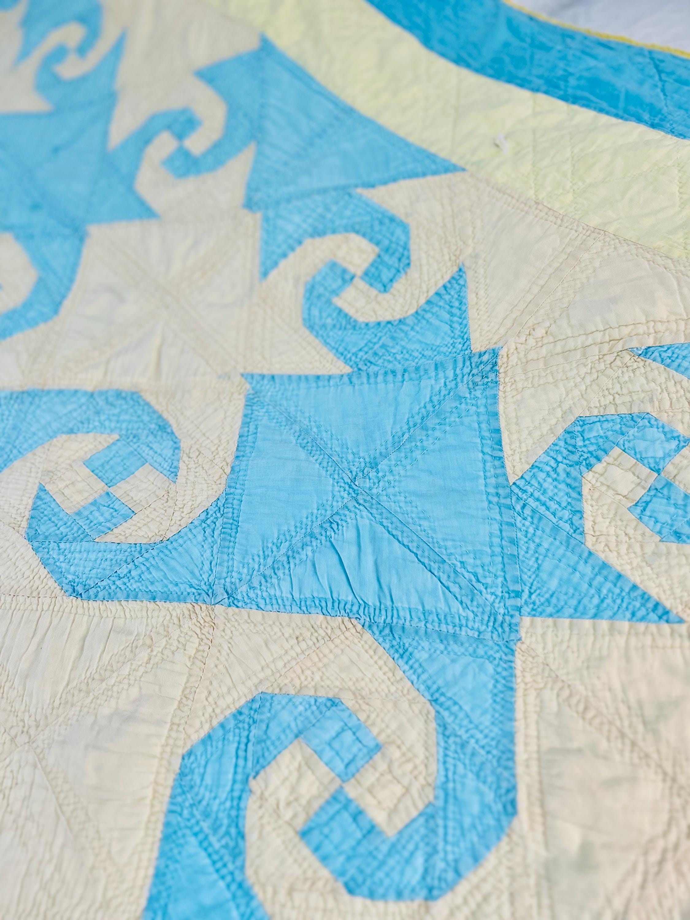 This striking and rare Indiana Puzzle or Snail Trail Quilt, circa 1900, has a whirlwind feel to it, with its sky-blue and buttercream fabrics shaped like waves cresting and breaking. It has been so densely hand-quilted that in some locations it is stippled. The quilting is in double and triple diagonals and repeating outlines of the patchwork. The four-sided border is sky blue and yellow and has been quilted in diamonds.