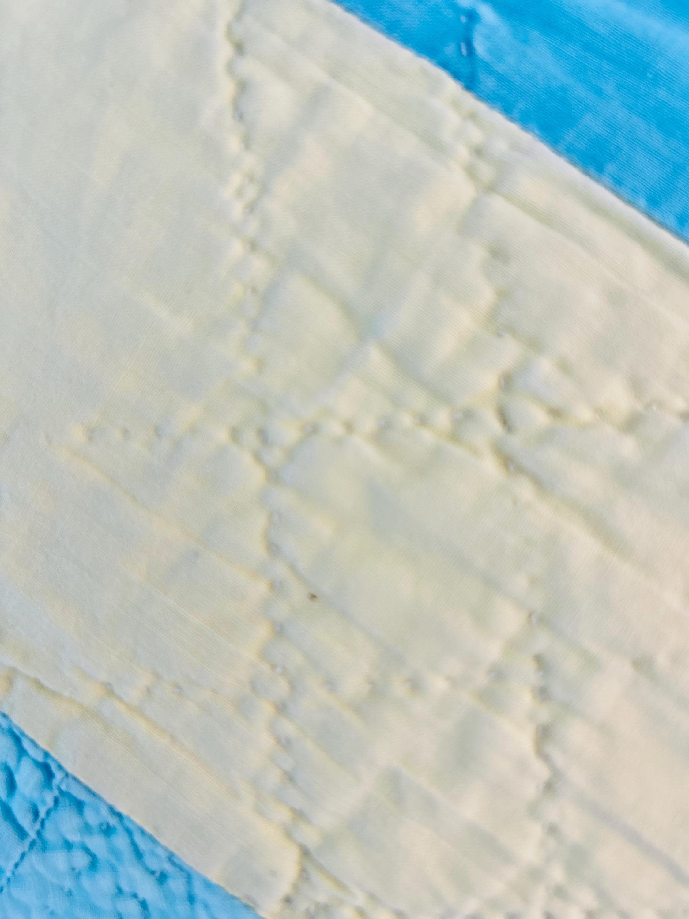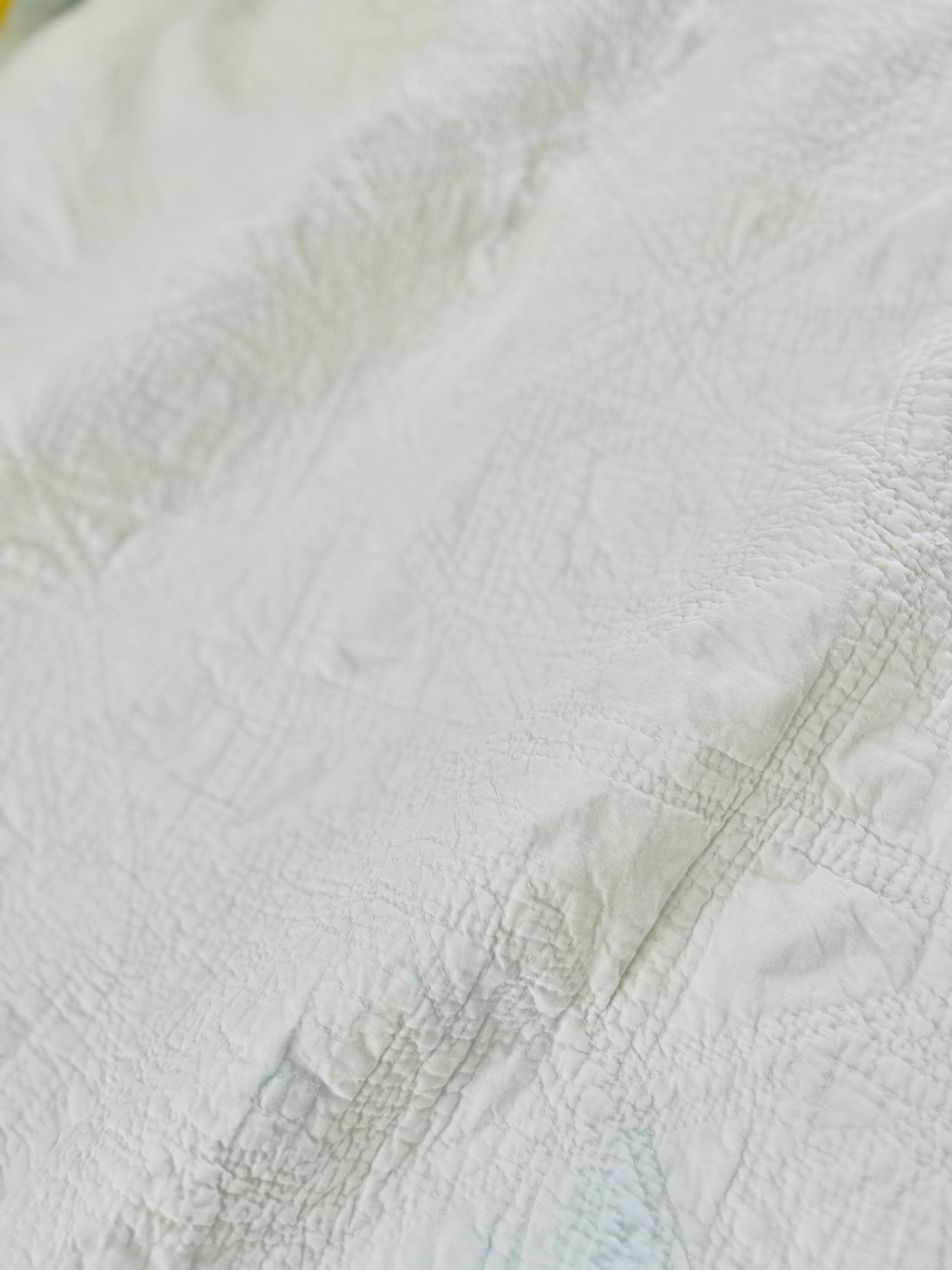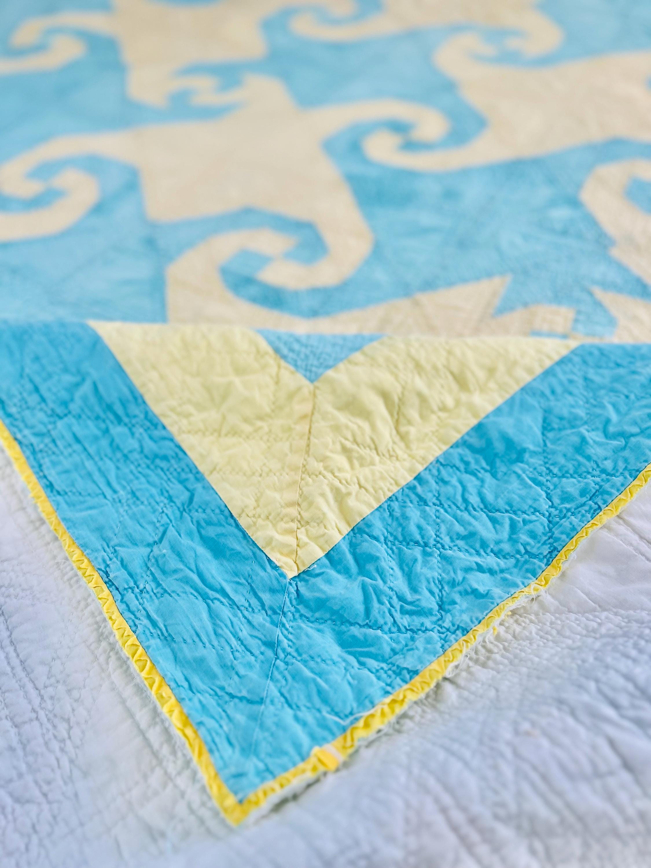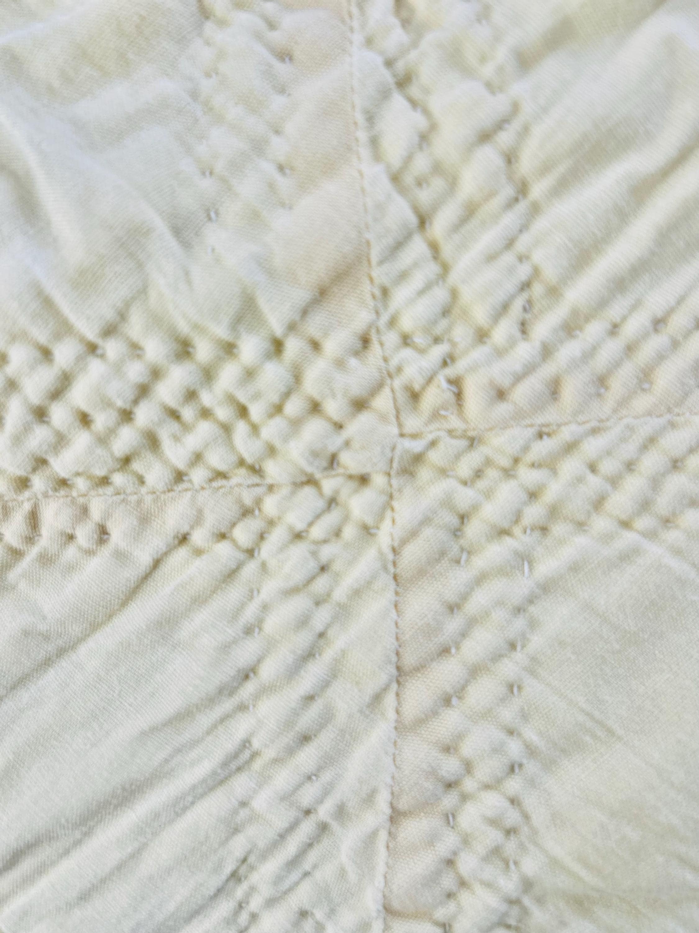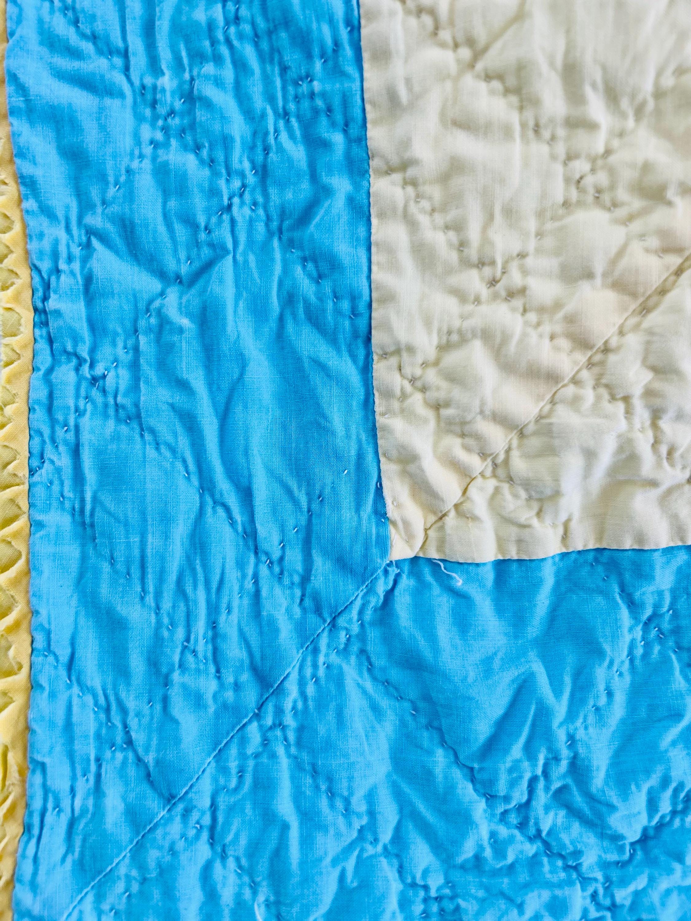 The back is white cotton while the binding is yellow cotton that has been machine stitched to both sides. The cotton batting is unsized and lightweight.