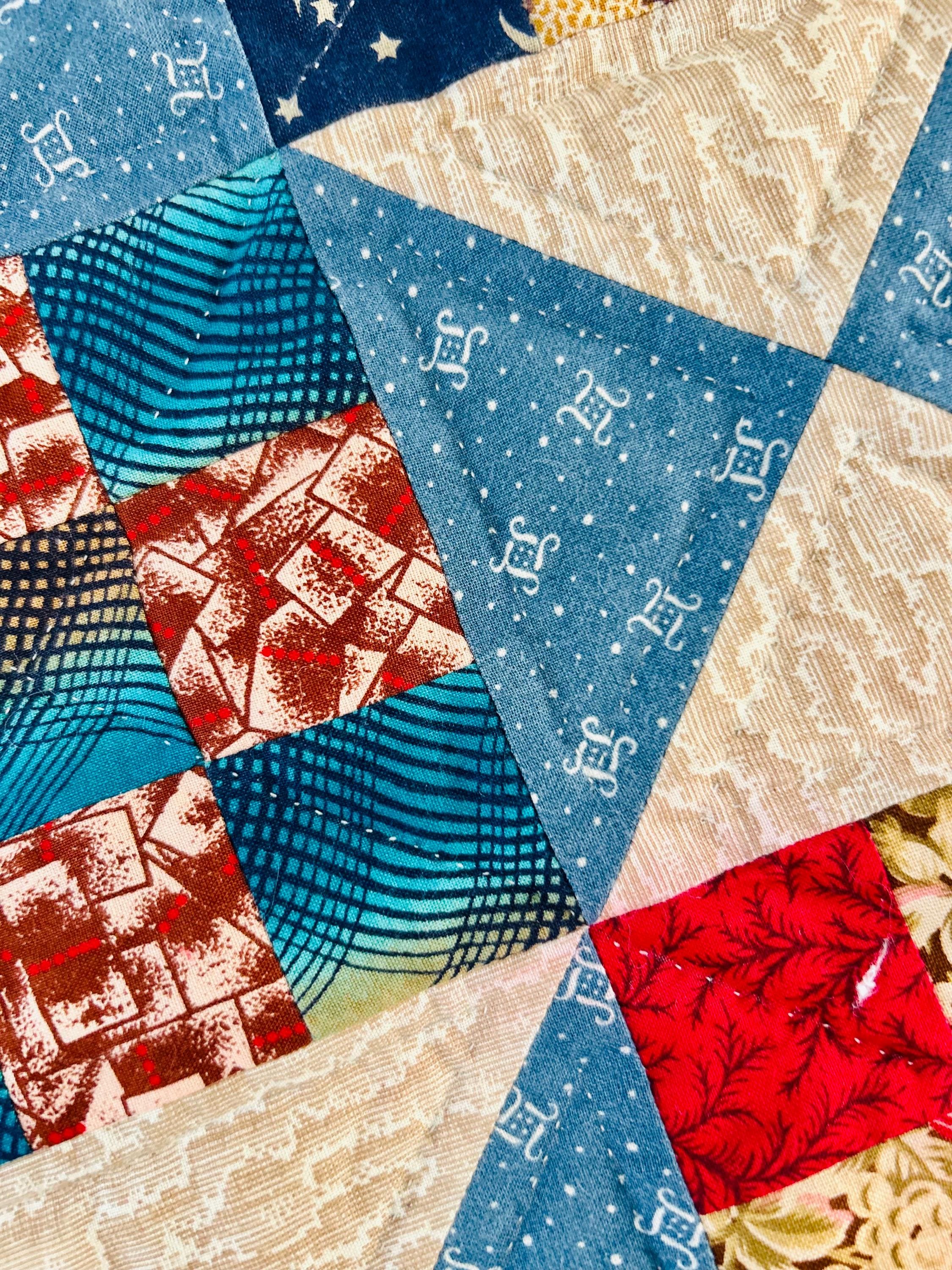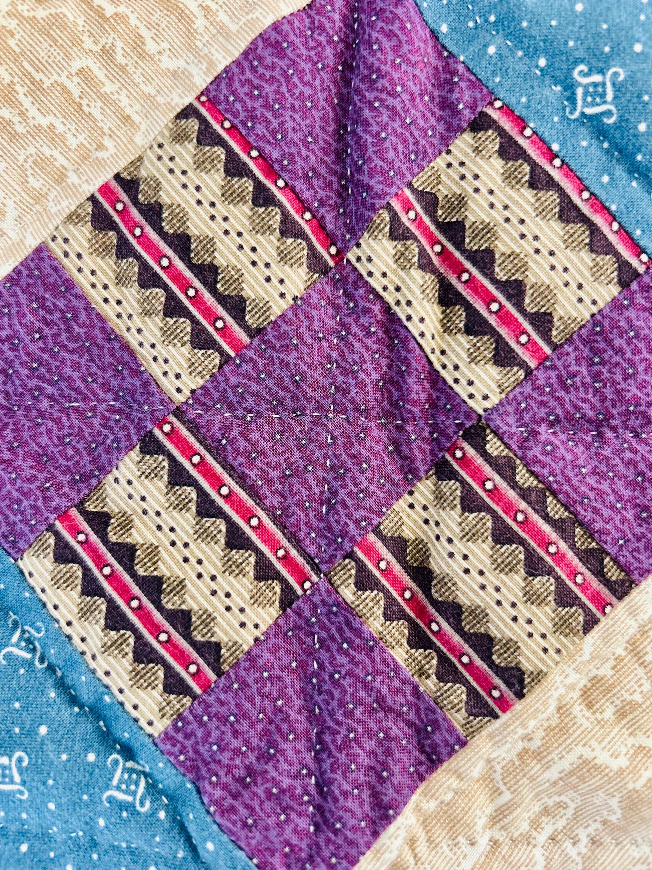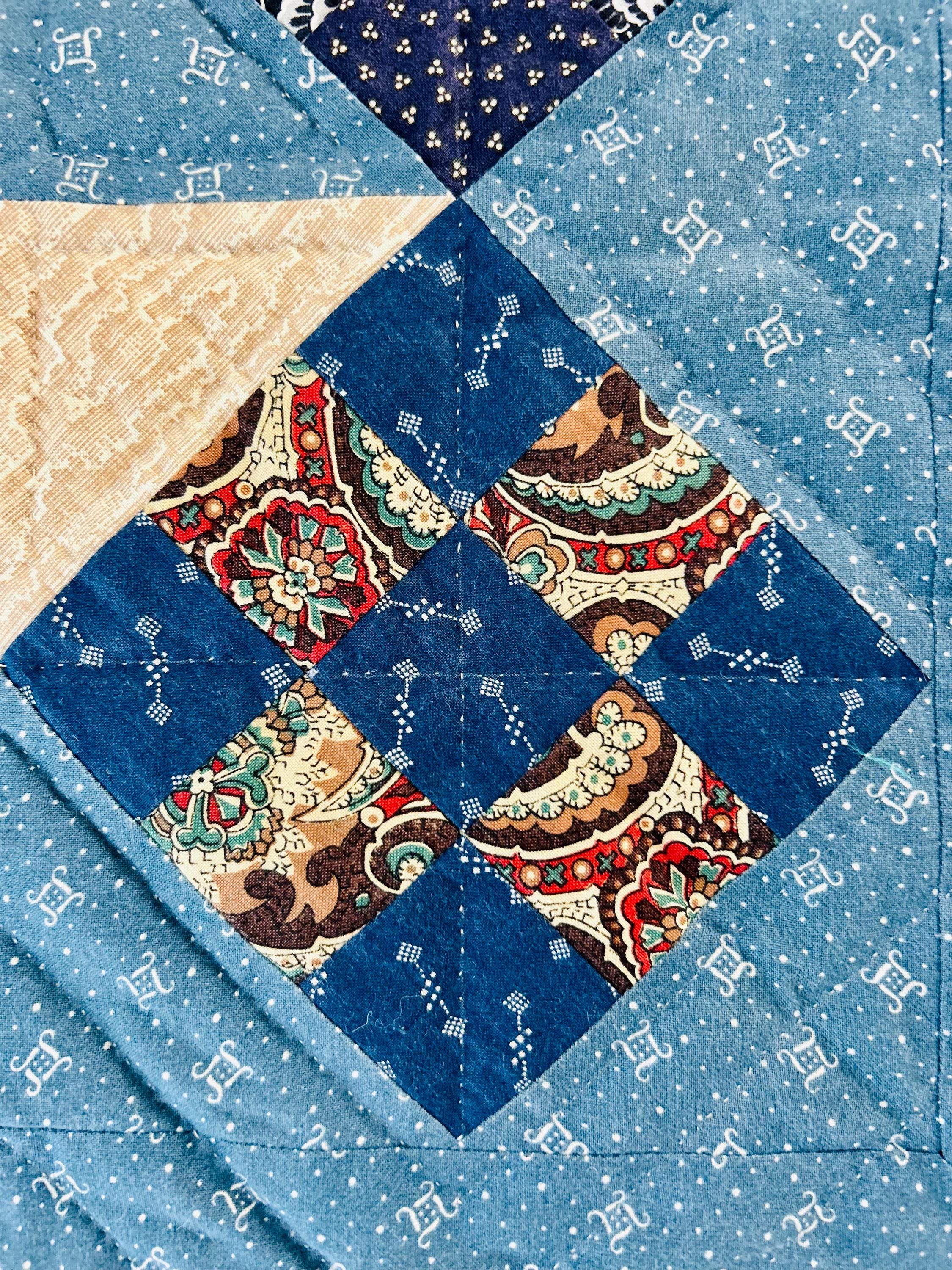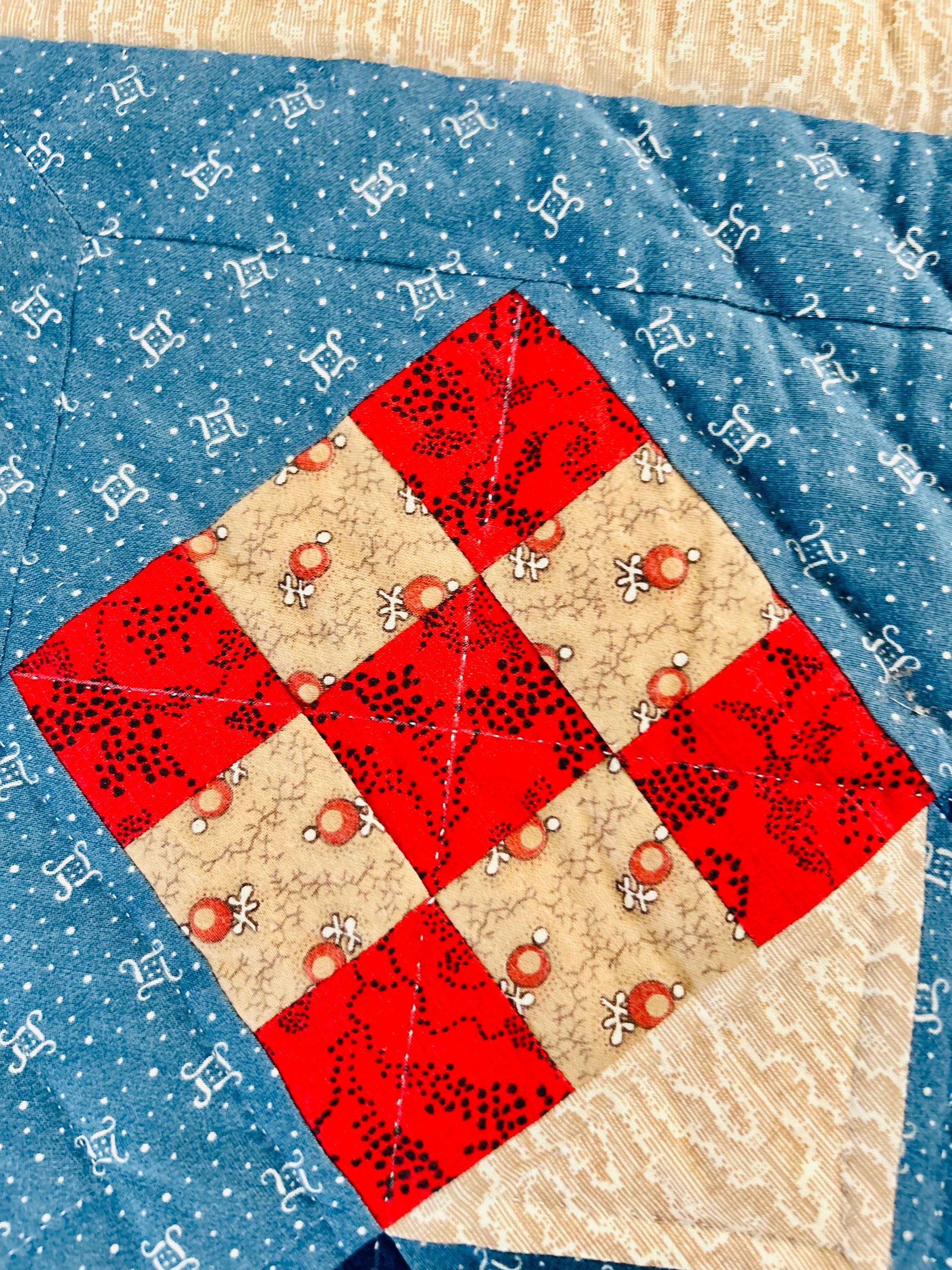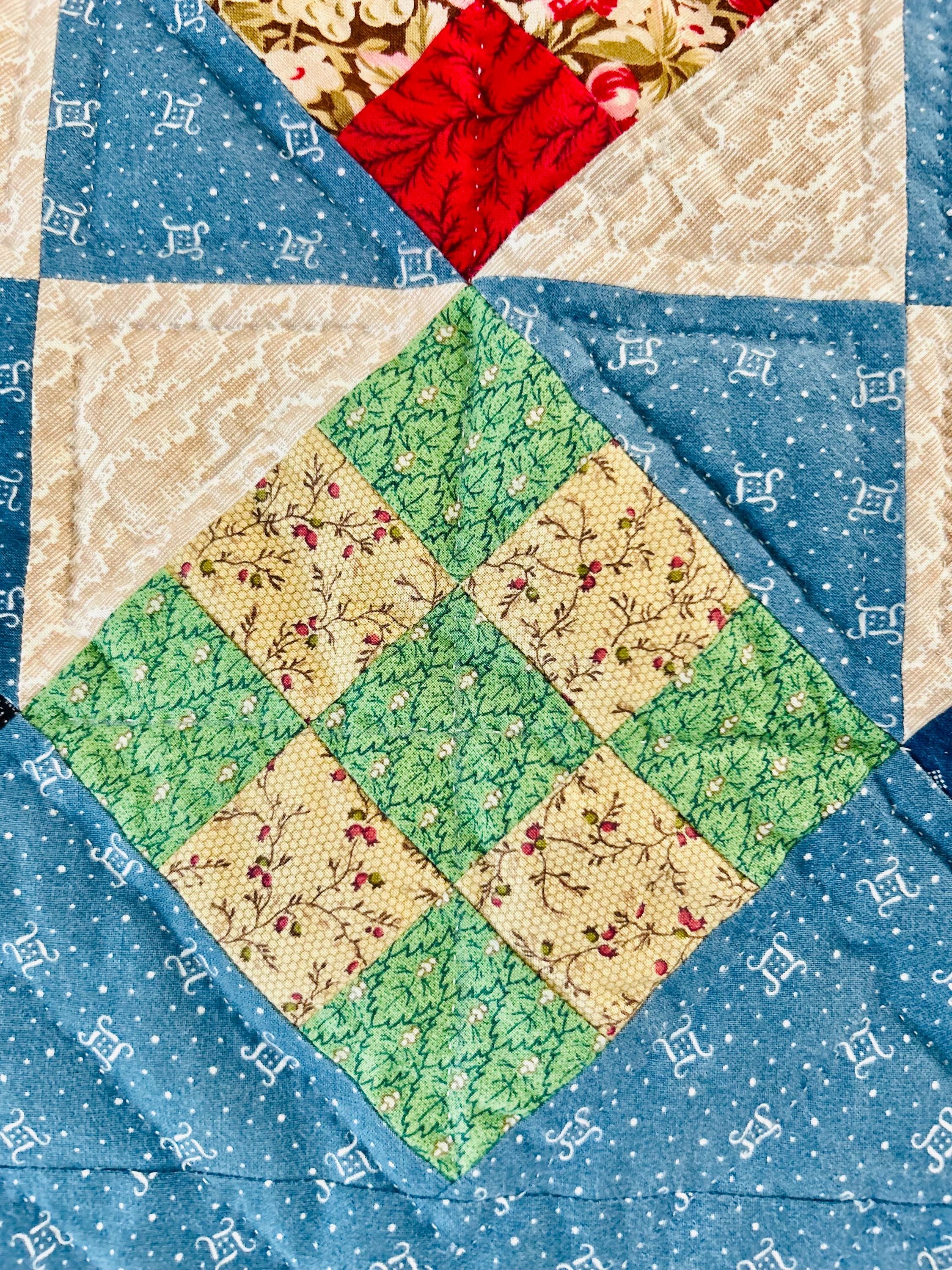The back is also a reproduction fabric in a chestnut geometric print while the binding has ben machine stitched to the front and hand-stitched to the back. The batting is lightweight.