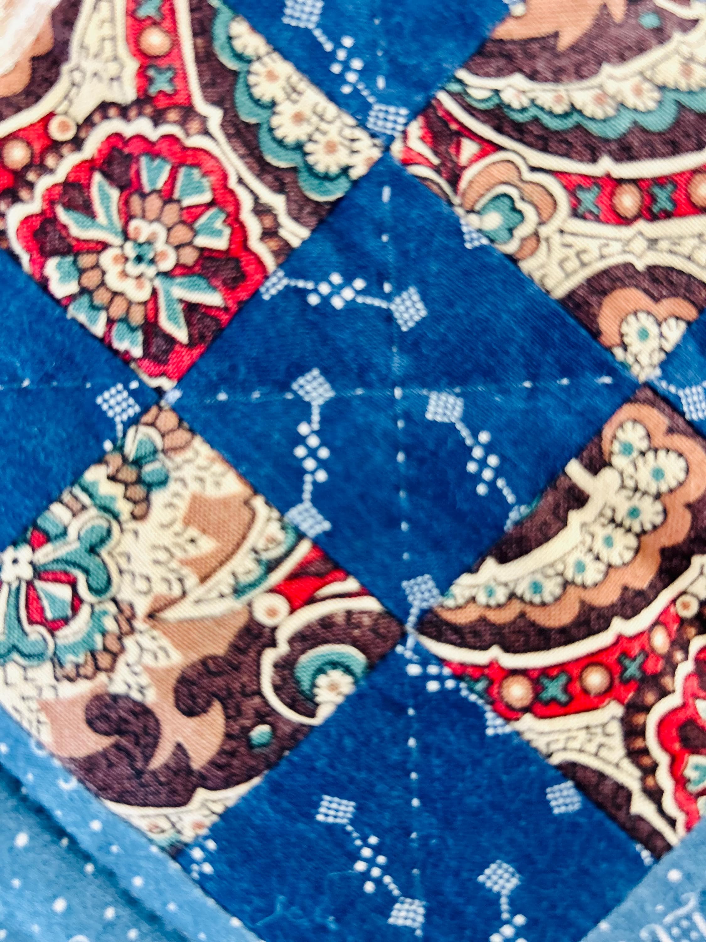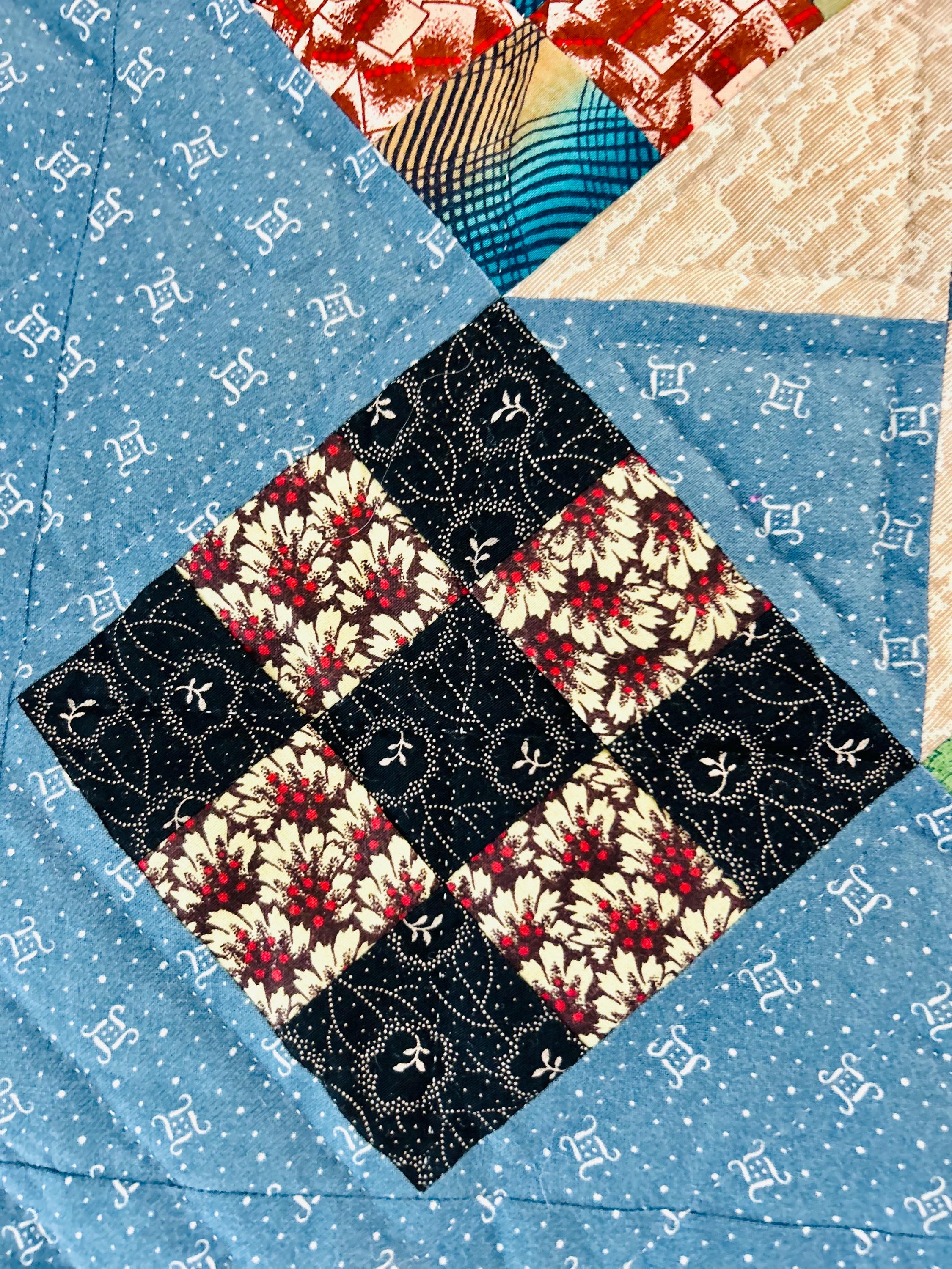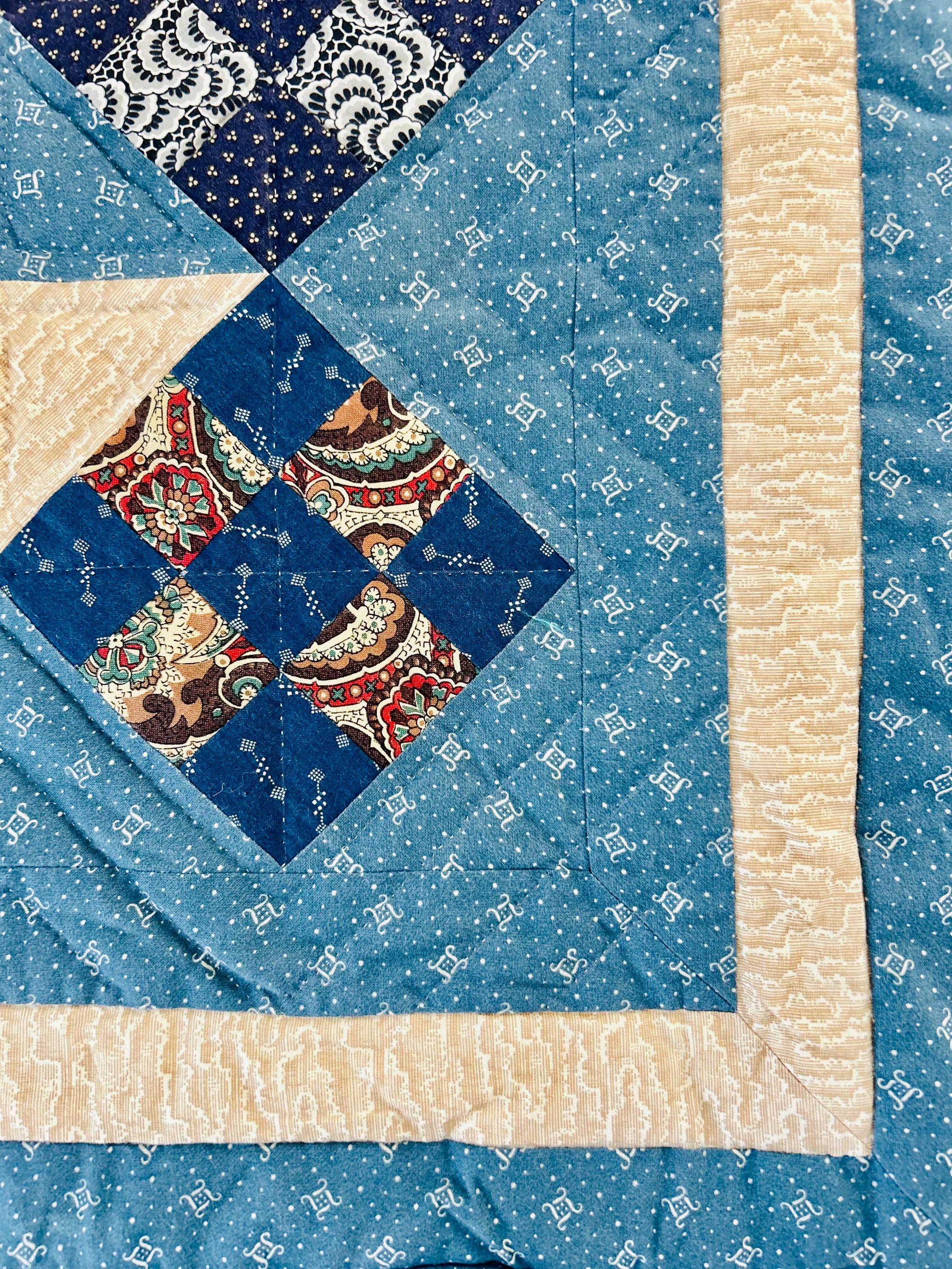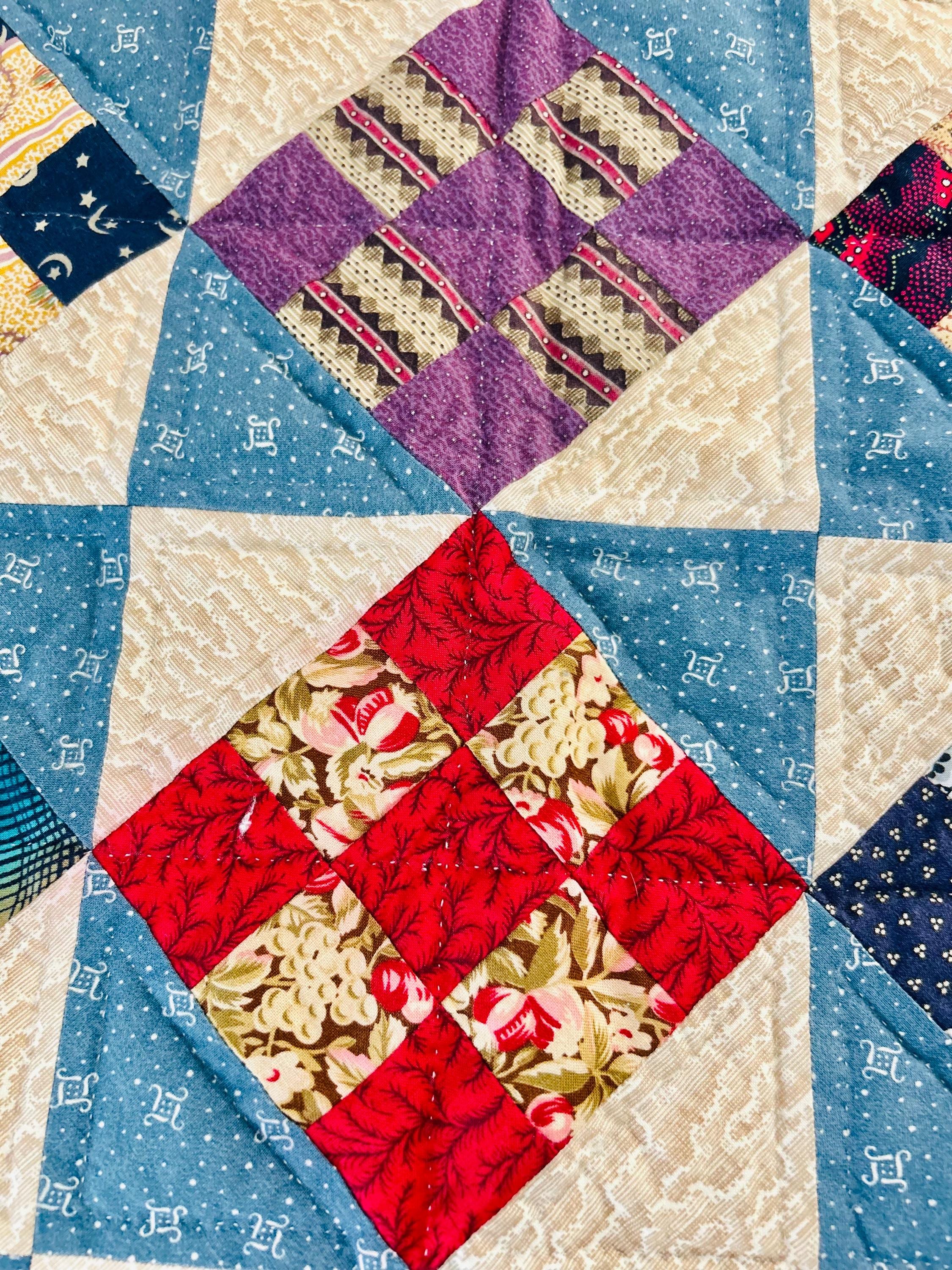 The back is also a reproduction fabric in a chestnut geometric print while the binding has ben machine stitched to the front and hand-stitched to the back. The batting is lightweight.