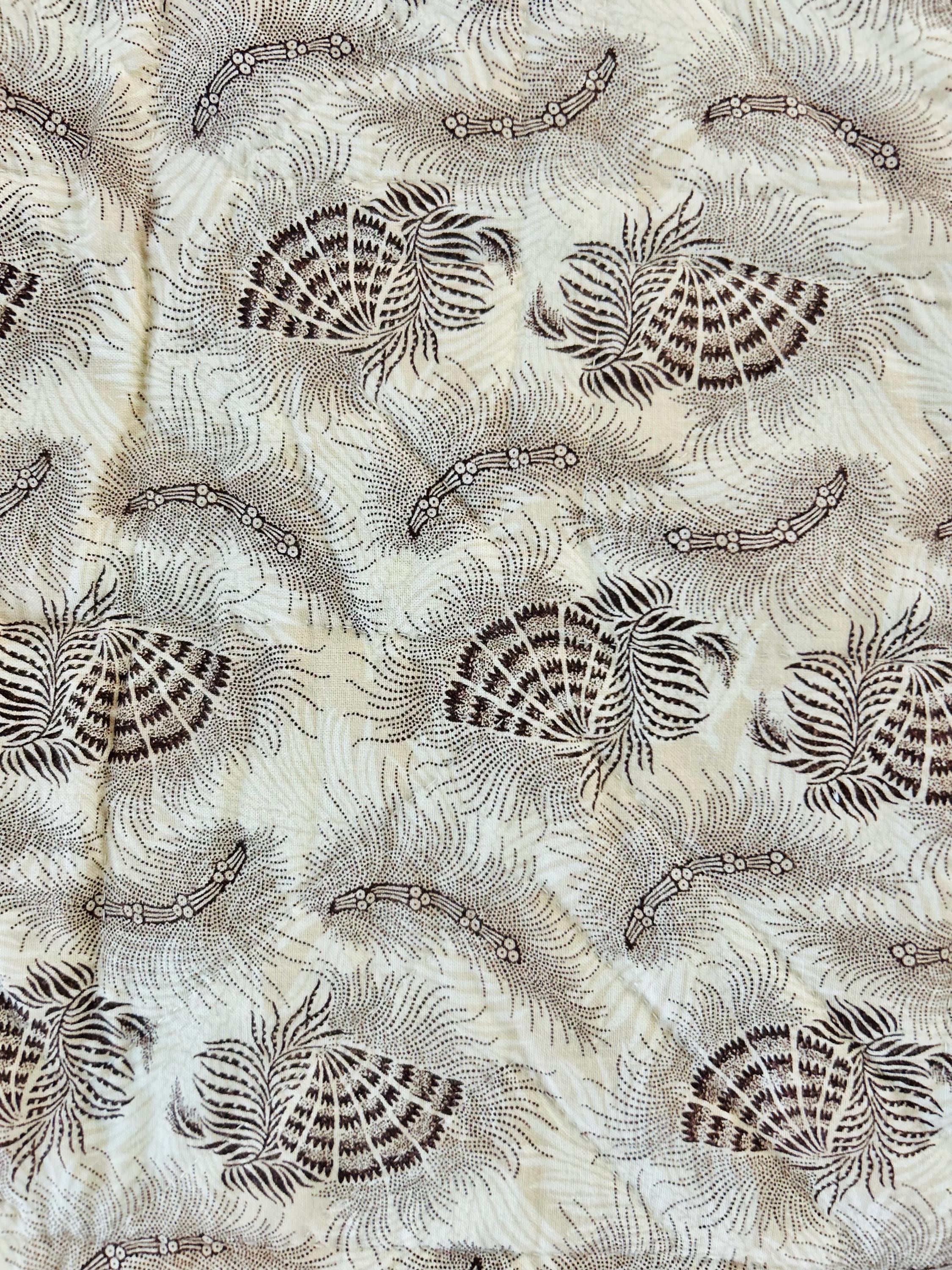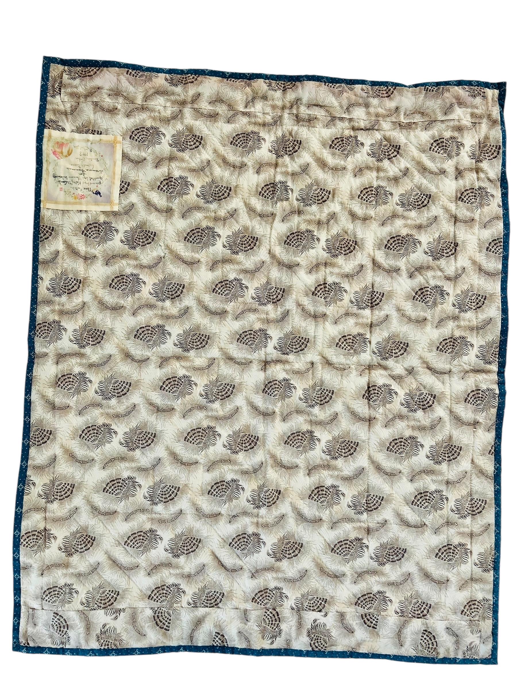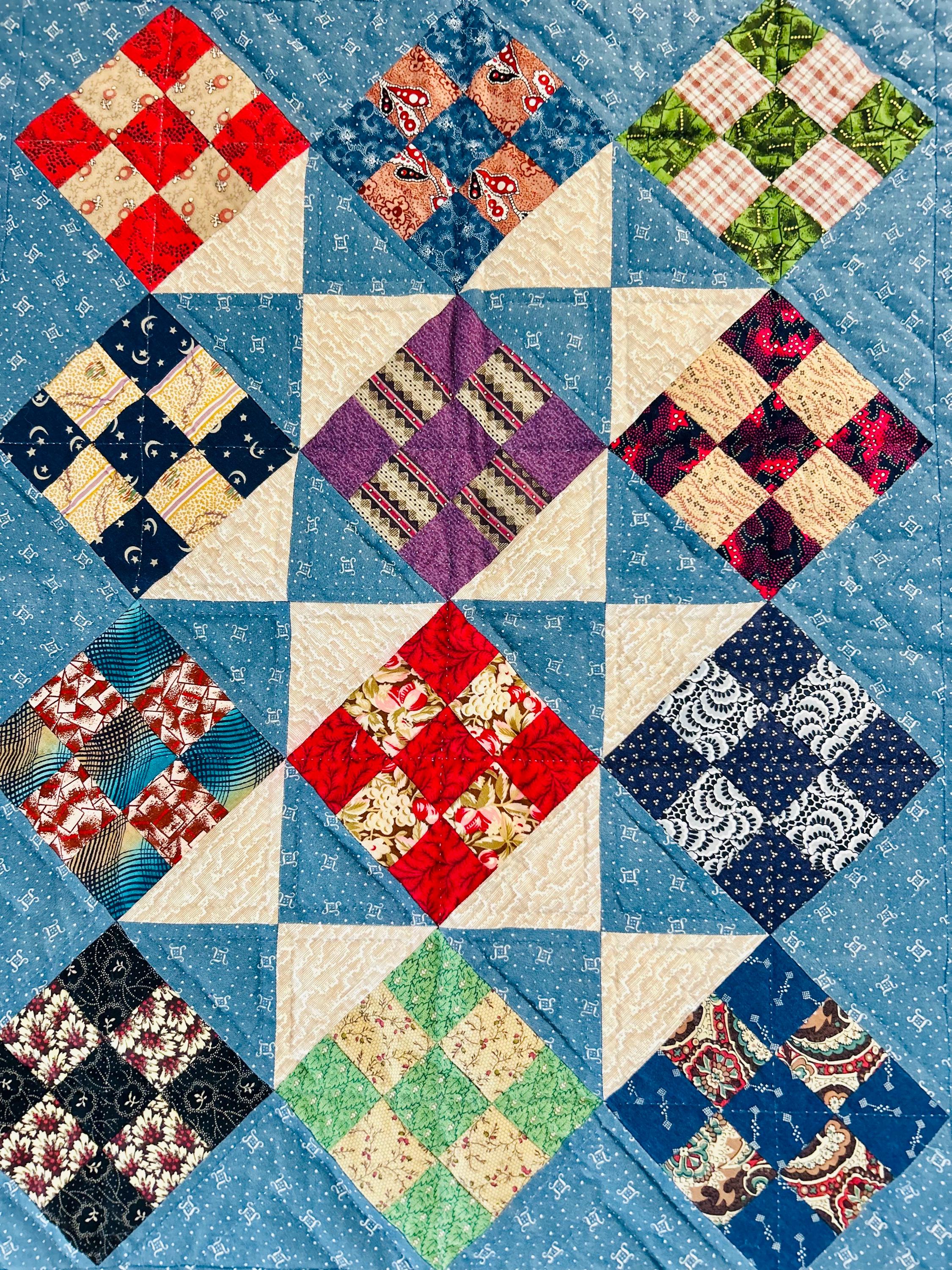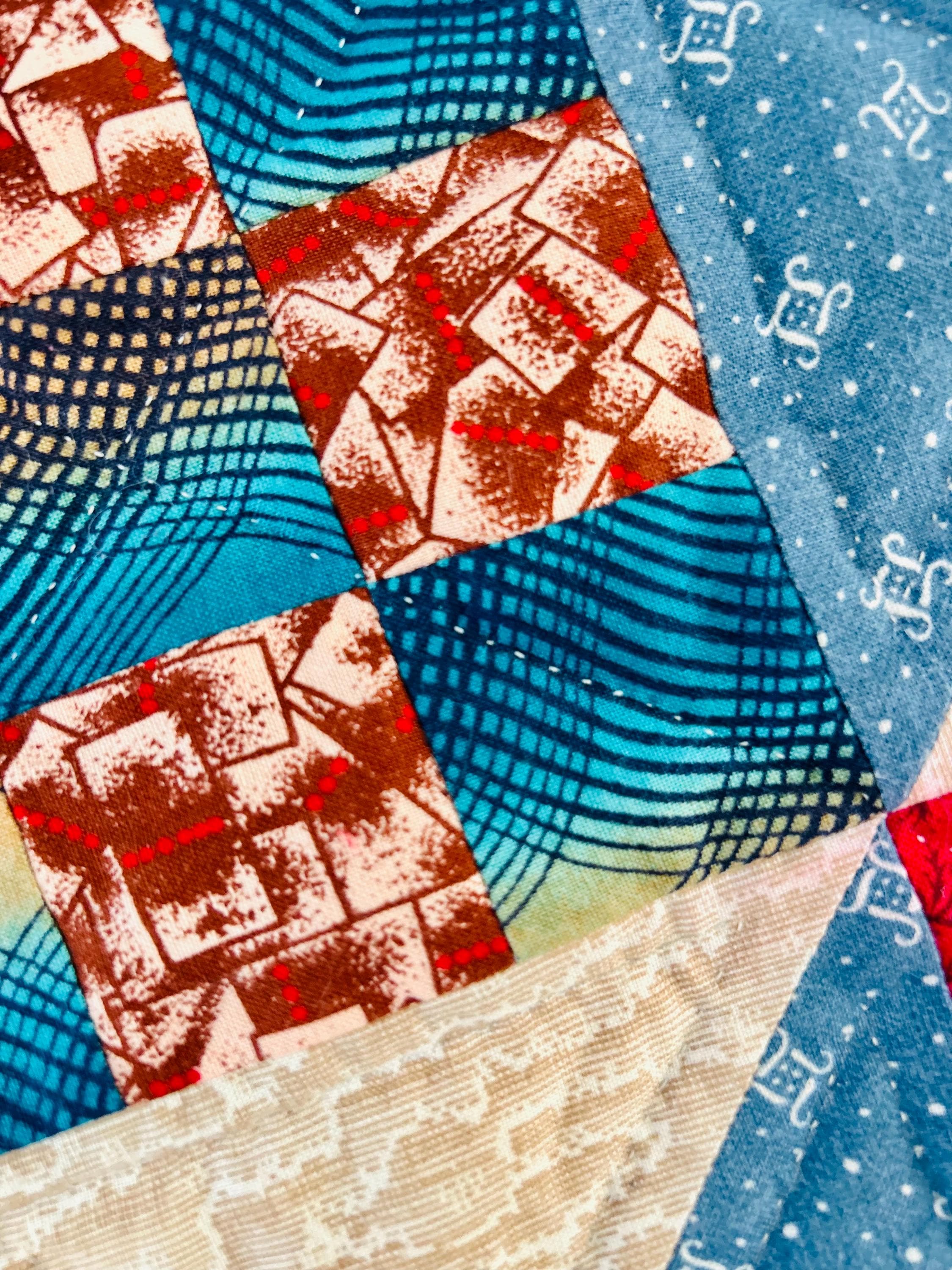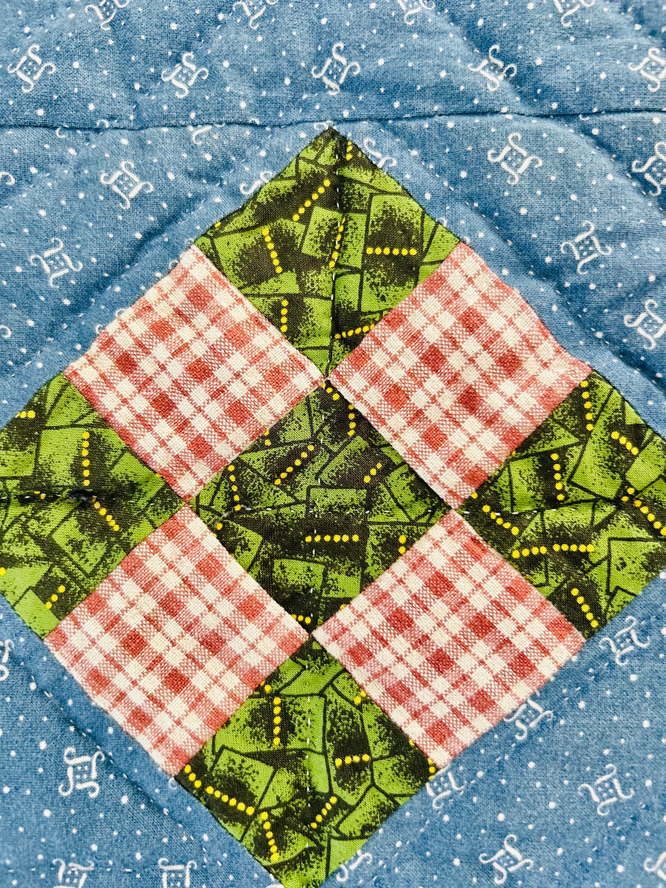 The back is also a reproduction fabric in a chestnut geometric print while the binding has ben machine stitched to the front and hand-stitched to the back. The batting is lightweight.