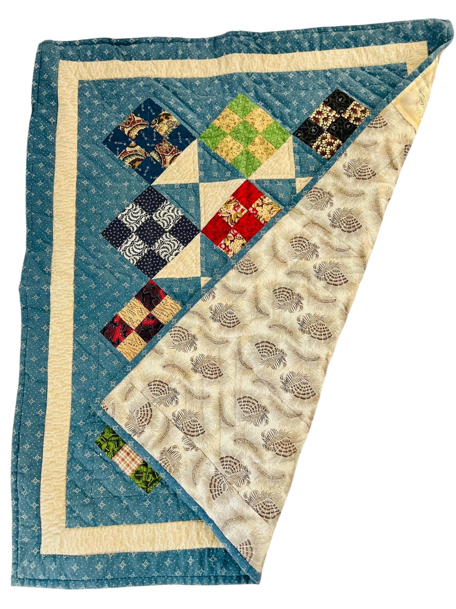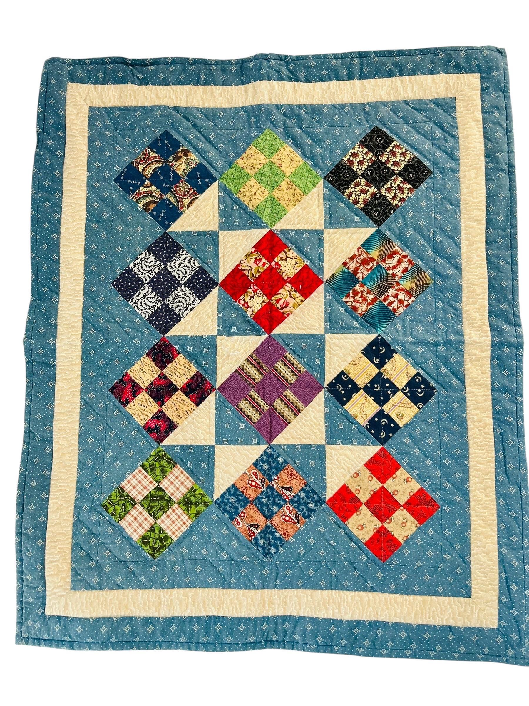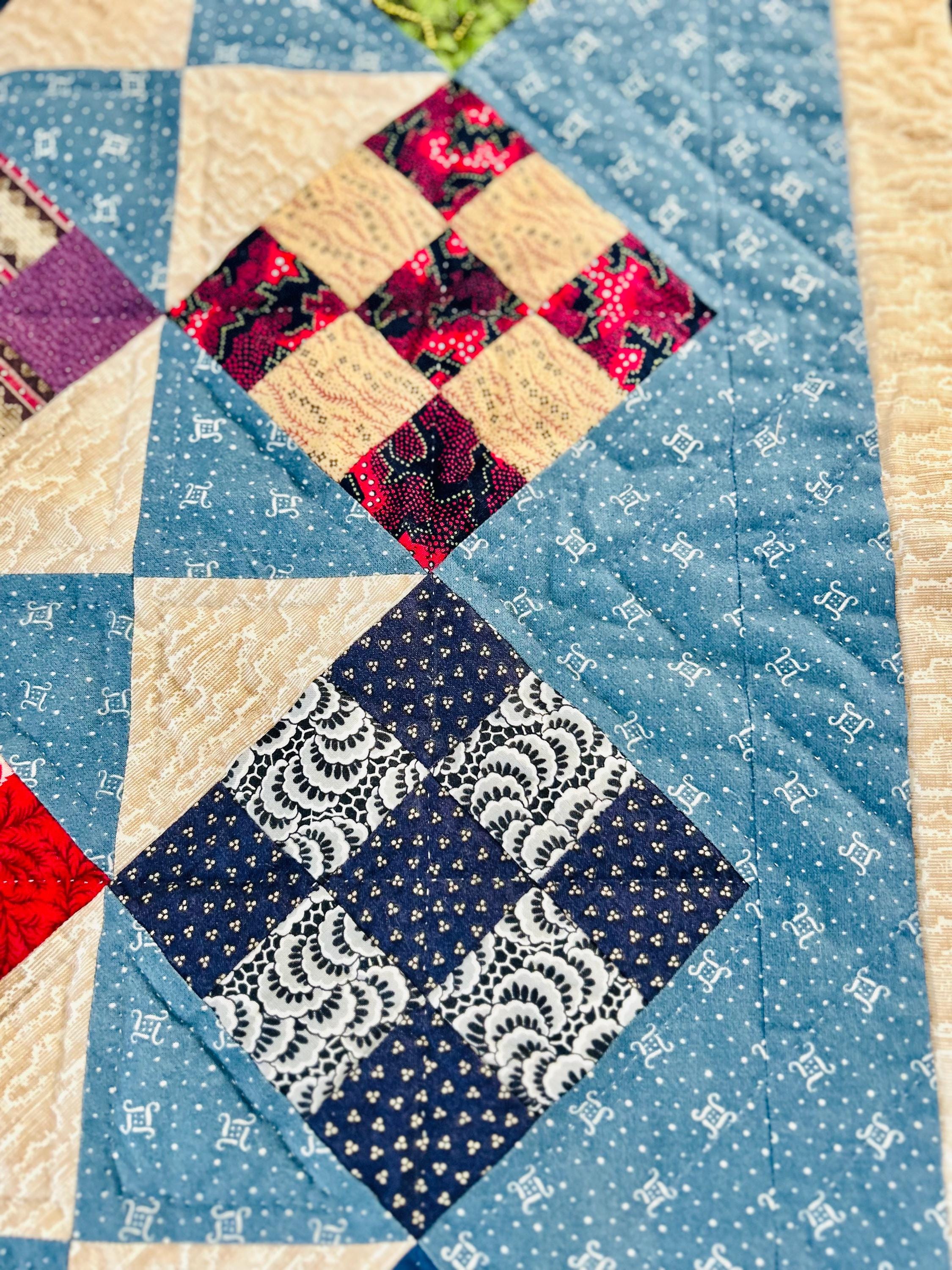This charming Nine-Patch on Point Quilt is a handmade reproduction of a Civil War quilt using reproduction fabrics in the perfect size for display/wall hanging a table topper or simply an accent piece. The hand-quilting is in outlines of the patchwork and in concentric pyramids . Dated 1998 and signed Kathy McComb and Frannie Weaver, Berlin, Ohio.