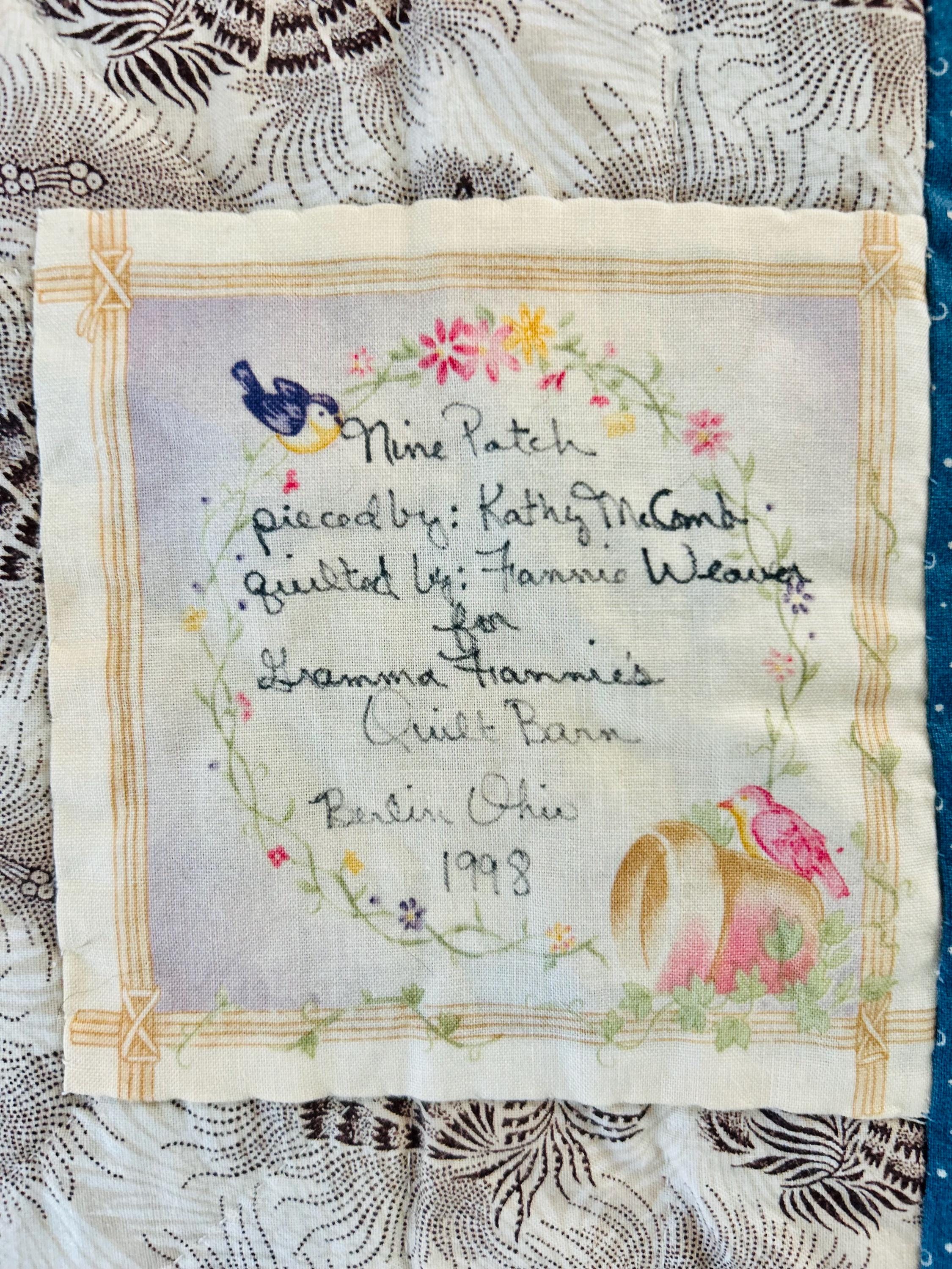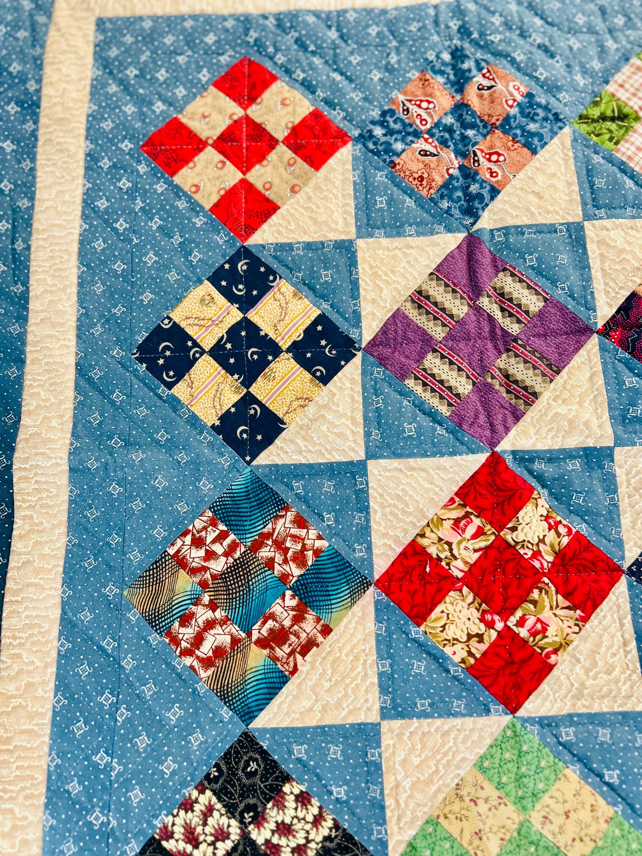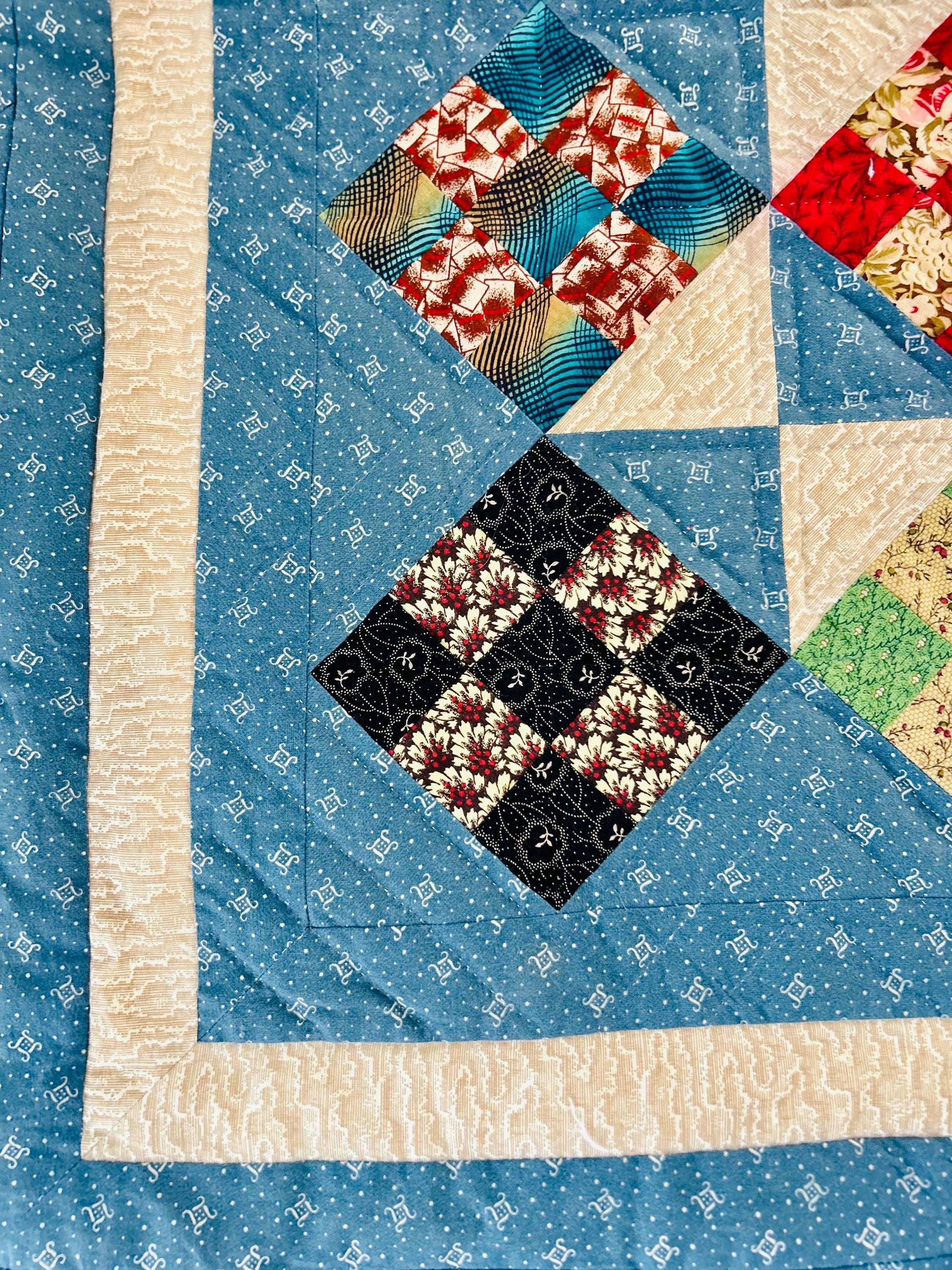 This charming Nine-Patch on Point Quilt is a handmade reproduction of a Civil War quilt using reproduction fabrics in the perfect size for display/wall hanging a table topper or simply an accent piece. The hand-quilting is in outlines of the patchwork and in concentric pyramids . Dated 1998 and signed Kathy McComb and Frannie Weaver, Berlin, Ohio.