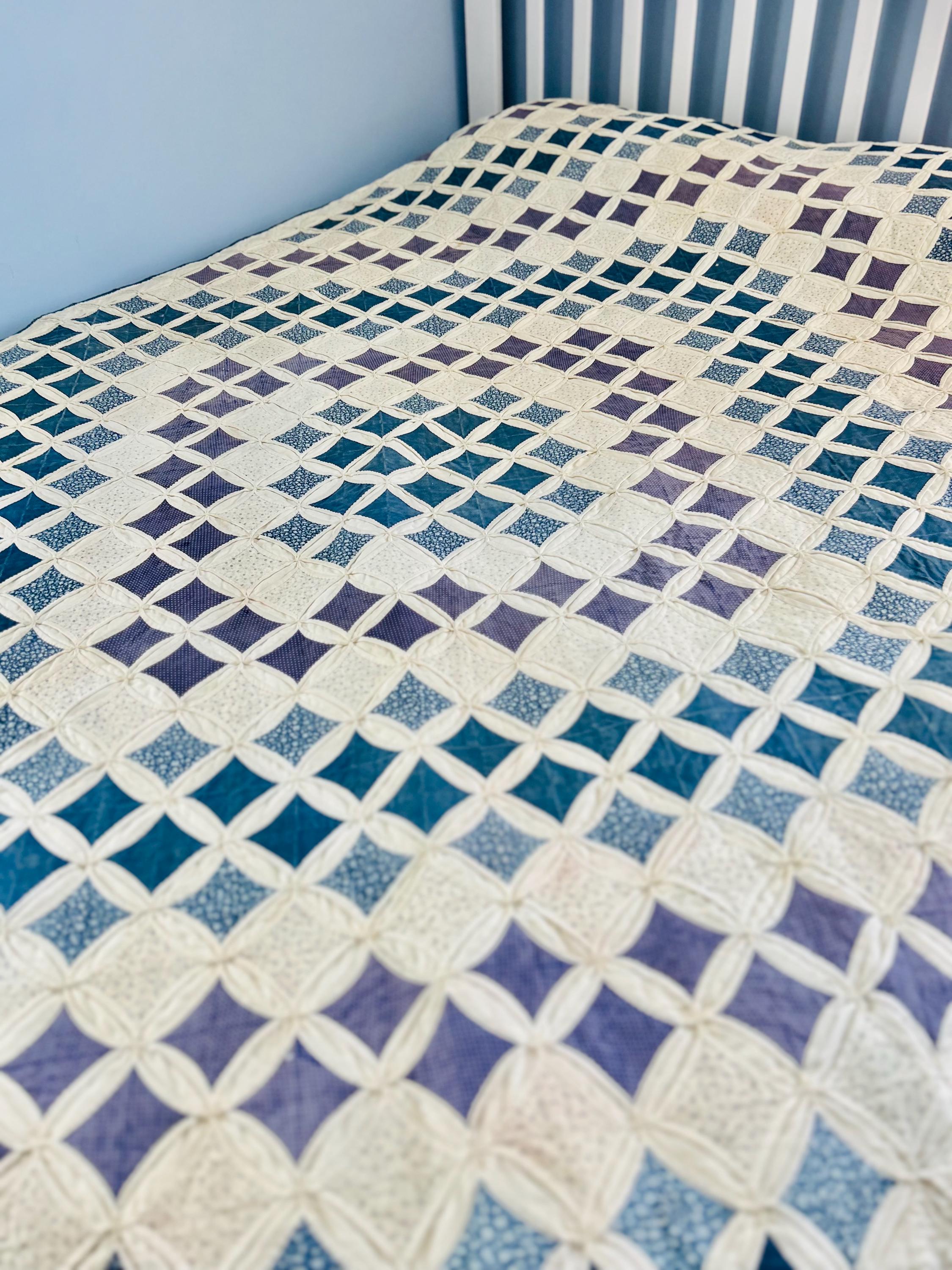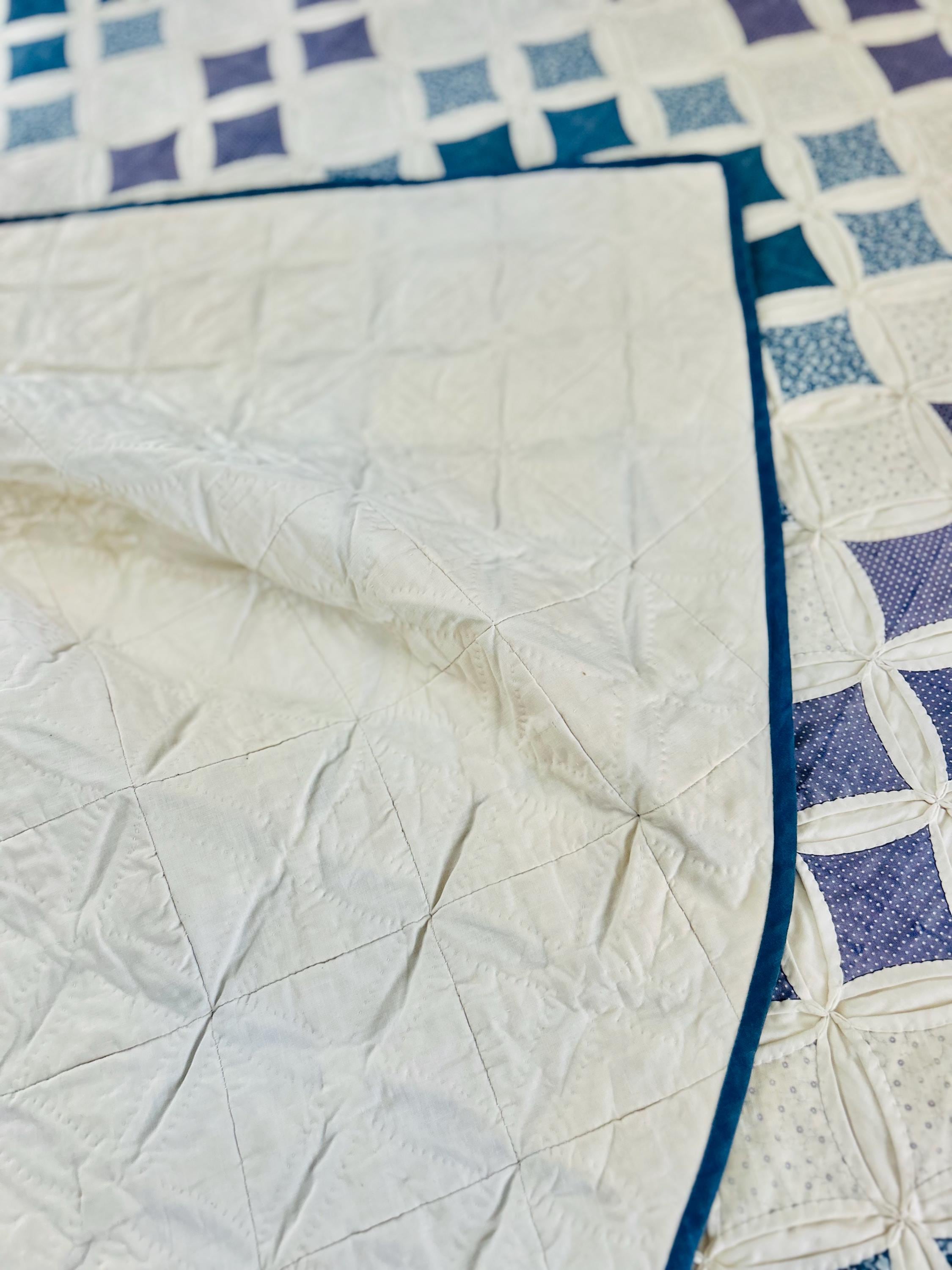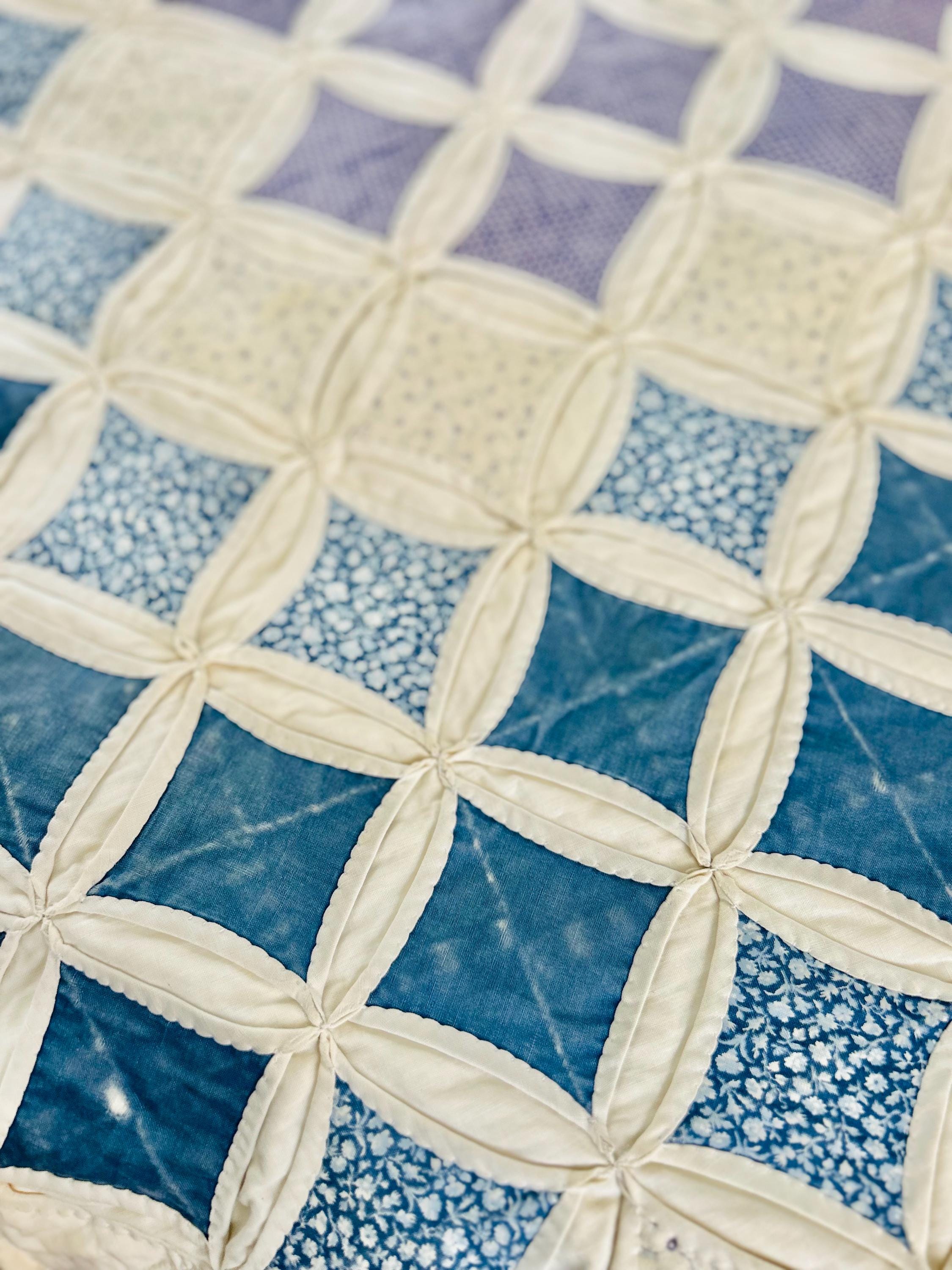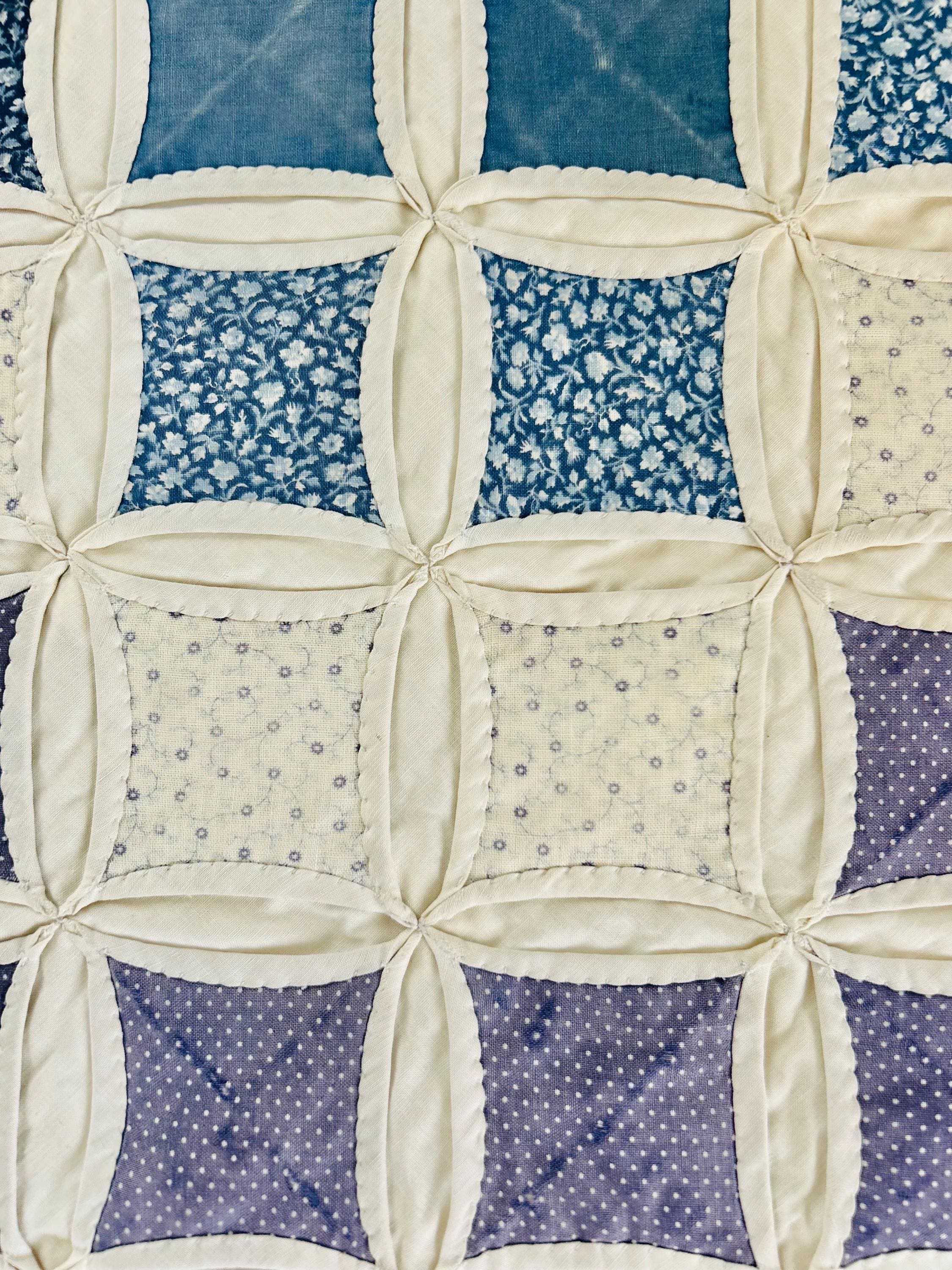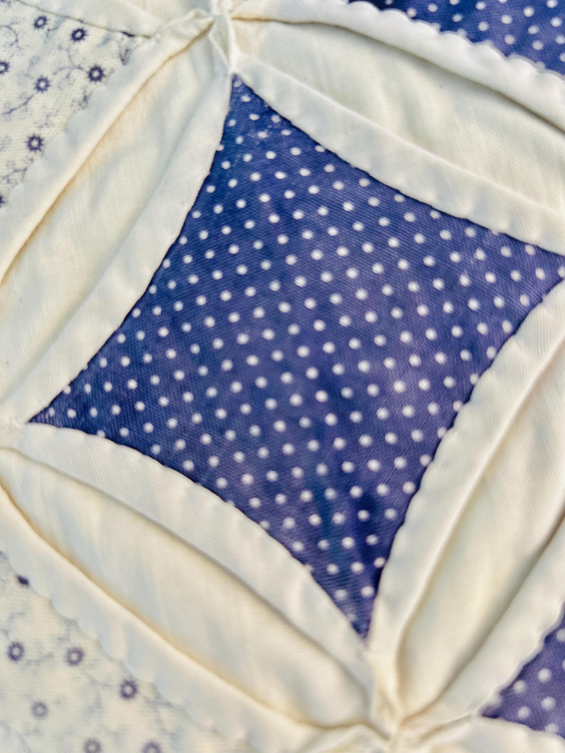 Stunning Cathedral Windows Quilt, circa 1970s, which unlike traditional quilts, is made by folding and stitching individual muslin blocks, creating a sculptural texture and beautifully intricate design. This unusual quilt goes a step further by arranging the blocks in a lovely blue and white pattern radiating from the center.