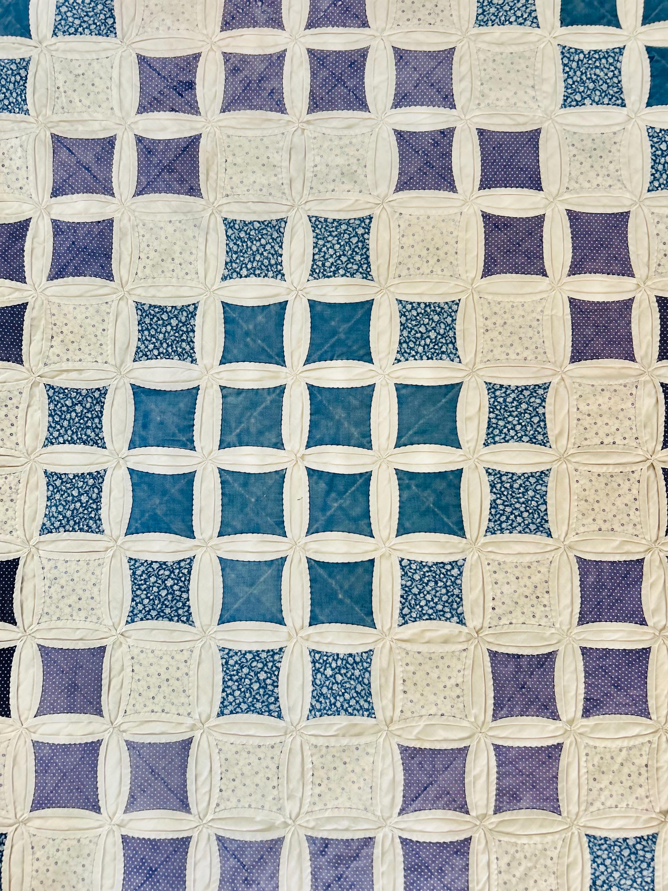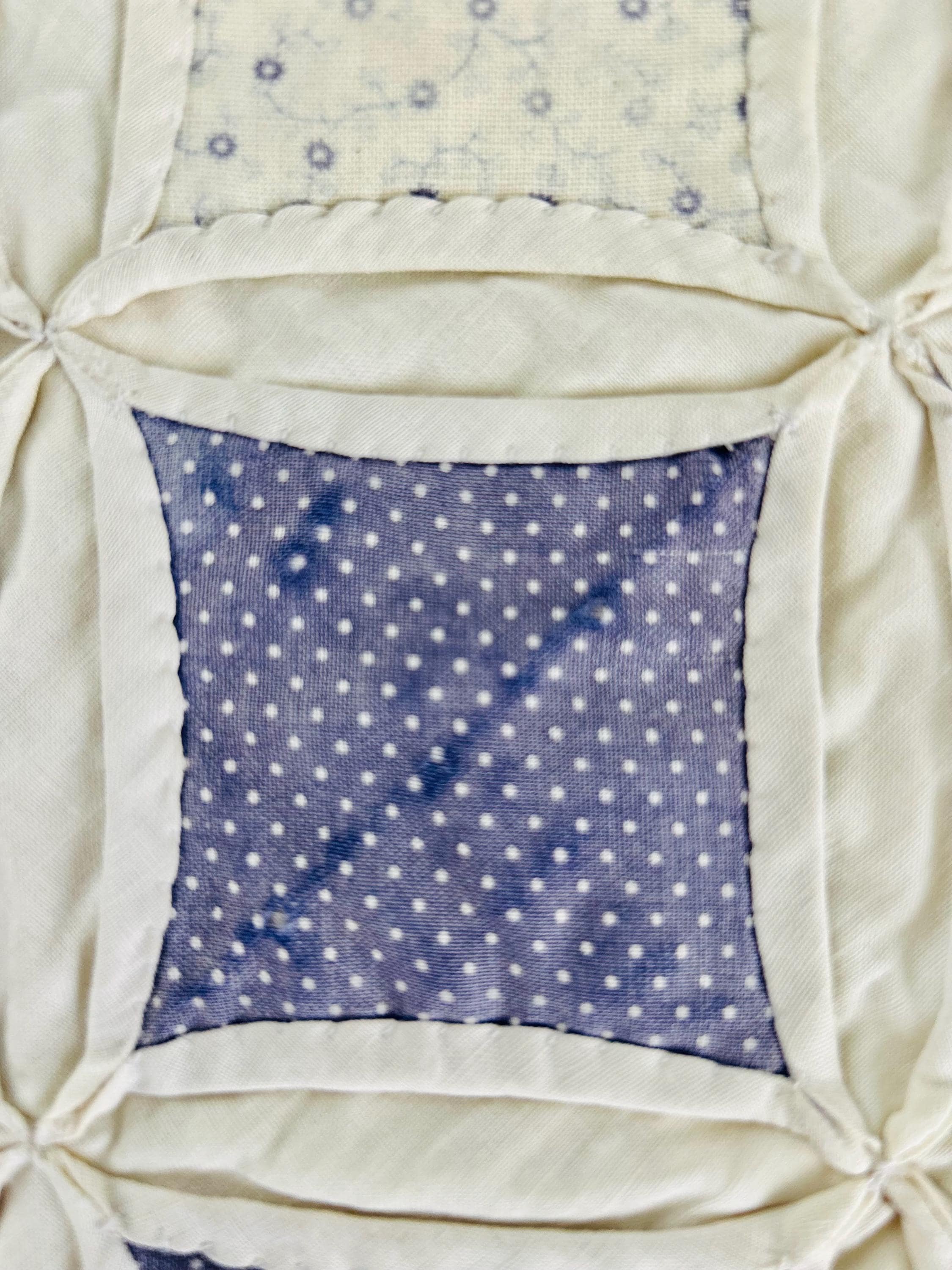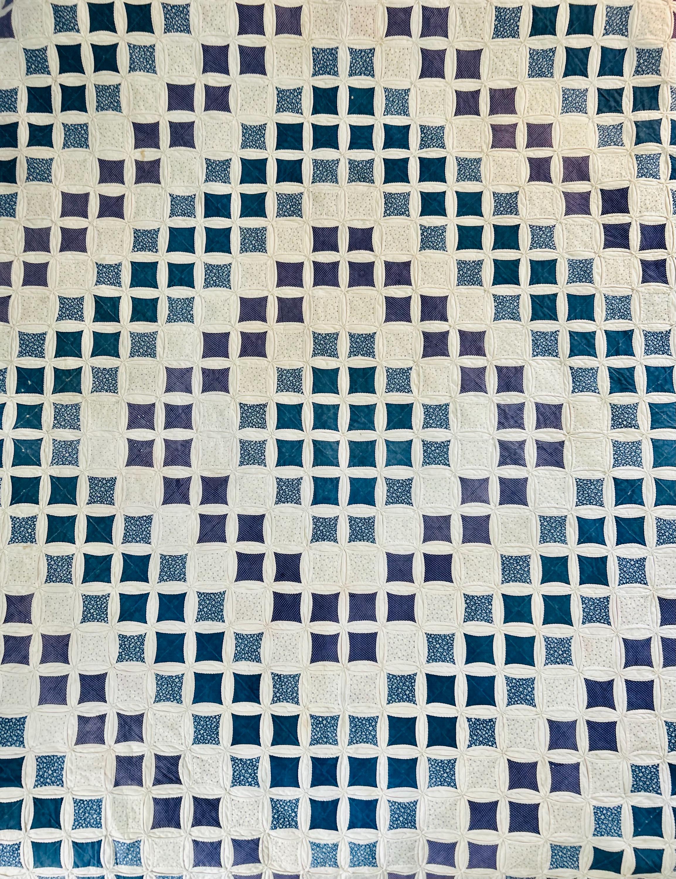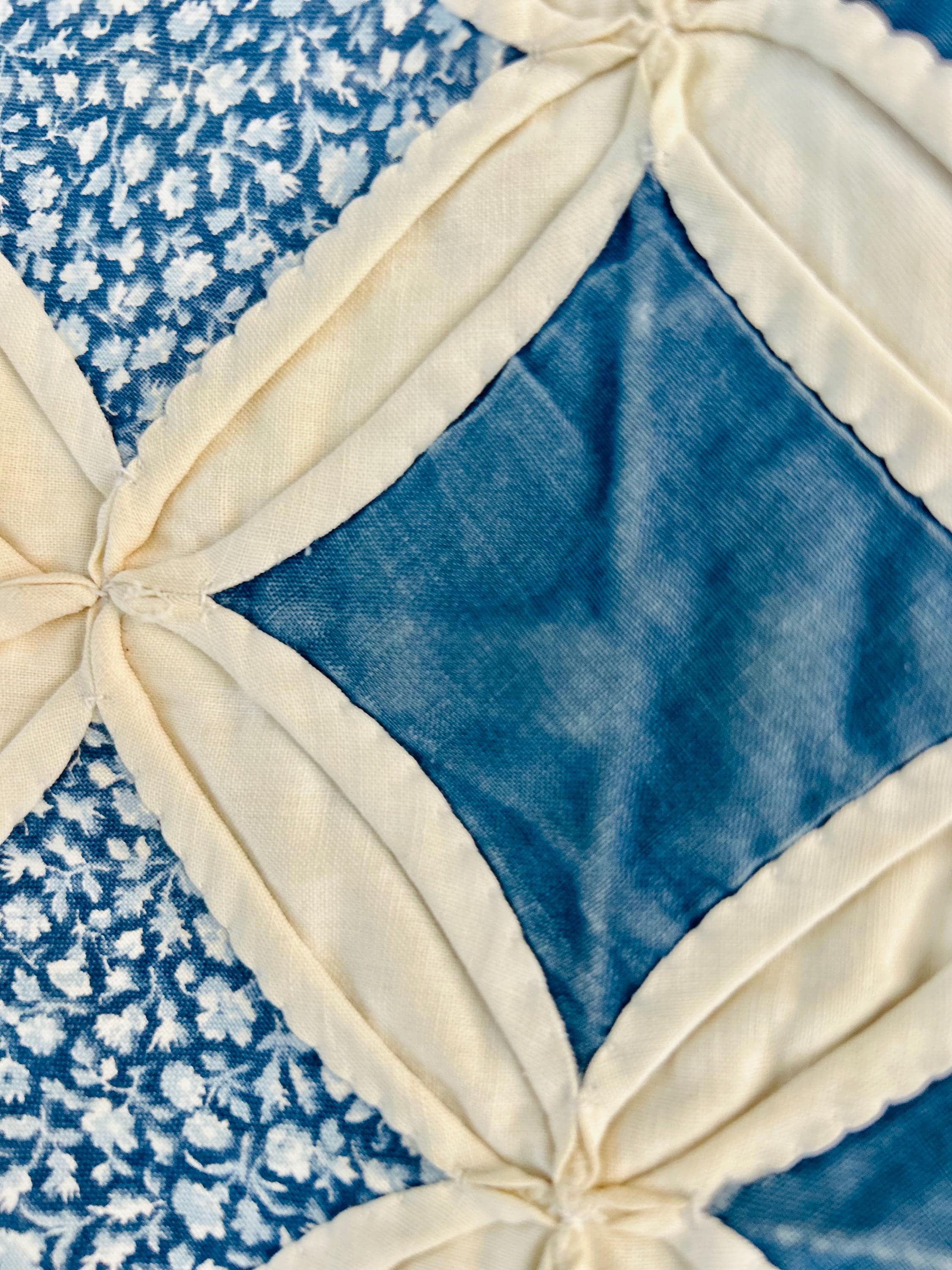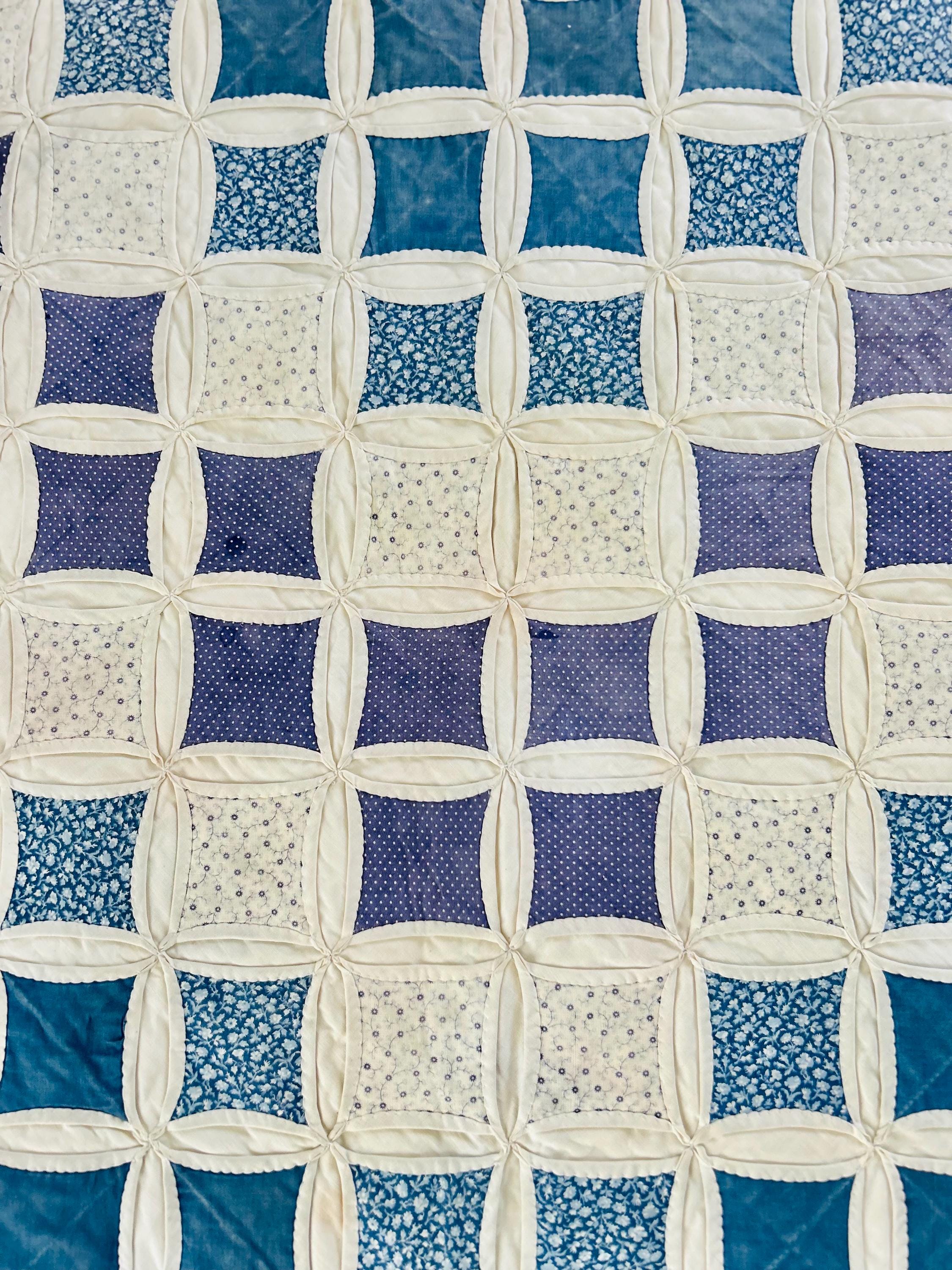 Stunning Cathedral Windows Quilt, circa 1970s, which unlike traditional quilts, is made by folding and stitching individual muslin blocks, creating a sculptural texture and beautifully intricate design. This unusual quilt goes a step further by arranging the blocks in a lovely blue and white pattern radiating from the center.