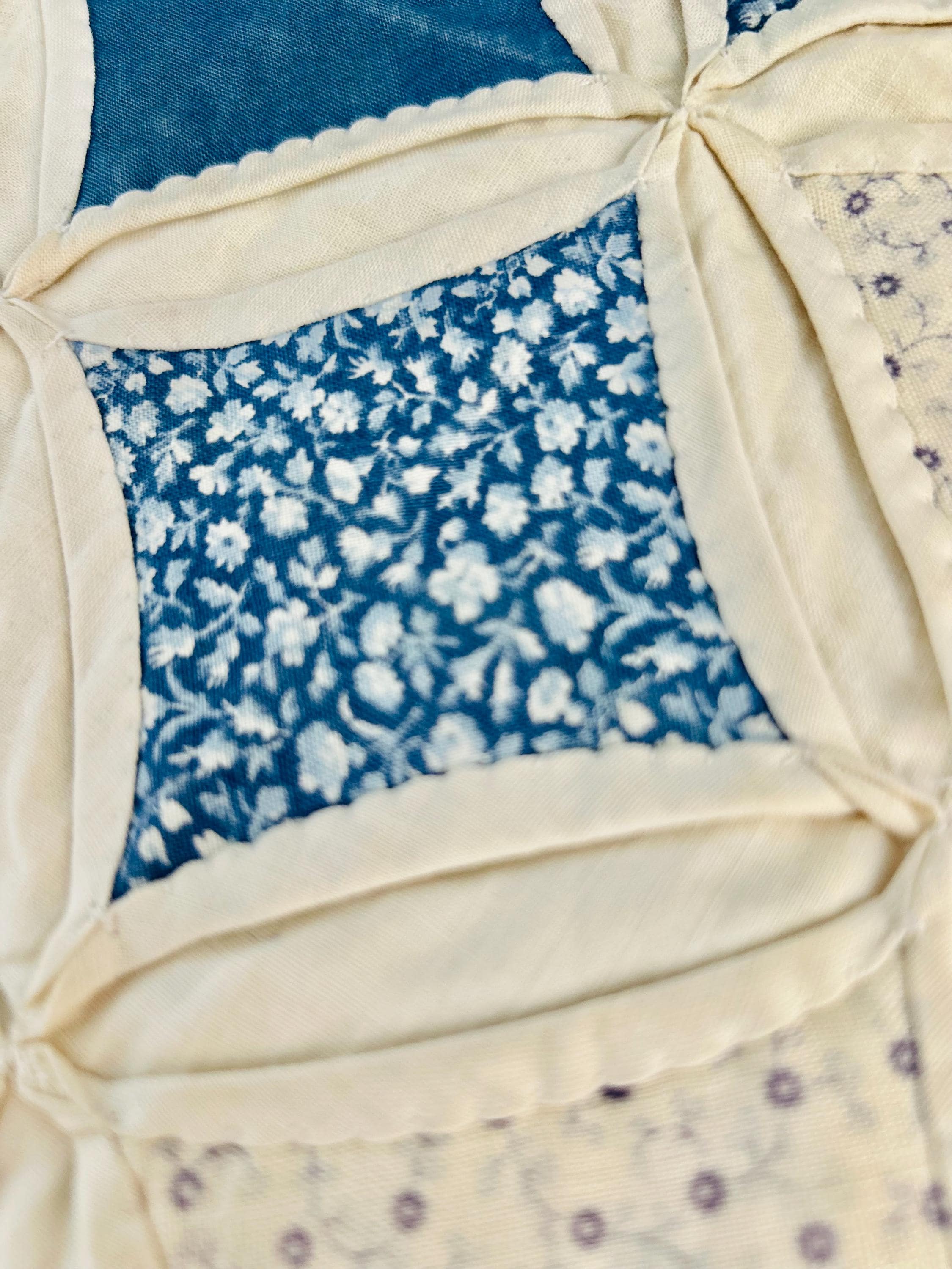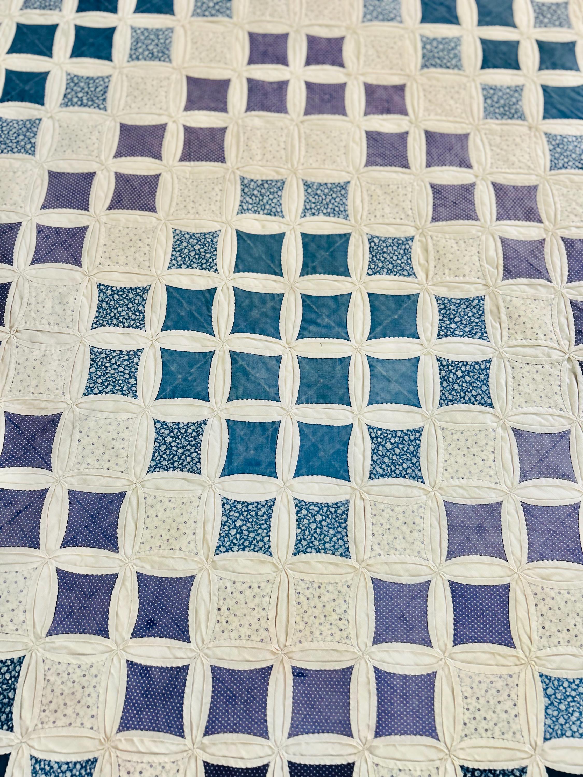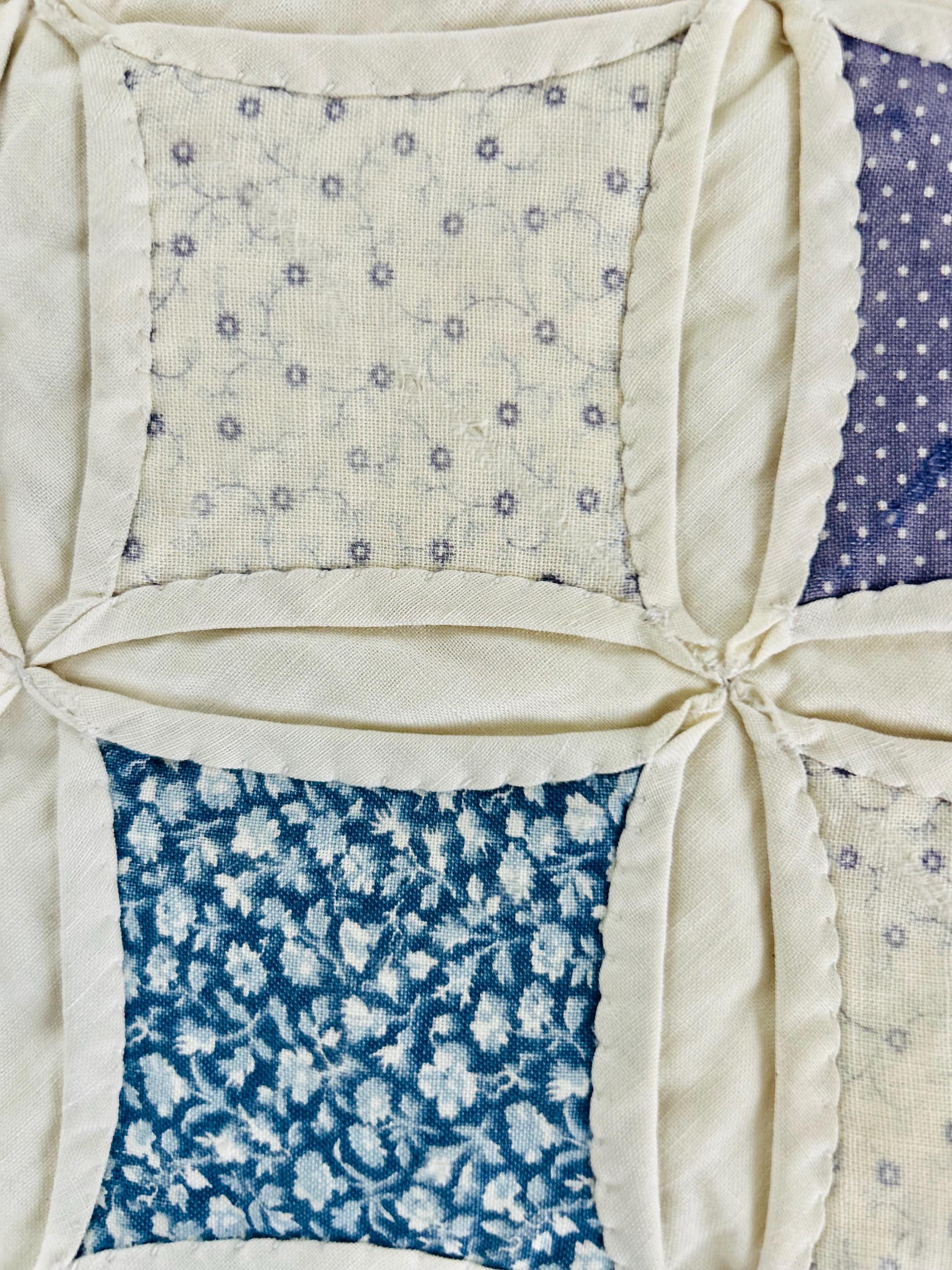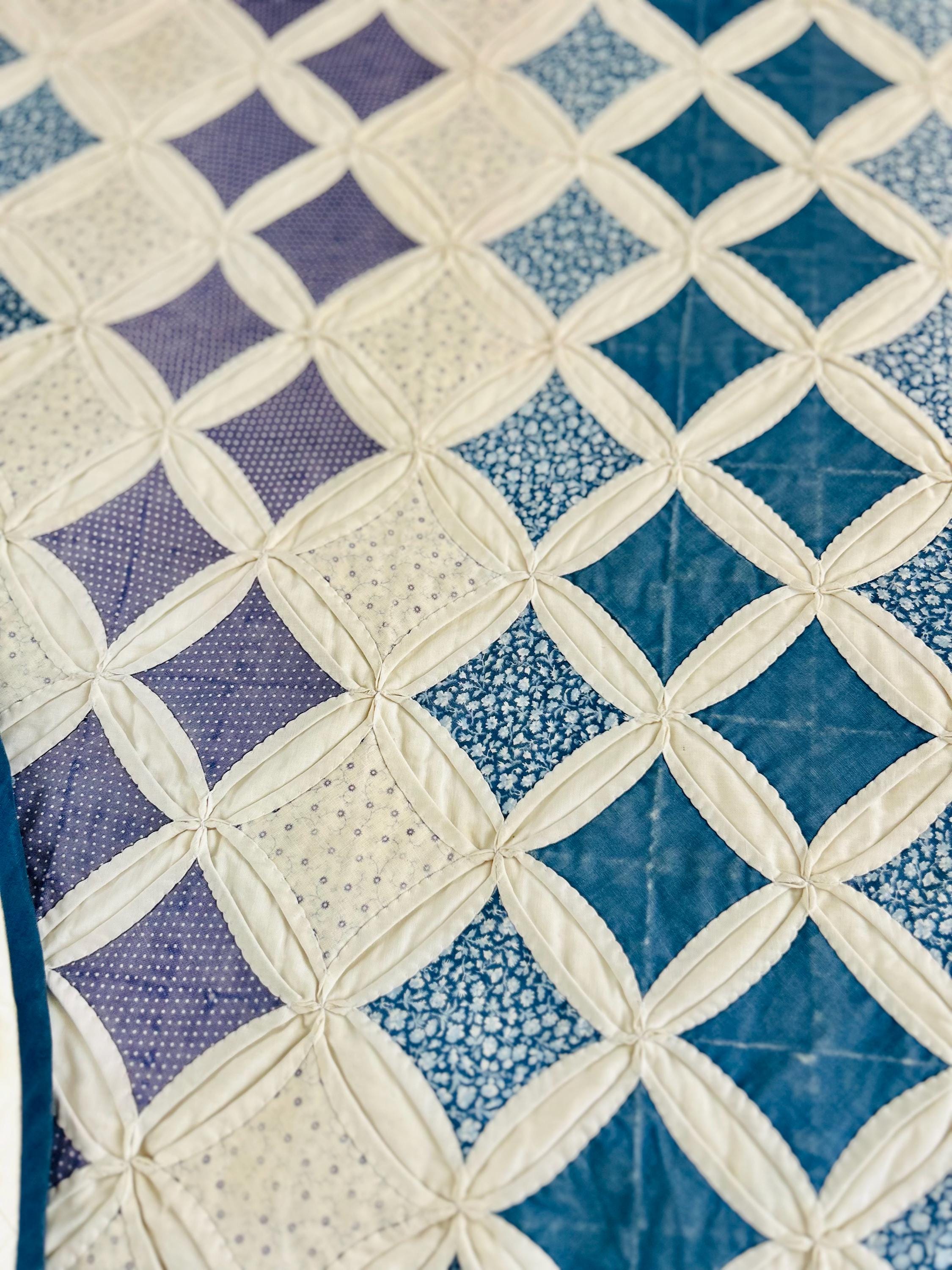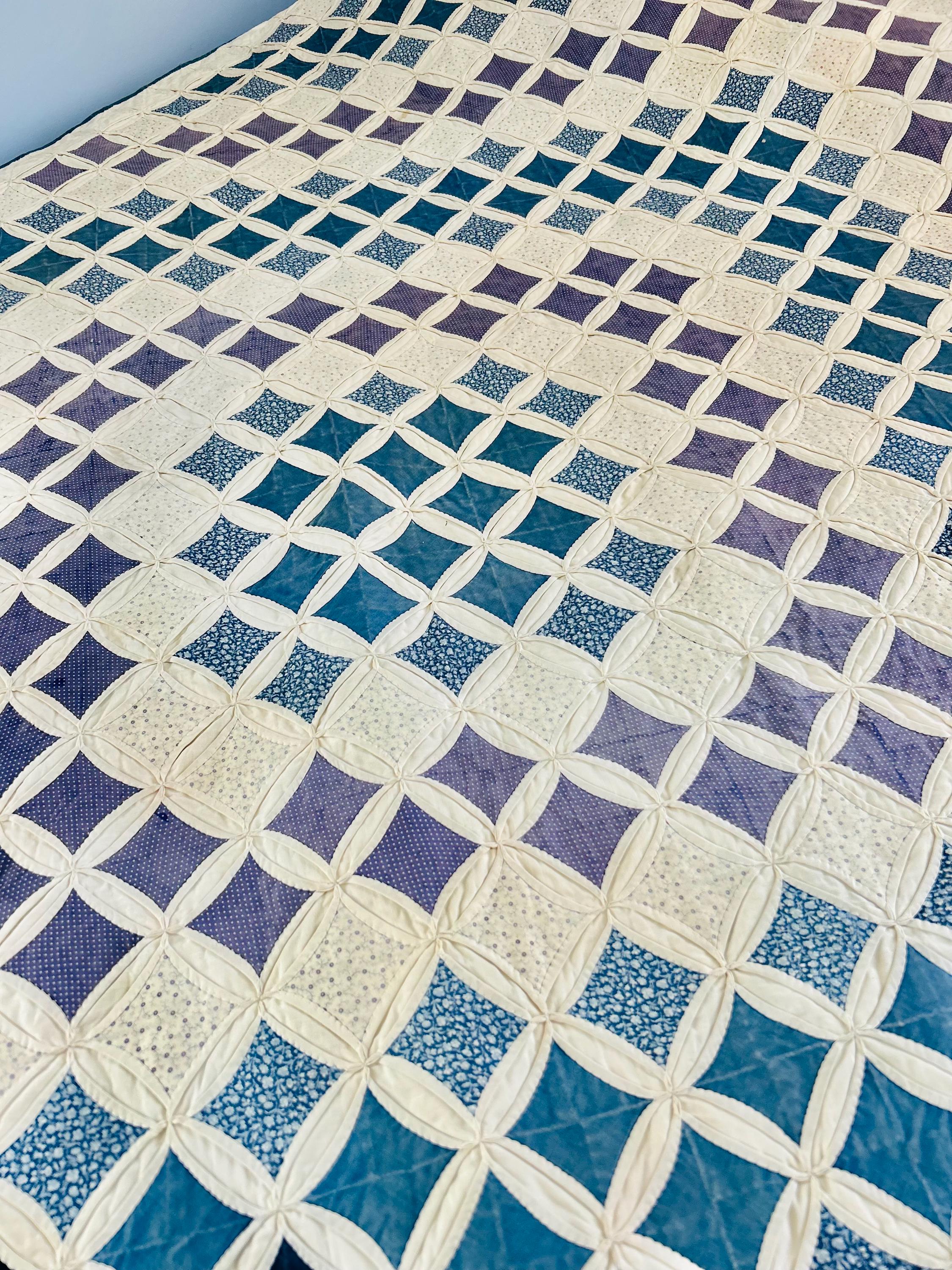 Stunning Cathedral Windows Quilt, circa 1970s, which unlike traditional quilts, is made by folding and stitching individual muslin blocks, creating a sculptural texture and beautifully intricate design. This unusual quilt goes a step further by arranging the blocks in a lovely blue and white pattern radiating from the center.