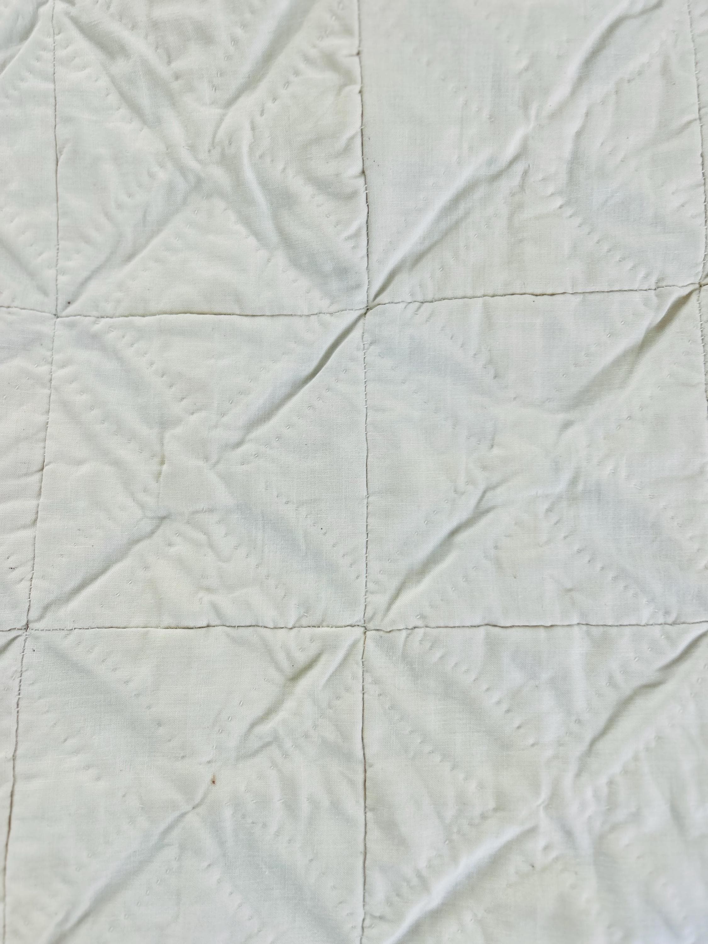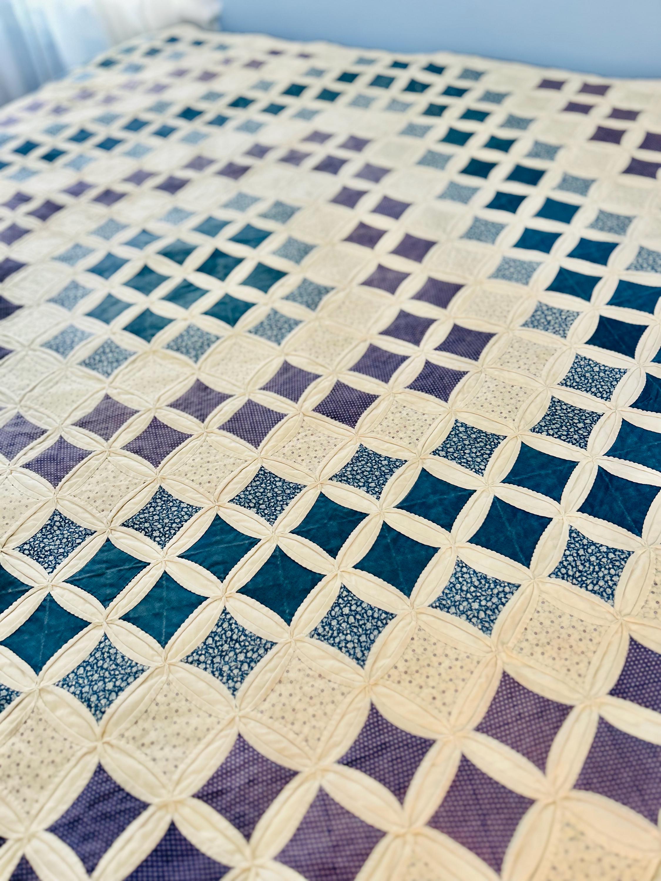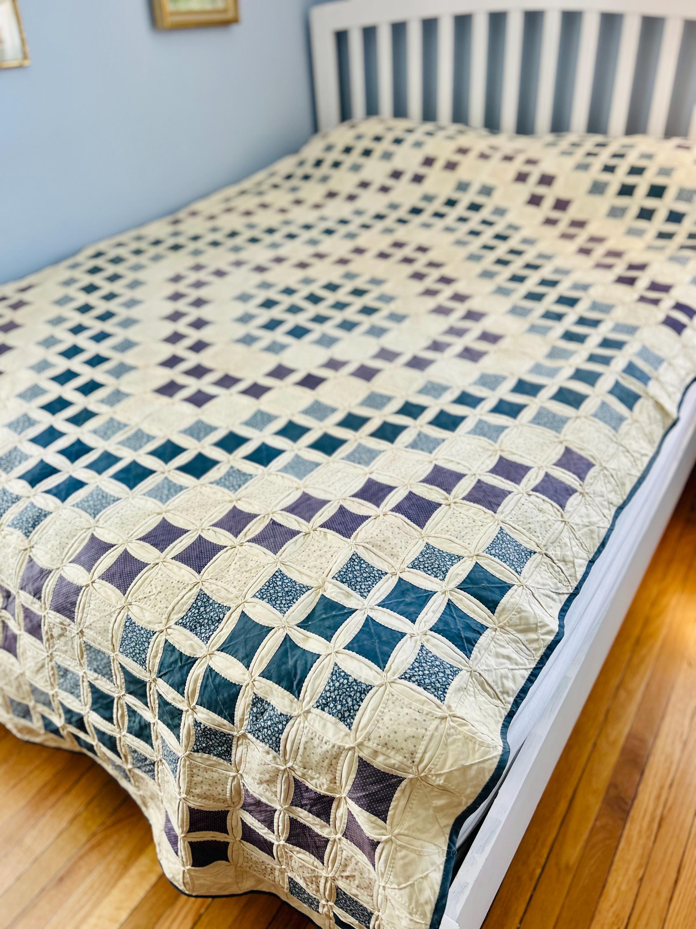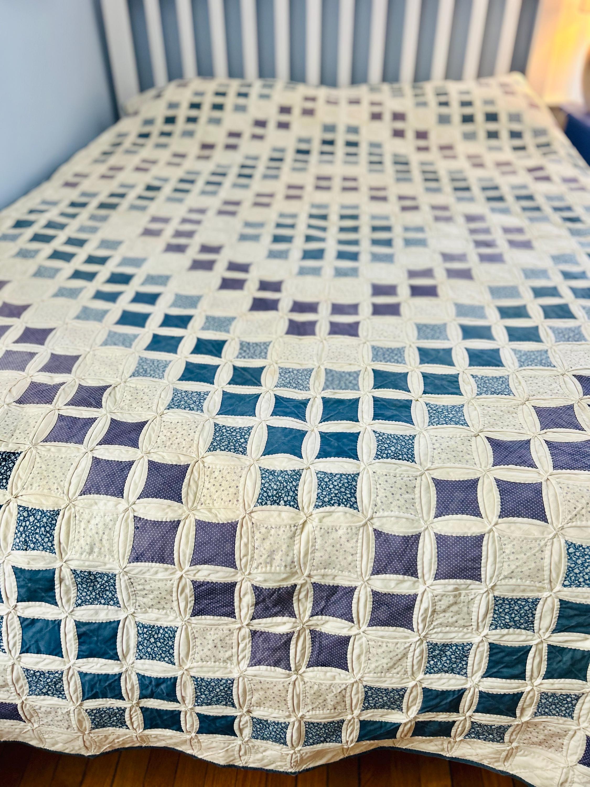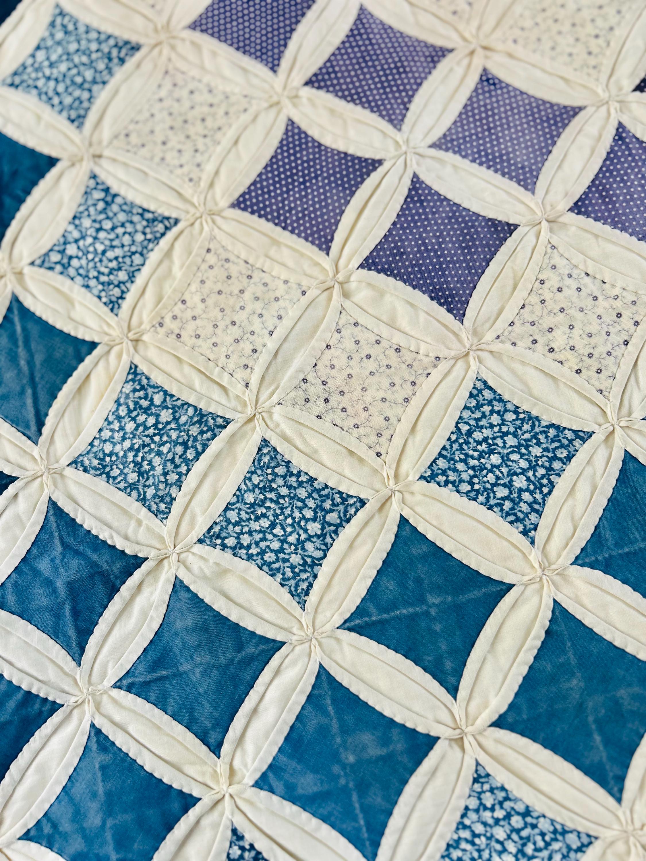 Stunning Cathedral Windows Quilt, circa 1970s, which unlike traditional quilts, is made by folding and stitching individual muslin blocks, creating a sculptural texture and beautifully intricate design. This unusual quilt goes a step further by arranging the blocks in a lovely blue and white pattern radiating from the center.