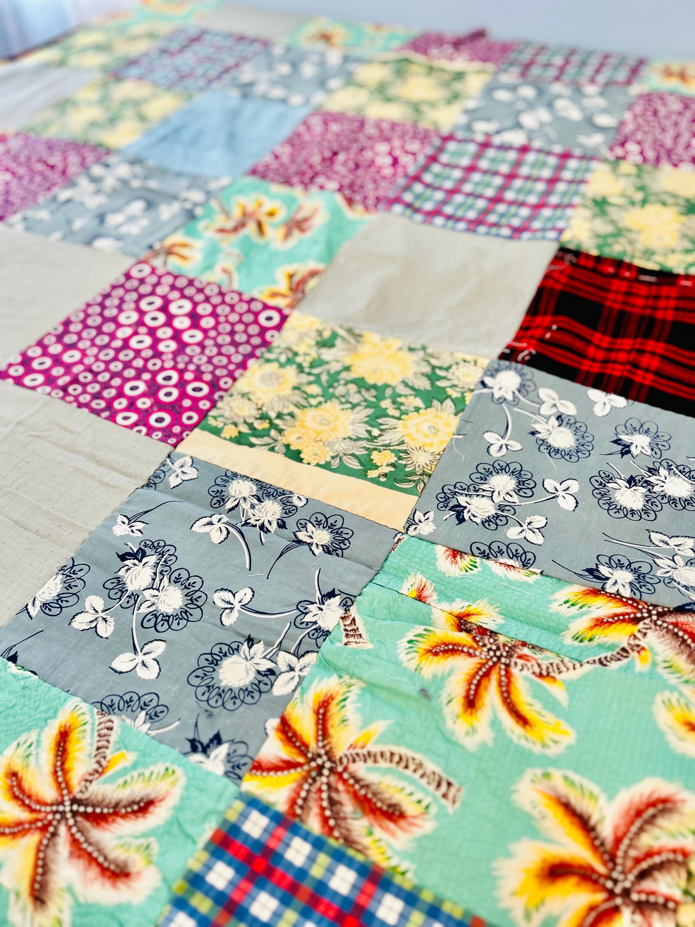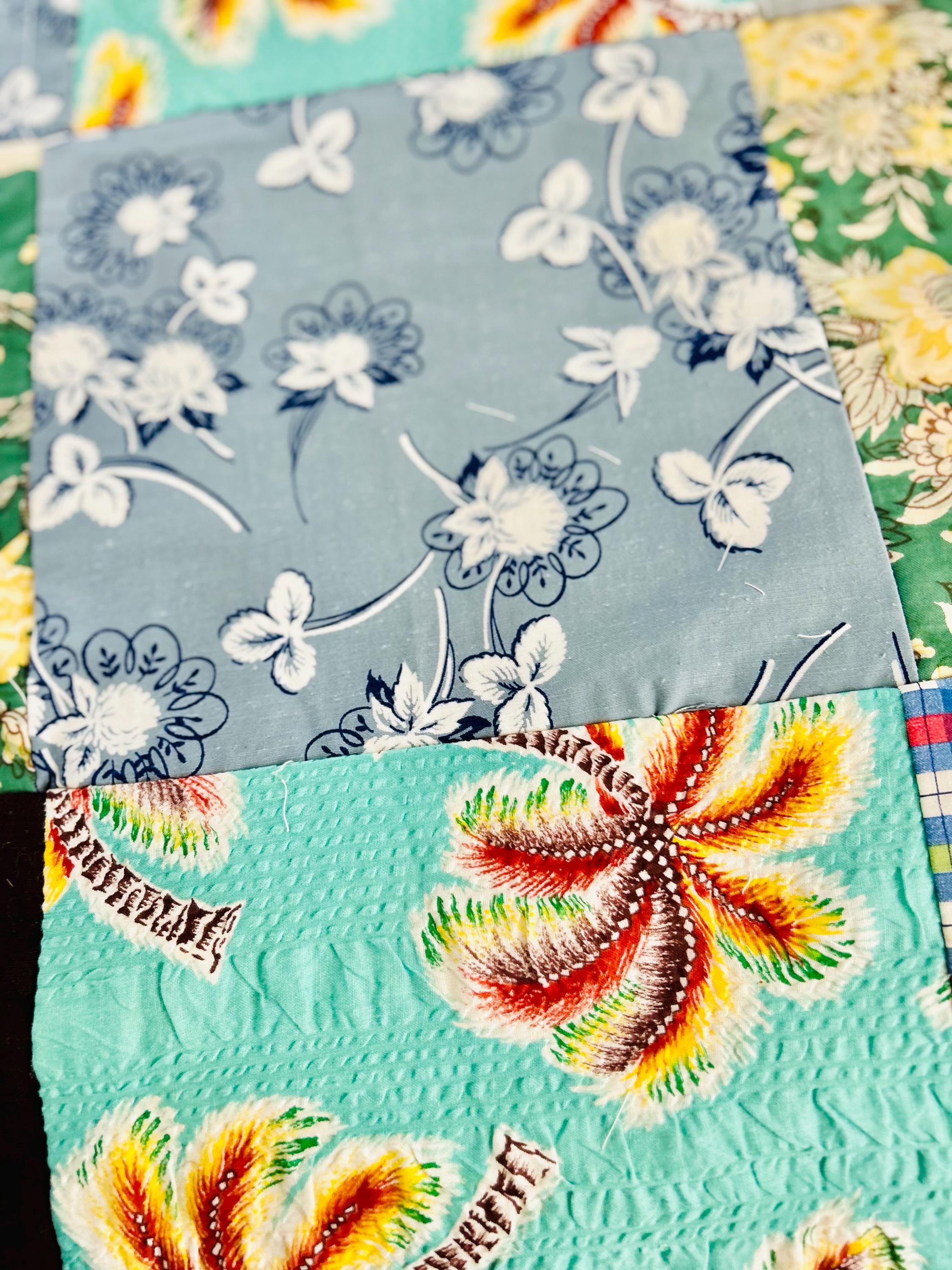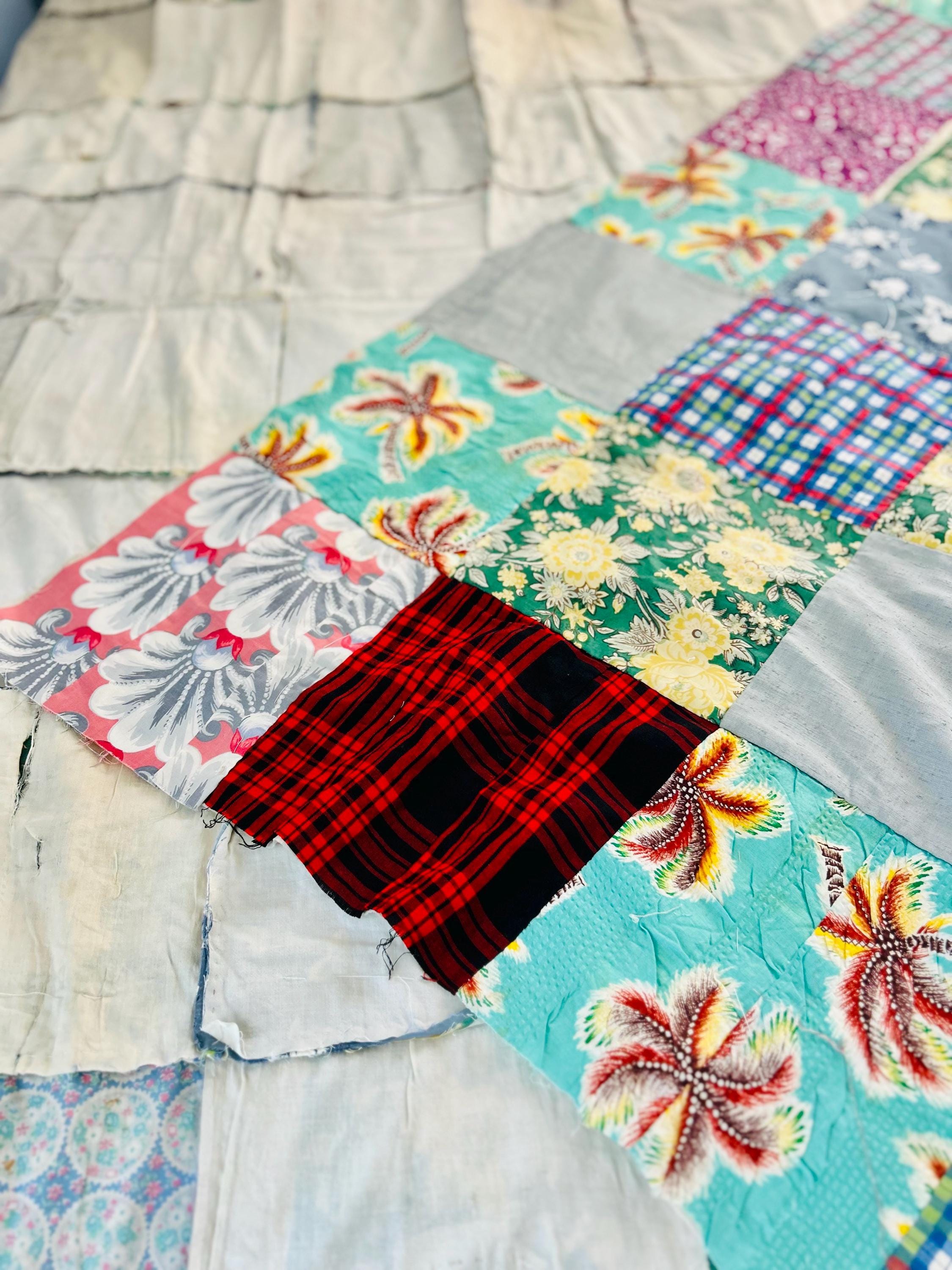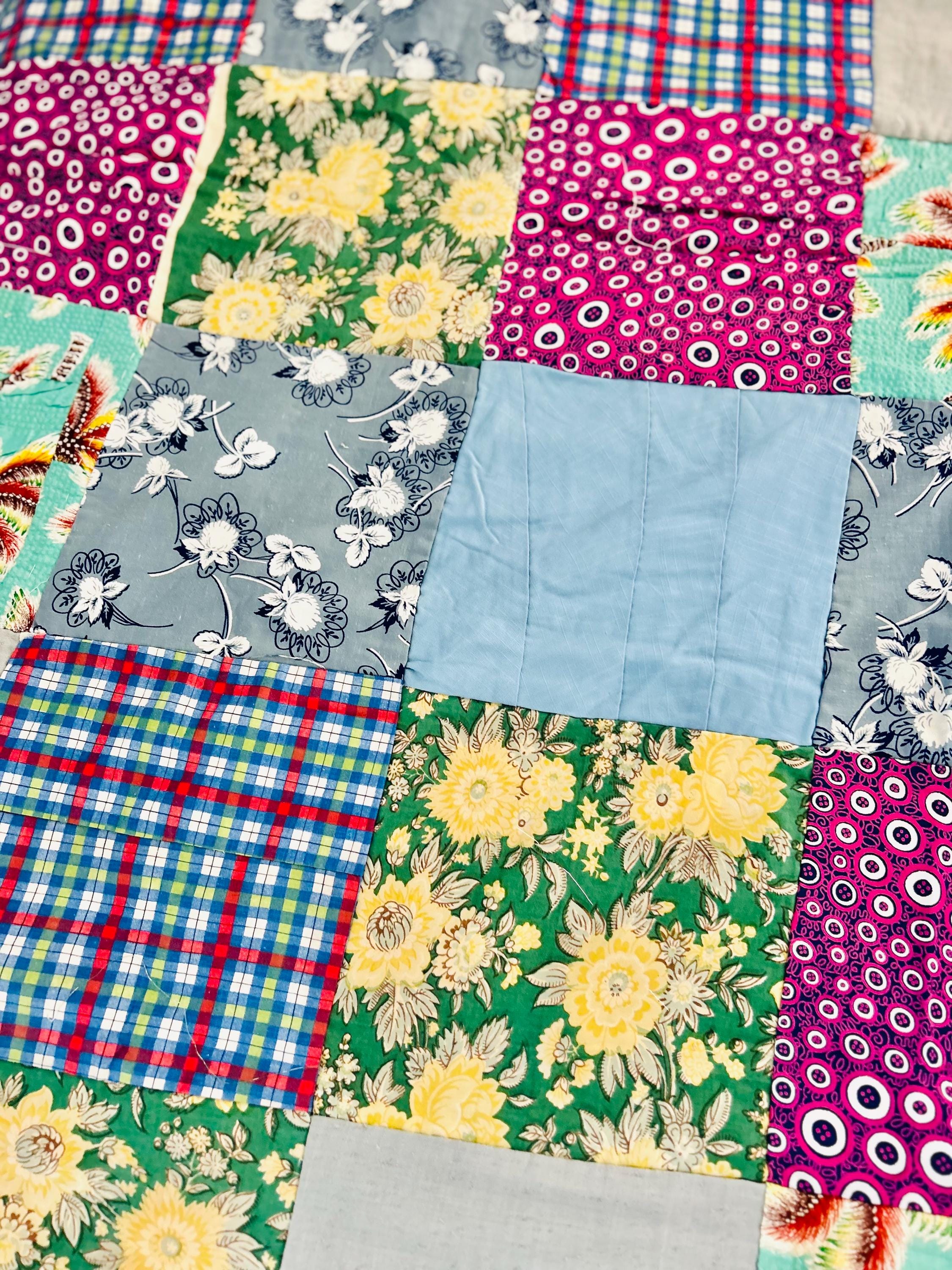 This foundation-pieced Patchwork Quilt TOP only, circa 1940s, is made of vibrant mid-century novelty prints, including floral feedsack-style patterns, plaids, circular geometrics and soft solids.
