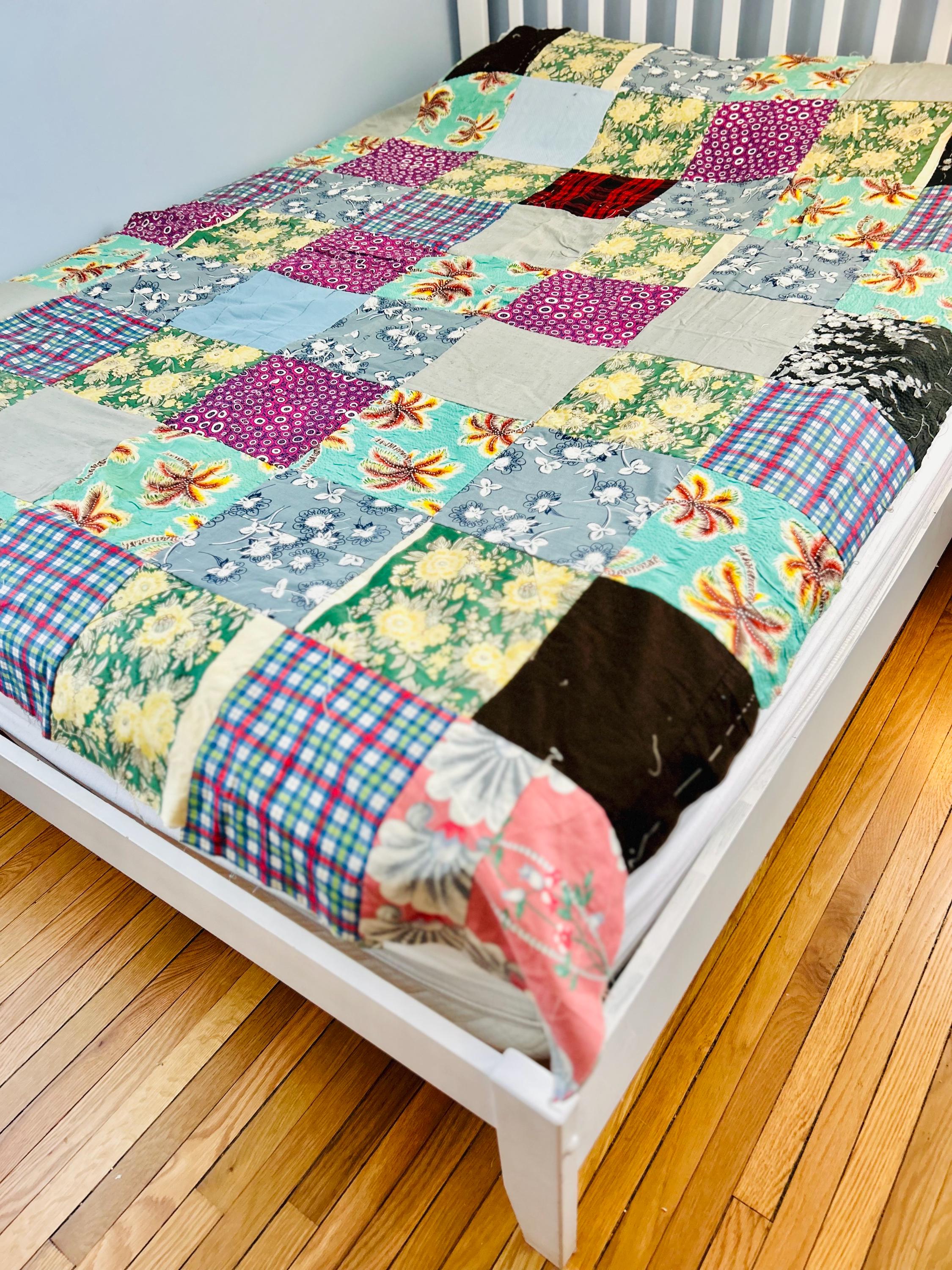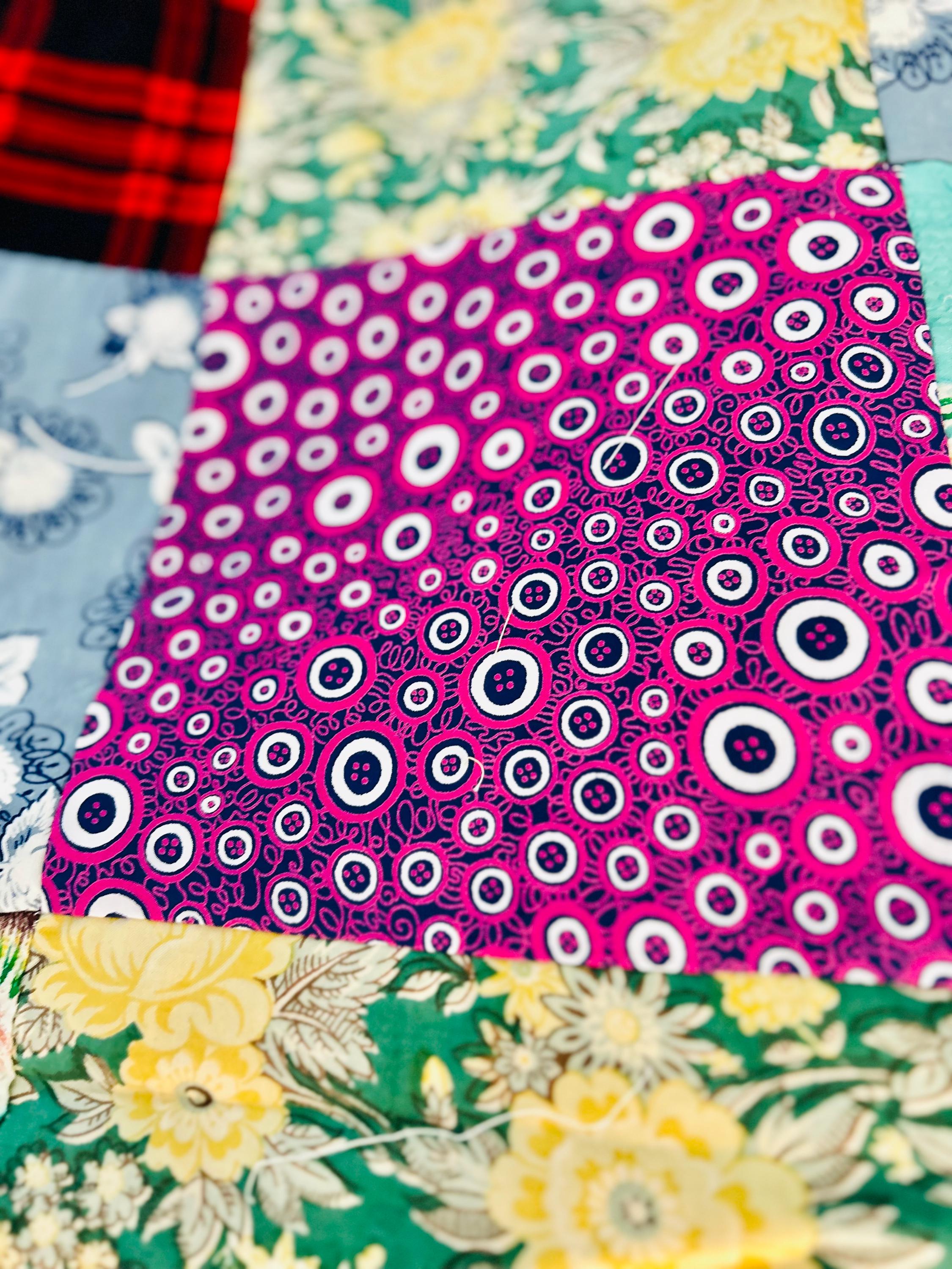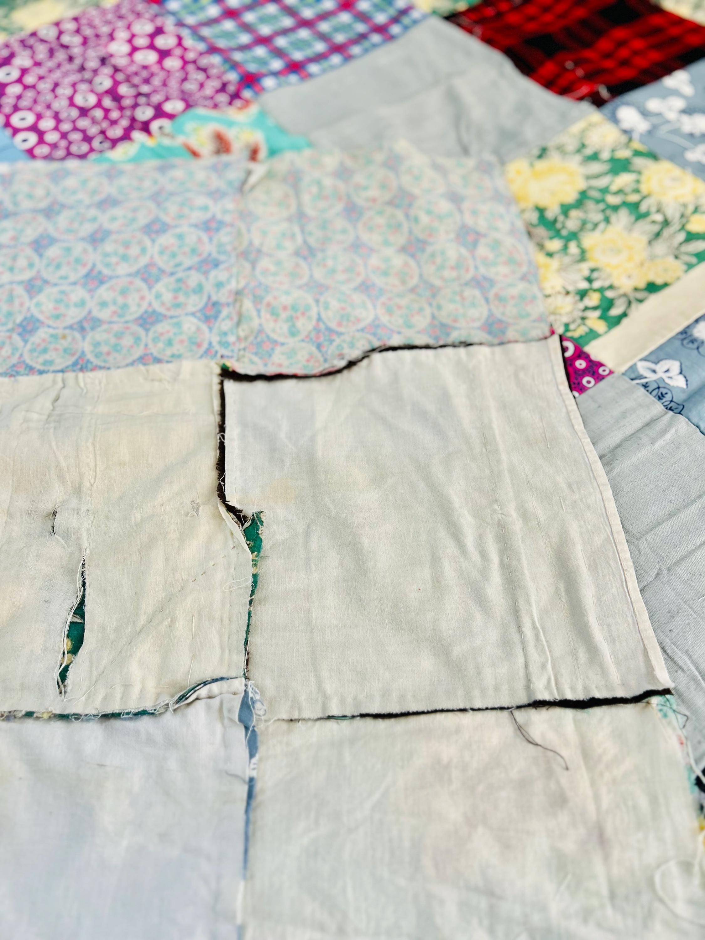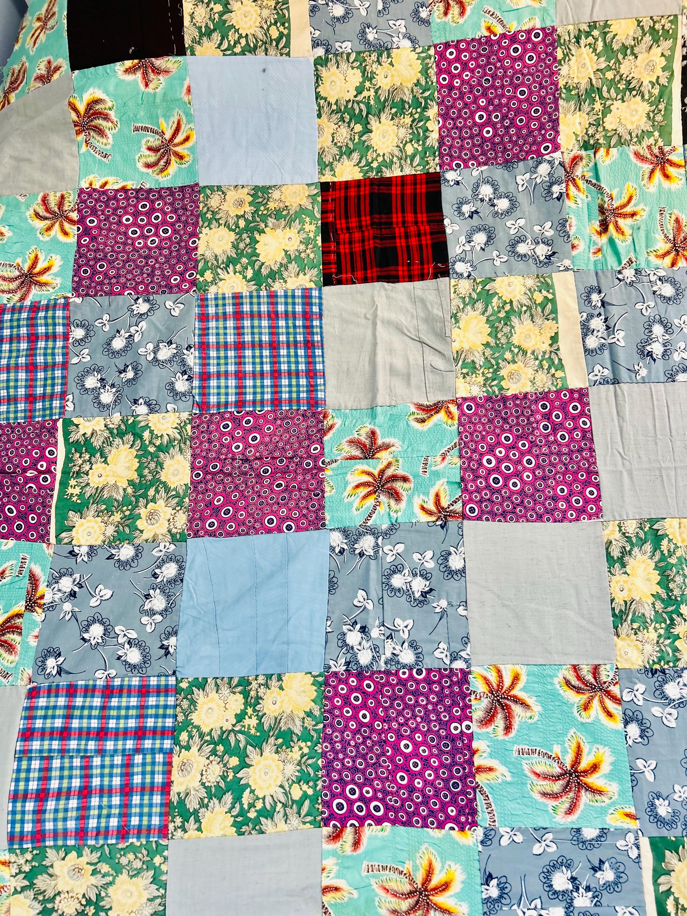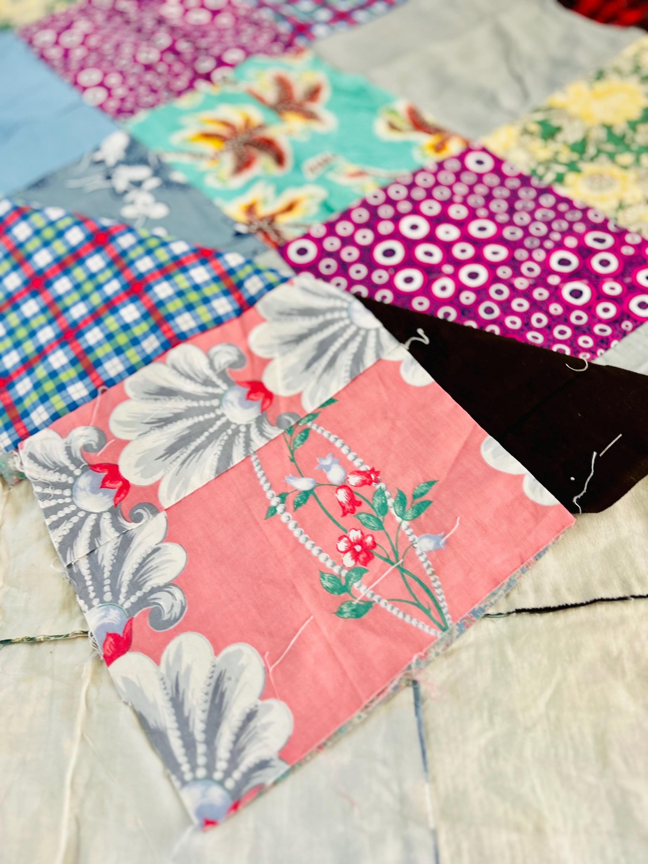 This foundation-pieced Patchwork Quilt TOP only, circa 1940s, is made of vibrant mid-century novelty prints, including floral feedsack-style patterns, plaids, circular geometrics and soft solids.