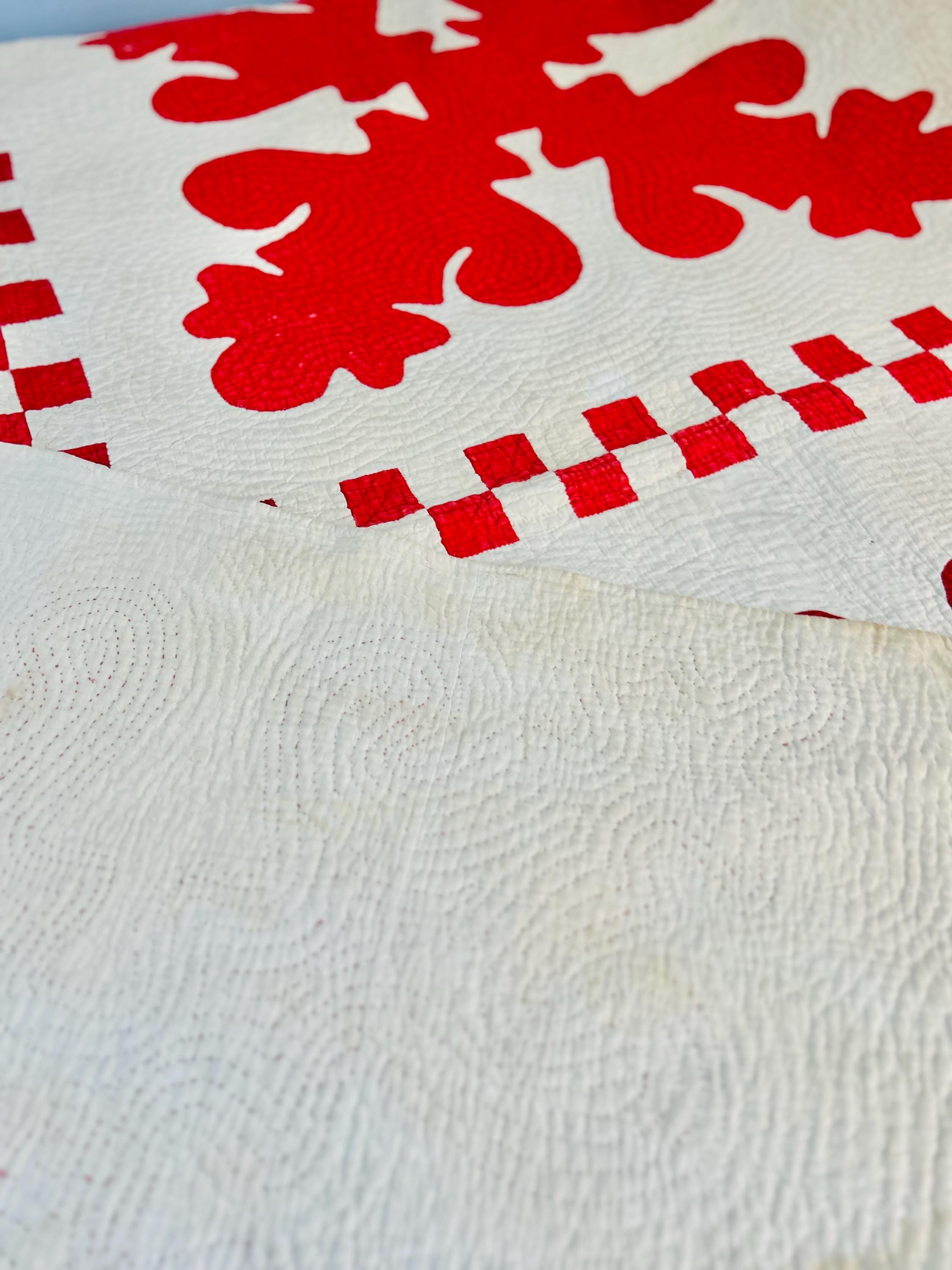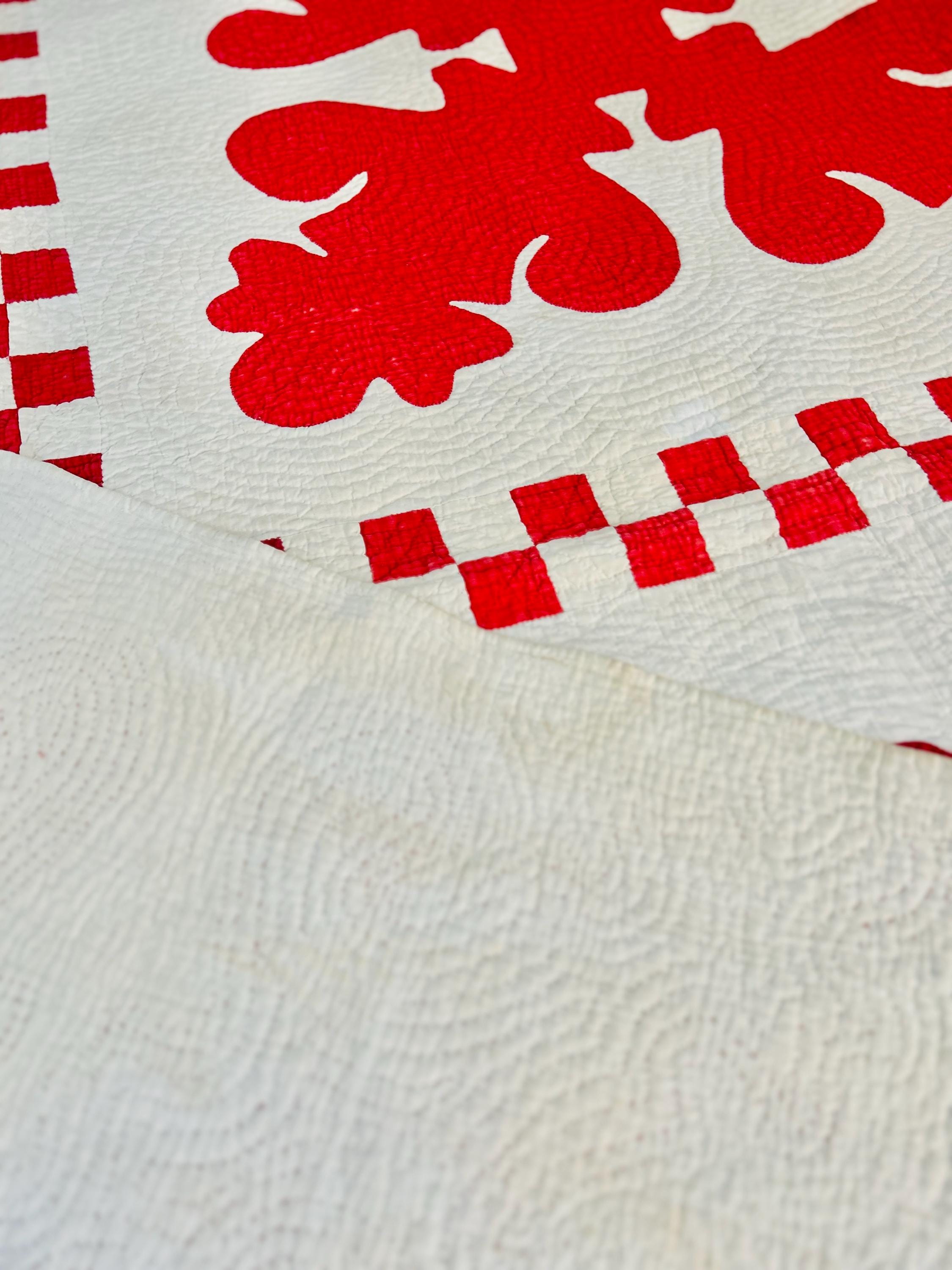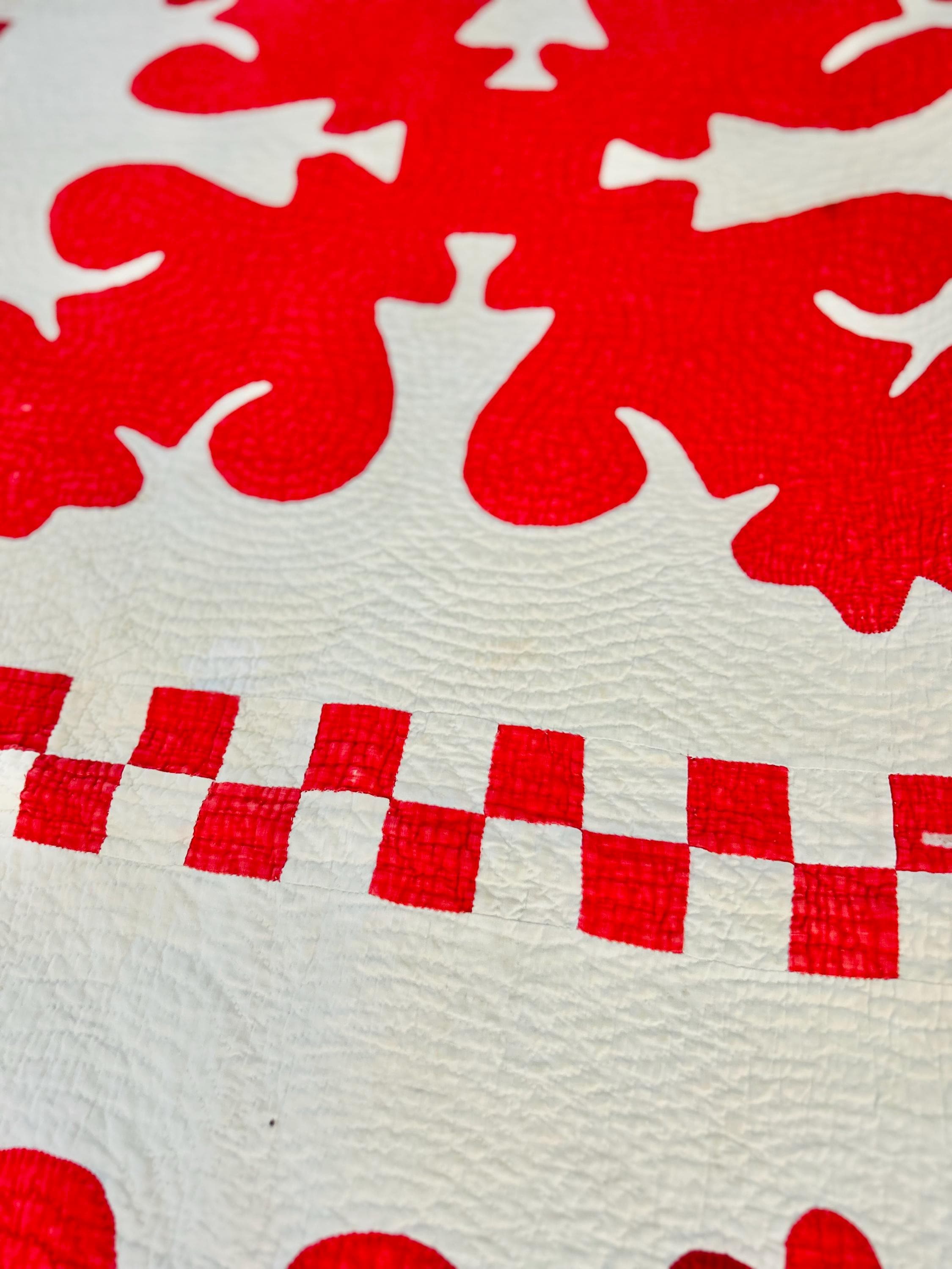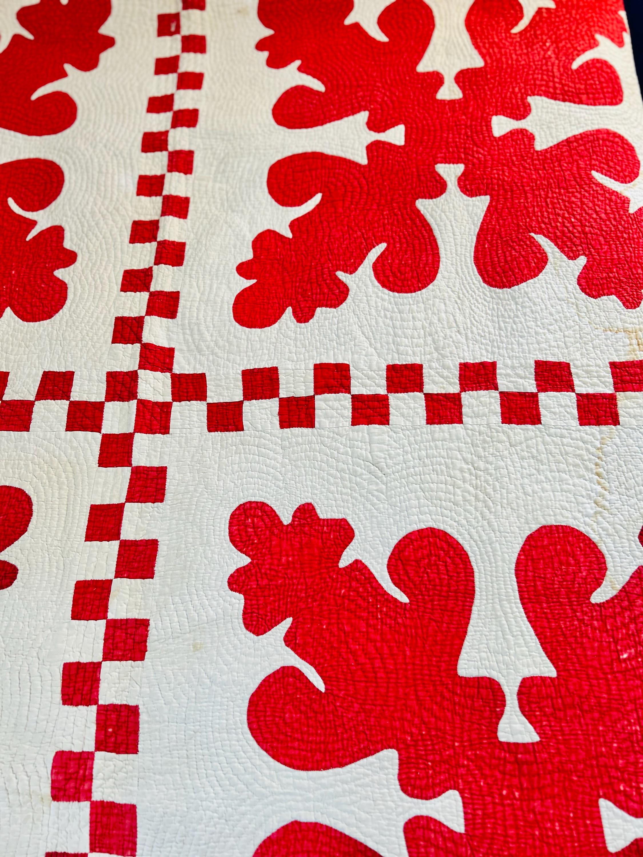 This stunning Scherenschnitte Quilt, 1880s, has a unique red and white patchwork sashing running between the four main blocks and has been so densely quilted in echoes of the applique that in parts it is stipple quilted.