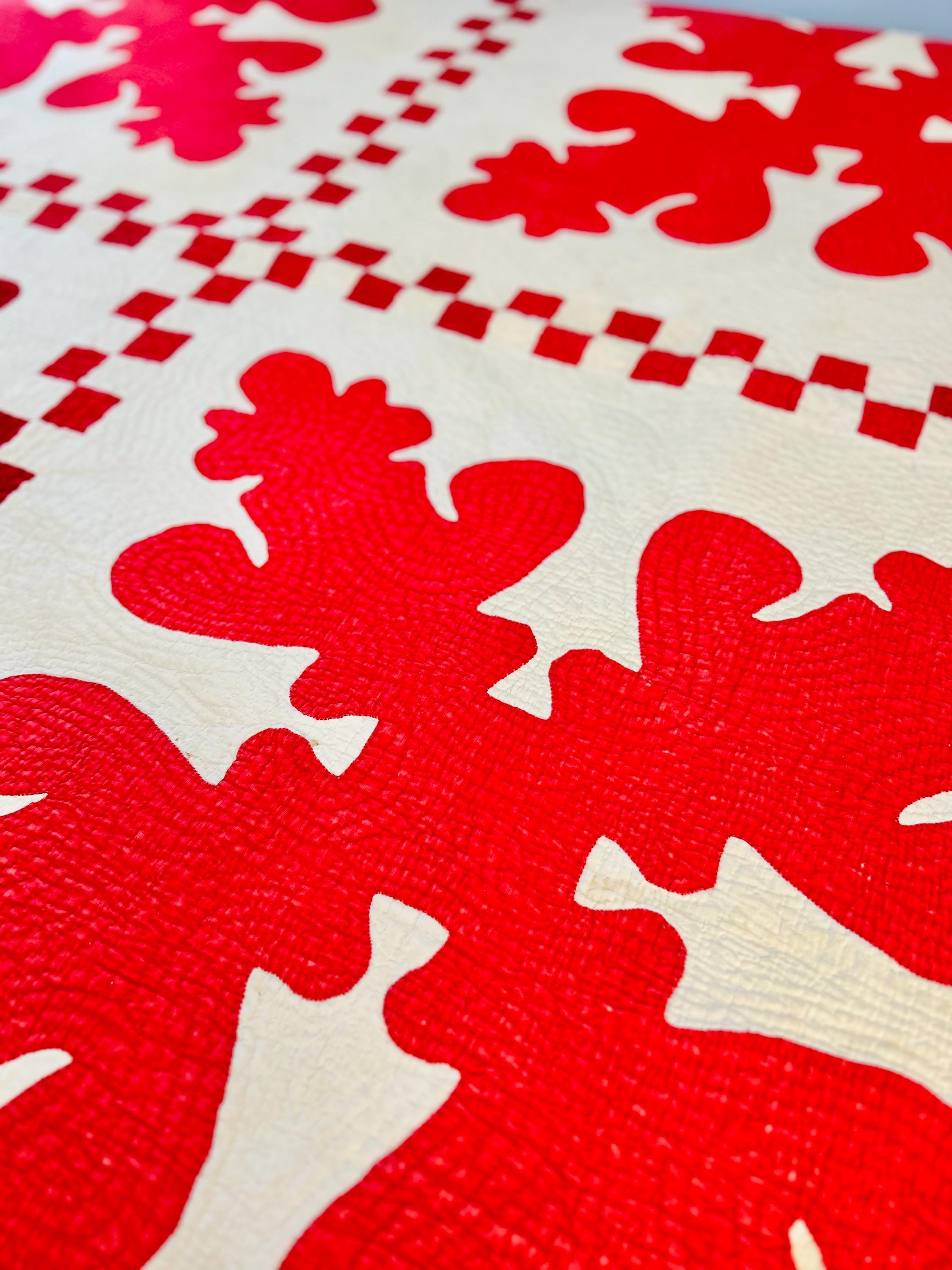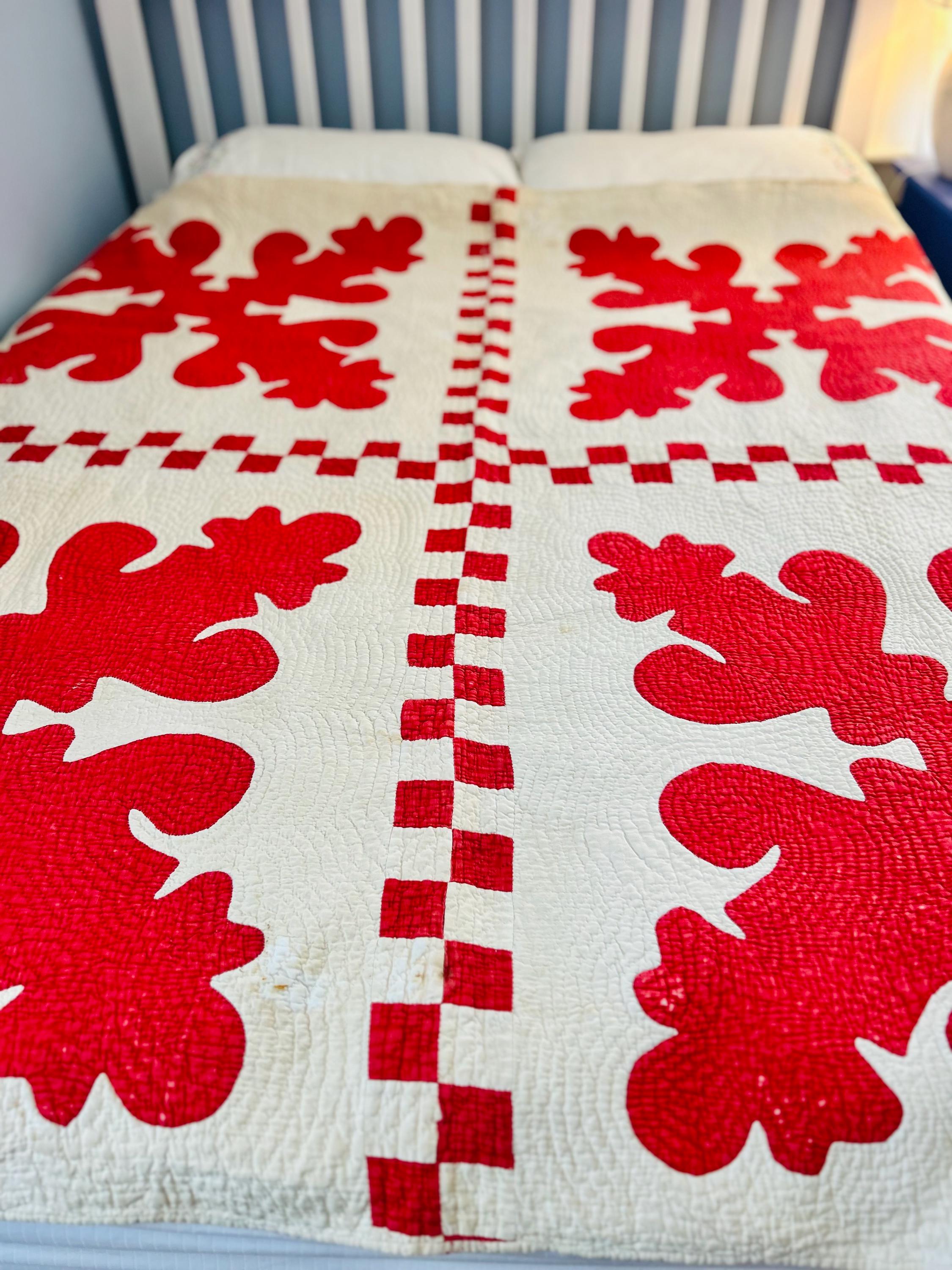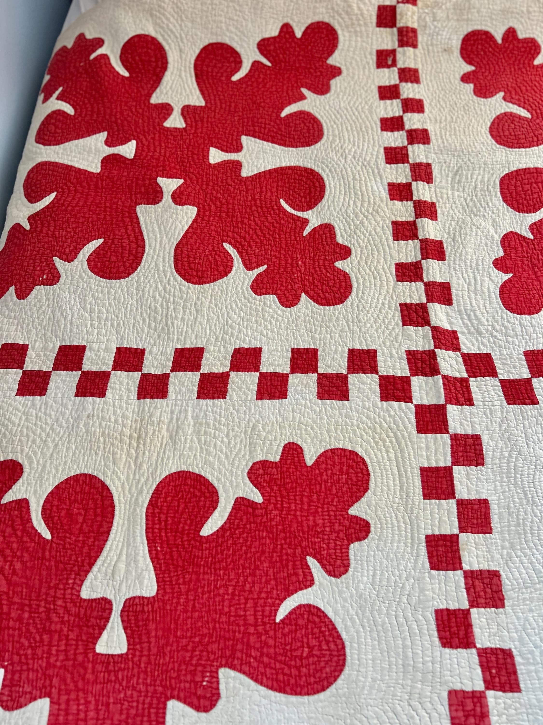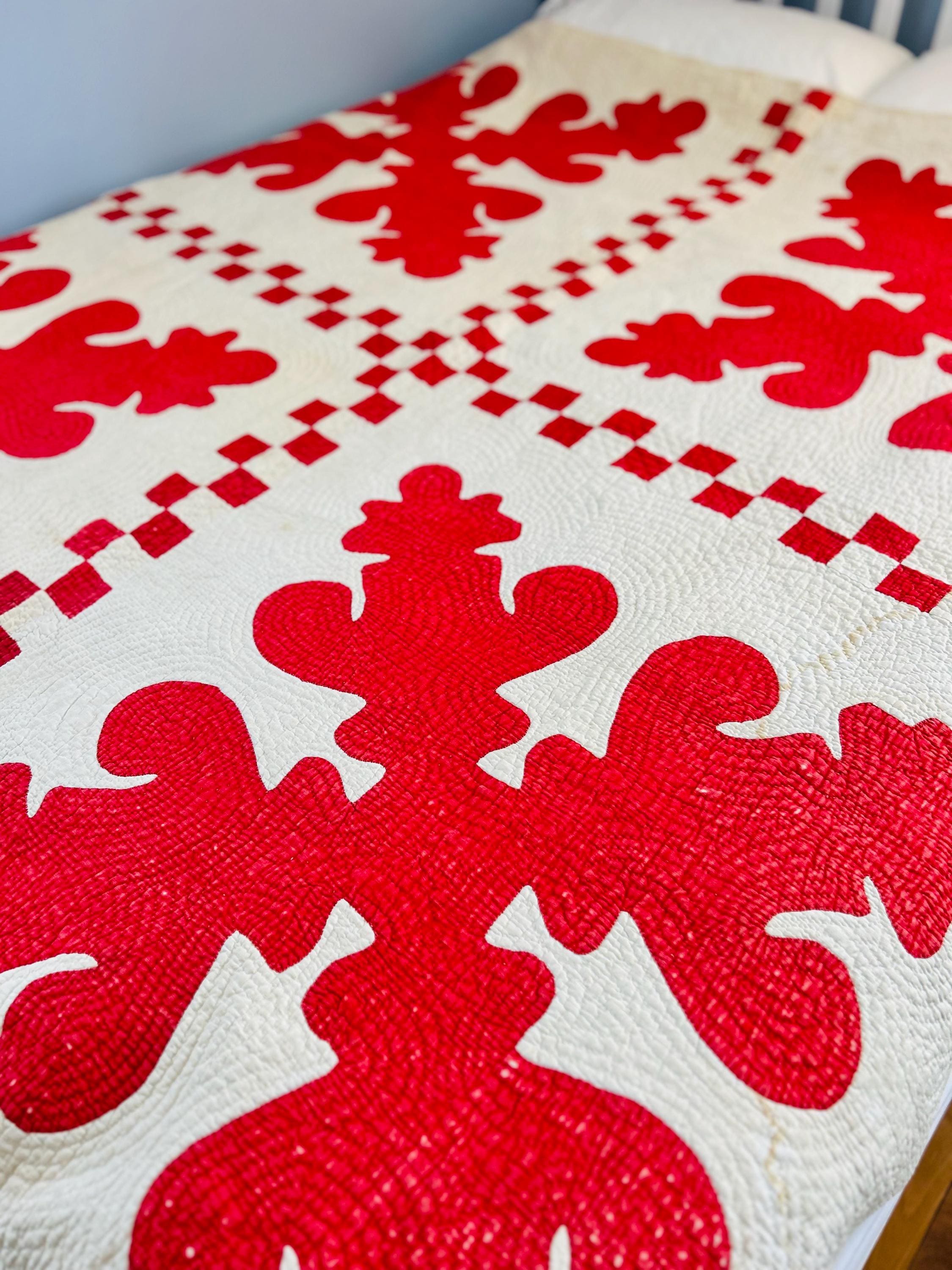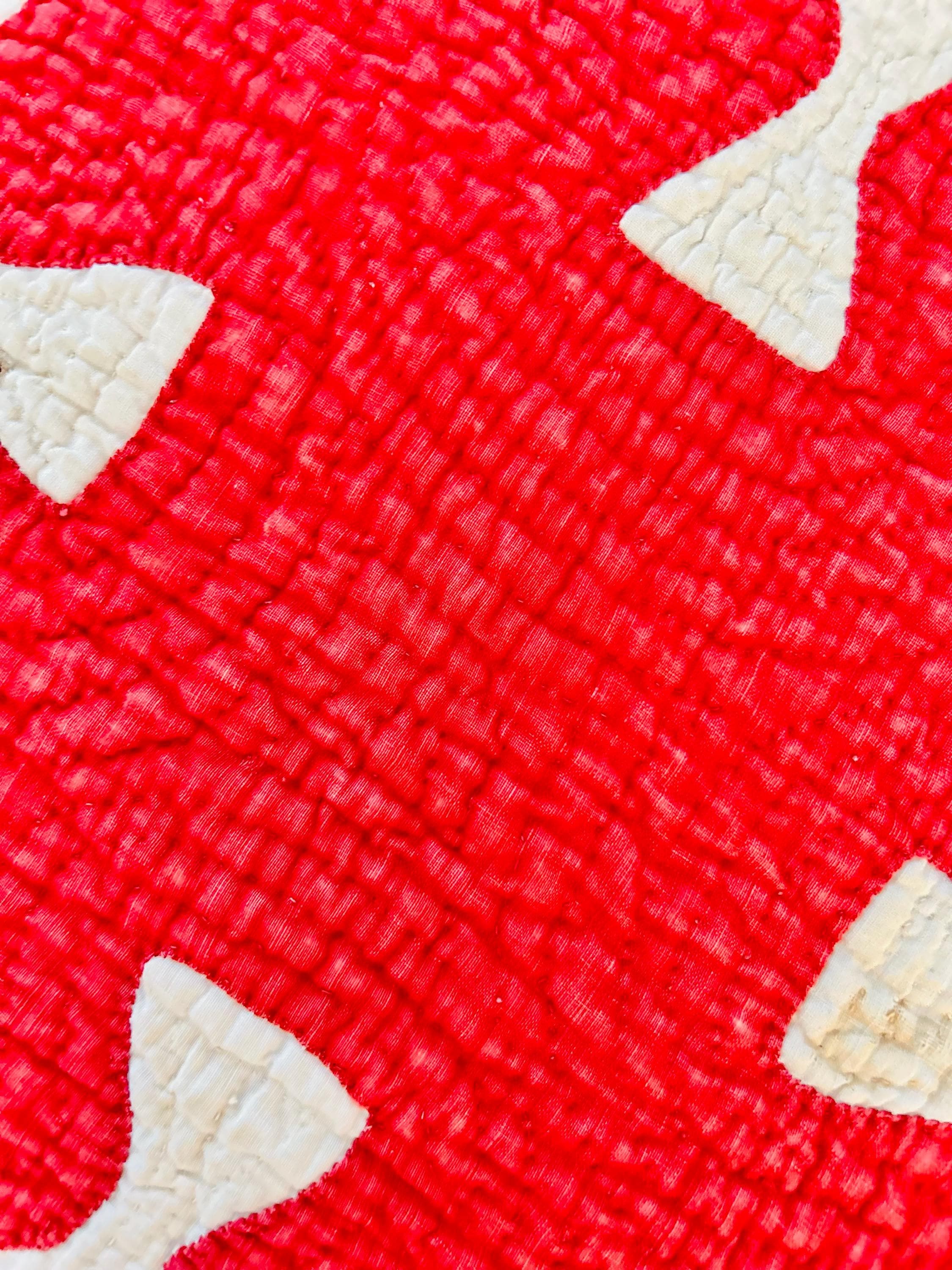 This stunning Scherenschnitte Quilt, 1880s, has a unique red and white patchwork sashing running between the four main blocks and has been so densely quilted in echoes of the applique that in parts it is stipple quilted.