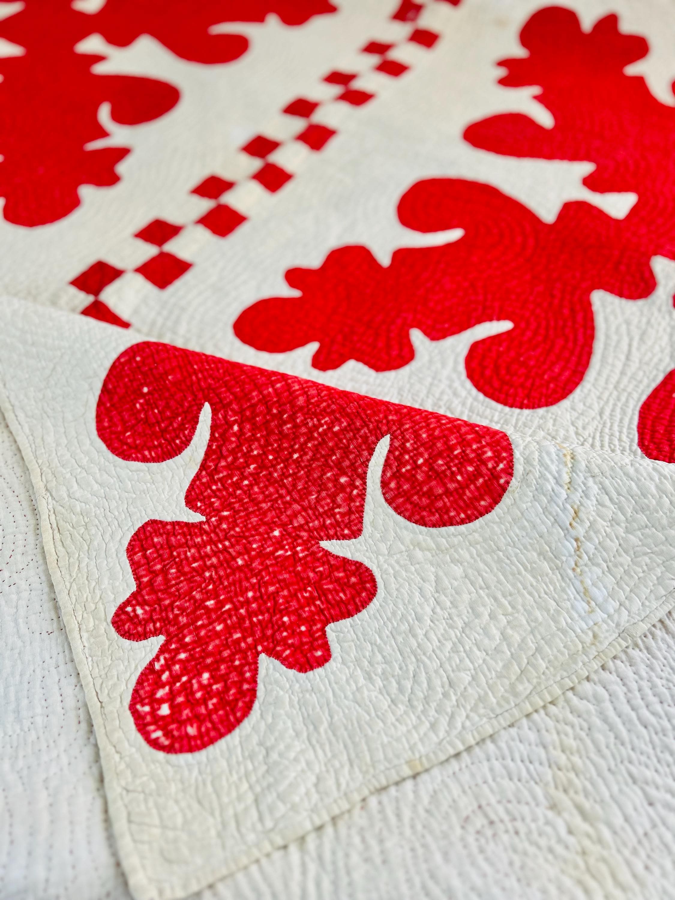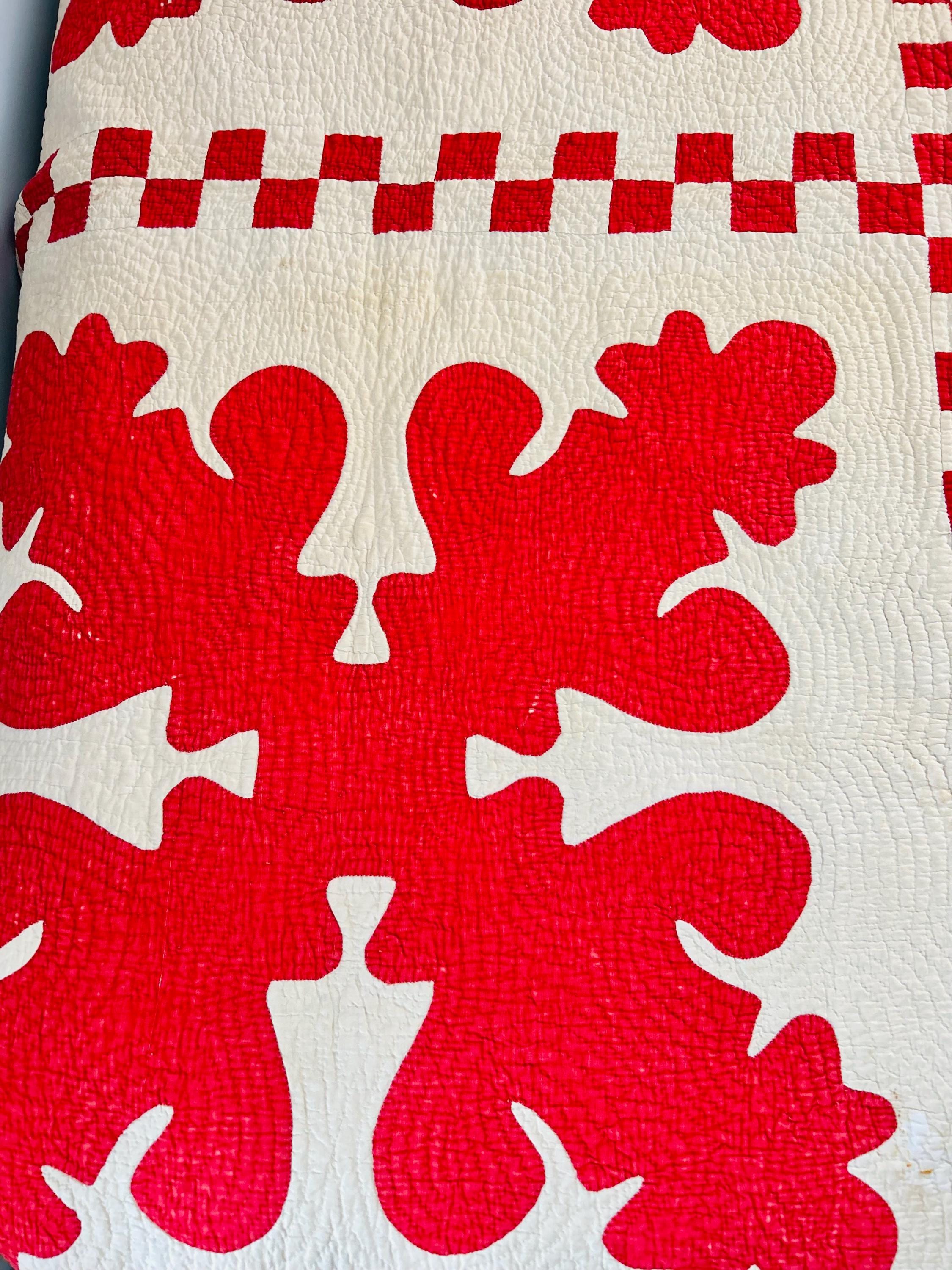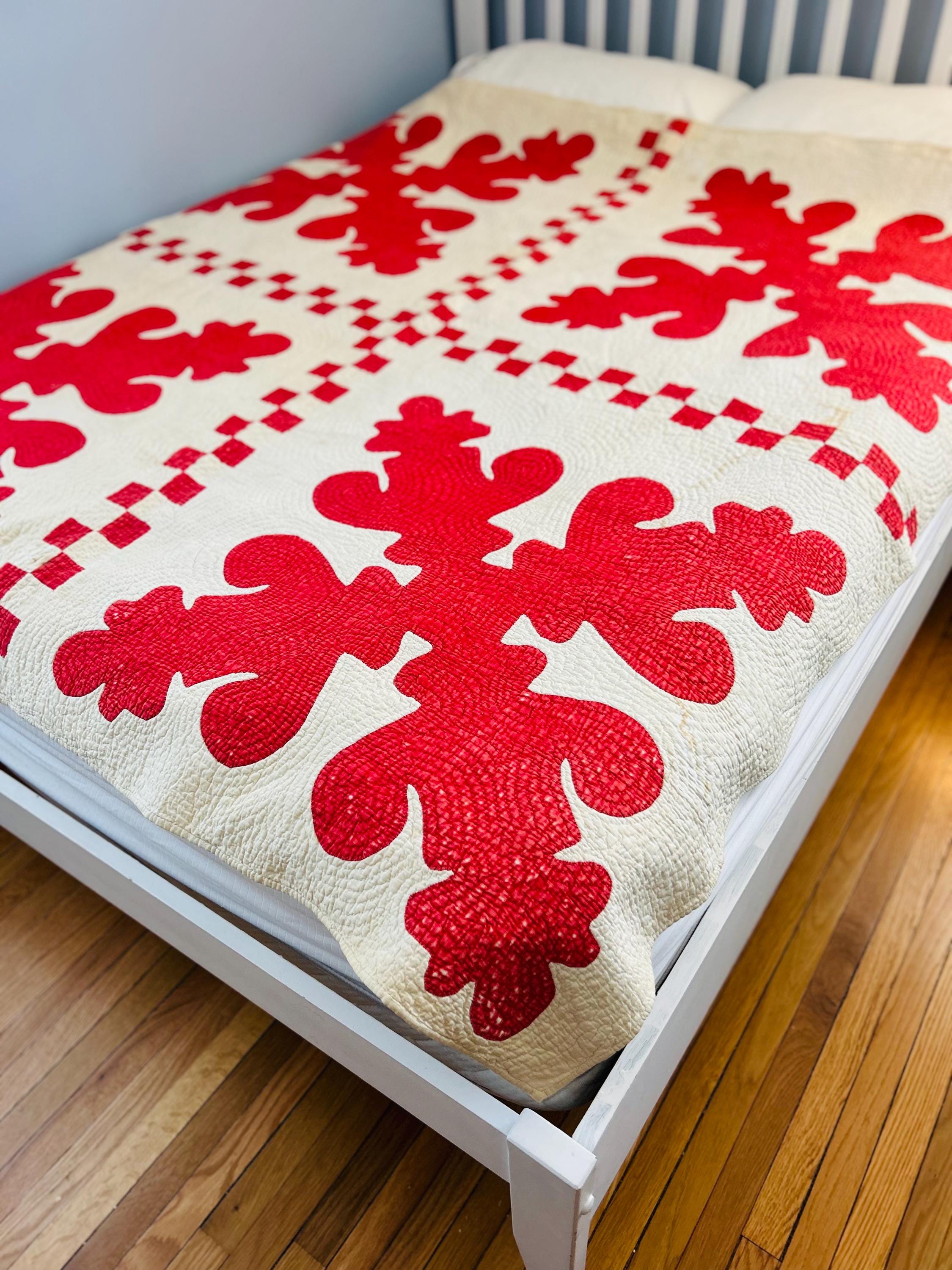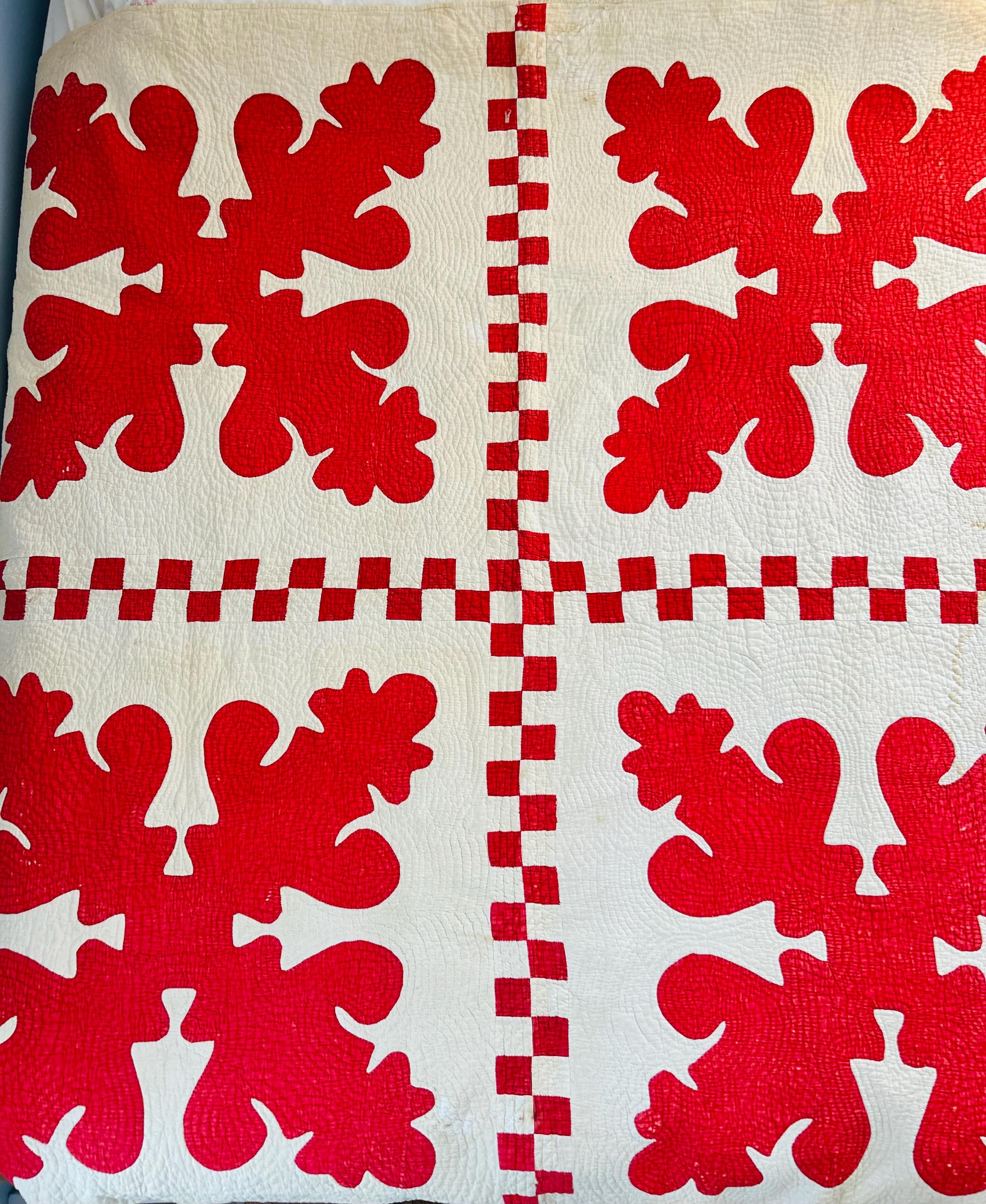 This stunning Scherenschnitte Quilt, 1880s, has a unique red and white patchwork sashing running between the four main blocks and has been so densely quilted in echoes of the applique that in parts it is stipple quilted.