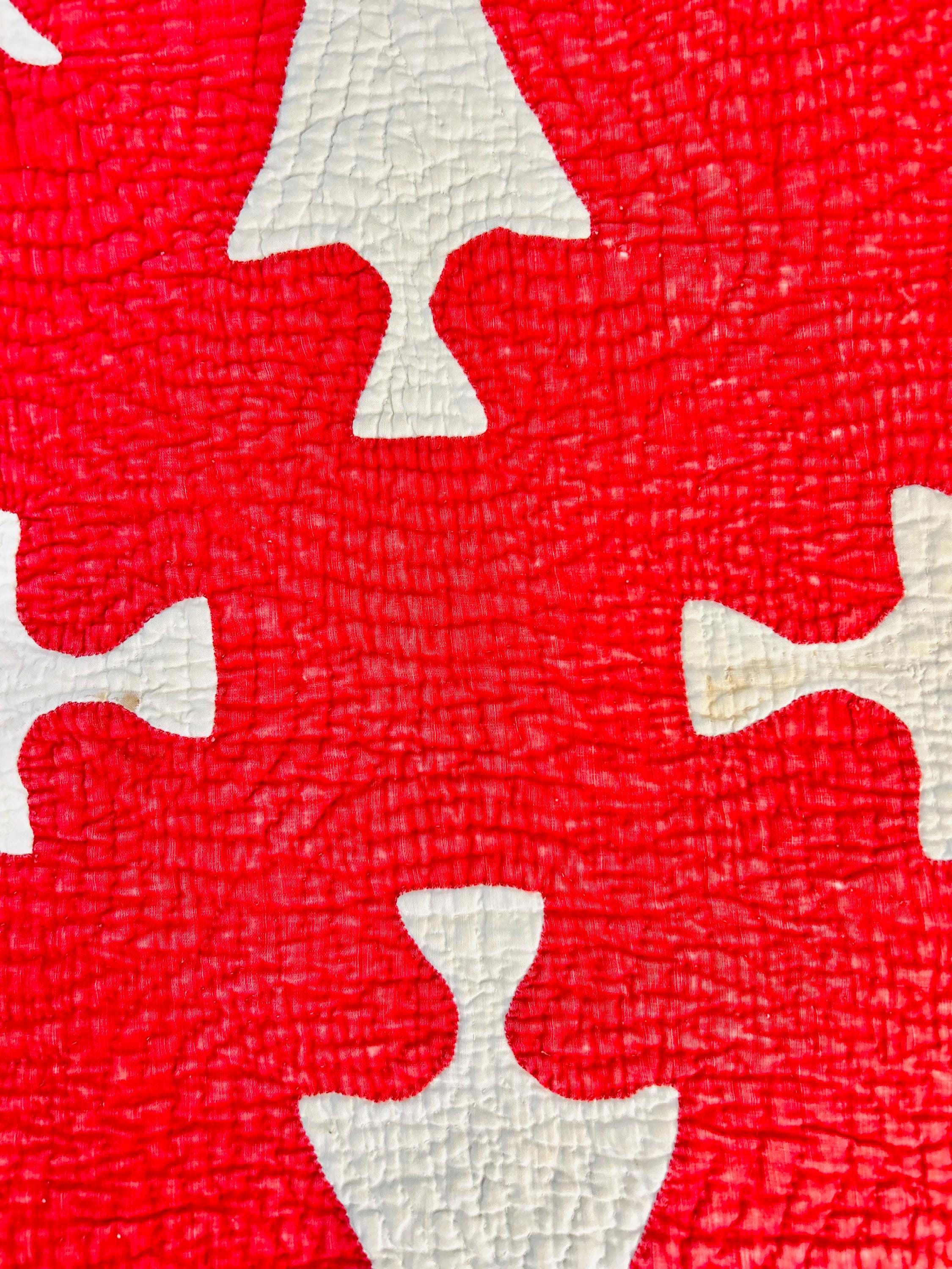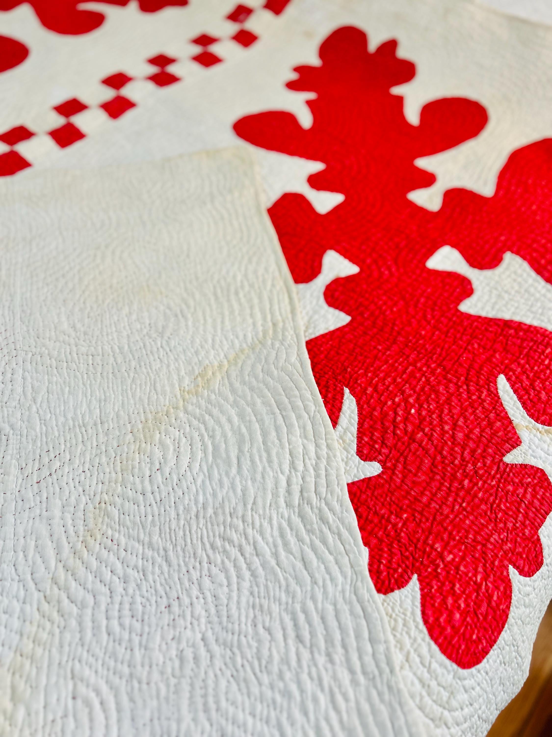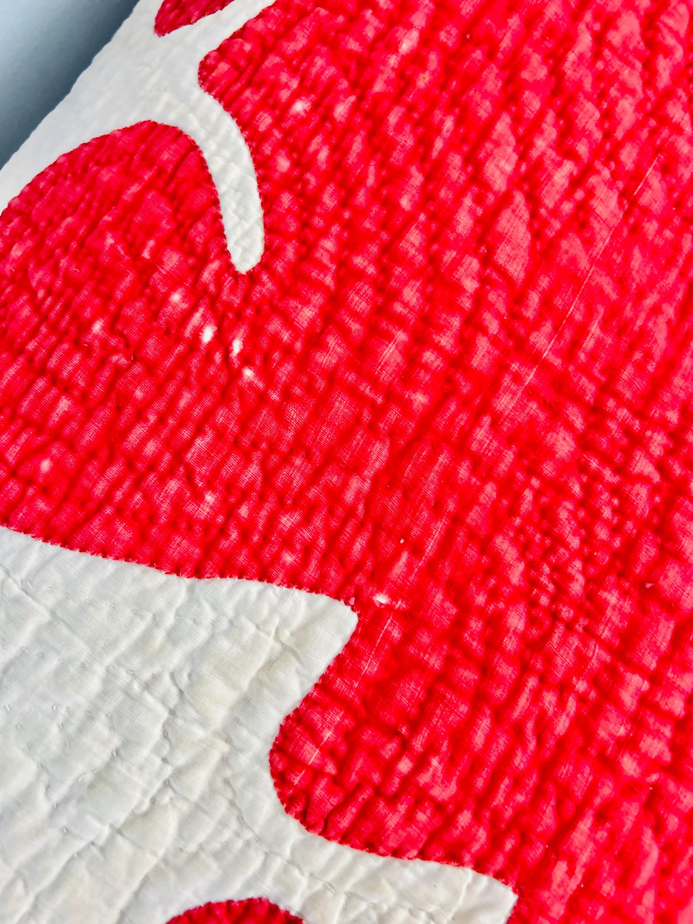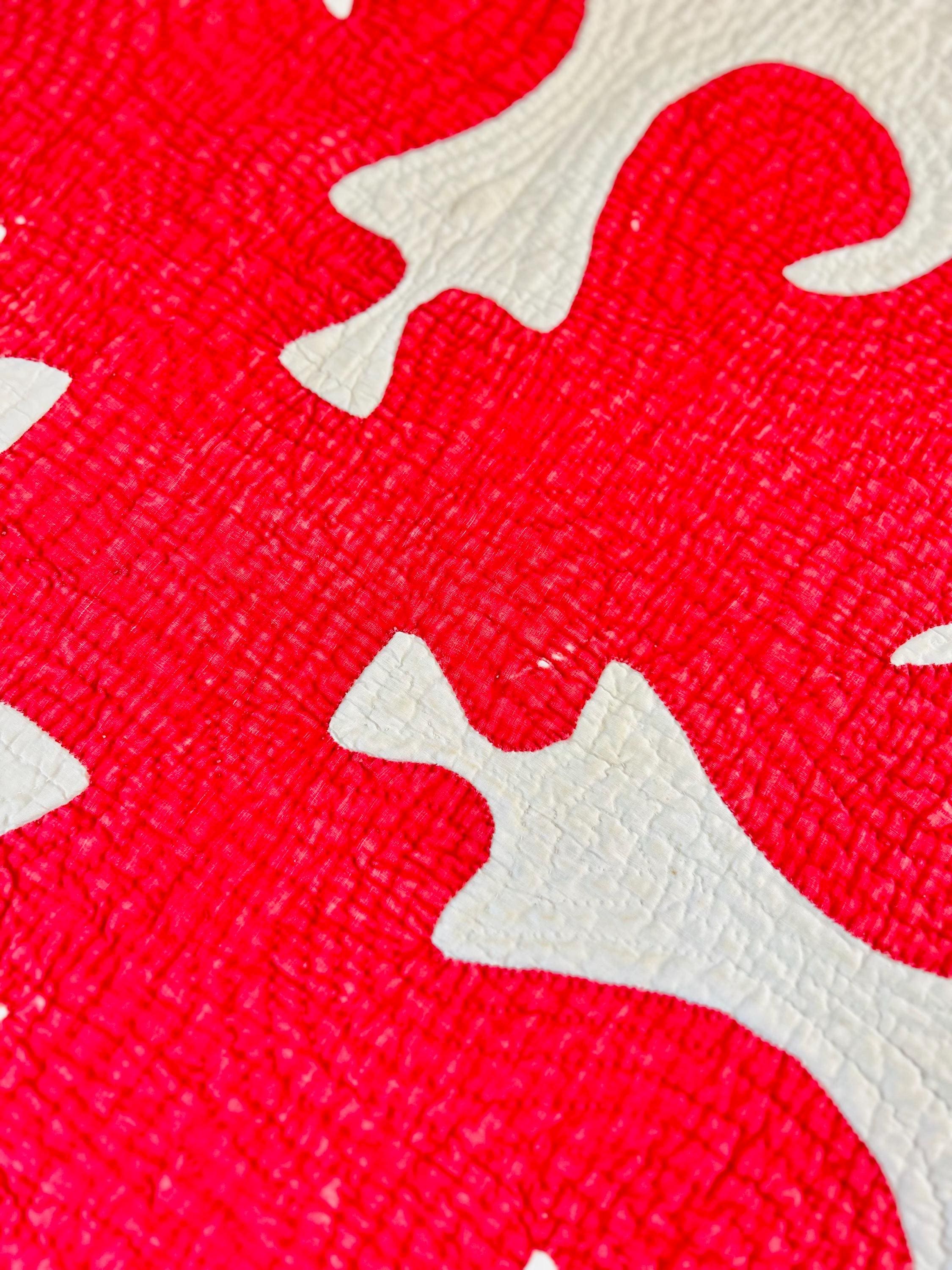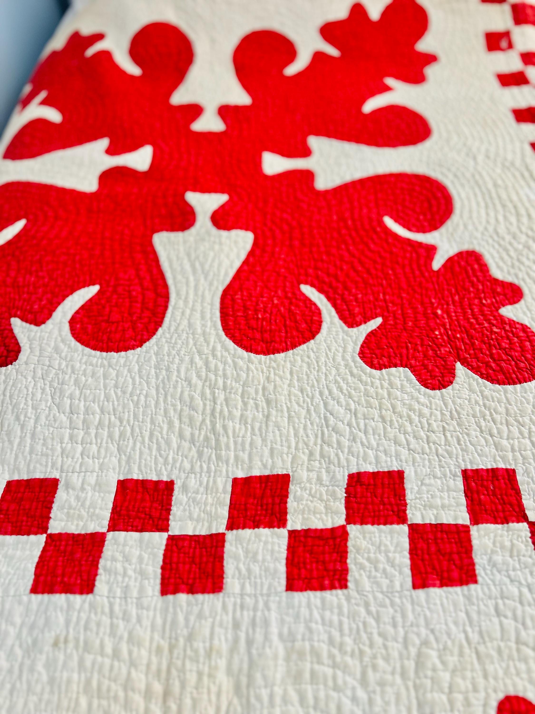 This stunning Scherenschnitte Quilt, 1880s, has a unique red and white patchwork sashing running between the four main blocks and has been so densely quilted in echoes of the applique that in parts it is stipple quilted.