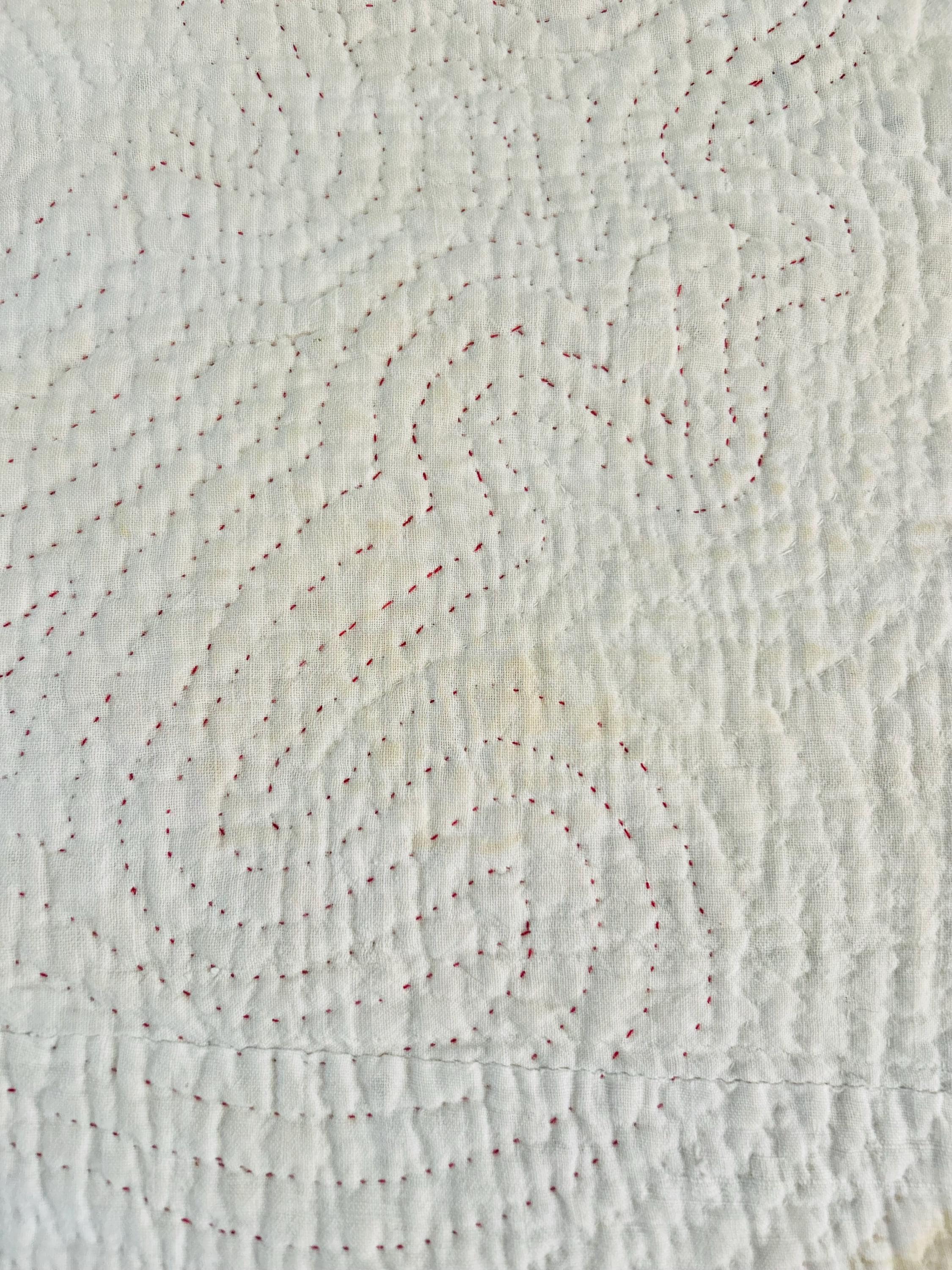 The back is white cotton as is the narrow binding which has been hand-stitched to both sides. The cotton batting is very lightweight.