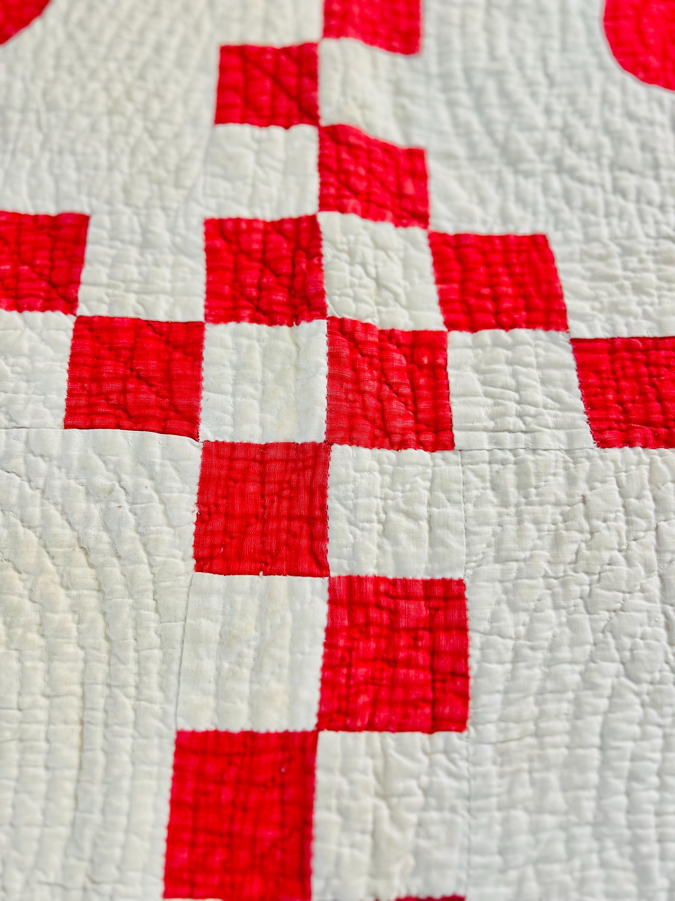 The quilt is in very good antique condition with some minor fabric loss to the red fabrics (see photos) and some age-related toning/tan spots on the front and back. See photos.