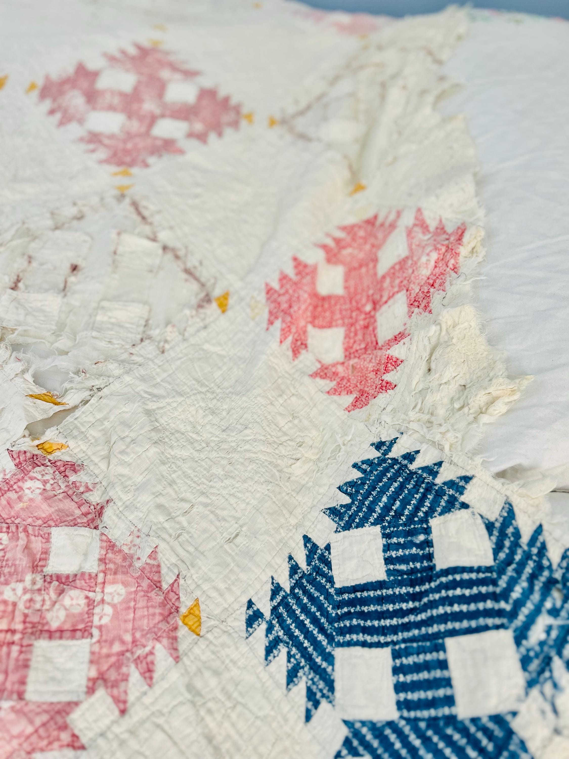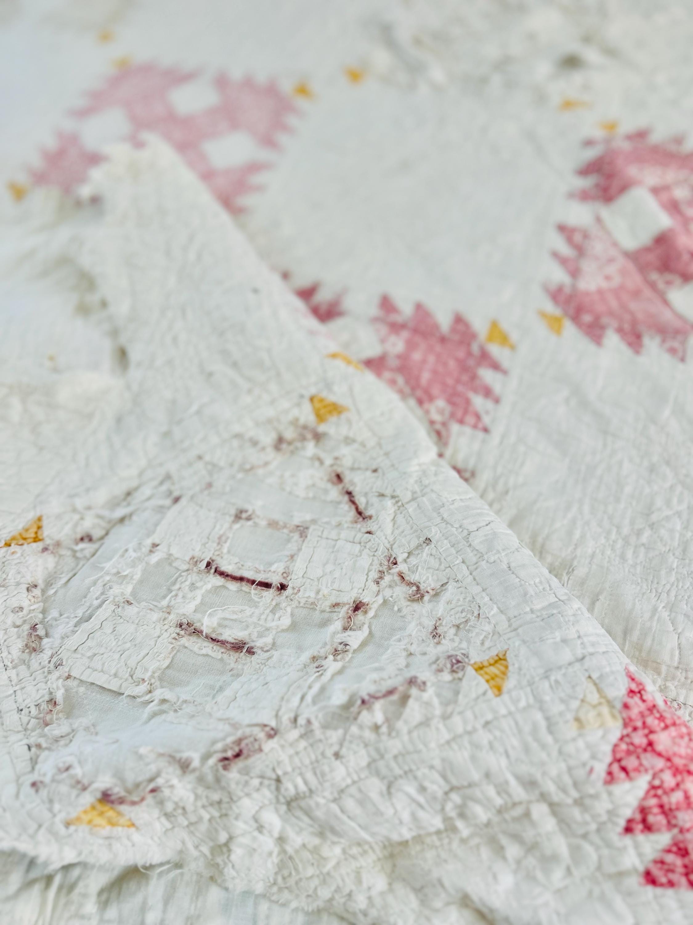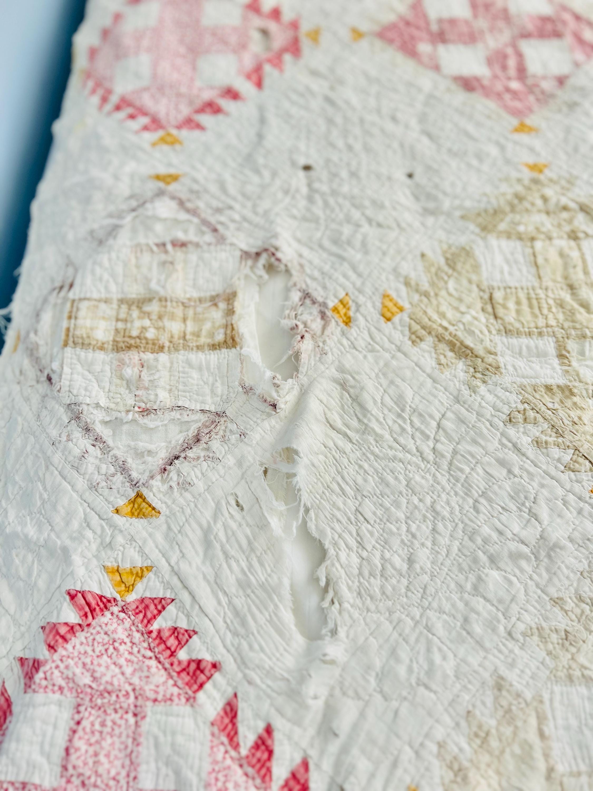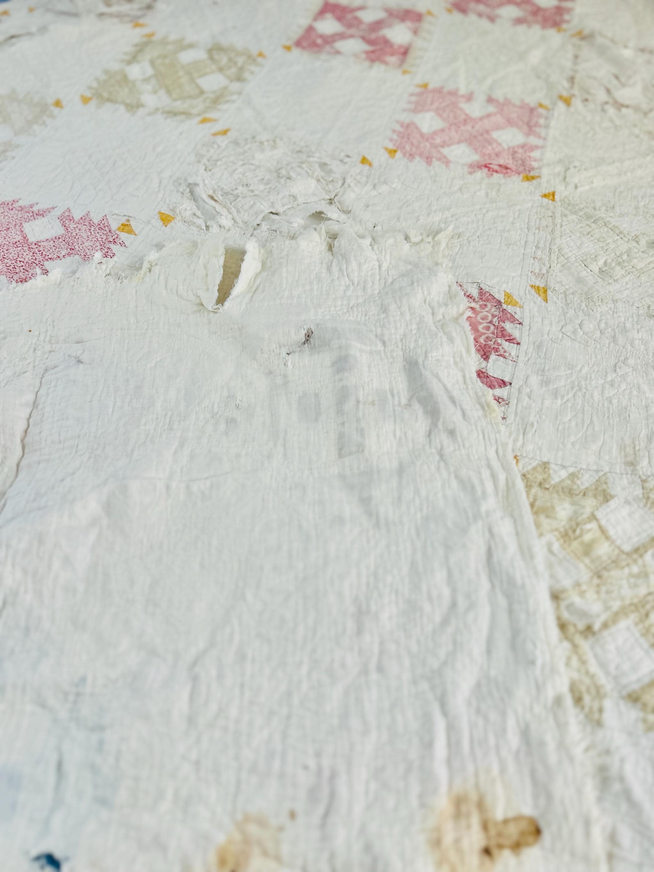 The quilt is unfortunately in poor or cutter/crafting condition as can be seen in the photos which show fabric deterioration, tears, holes and extensive fraying of the binding.