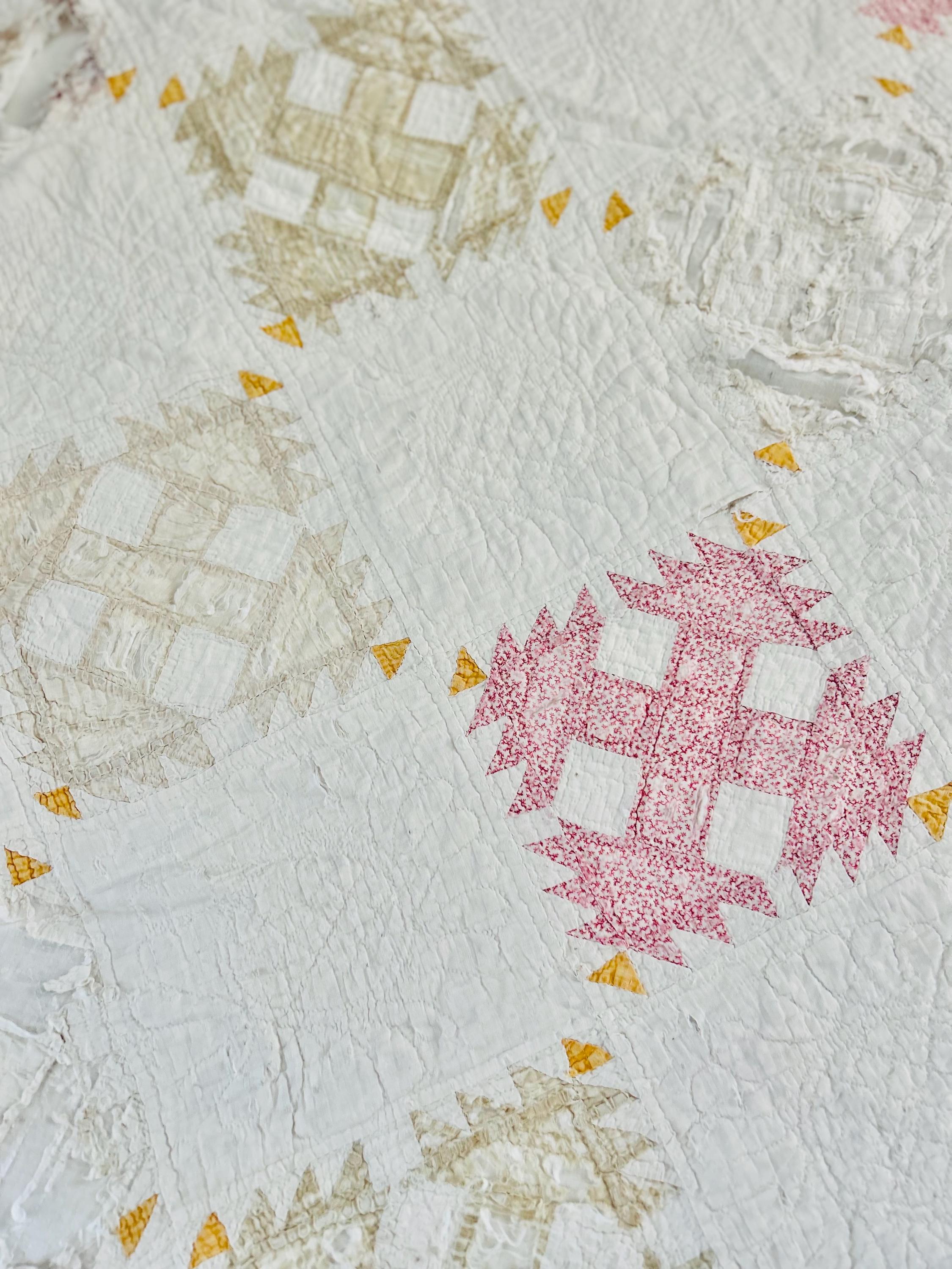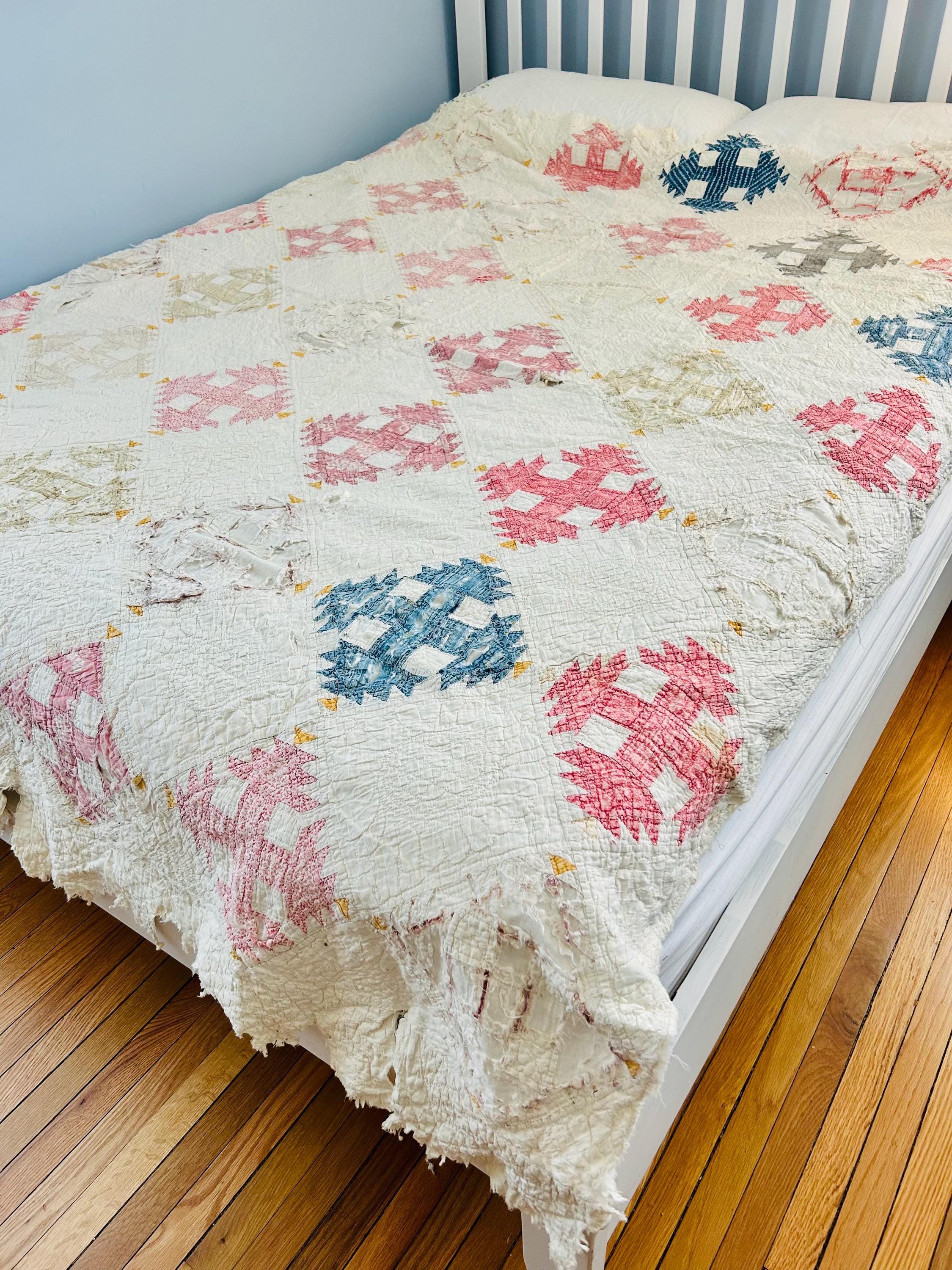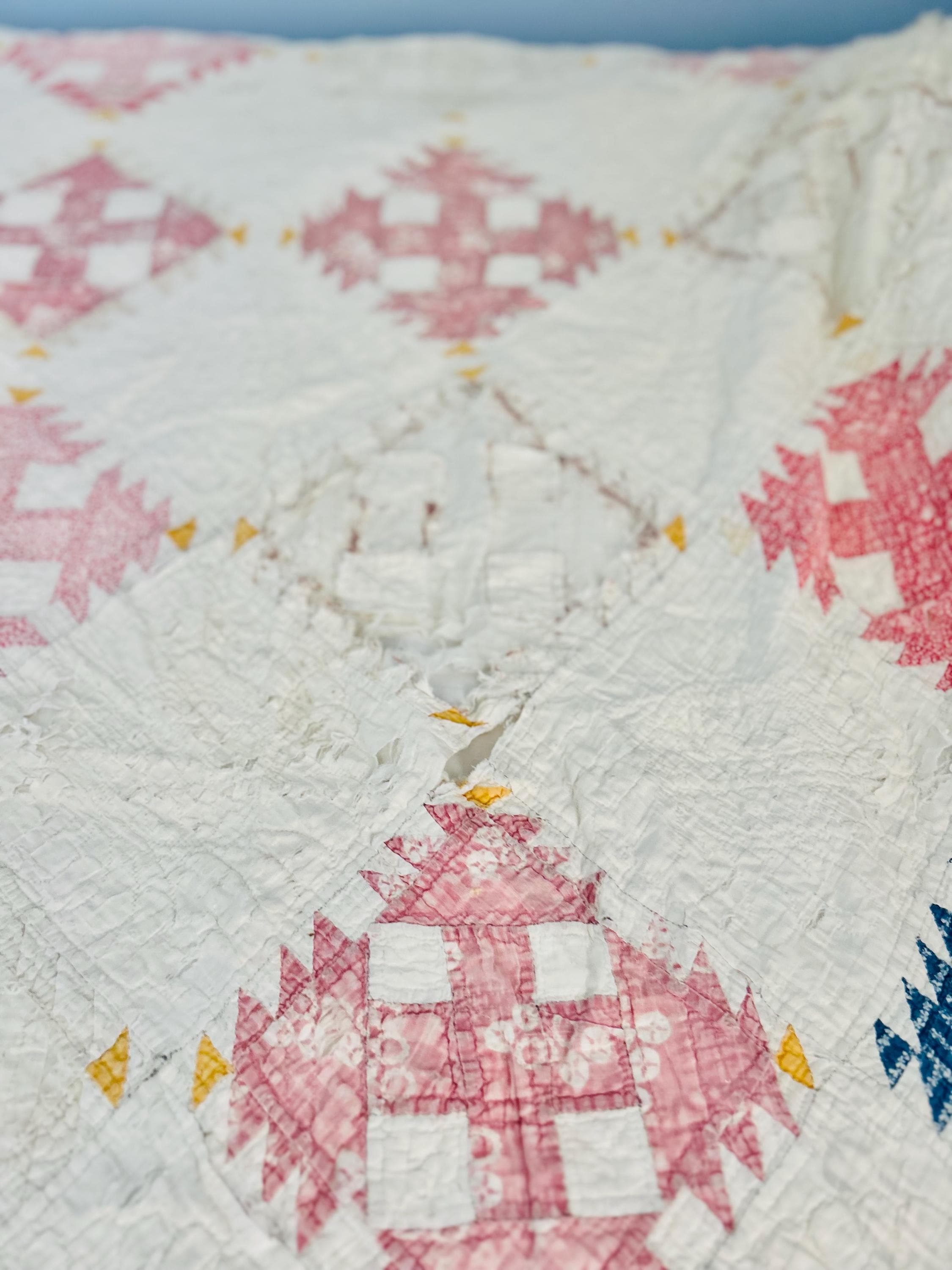 The quilt is unfortunately in poor or cutter/crafting condition as can be seen in the photos which show fabric deterioration, tears, holes and extensive fraying of the binding.
