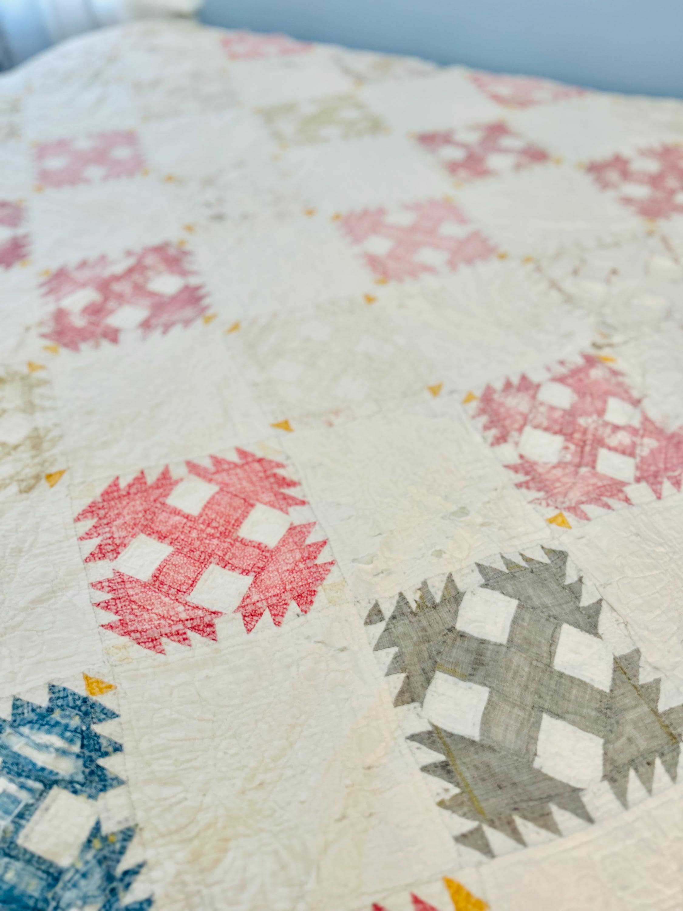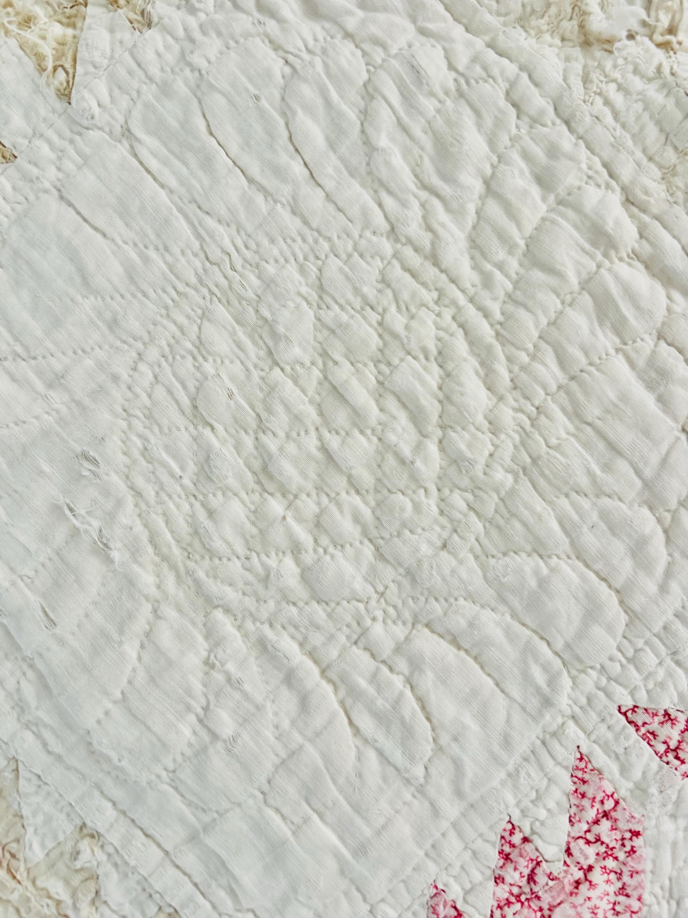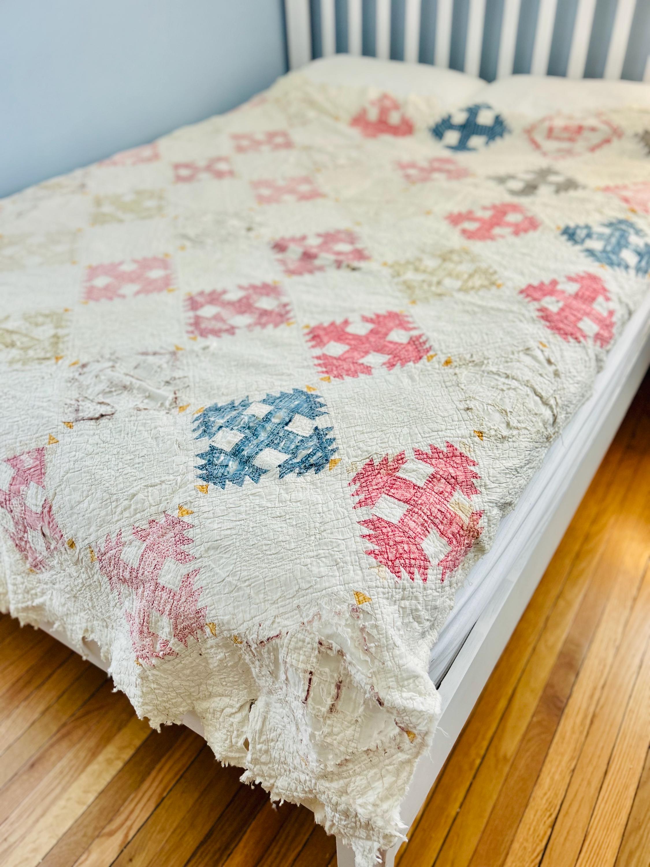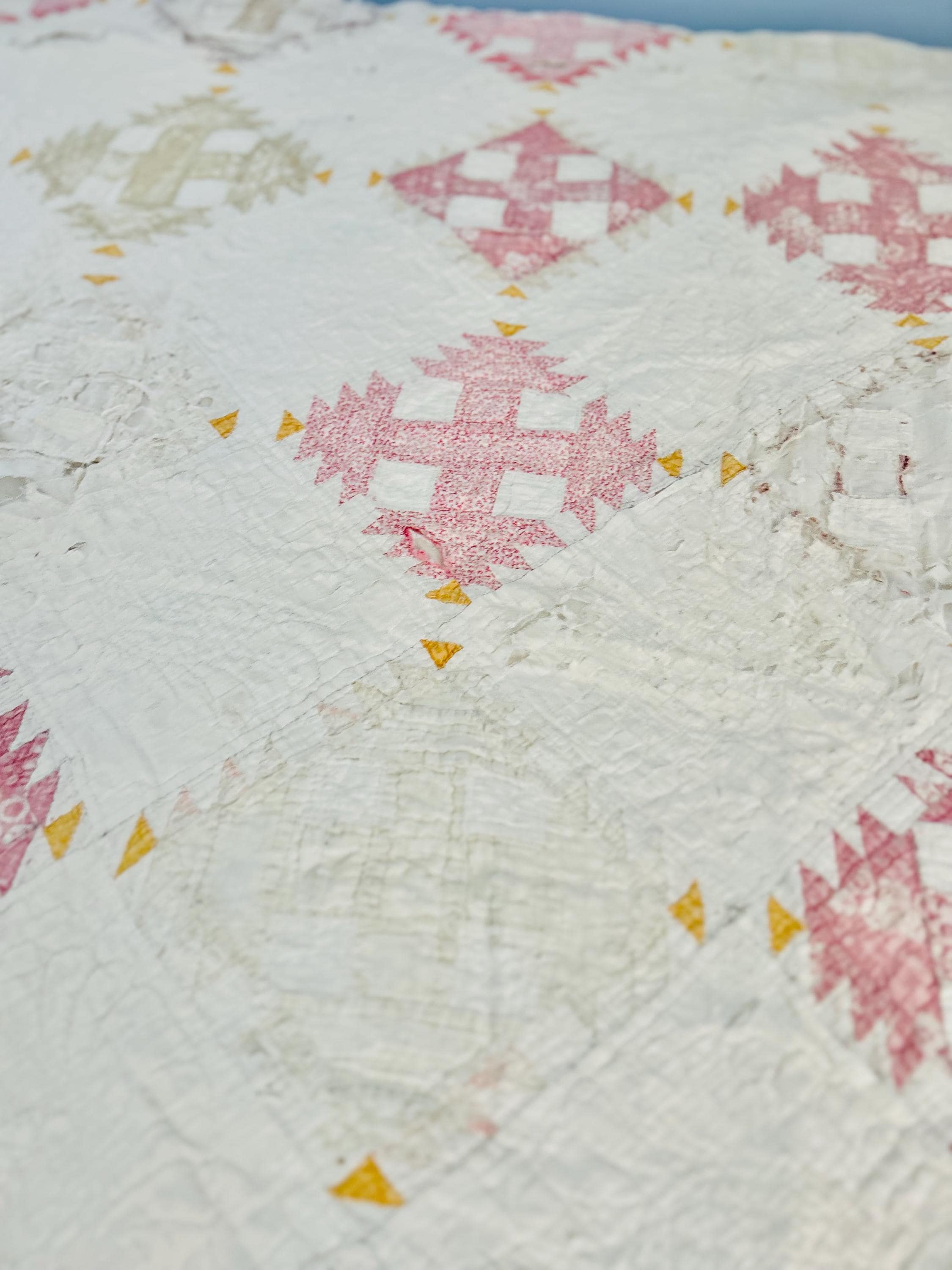 The quilt is unfortunately in poor or cutter/crafting condition as can be seen in the photos which show fabric deterioration, tears, holes and extensive fraying of the binding.