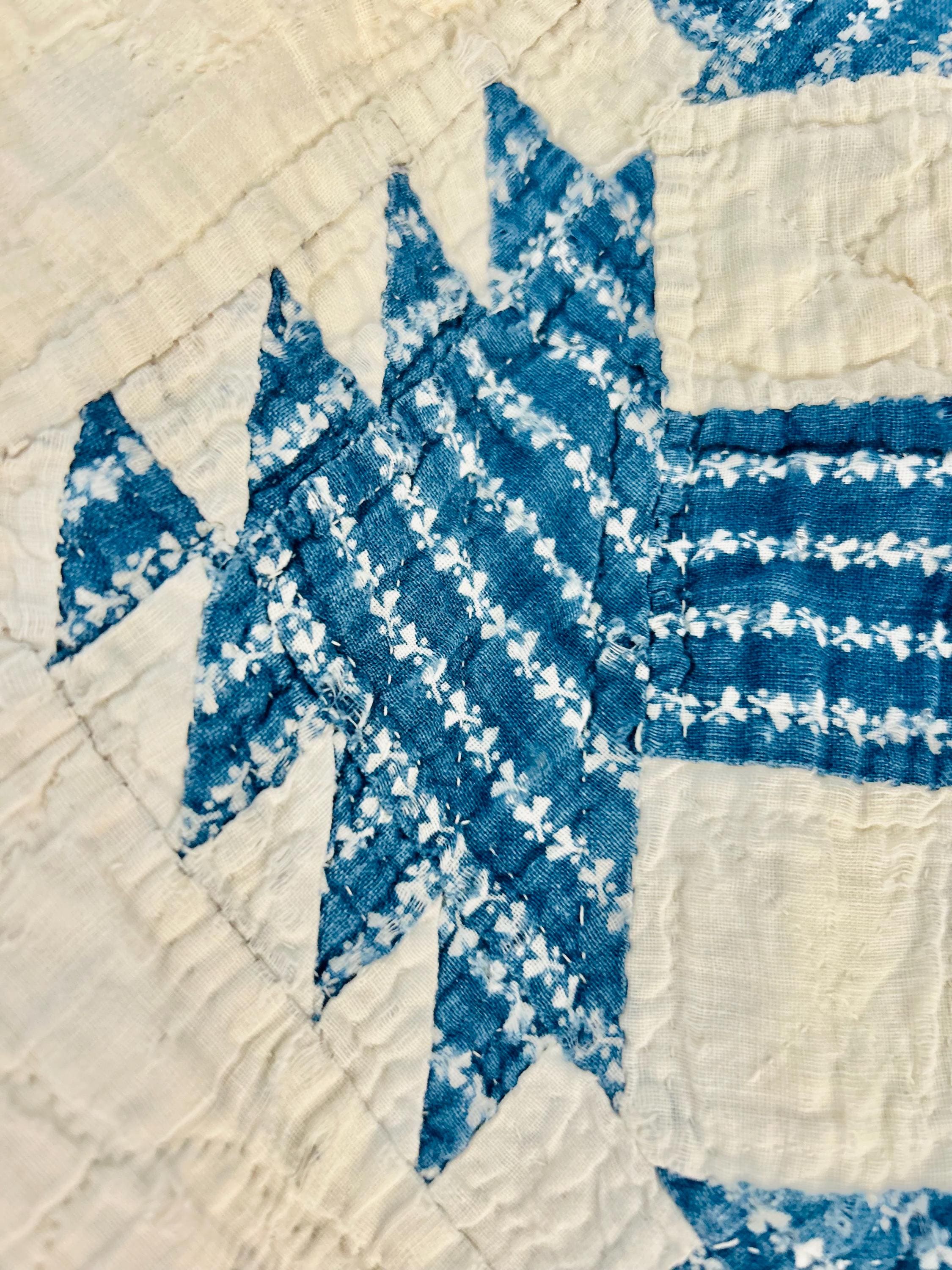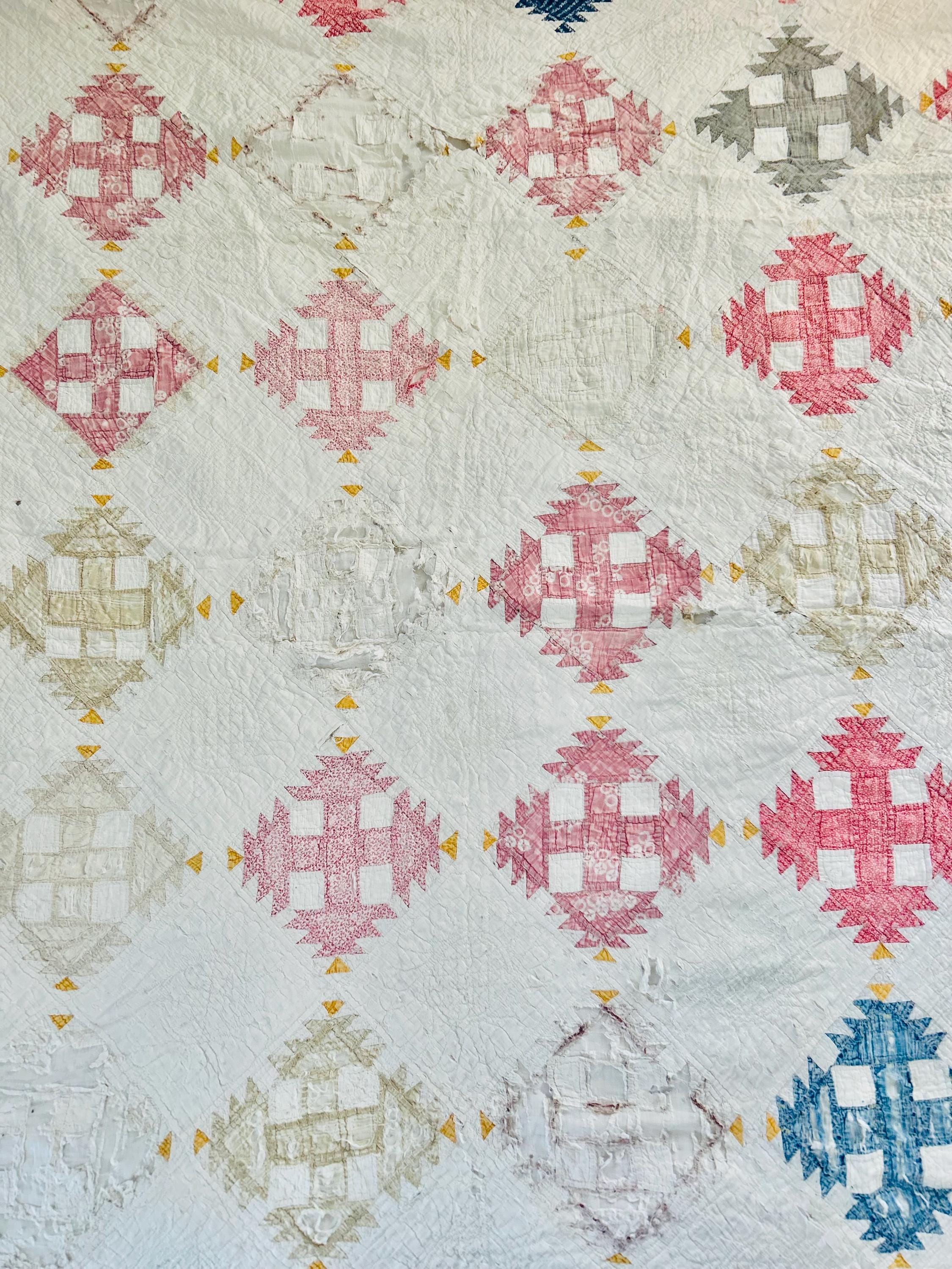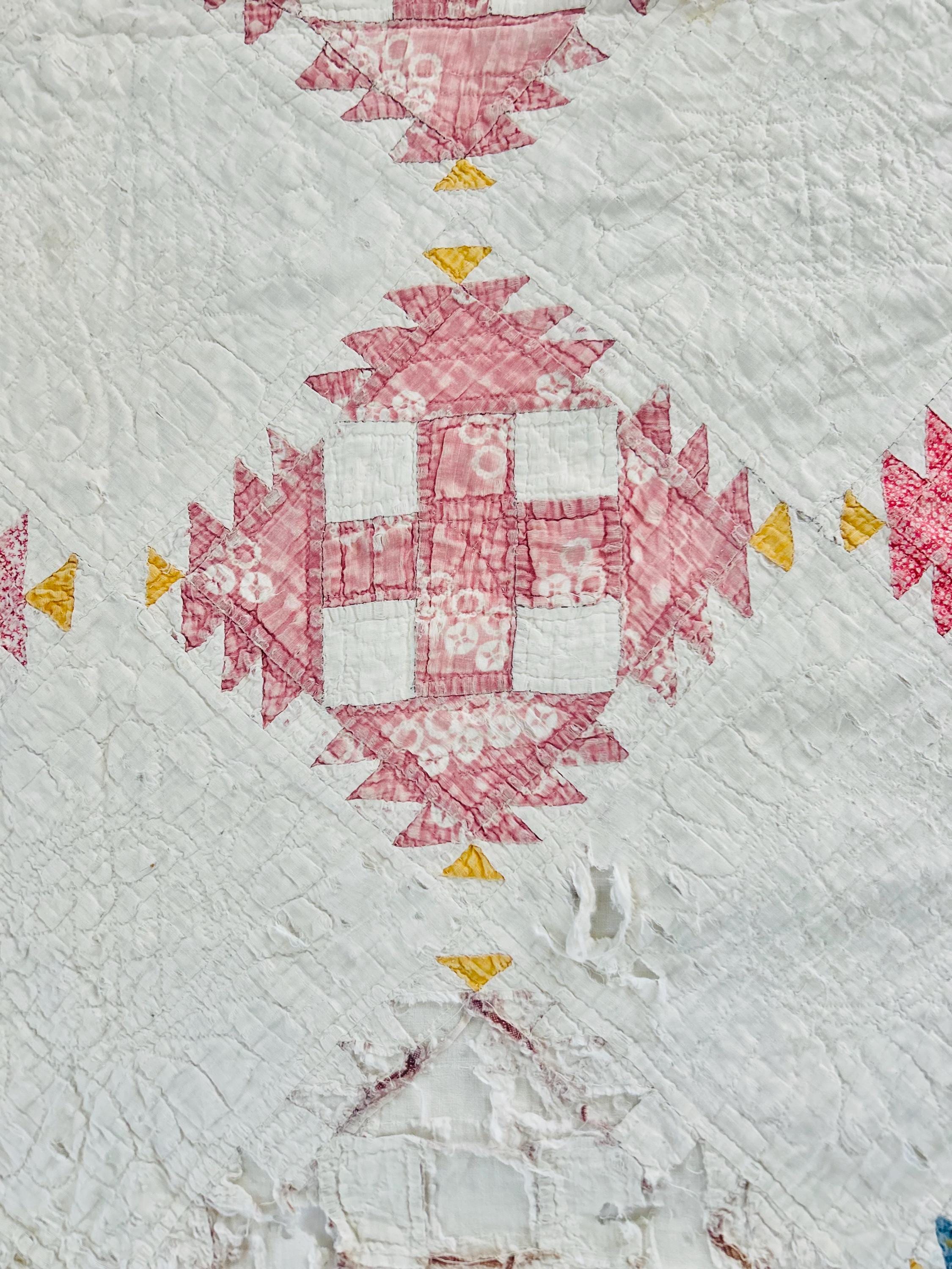 This Pine Burr Variation Quilt, circa 1880s, is a variation on a class 1800s pattern and features sawtooth points in beautiful period fabrics, including double pink calicoes, indigo blues, cadet grays, shirtings and soft tan prints, all set on point with white alternating blocks with feather quilting. Besides feather wreaths, the quilting is in outlines of the patchwork and crosshatches.