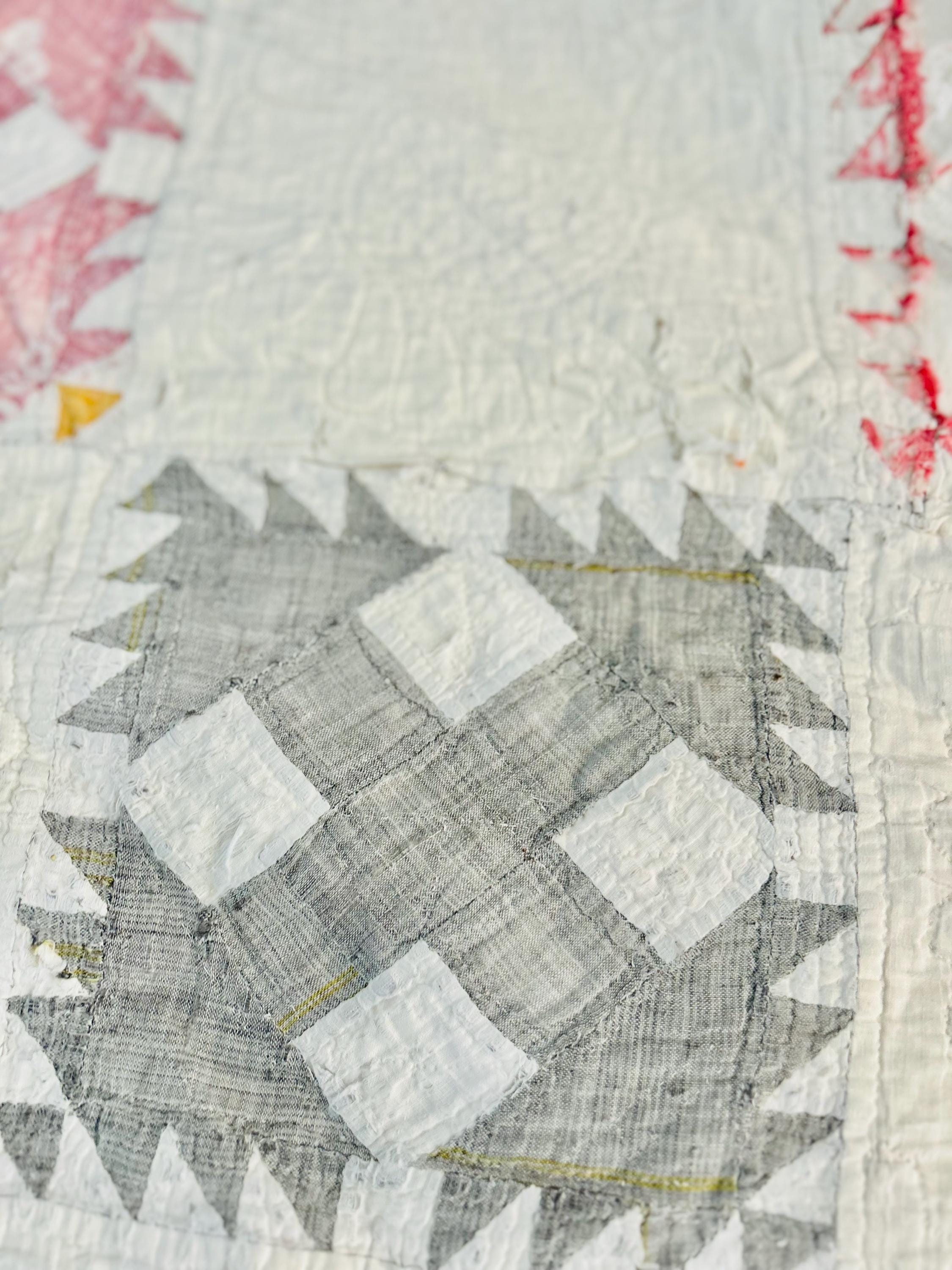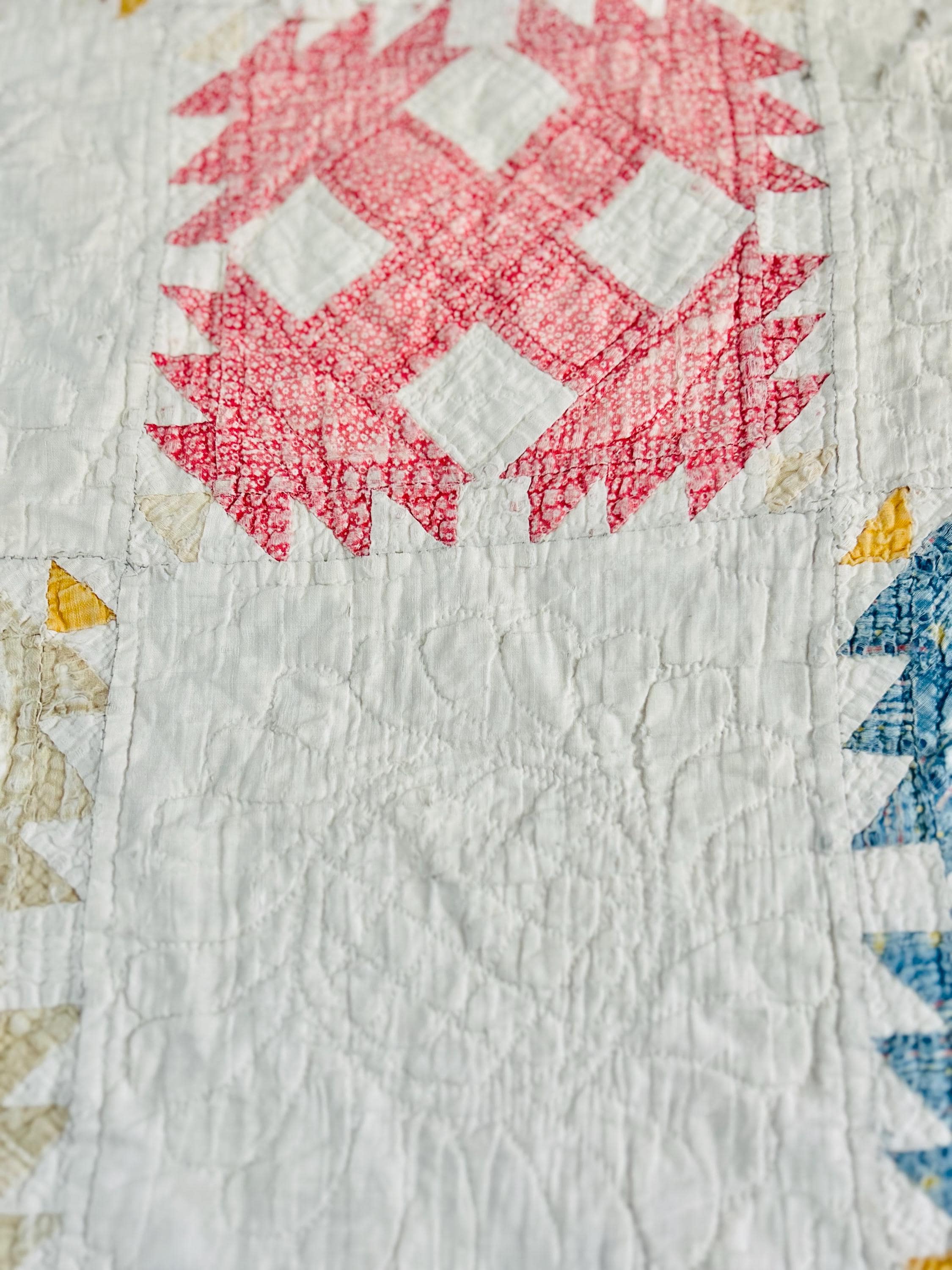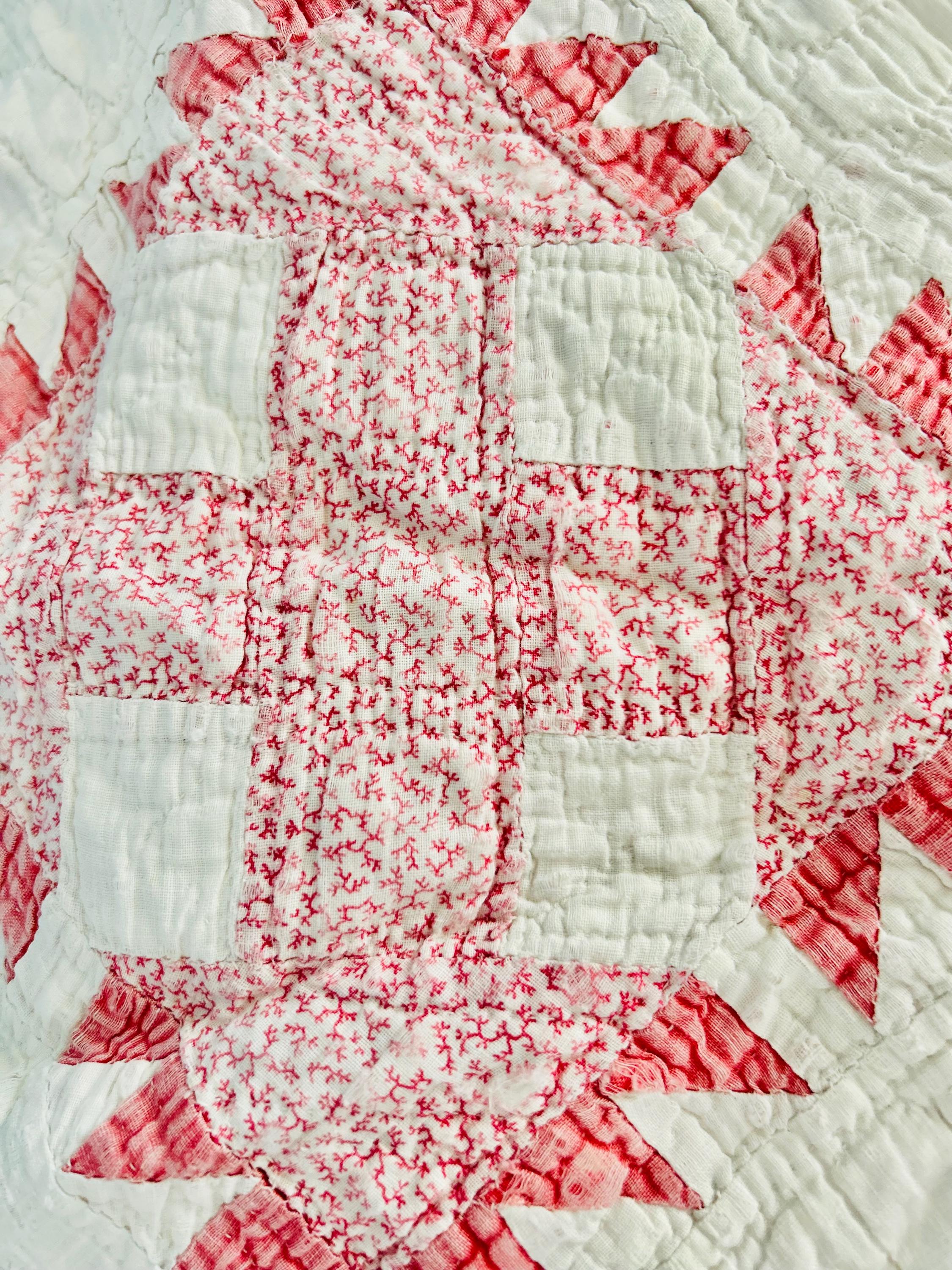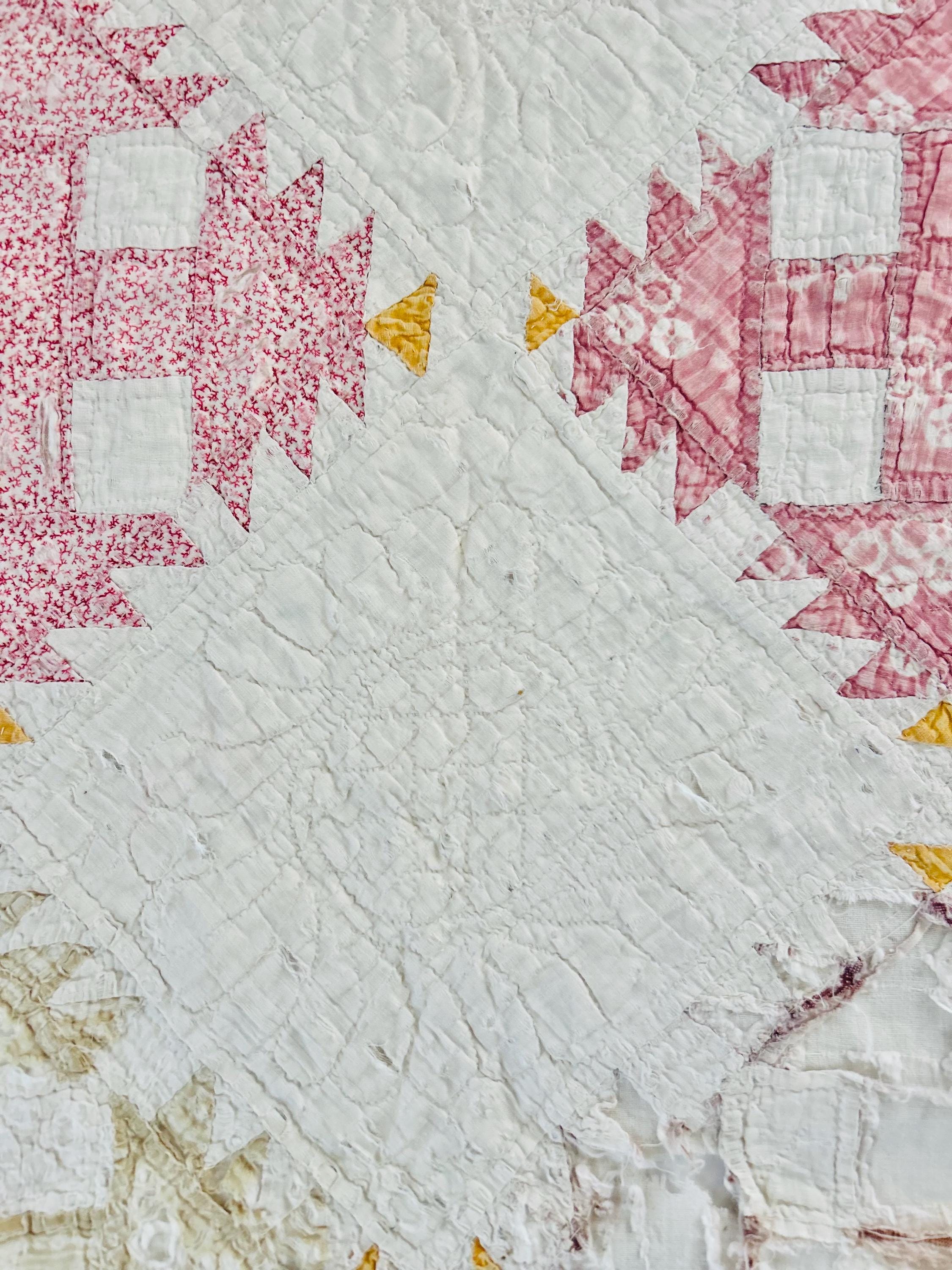 This Pine Burr Variation Quilt, circa 1880s, is a variation on a class 1800s pattern and features sawtooth points in beautiful period fabrics, including double pink calicoes, indigo blues, cadet grays, shirtings and soft tan prints, all set on point with white alternating blocks with feather quilting. Besides feather wreaths, the quilting is in outlines of the patchwork and crosshatches.