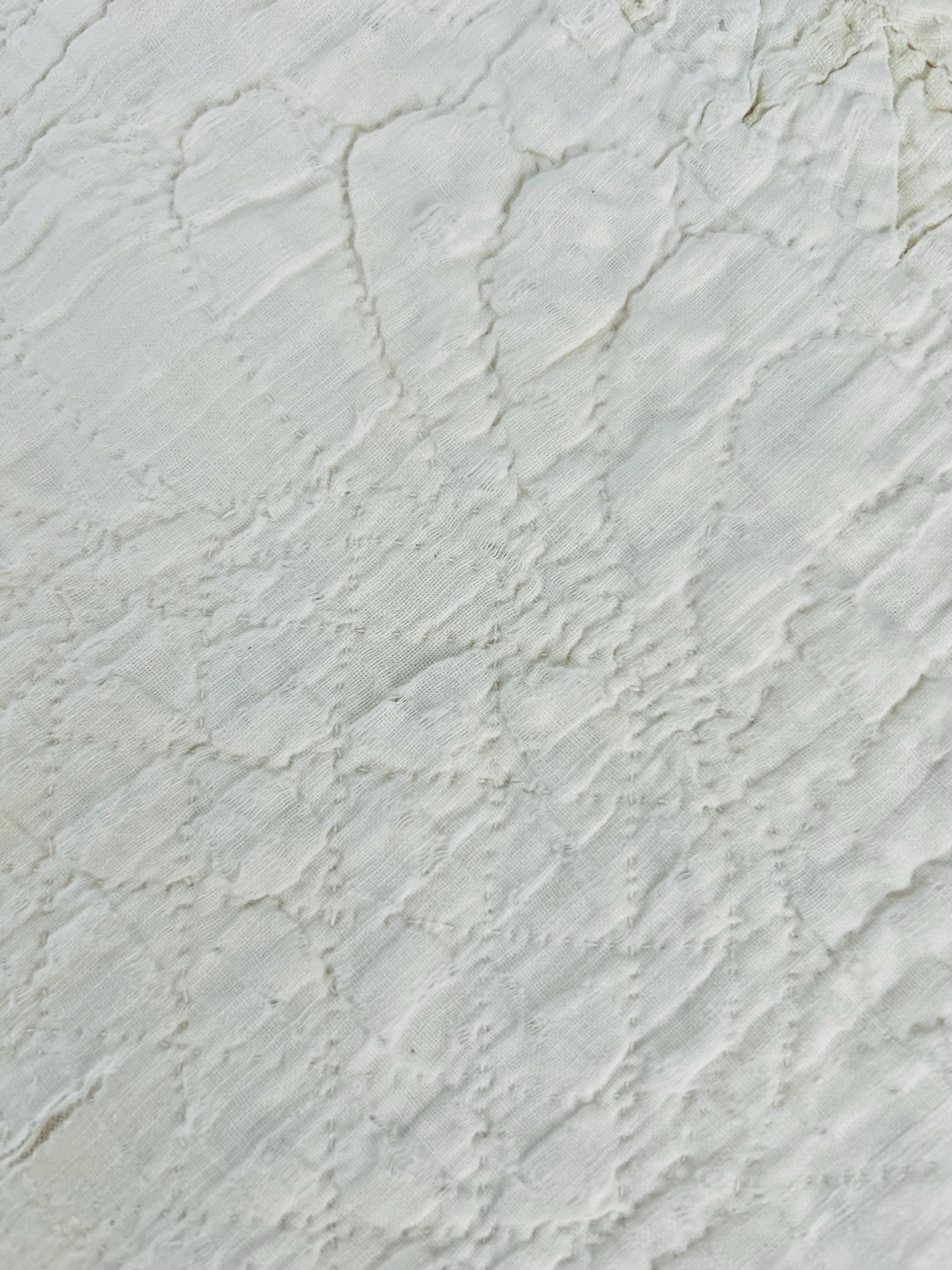 The back is white cotton that has been turned to the front and hand-stitched to form the binding. The cotton batting is very lightweight.