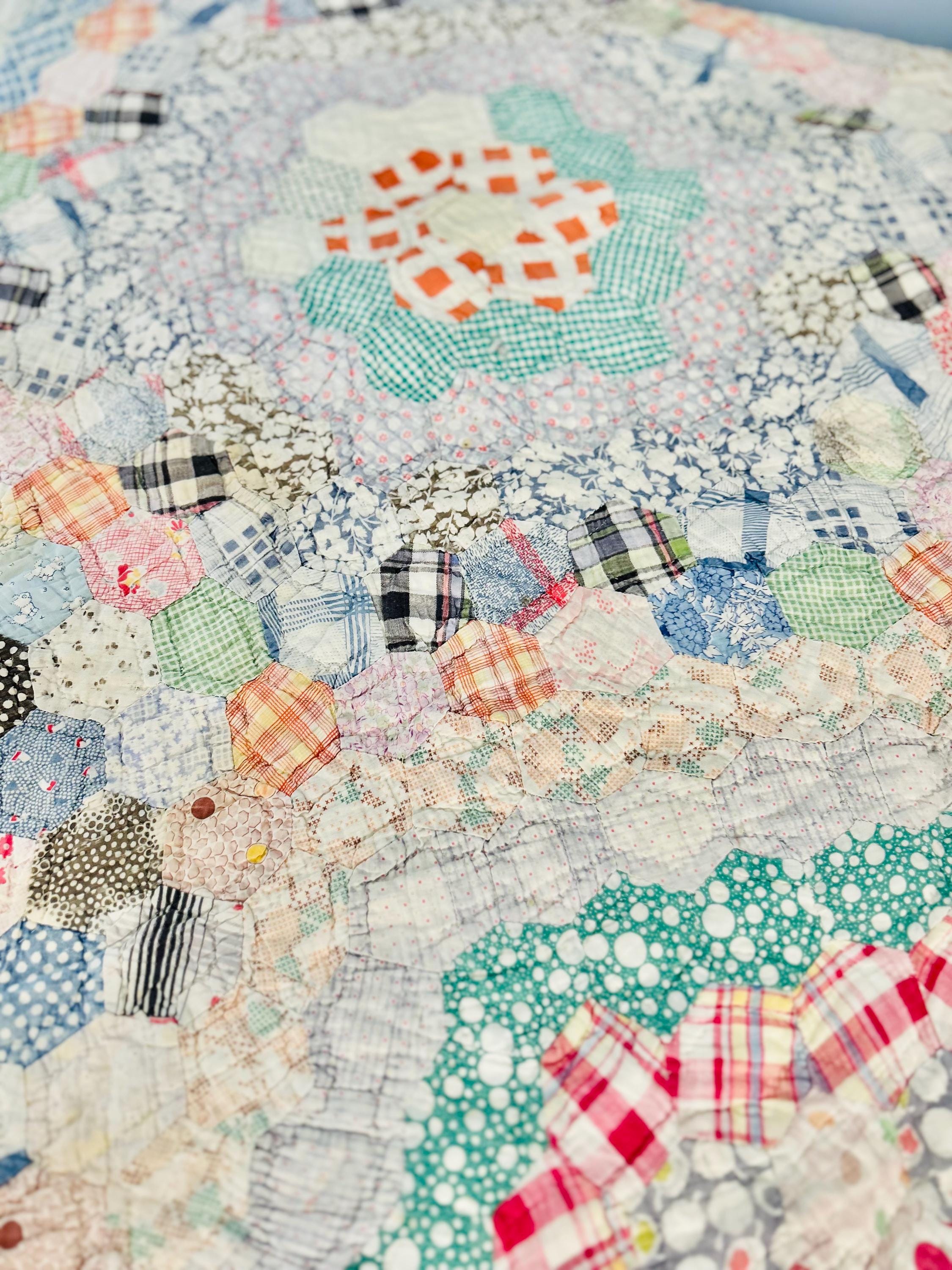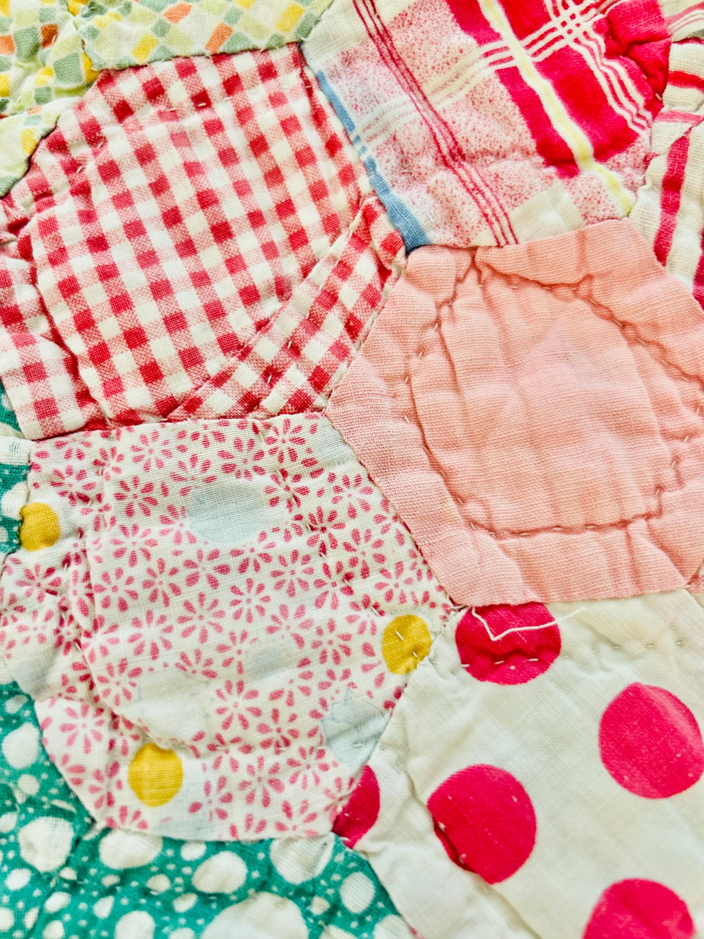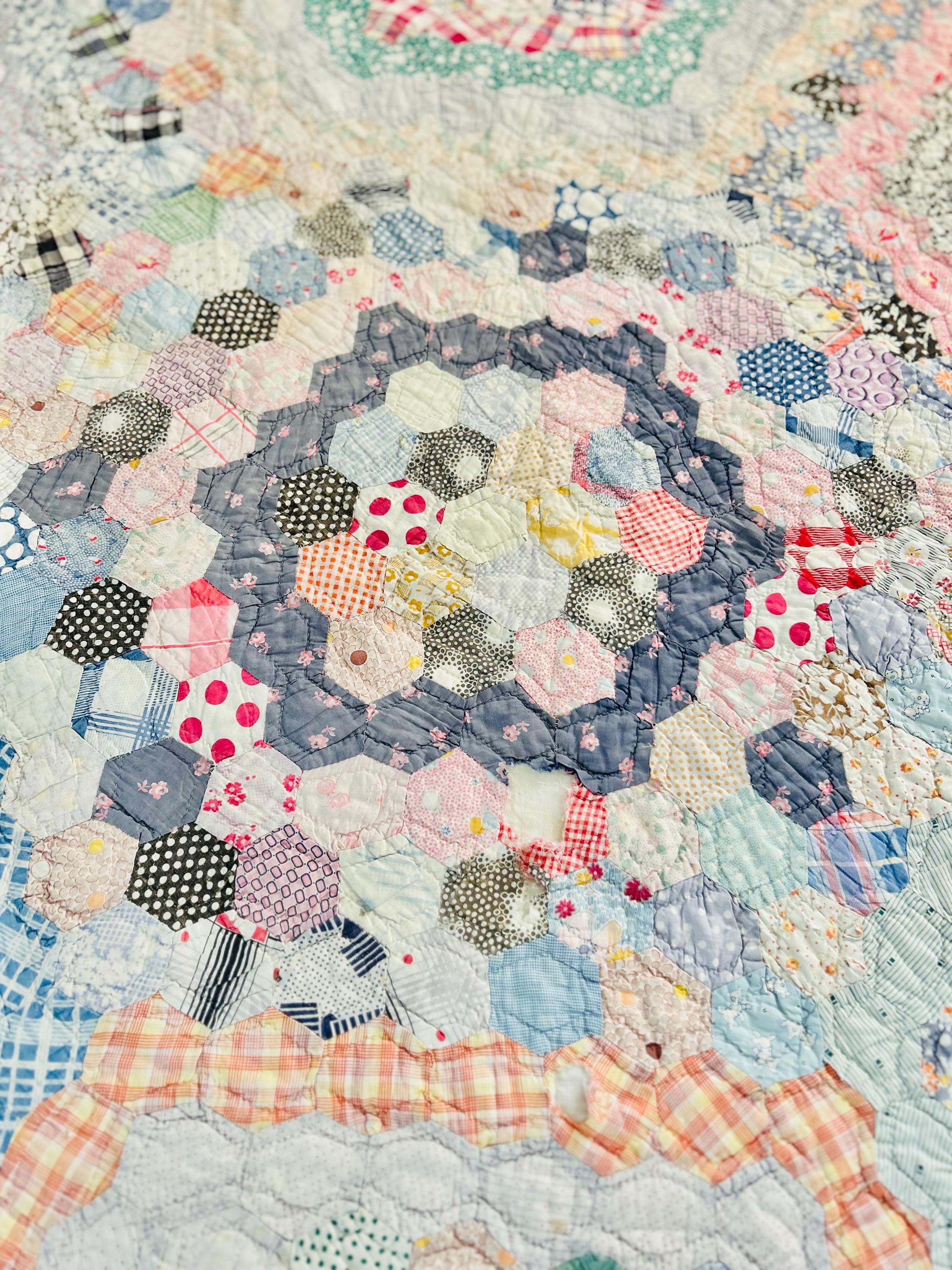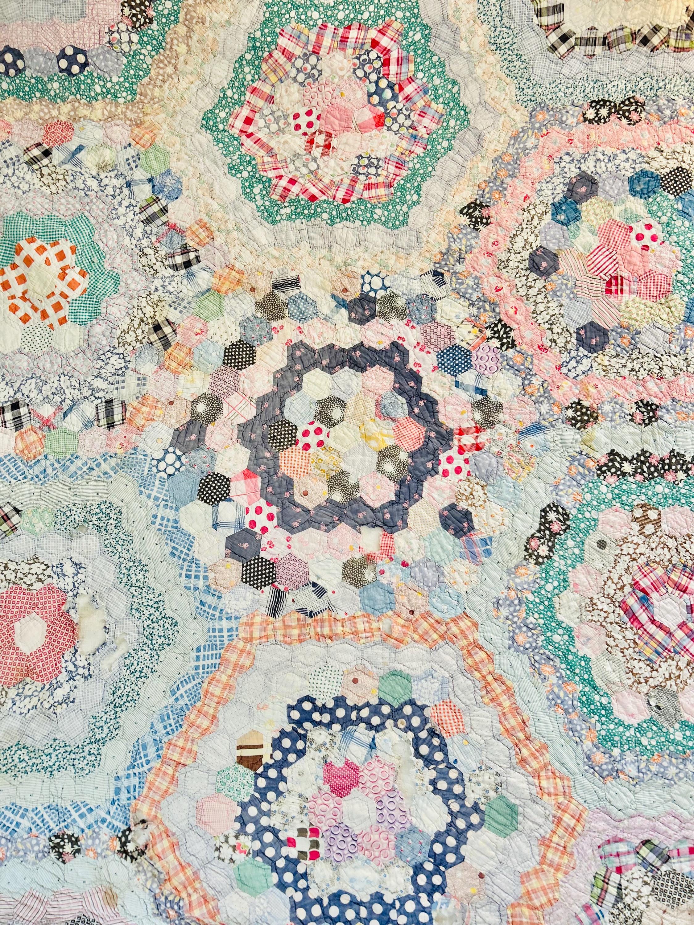 This beautiful hand-pieced 1930s Garden Walk Quilt is a much rarer variation of the Grandmother's Flower Garden pattern and is made of thousands of hexagons. It is made of feedsack and dress prints -- polka dots, plaids, florals and pastels giving it an unmistakable Depression-era look. It is hand-quilted in closely-spaced double contour lines throughout.