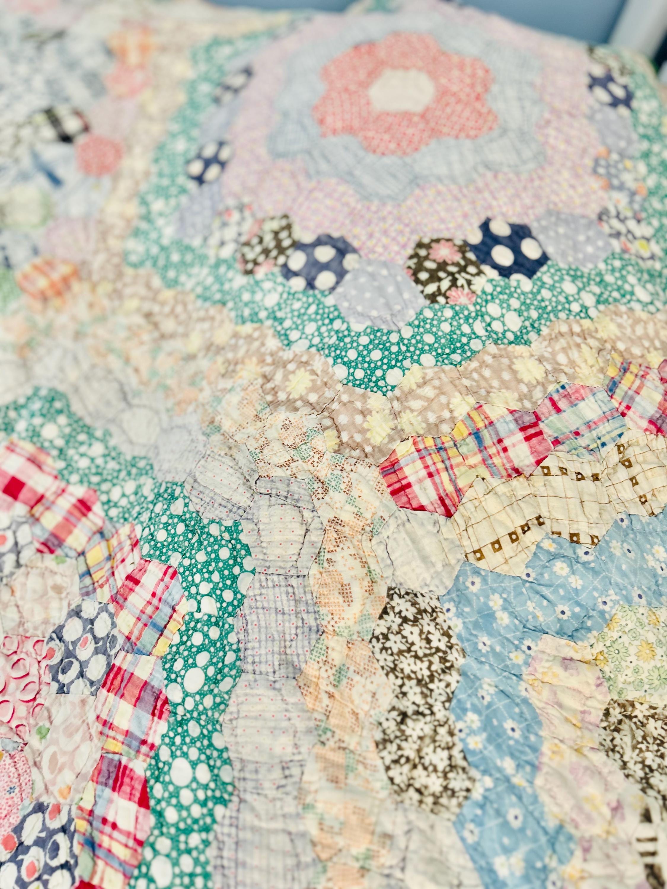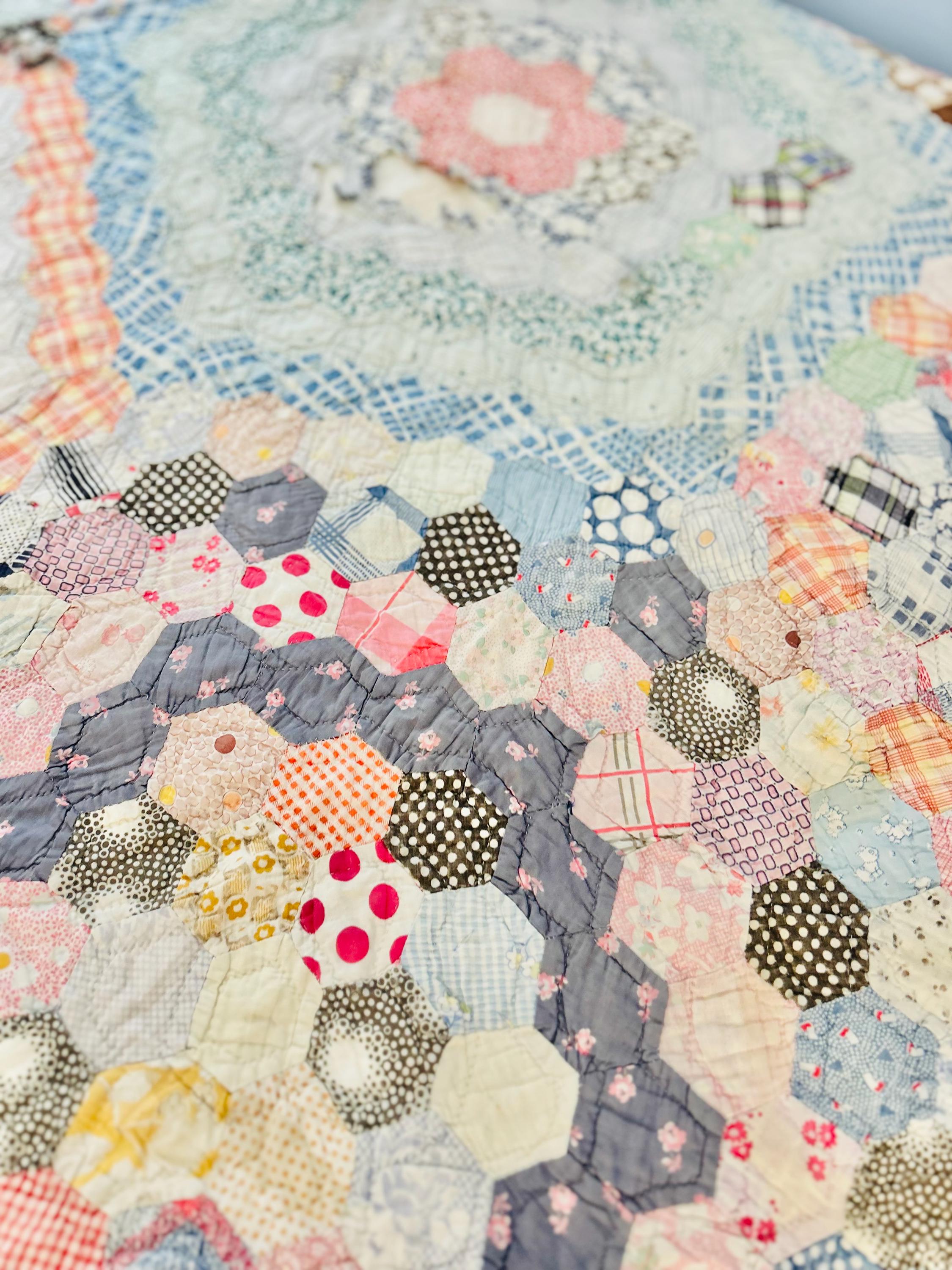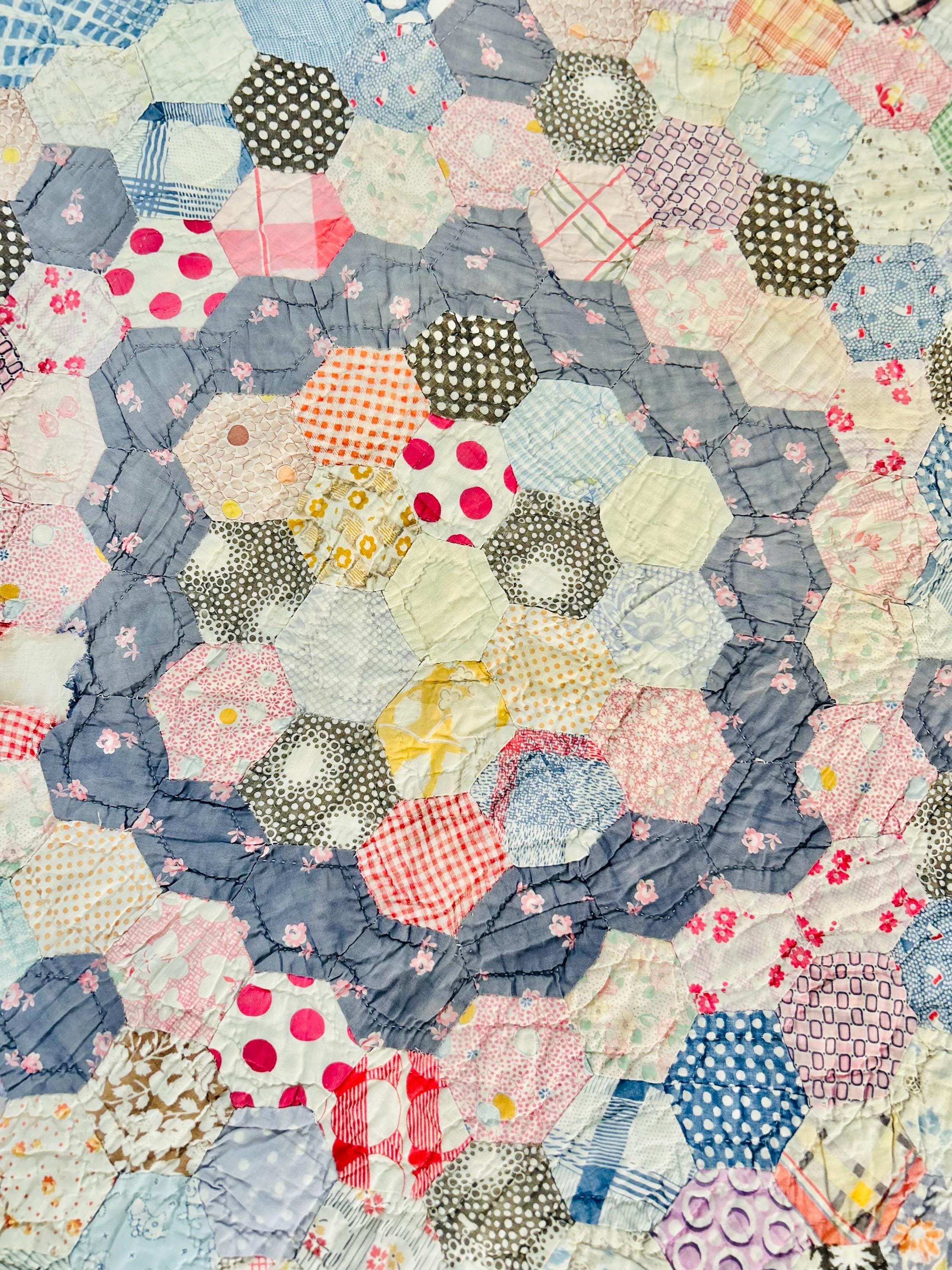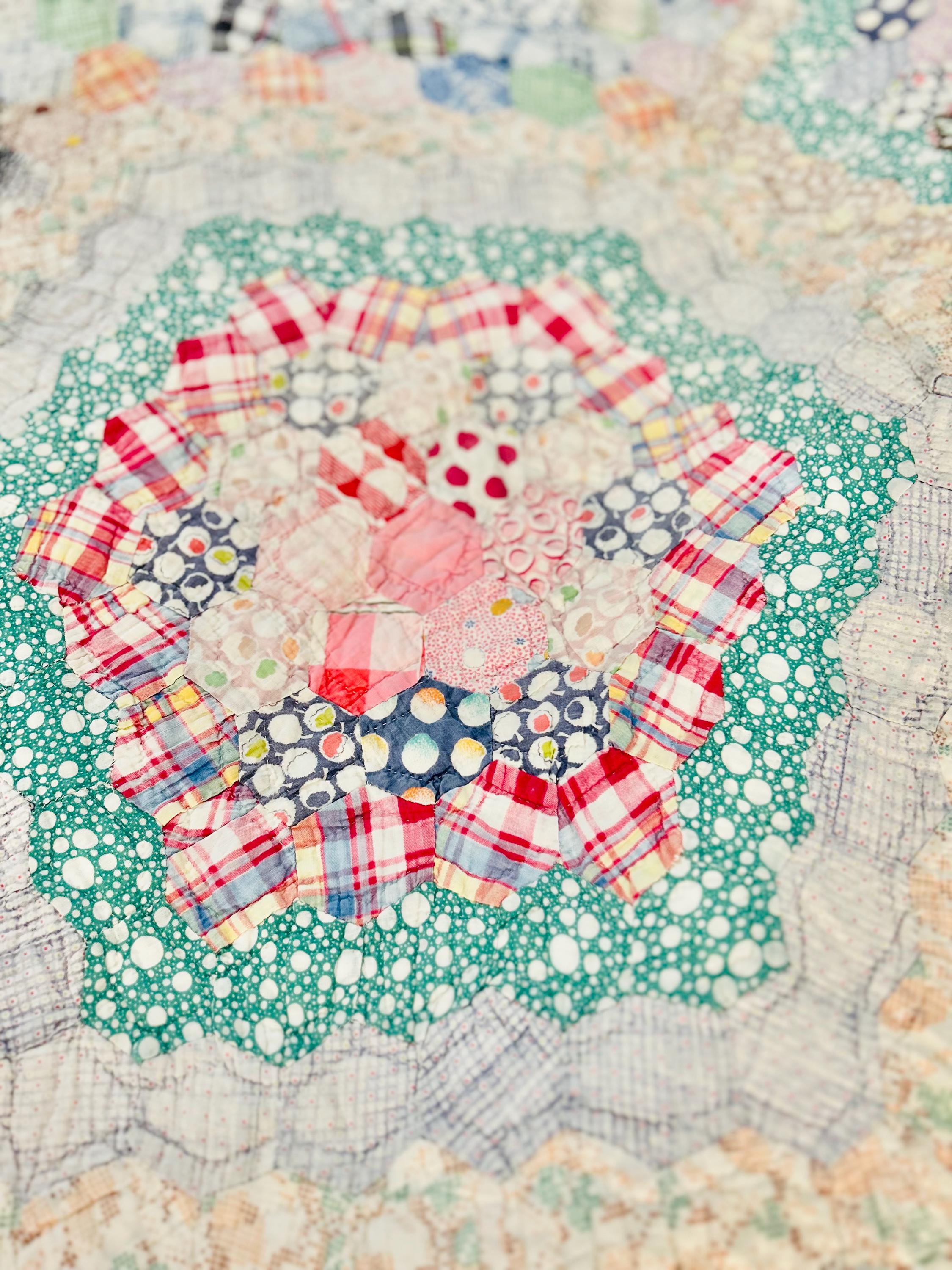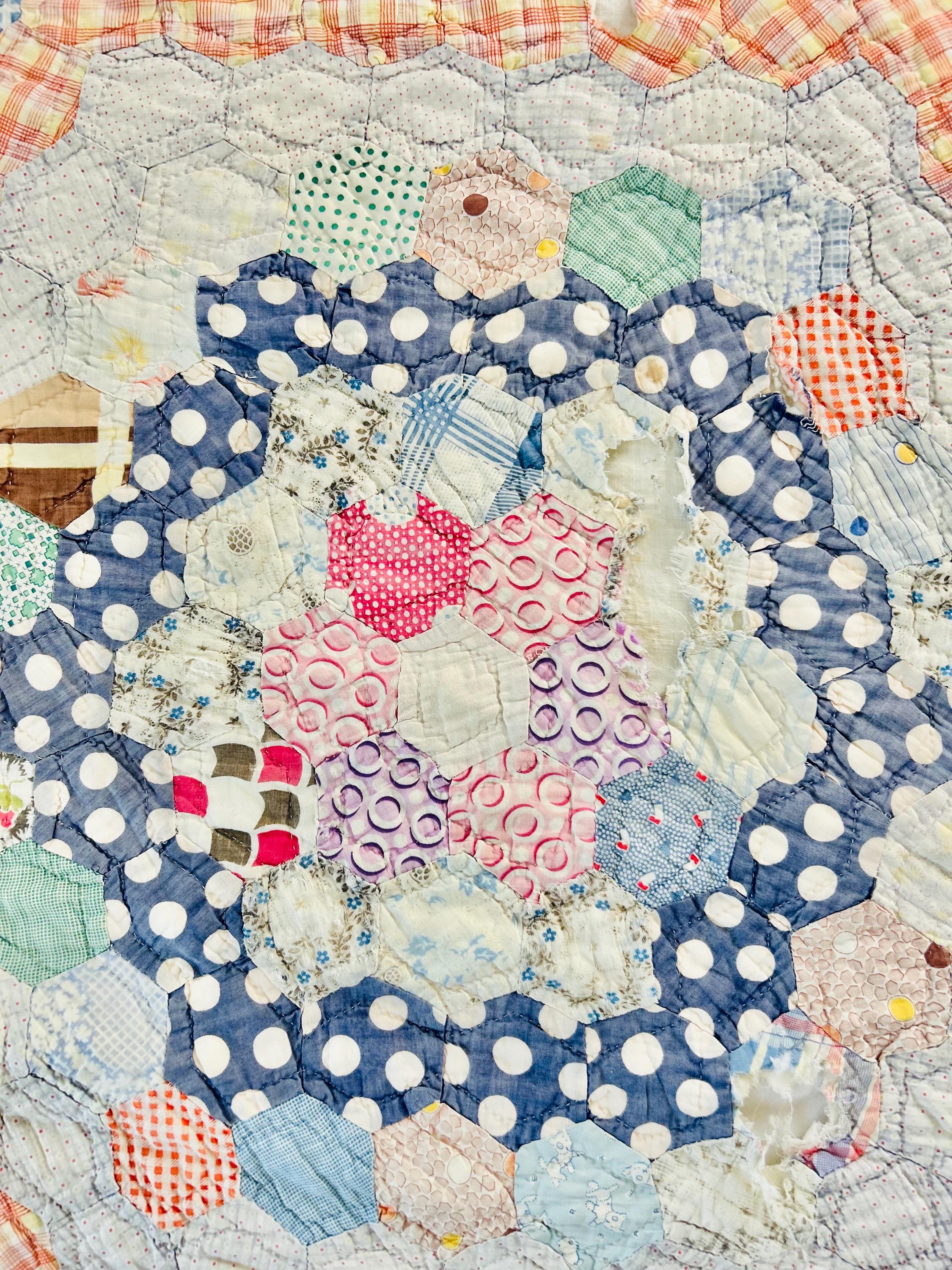 This beautiful hand-pieced 1930s Garden Walk Quilt is a much rarer variation of the Grandmother's Flower Garden pattern and is made of thousands of hexagons. It is made of feedsack and dress prints -- polka dots, plaids, florals and pastels giving it an unmistakable Depression-era look. It is hand-quilted in closely-spaced double contour lines throughout.