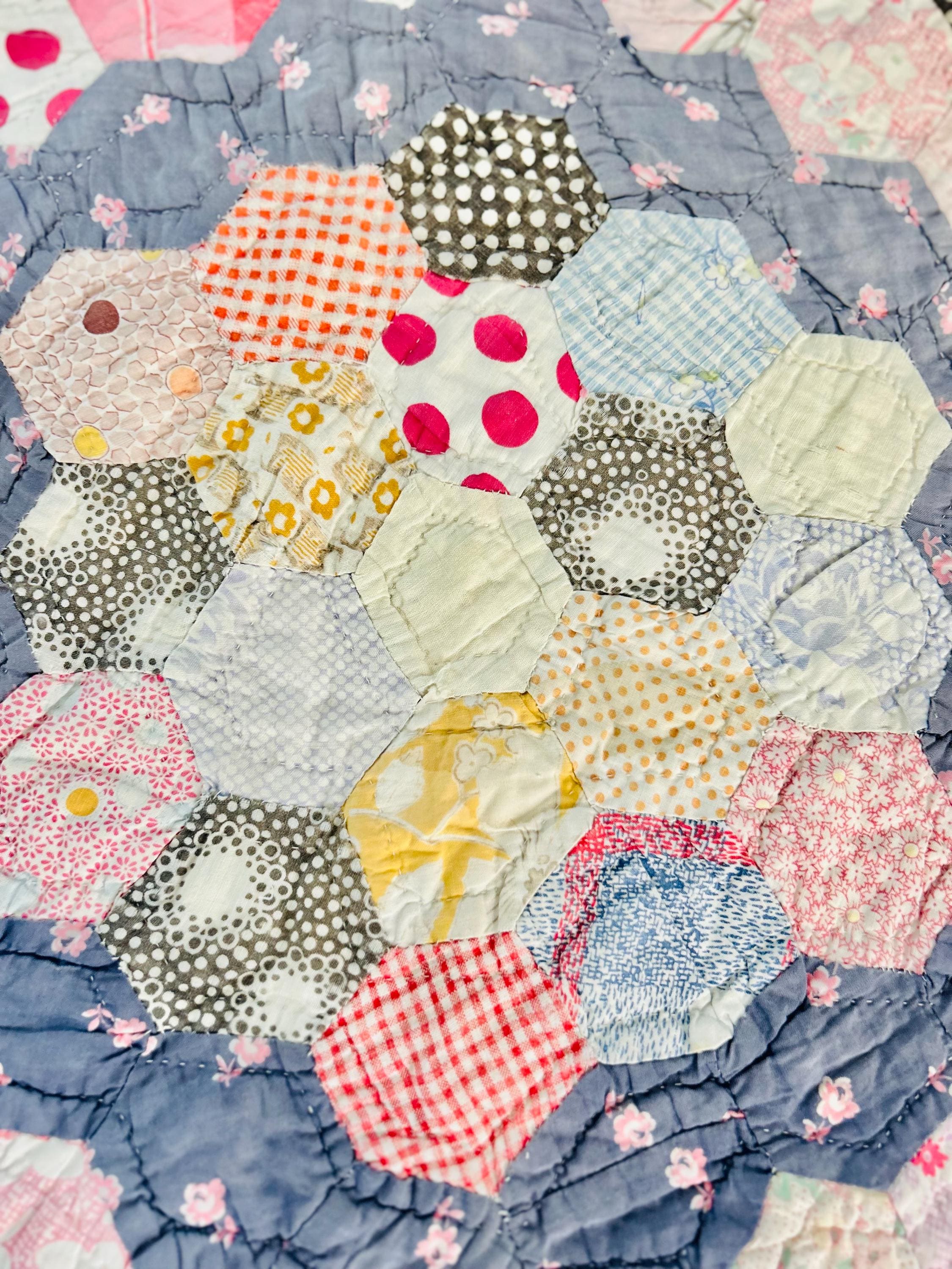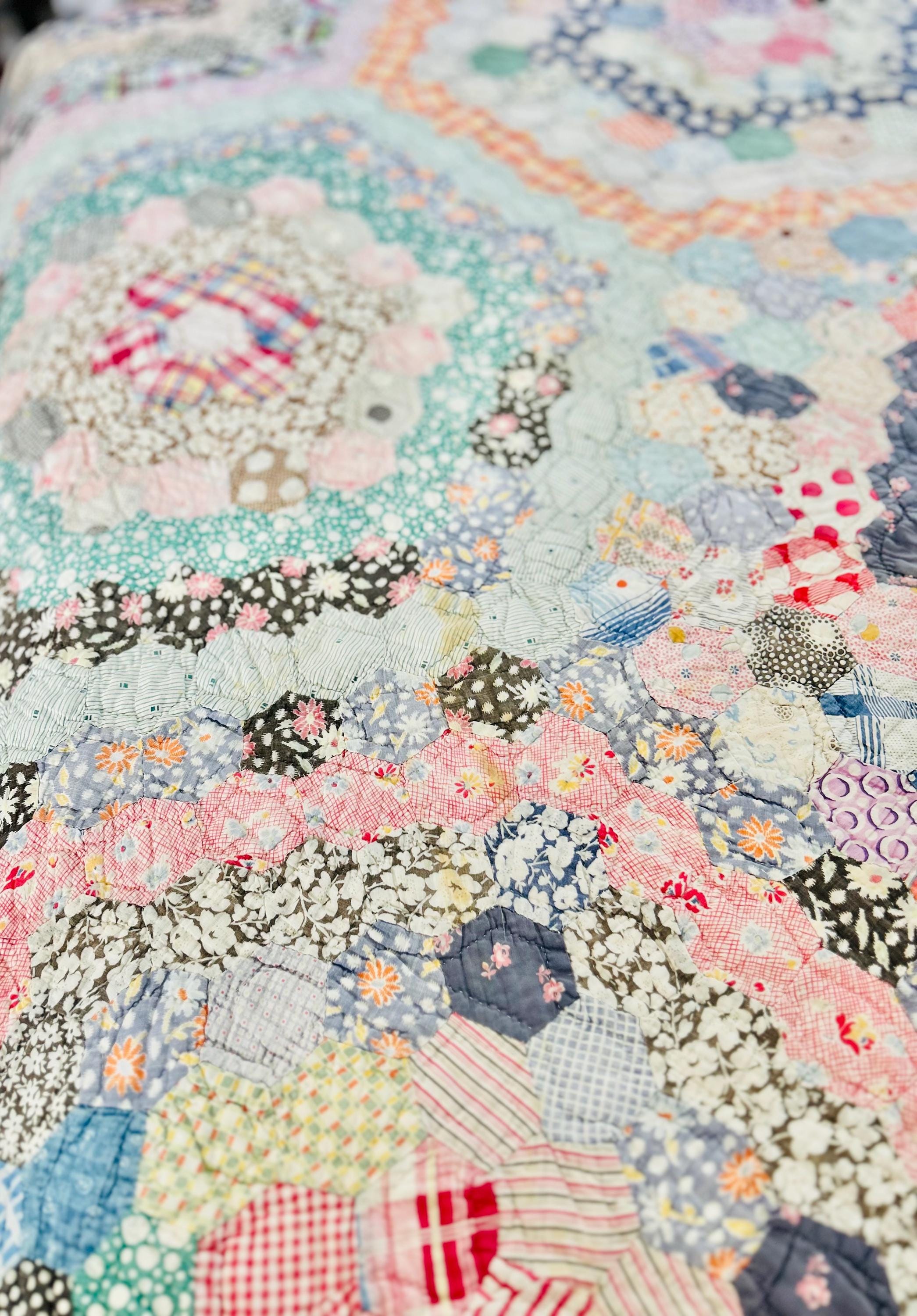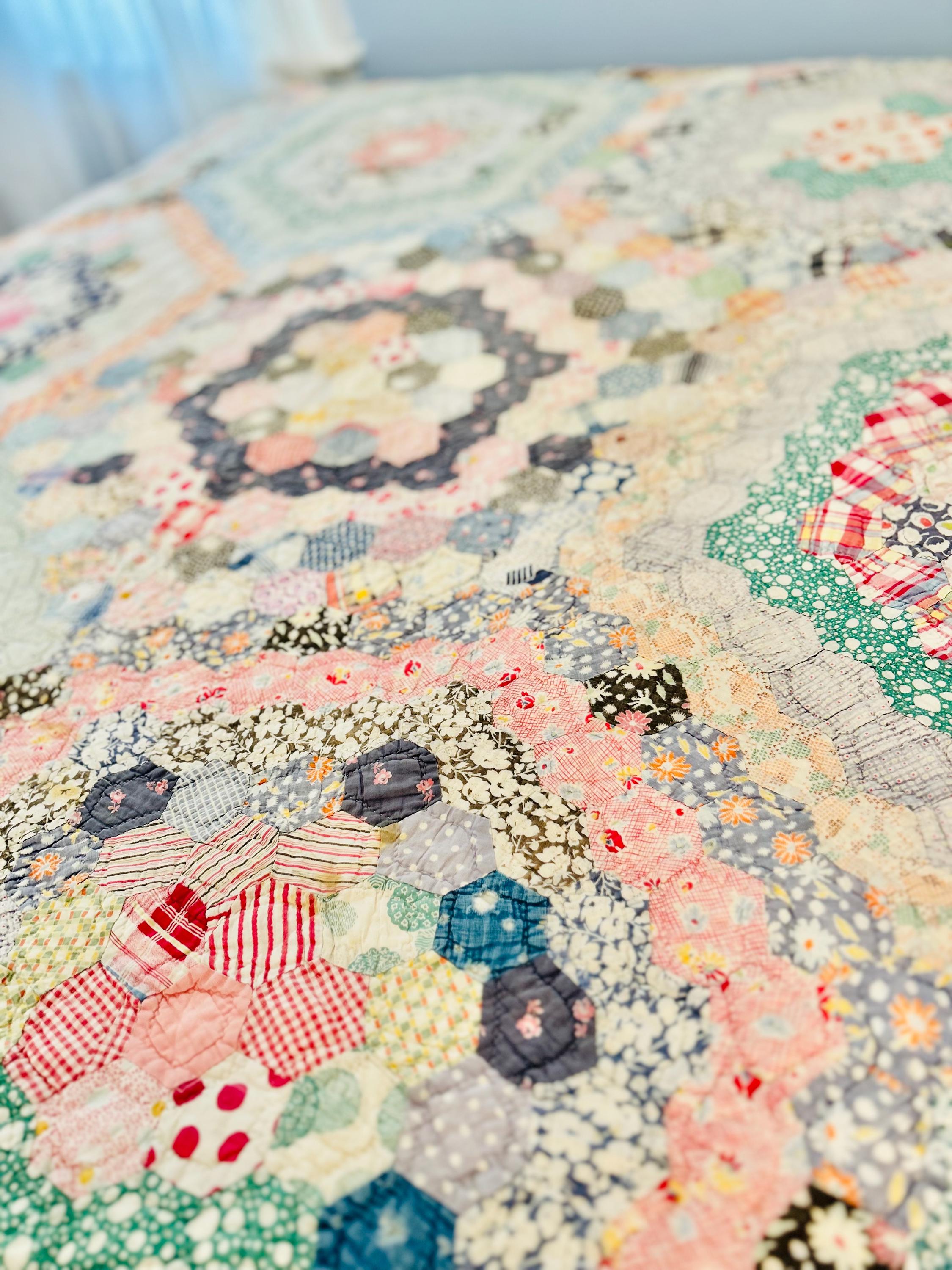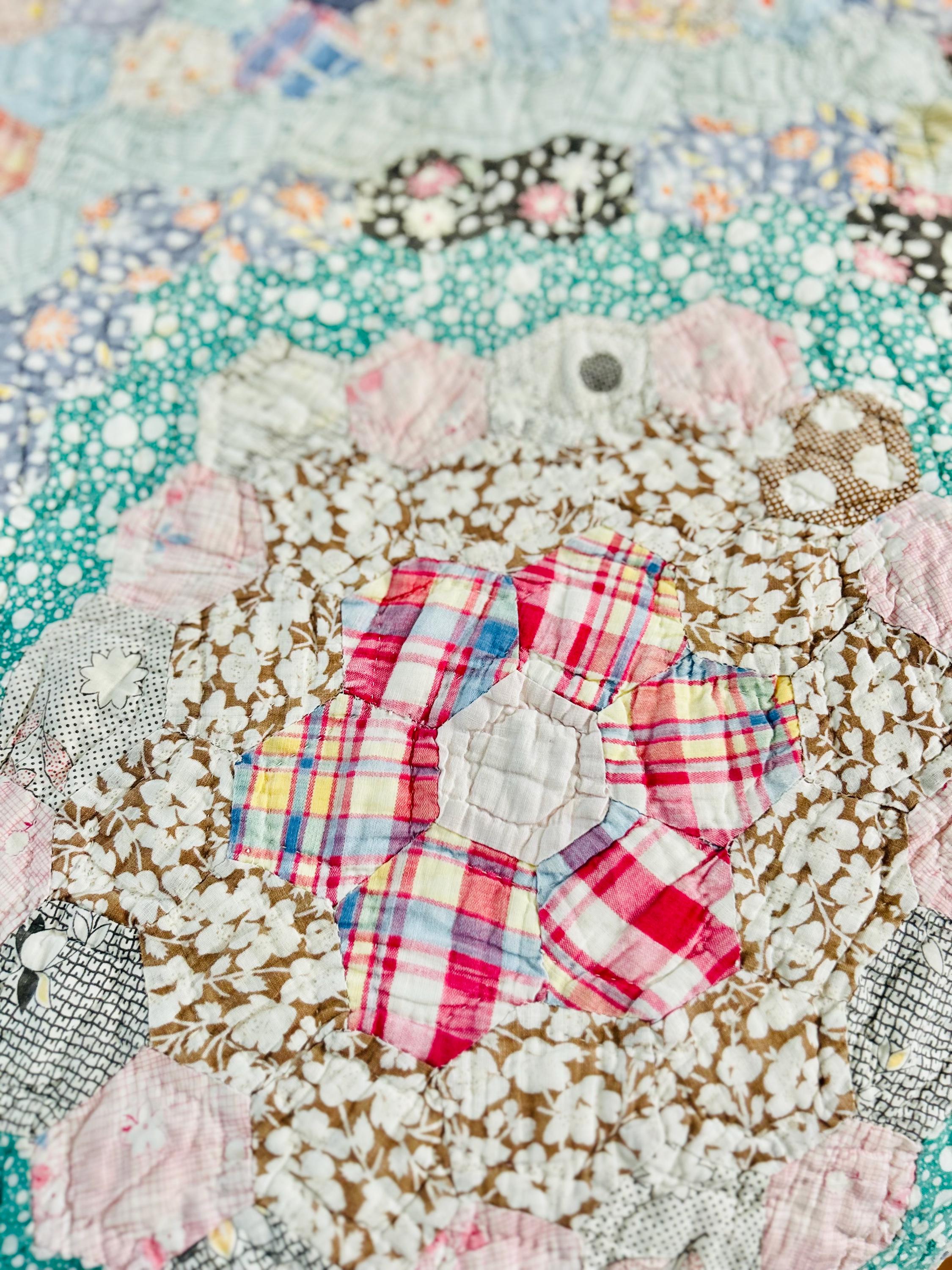This beautiful hand-pieced 1930s Garden Walk Quilt is a much rarer variation of the Grandmother's Flower Garden pattern and is made of thousands of hexagons. It is made of feedsack and dress prints -- polka dots, plaids, florals and pastels giving it an unmistakable Depression-era look. It is hand-quilted in closely-spaced double contour lines throughout.