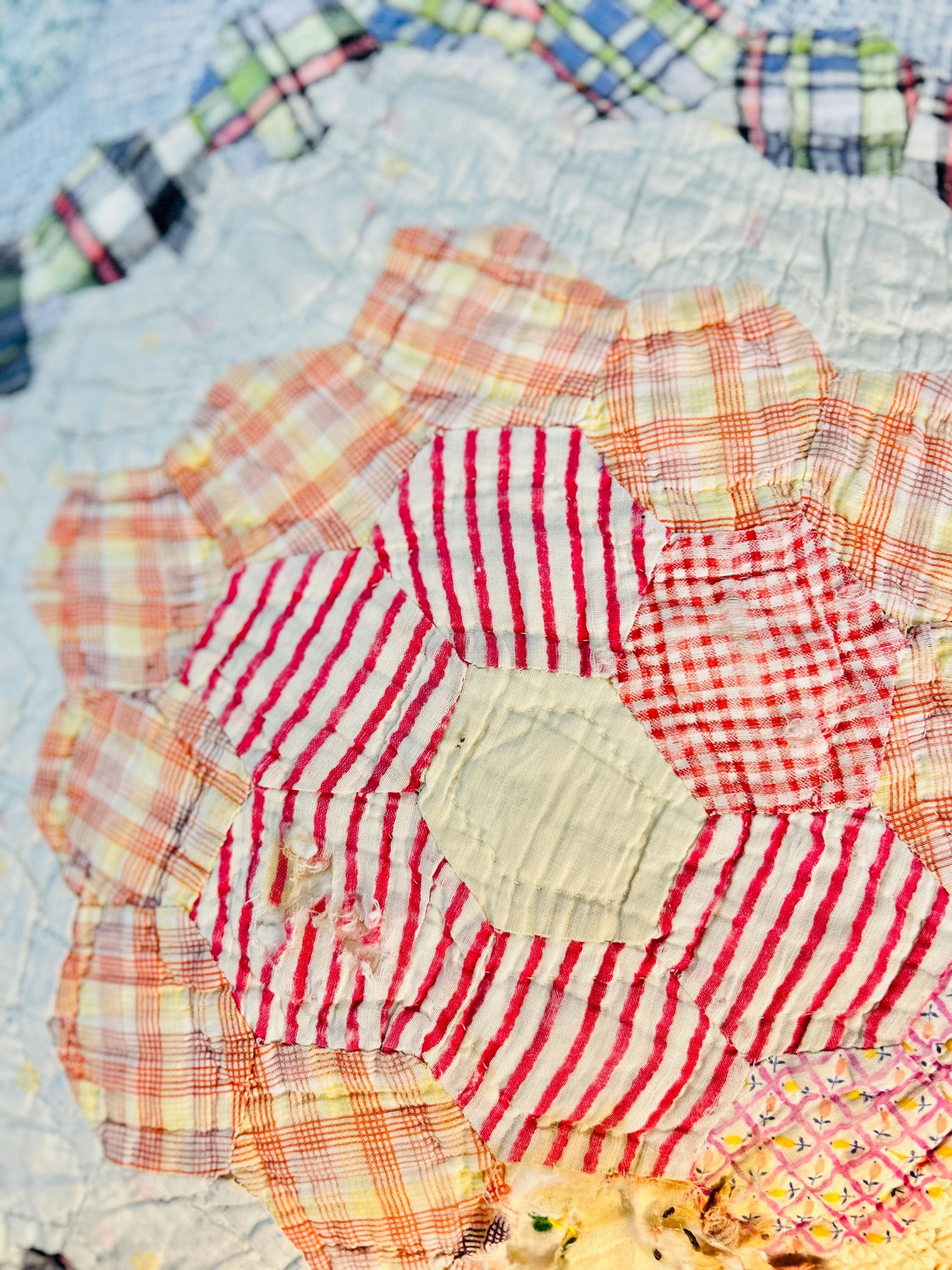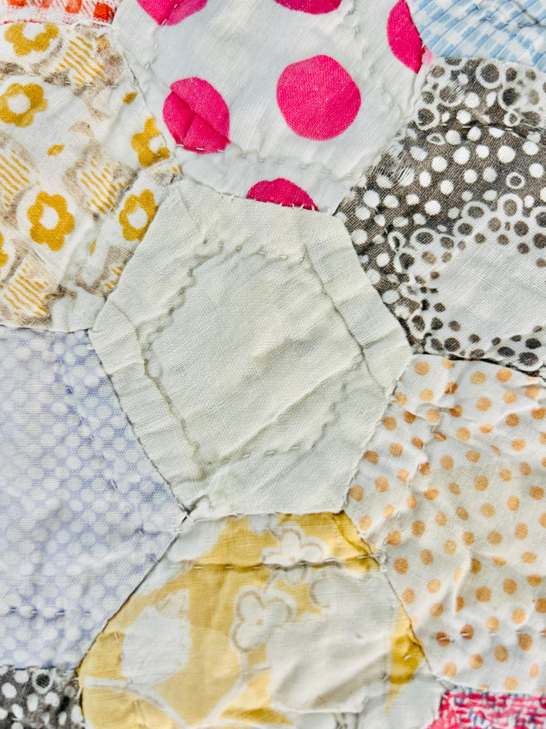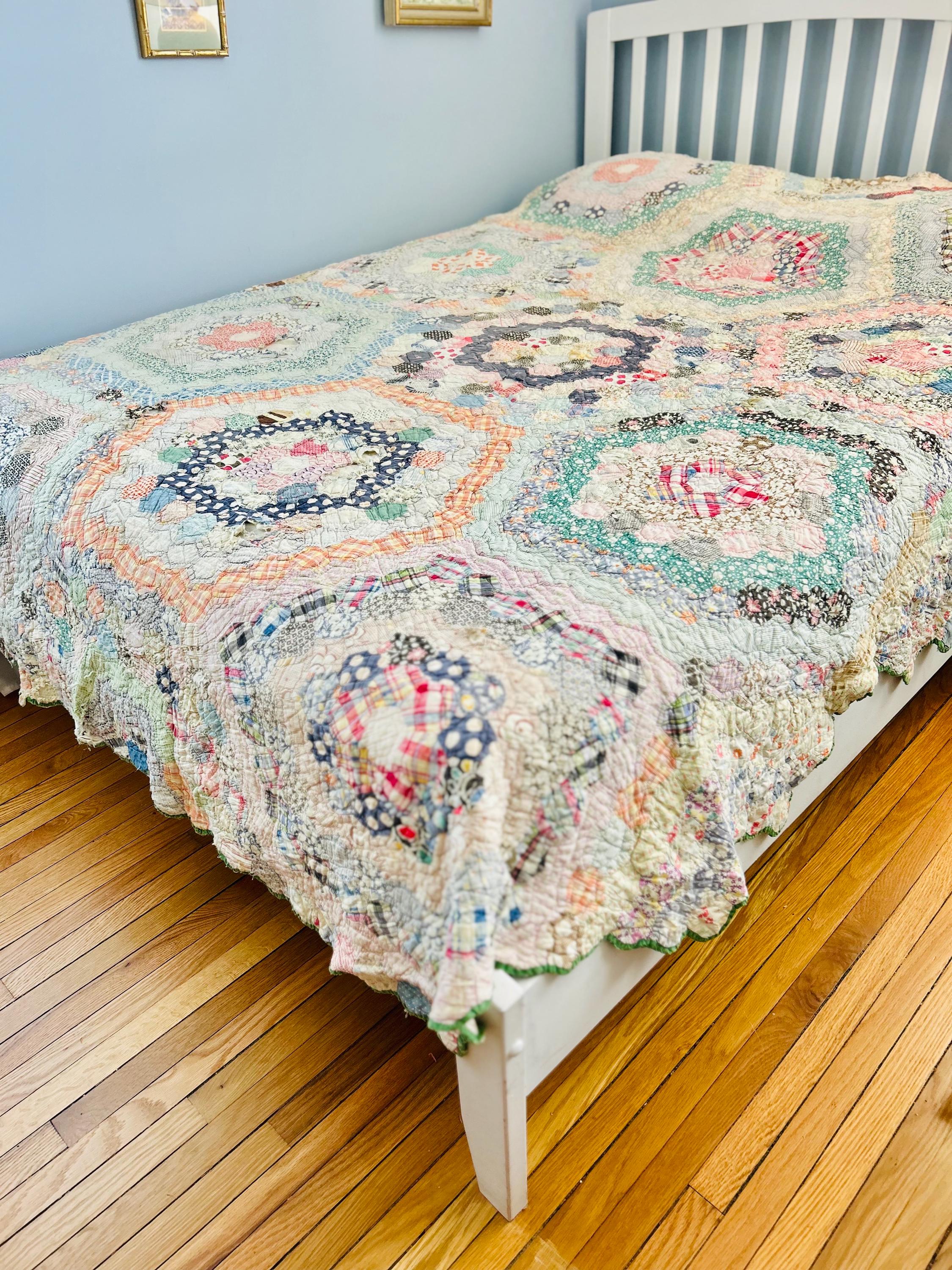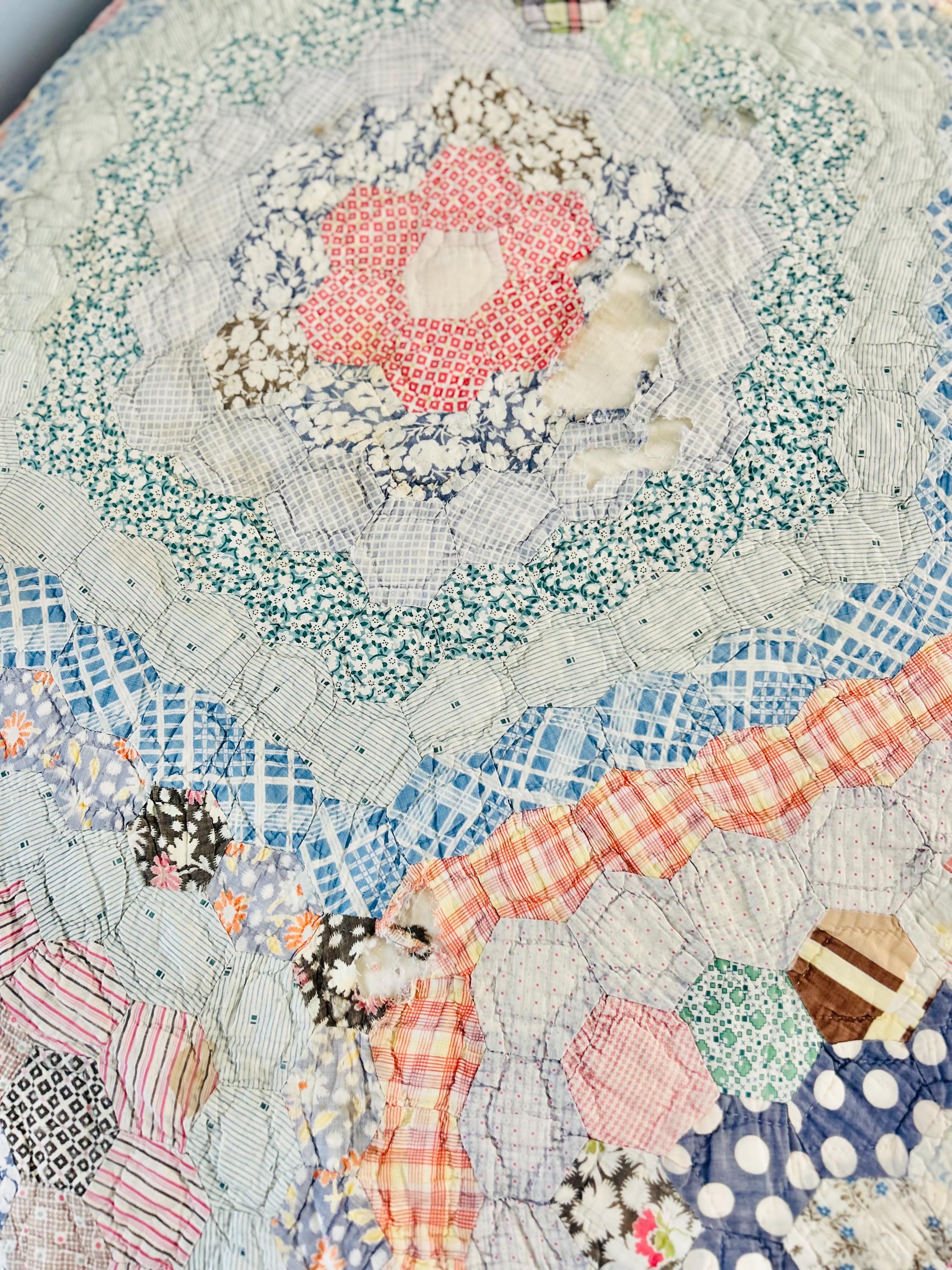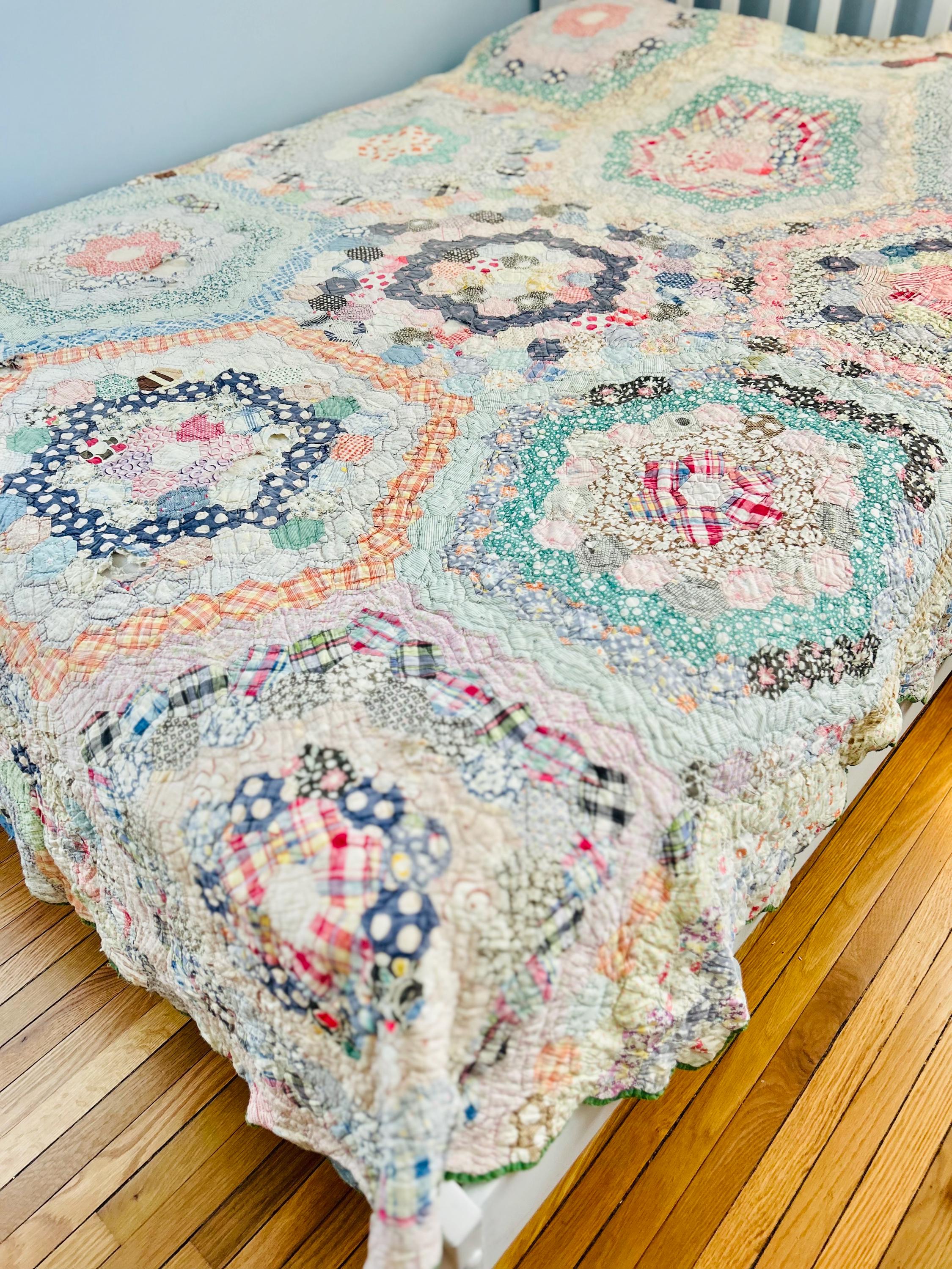 This beautiful hand-pieced 1930s Garden Walk Quilt is a much rarer variation of the Grandmother's Flower Garden pattern and is made of thousands of hexagons. It is made of feedsack and dress prints -- polka dots, plaids, florals and pastels giving it an unmistakable Depression-era look. It is hand-quilted in closely-spaced double contour lines throughout.