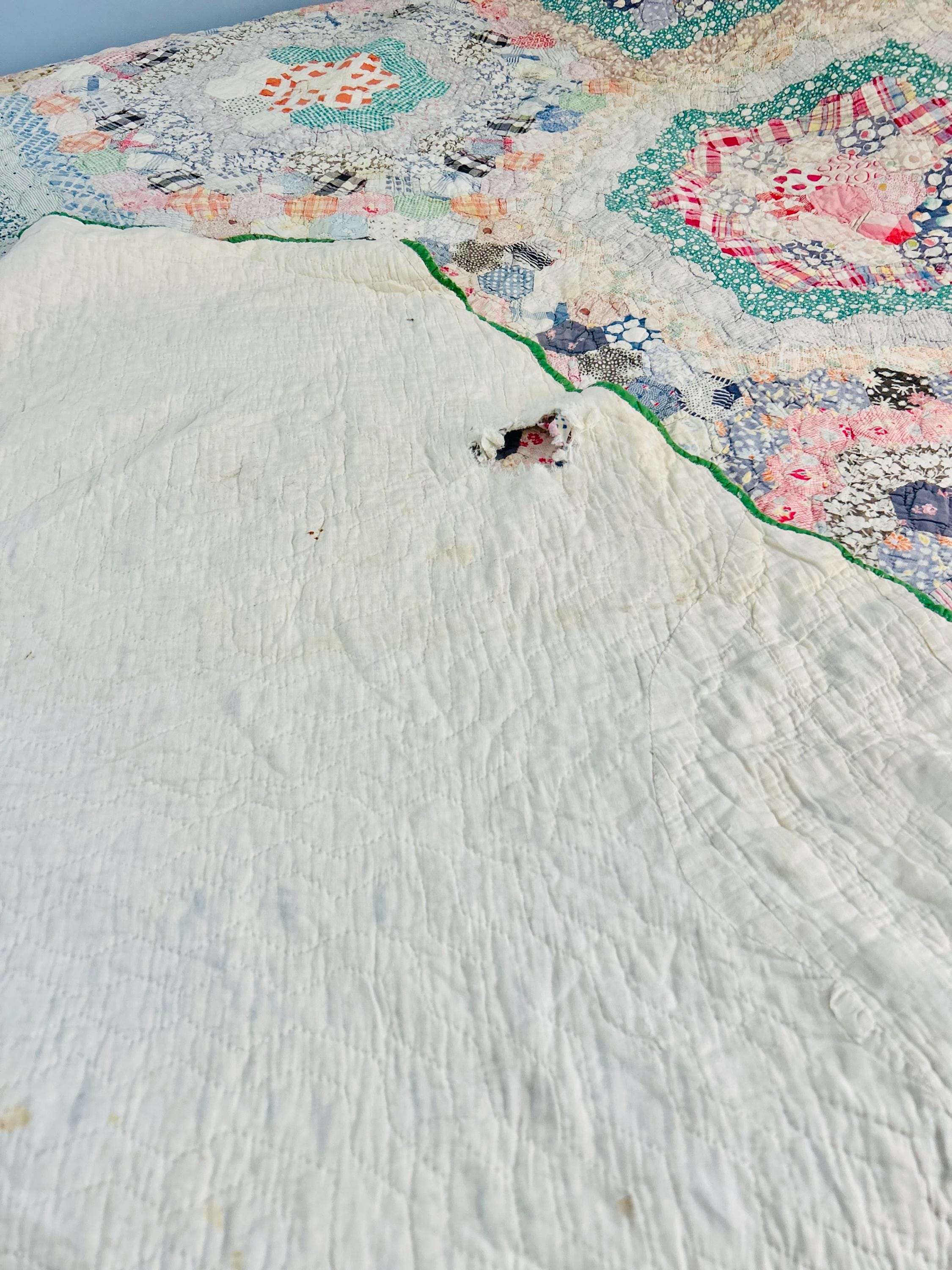 Most of the quilt is in very good, though slightly faded, condition, but unfortunately the quilt has scattered small holes, a frayed binding and some toning/tan spots on the back making it in cutter or crafting condition. See photos.