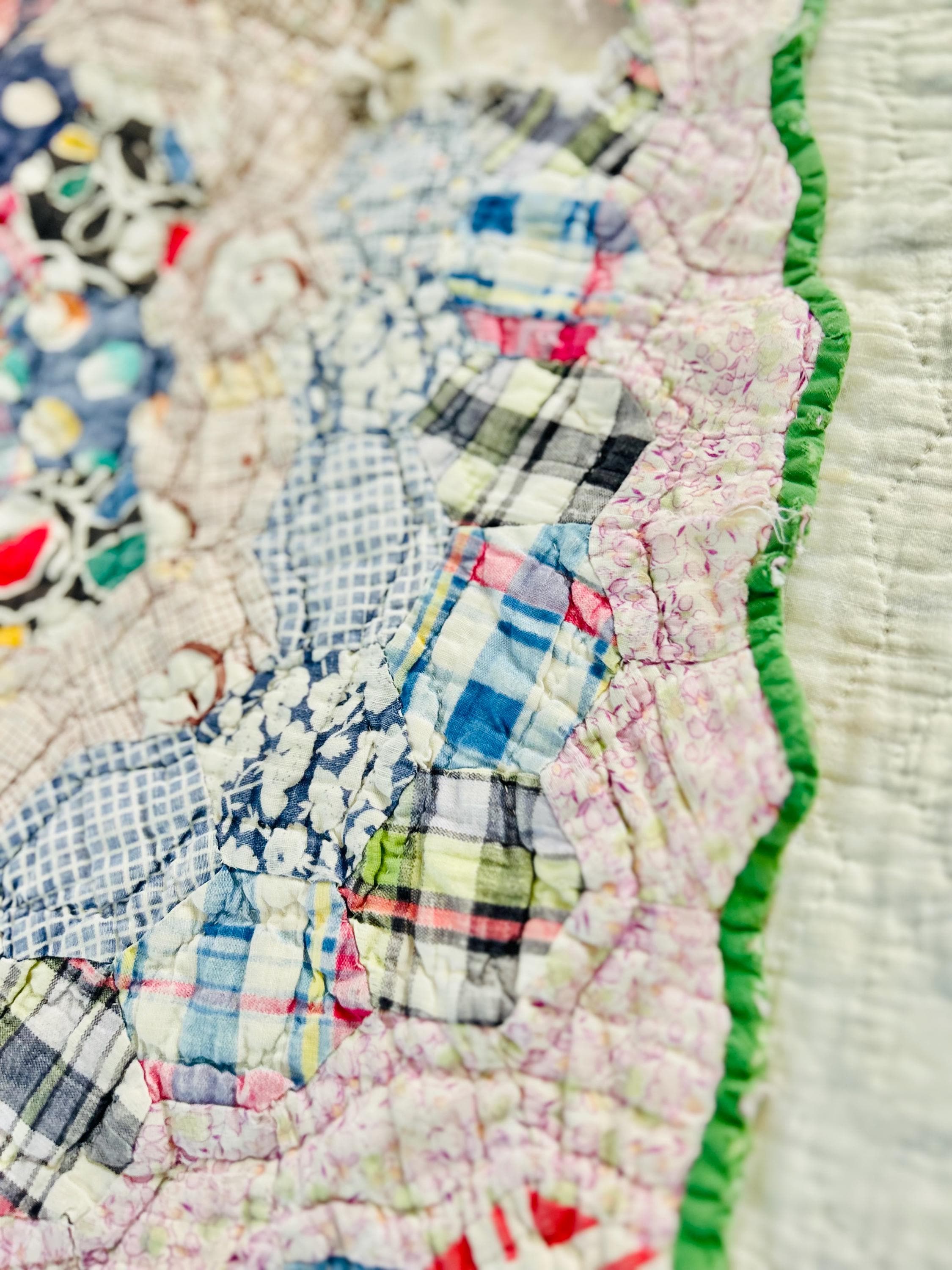 The back is white cotton while the binding is green cotton that has been hand-stitched to both sides. The cotton batting is unsized and lightweight.