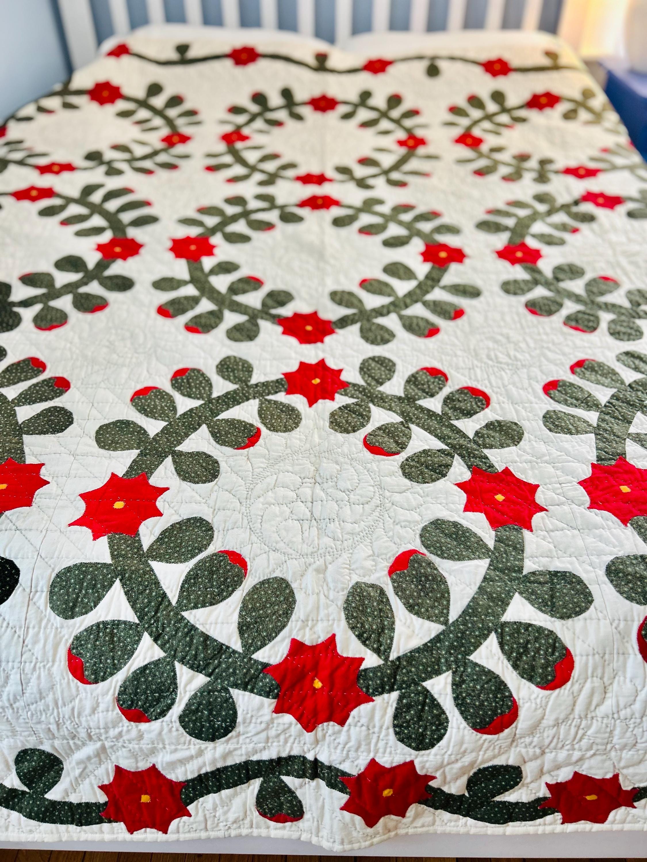 This quilt measures 78 inches by 79 inches and comes from a smoke-free and pet-free home. Pictured on a queen-size bed.