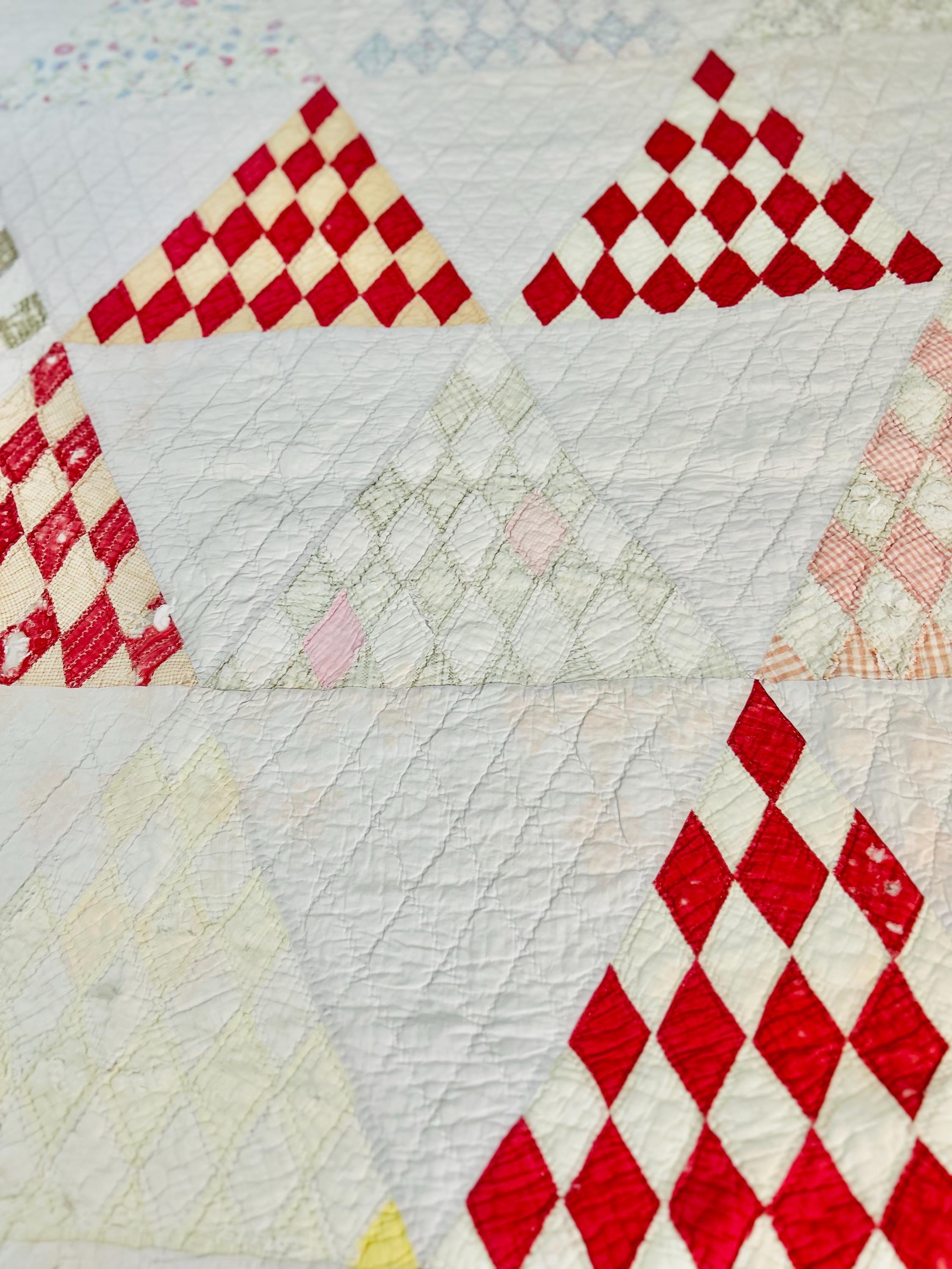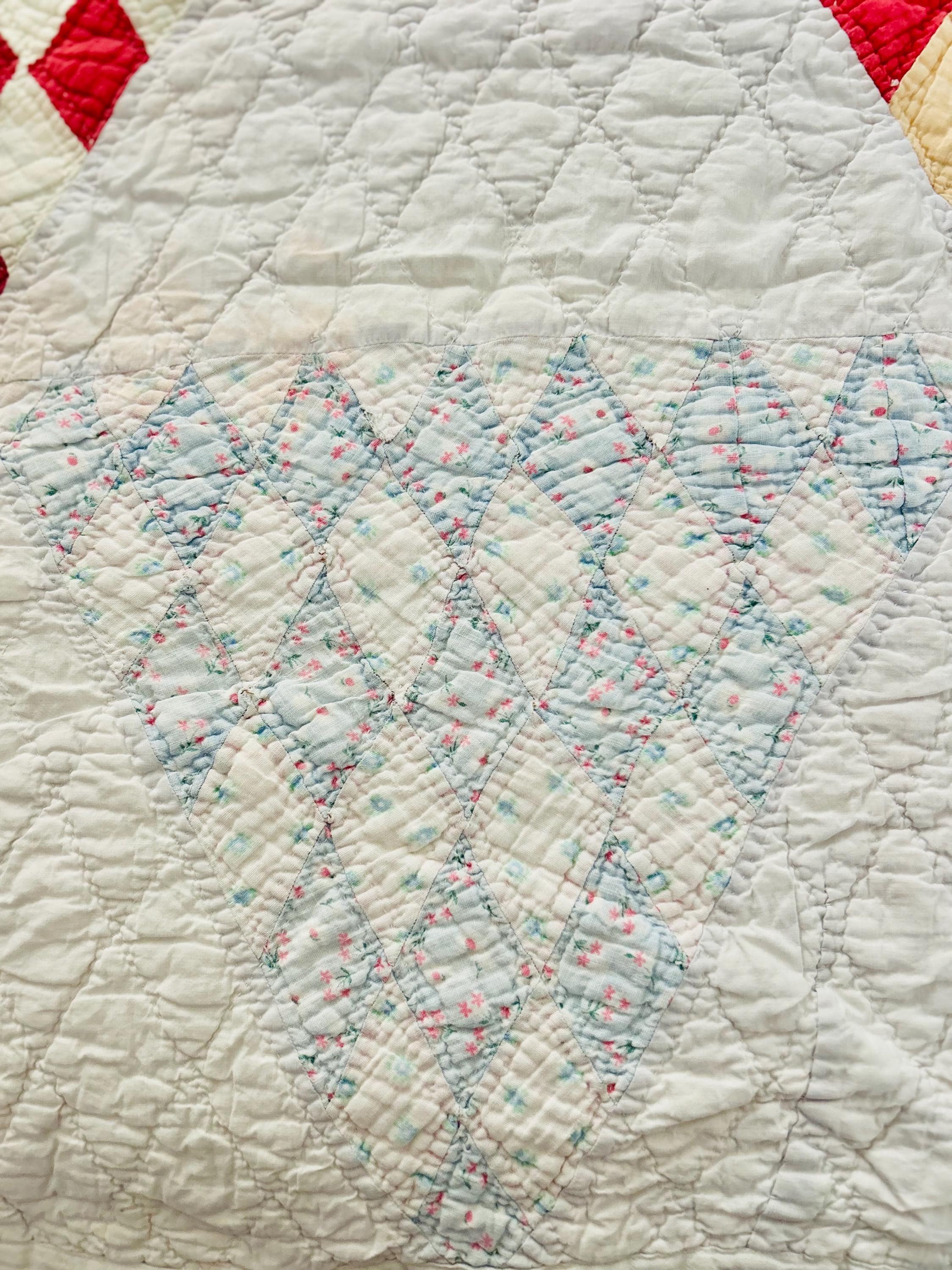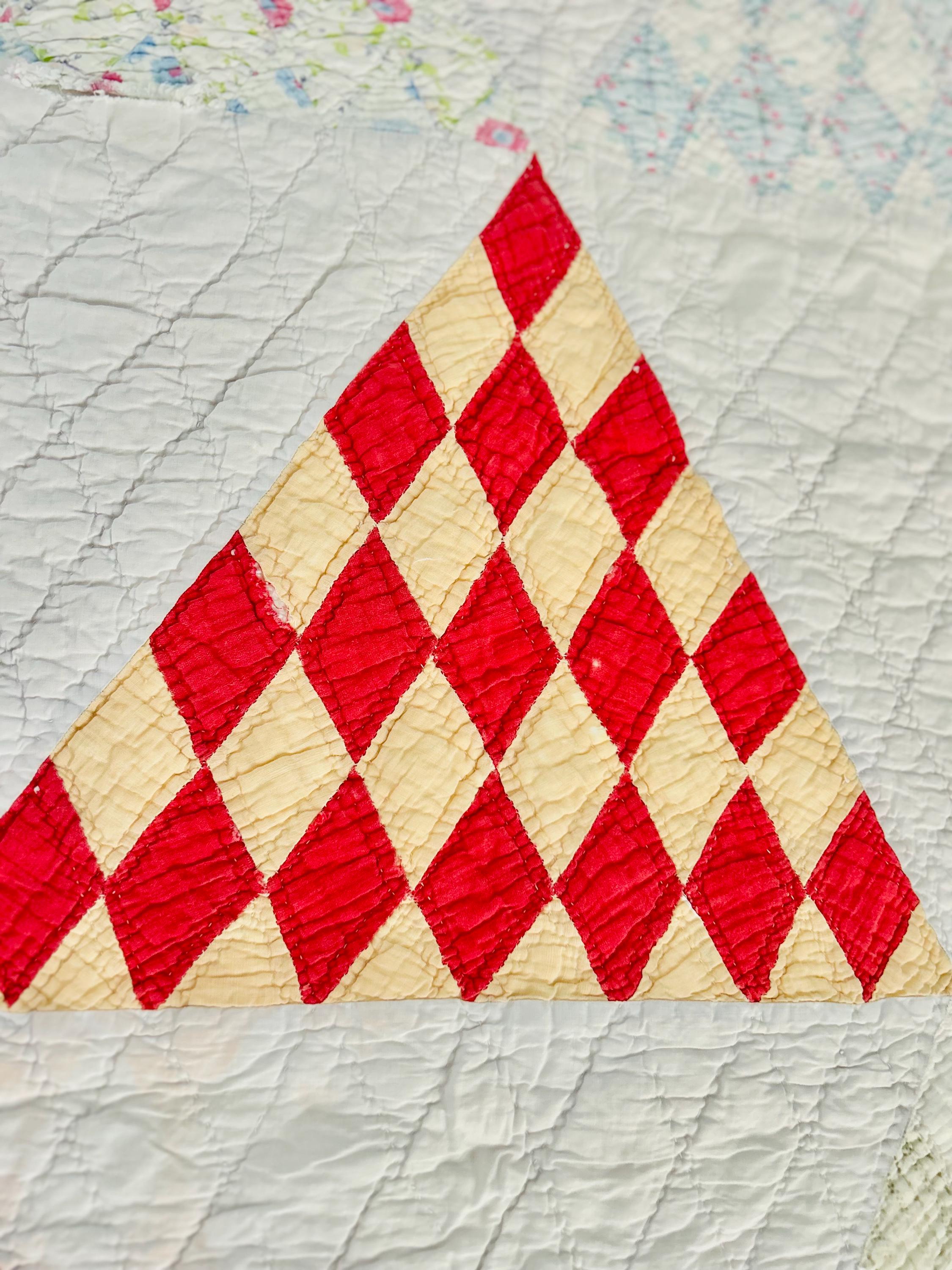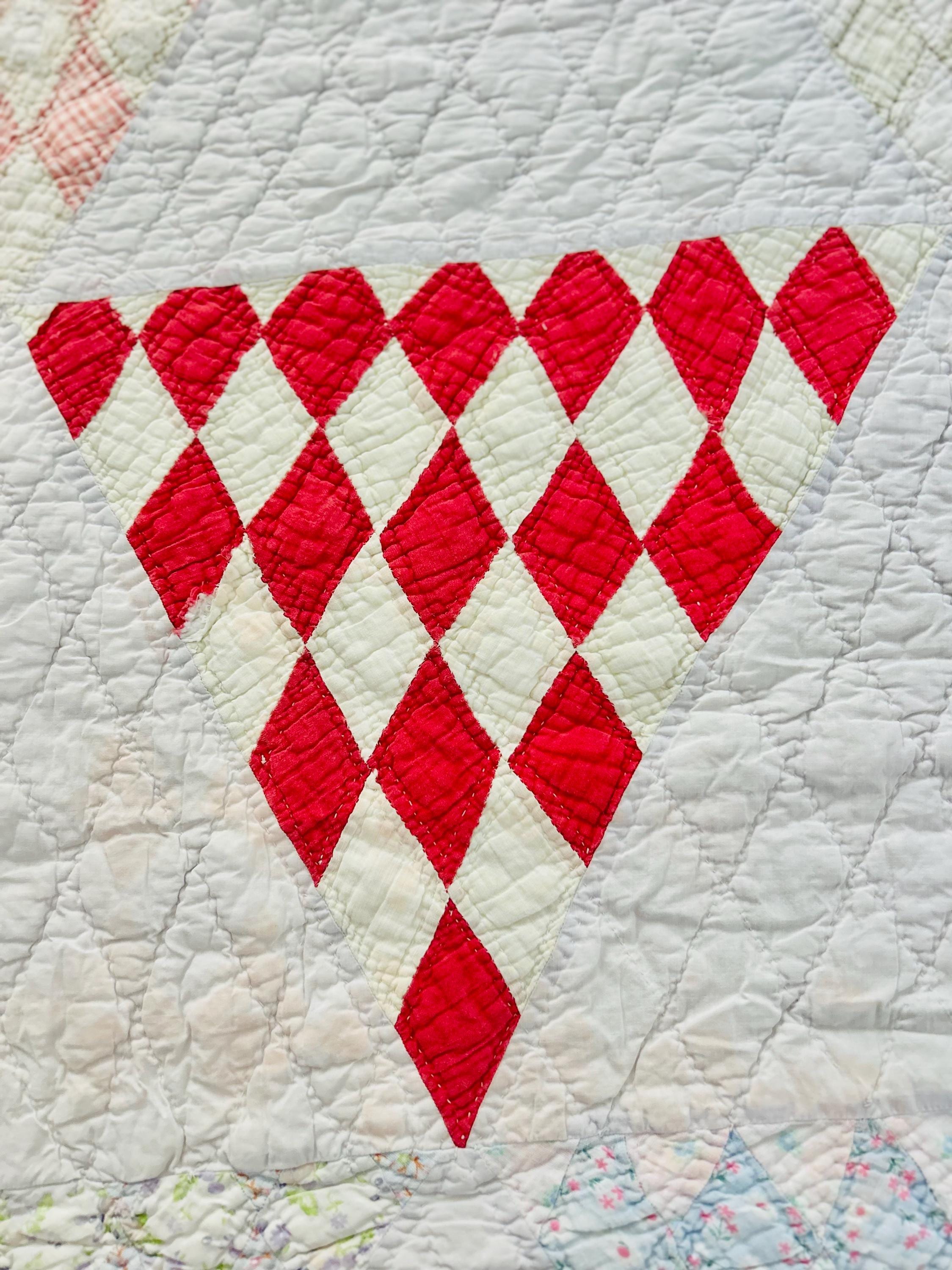 Beautiful Sugar Loaf Quilt, circa 1930s, this quilt is a mix of bold red diamonds andwith soft pastel feedsack prints, all hand-pieced and densely hand-quilted. With these colors and the Sugar Loaf pattern, this is a classic farmhouse decor/Americana decor quilt. It has been quilted in outlines of the diamonds and -- in the white areas -- in an identical diamond pattern.
