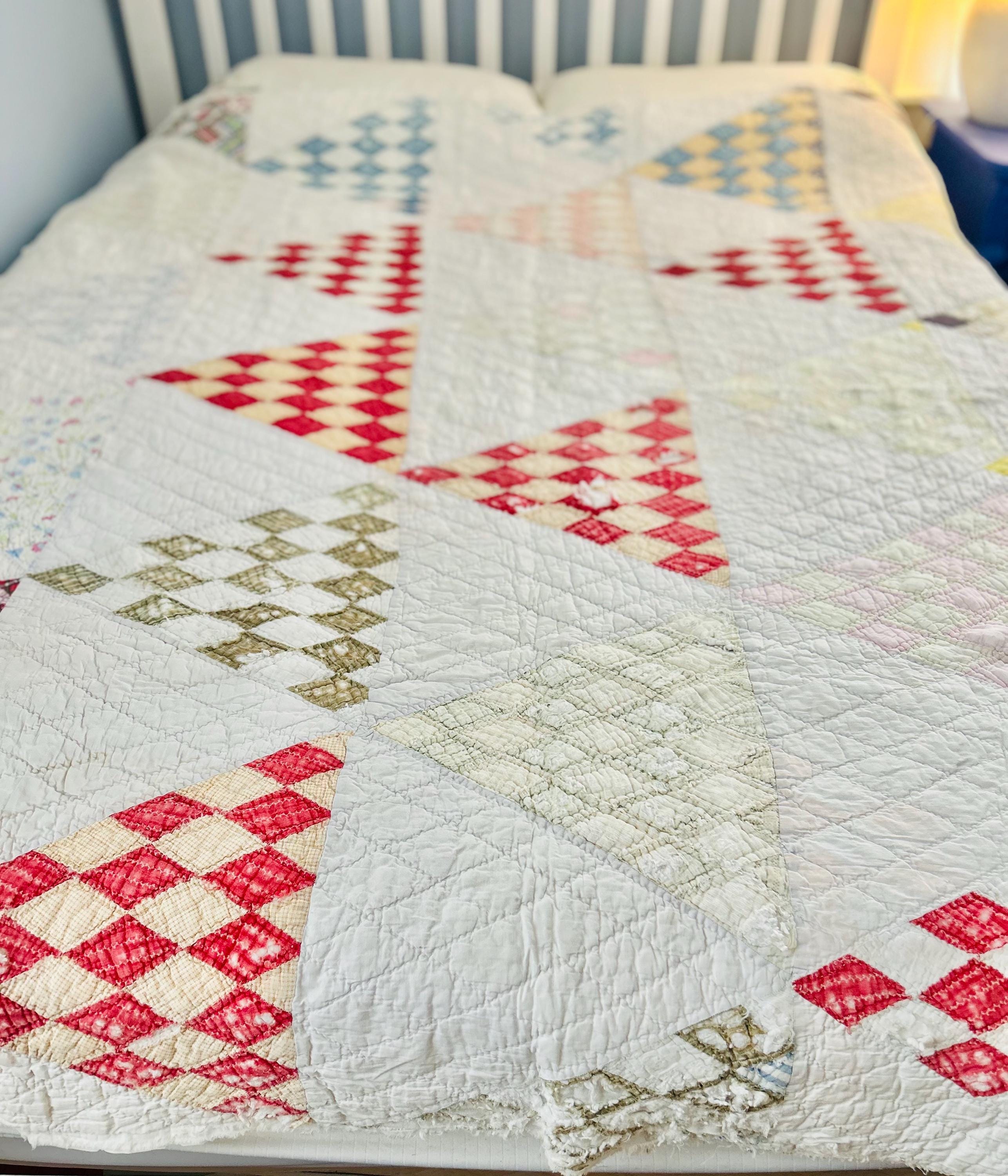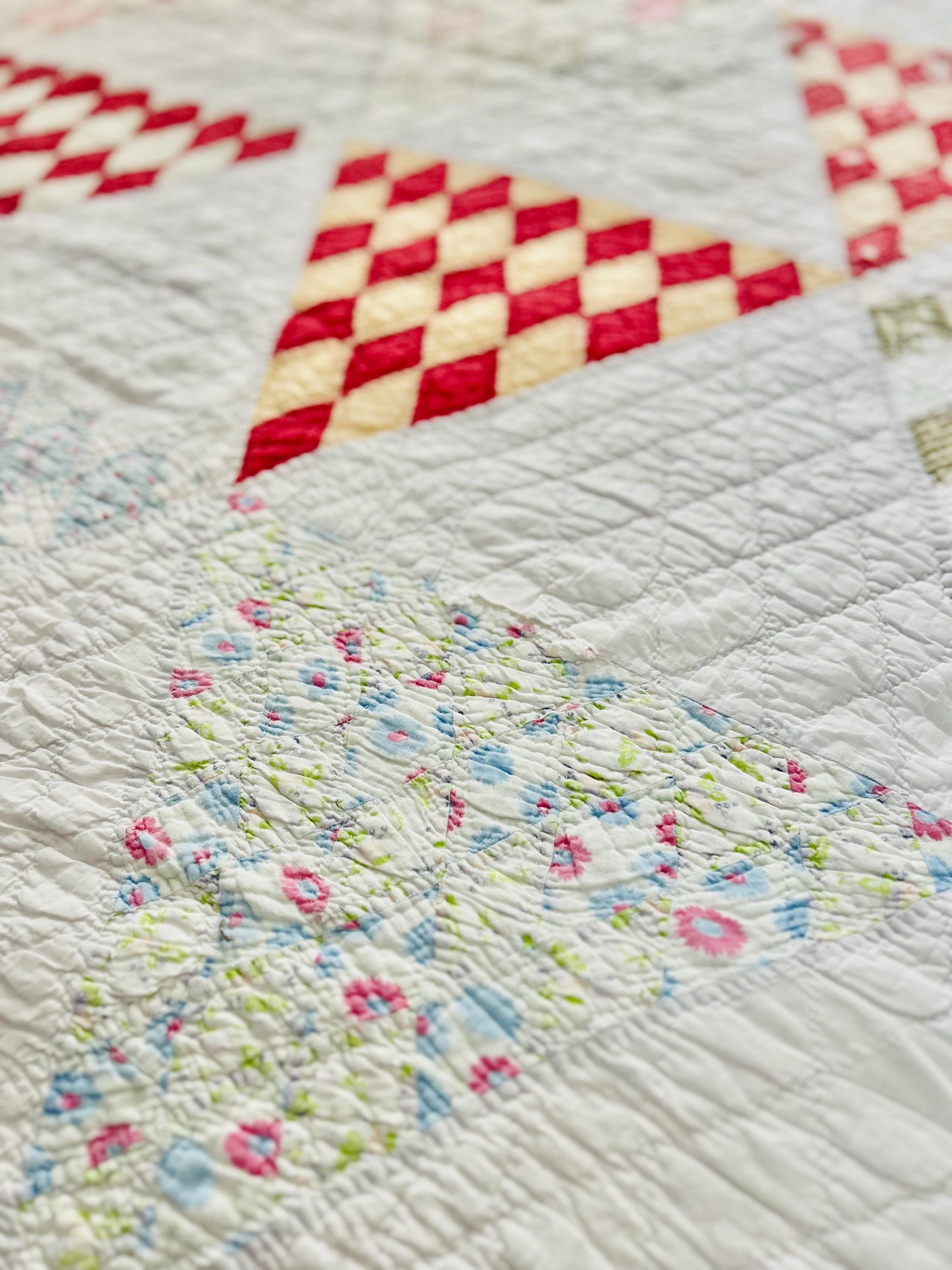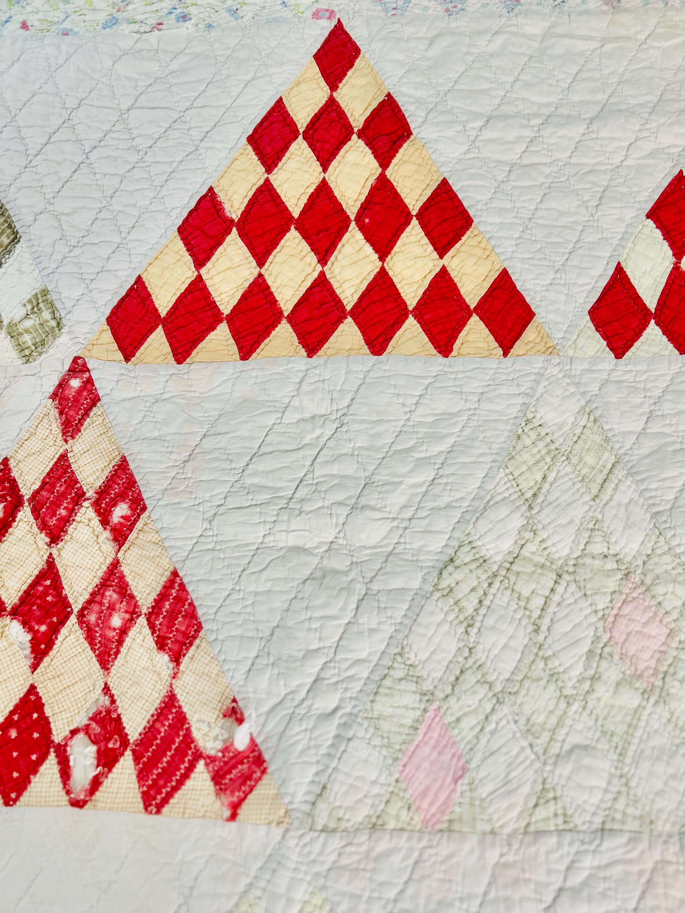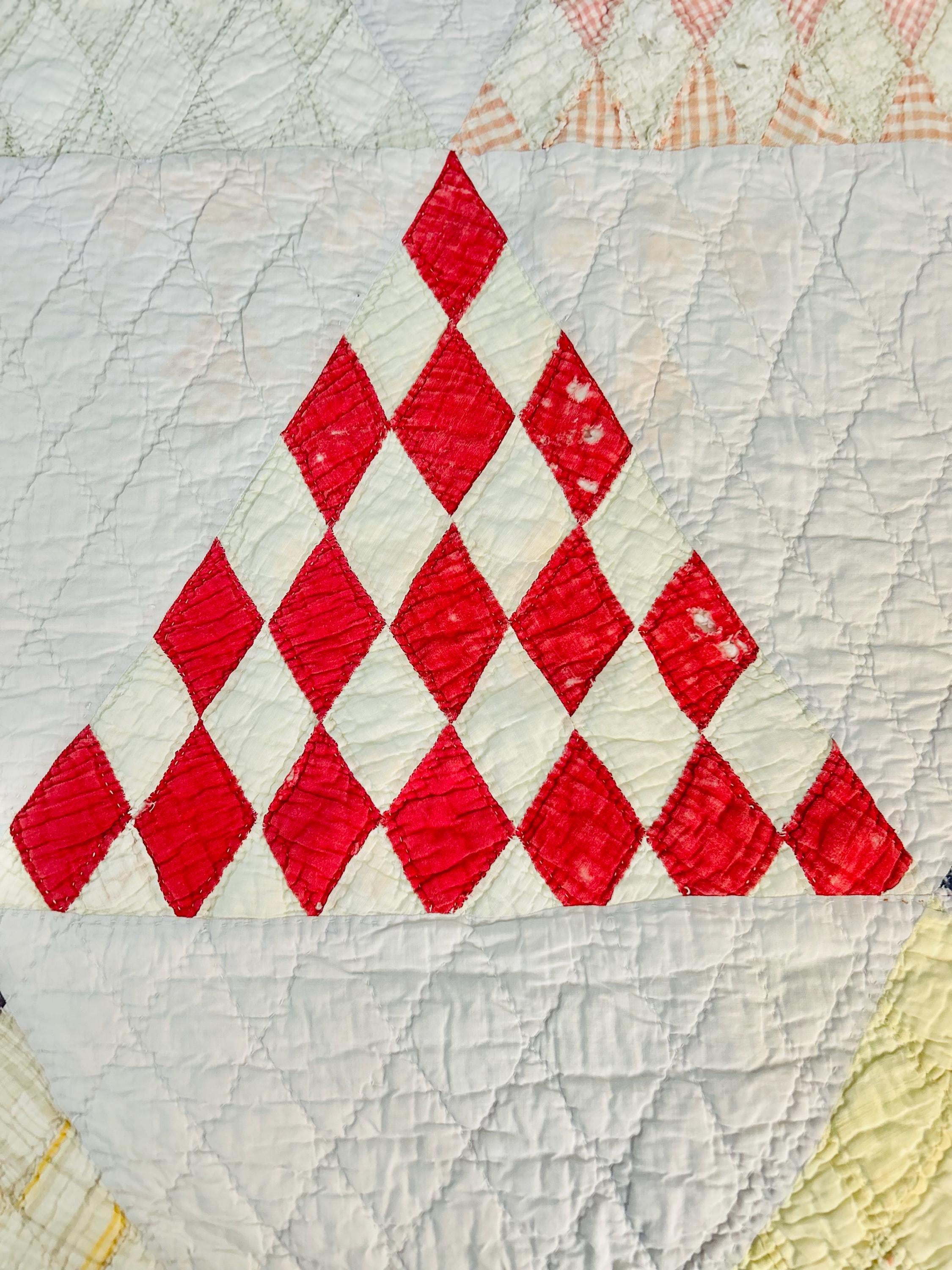 Beautiful Sugar Loaf Quilt, circa 1930s, this quilt is a mix of bold red diamonds andwith soft pastel feedsack prints, all hand-pieced and densely hand-quilted. With these colors and the Sugar Loaf pattern, this is a classic farmhouse decor/Americana decor quilt. It has been quilted in outlines of the diamonds and -- in the white areas -- in an identical diamond pattern.