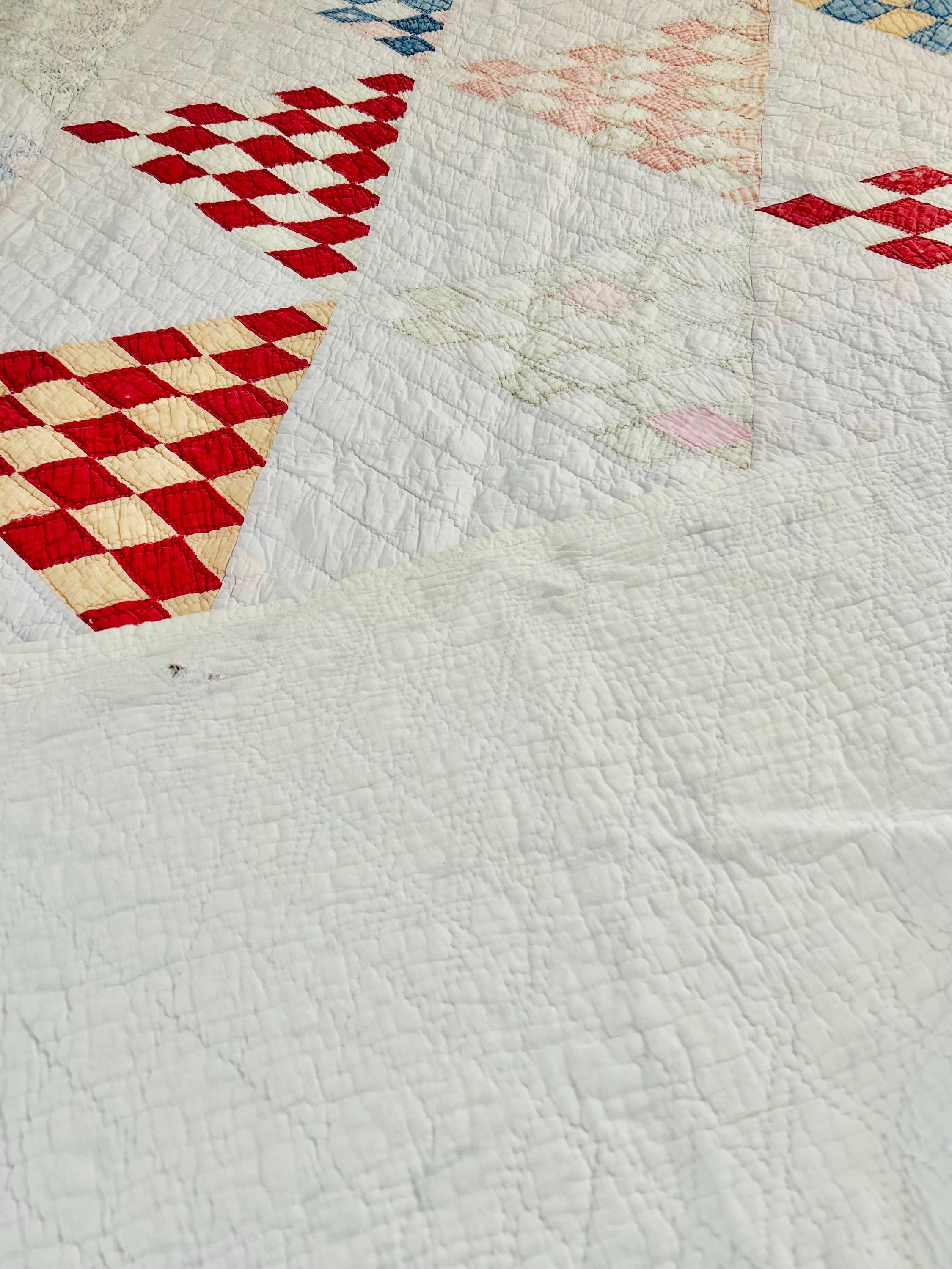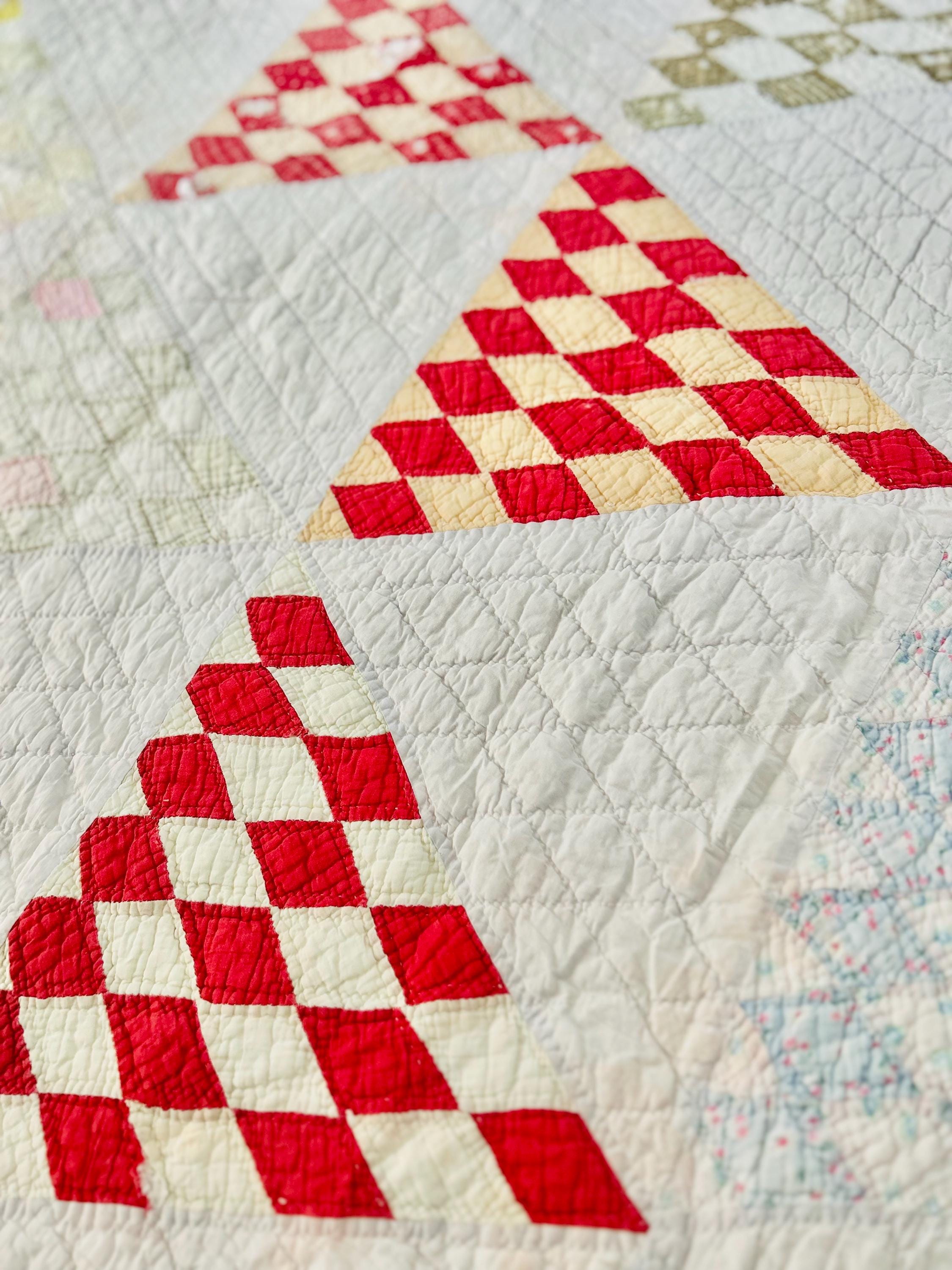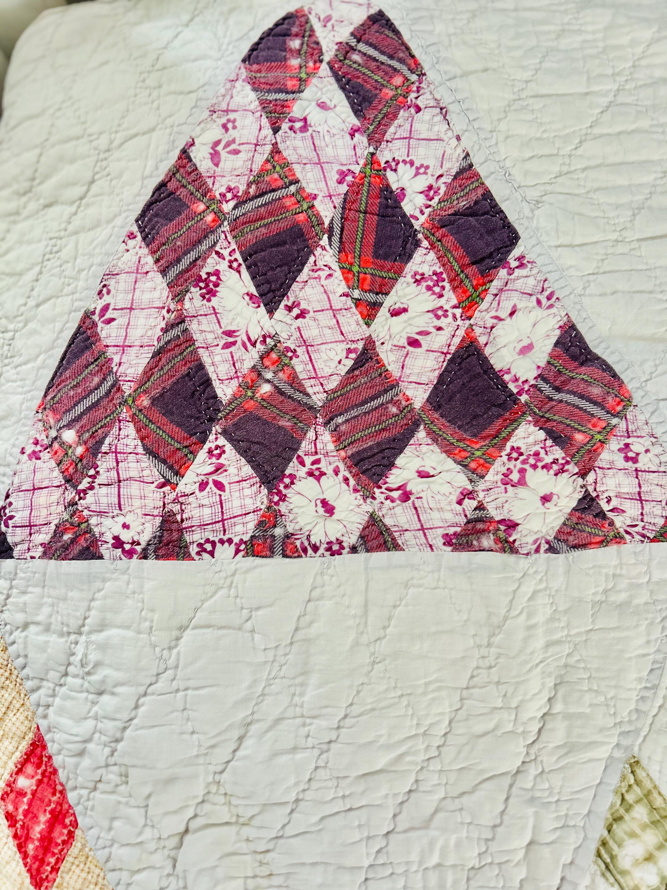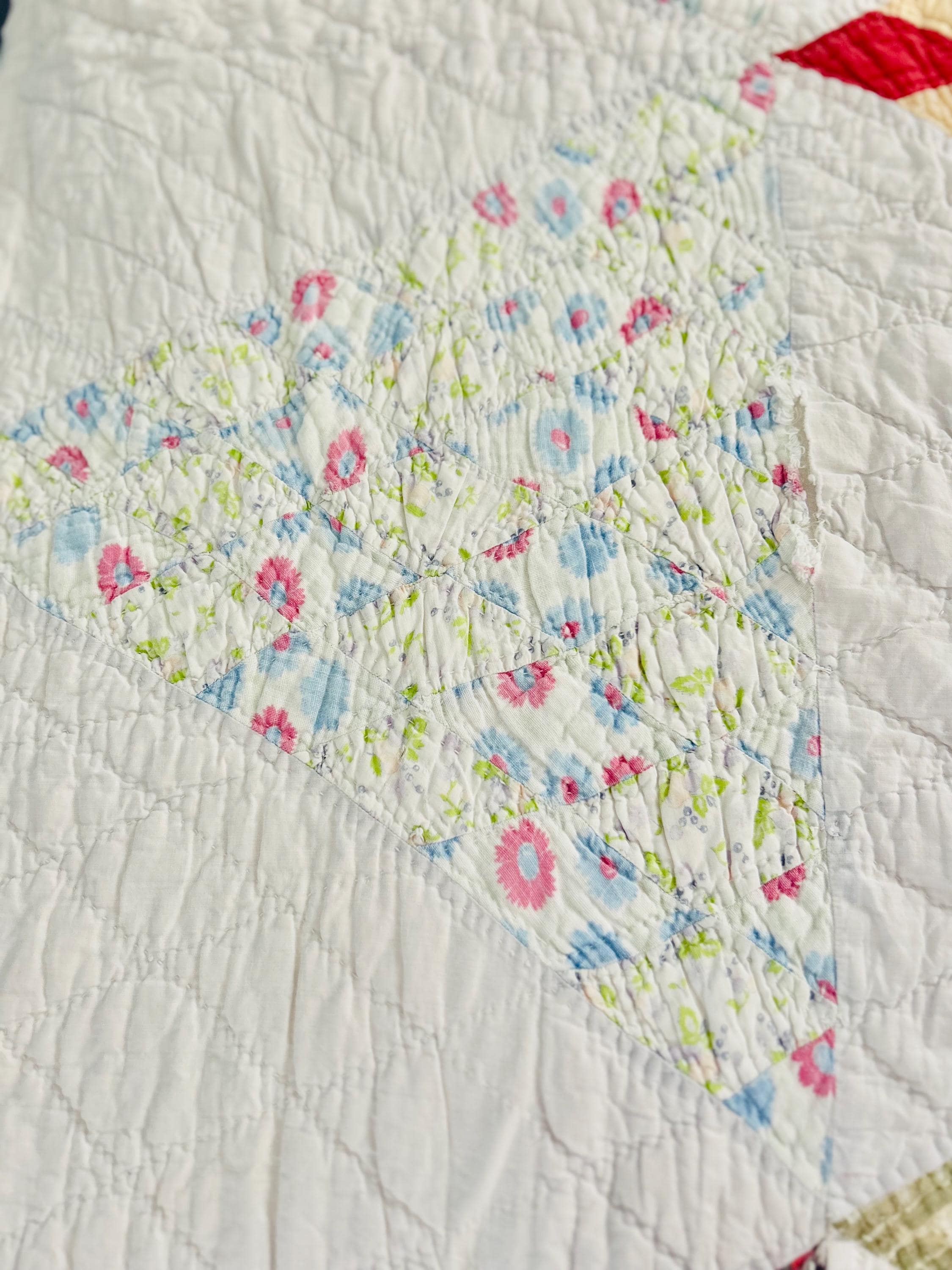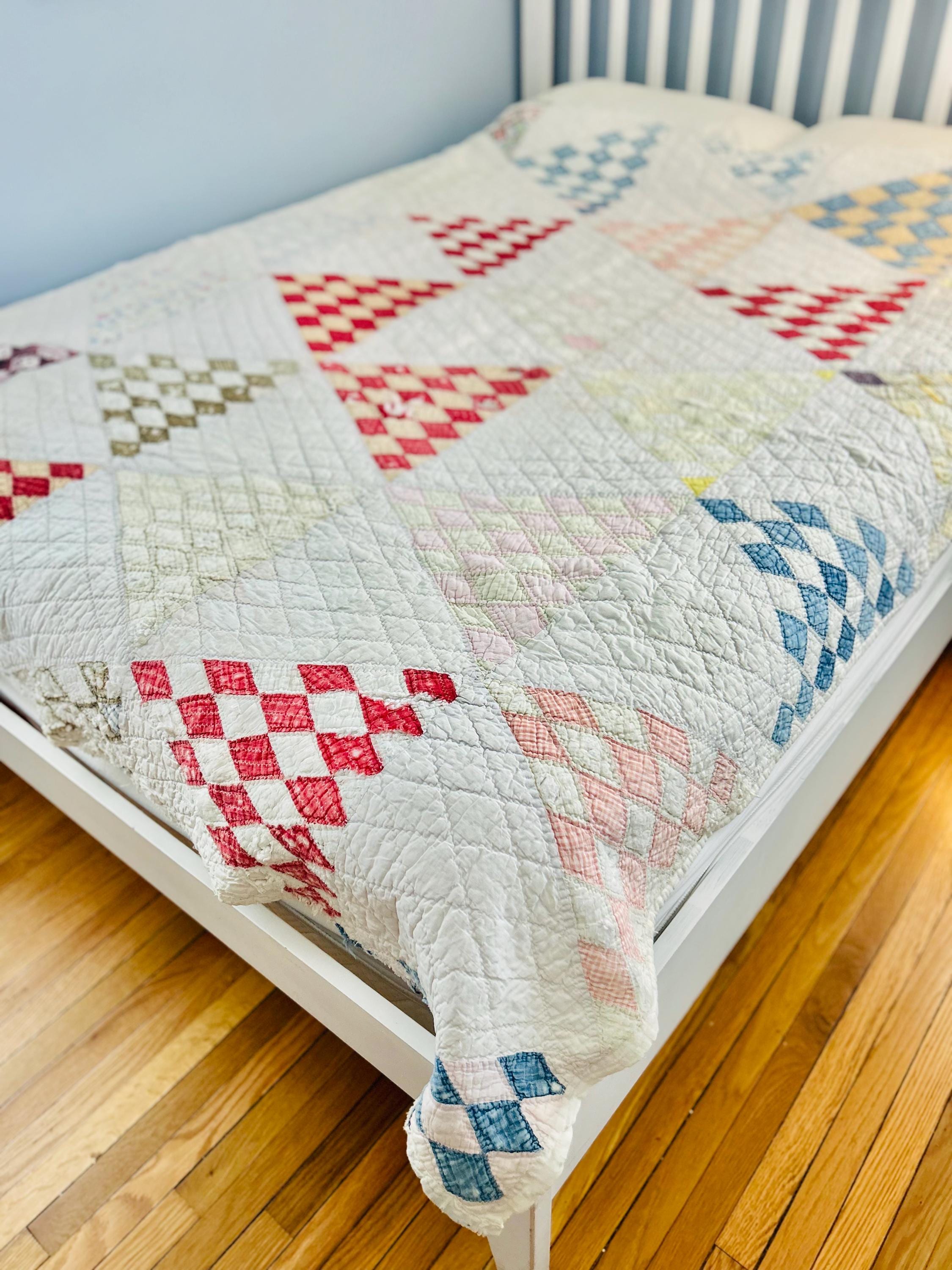 Beautiful Sugar Loaf Quilt, circa 1930s, this quilt is a mix of bold red diamonds andwith soft pastel feedsack prints, all hand-pieced and densely hand-quilted. With these colors and the Sugar Loaf pattern, this is a classic farmhouse decor/Americana decor quilt. It has been quilted in outlines of the diamonds and -- in the white areas -- in an identical diamond pattern.