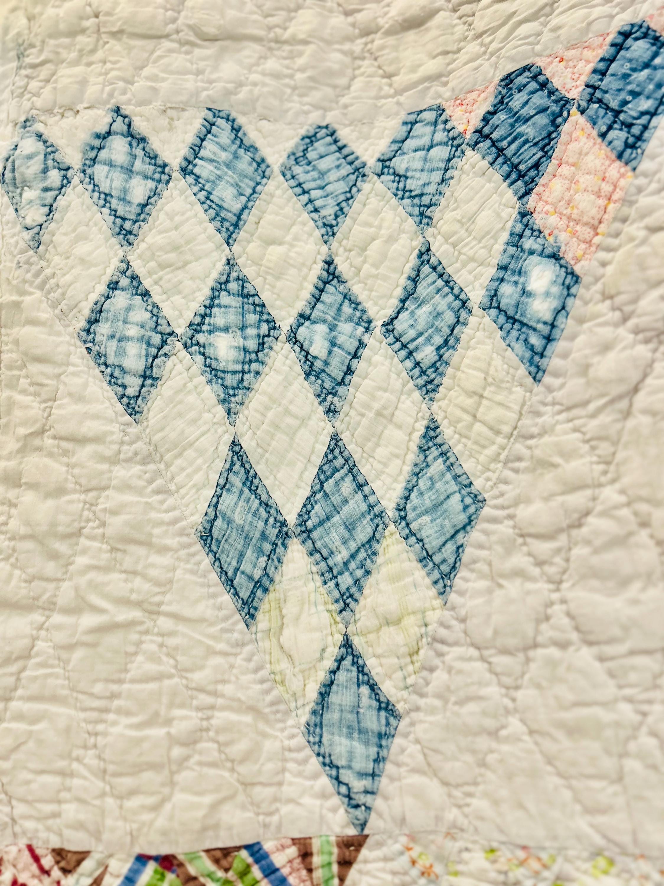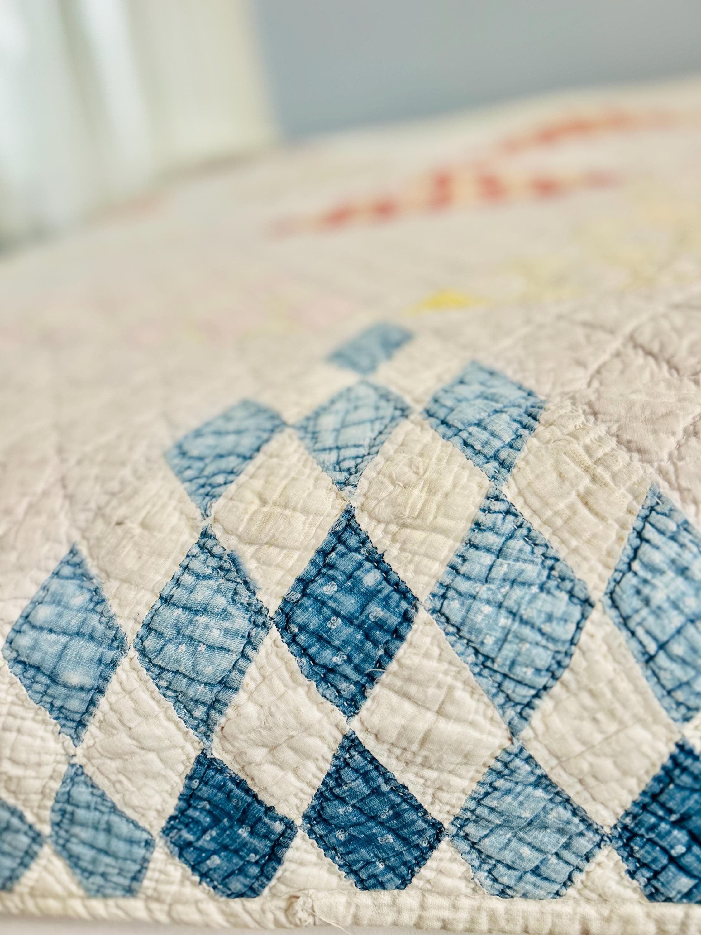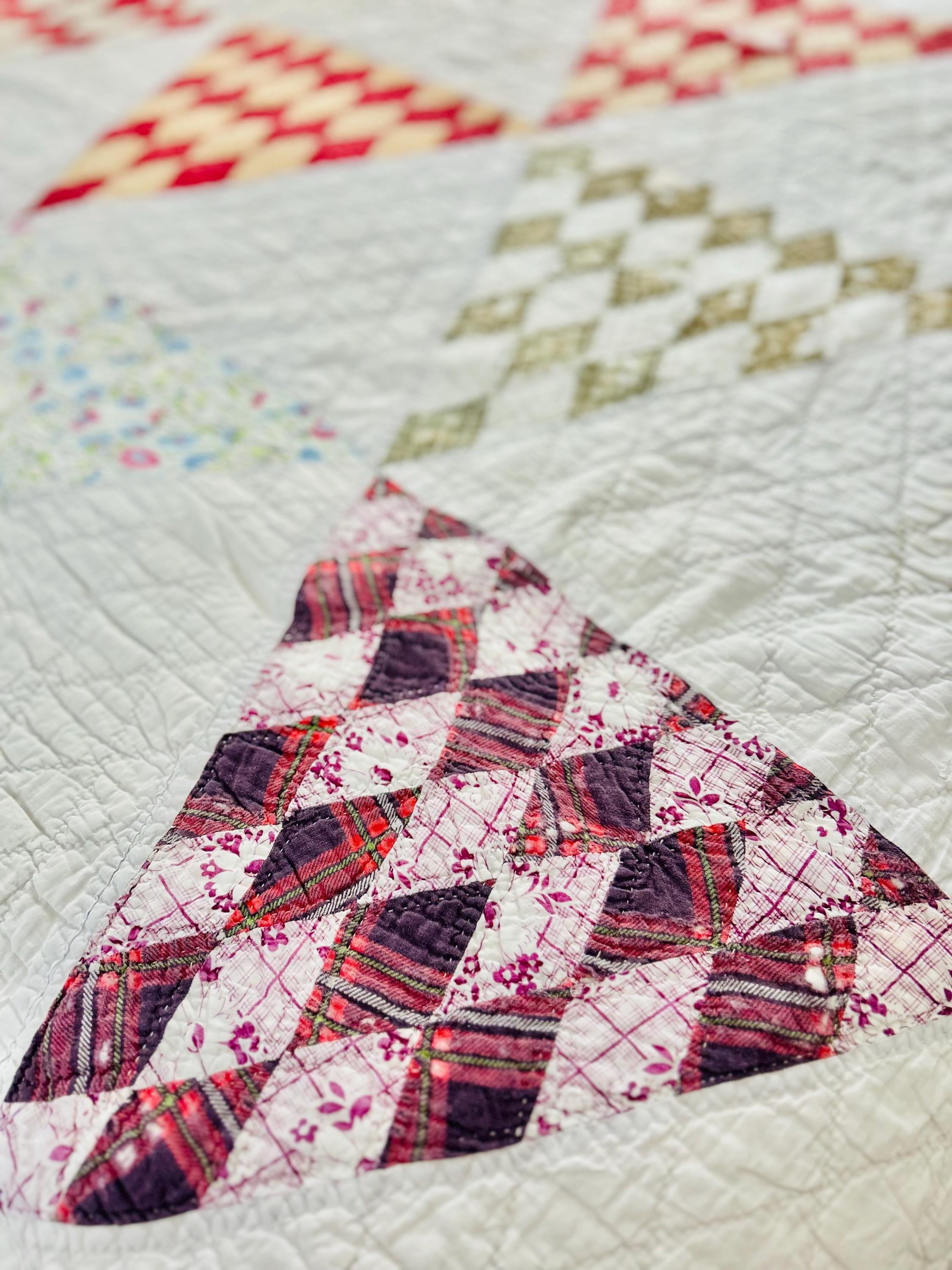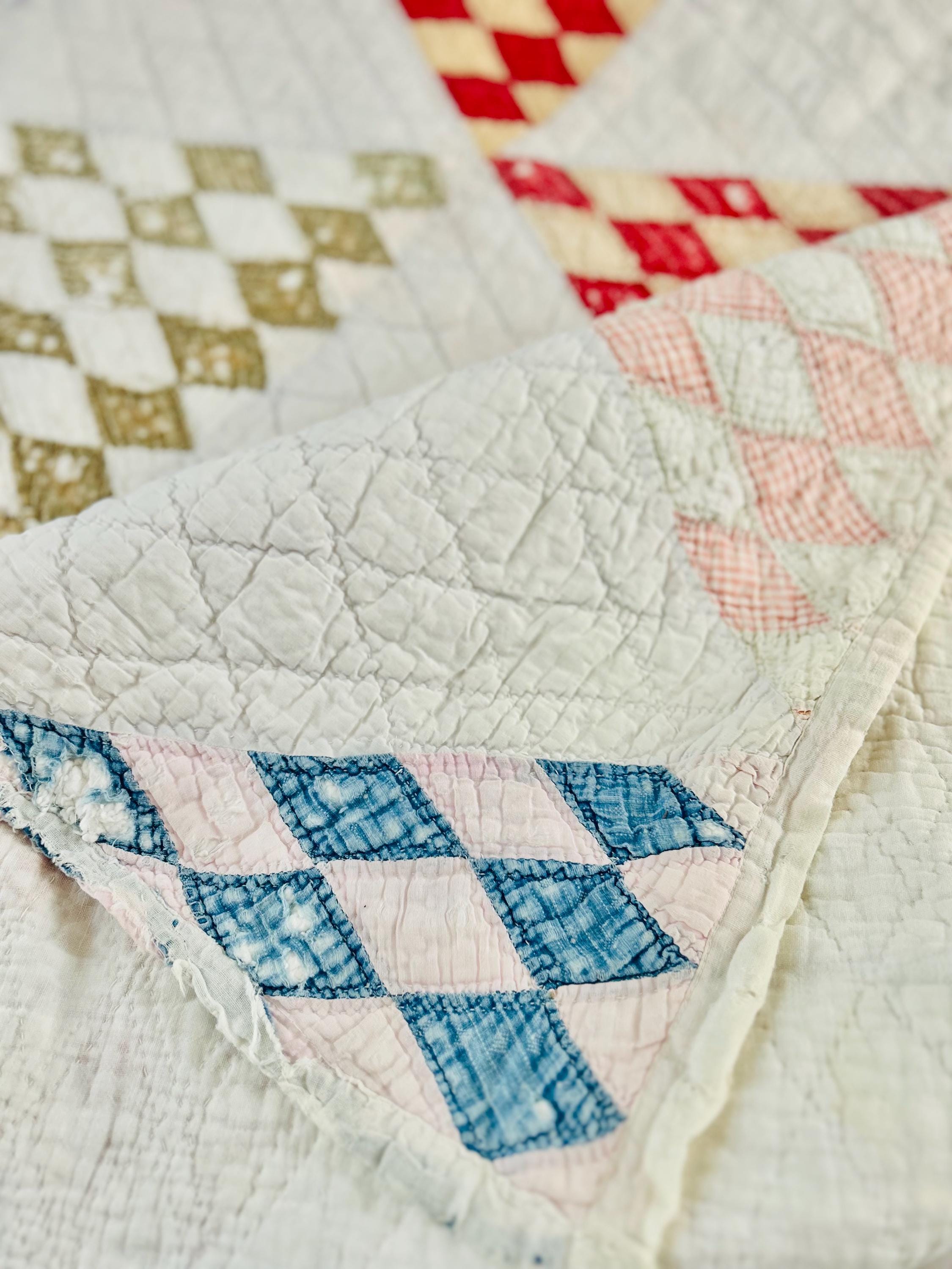 Beautiful Sugar Loaf Quilt, circa 1930s, this quilt is a mix of bold red diamonds andwith soft pastel feedsack prints, all hand-pieced and densely hand-quilted. With these colors and the Sugar Loaf pattern, this is a classic farmhouse decor/Americana decor quilt. It has been quilted in outlines of the diamonds and -- in the white areas -- in an identical diamond pattern.