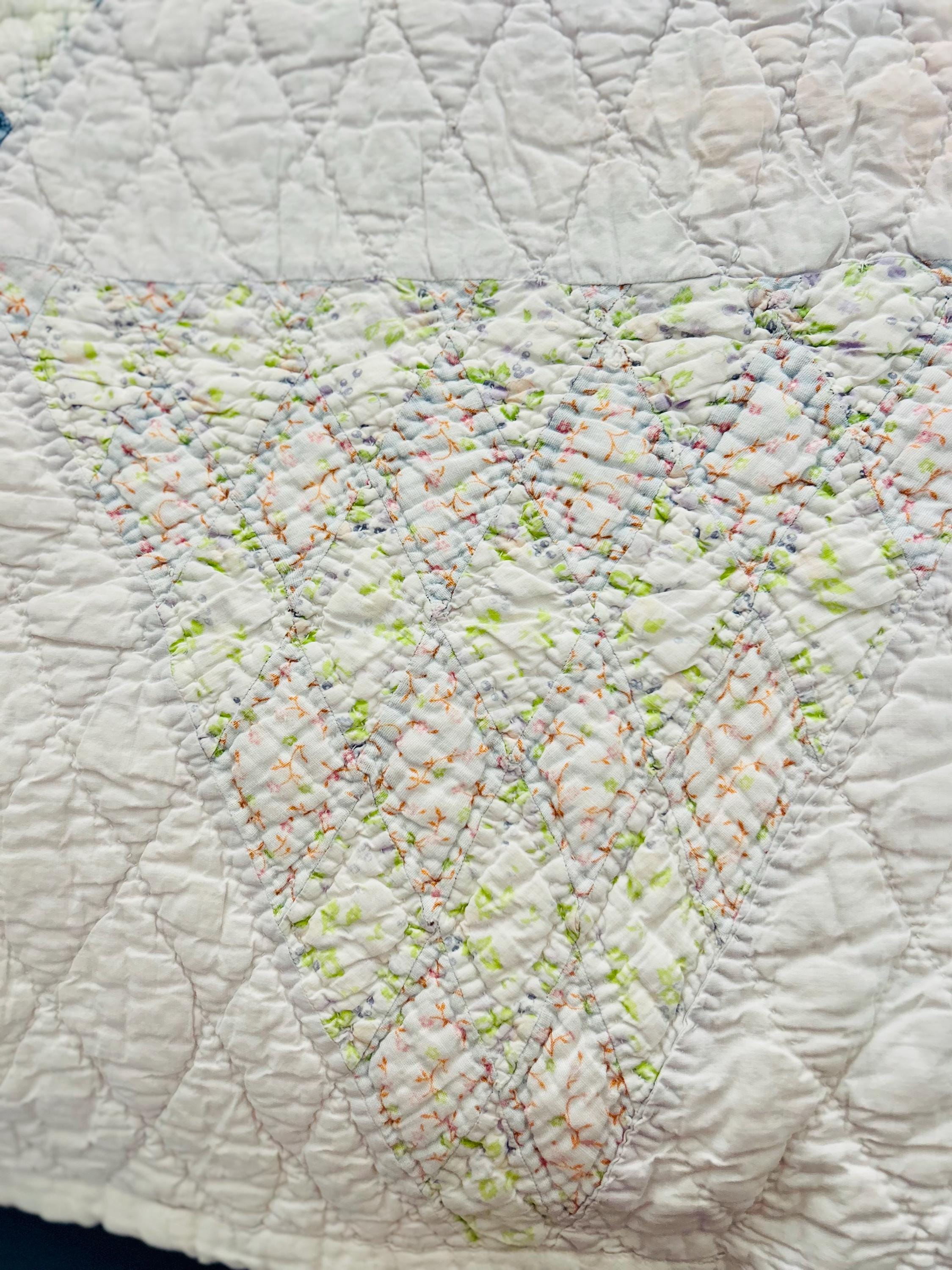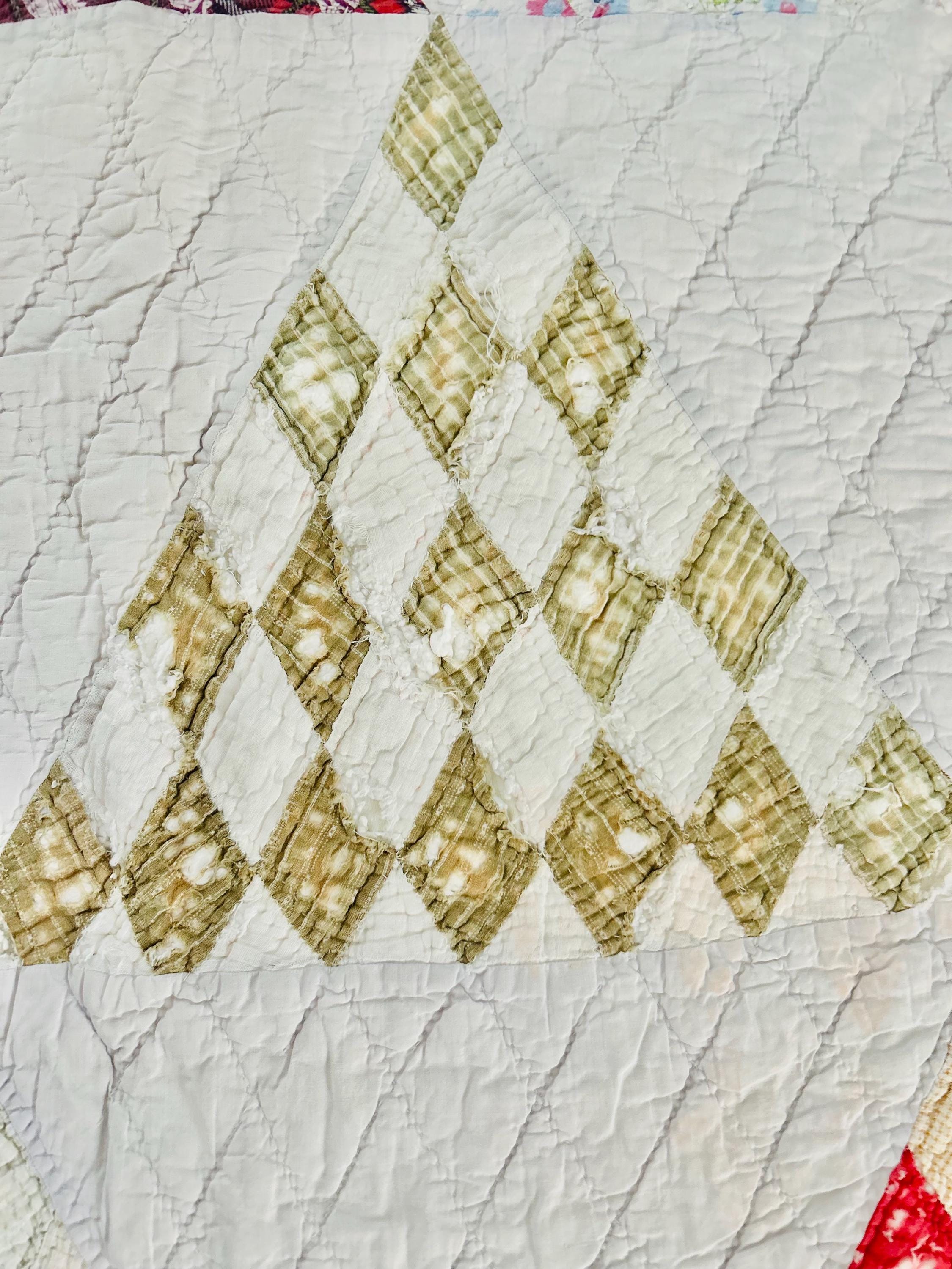 Though most of the quilt is in very good condition, it is listed as a cutter/crafting quilt because of the 26 full and half Sugar Loaf blocks, about 9 have experienced some degree of fabric loss and the binding on two sides has extensive fraying.