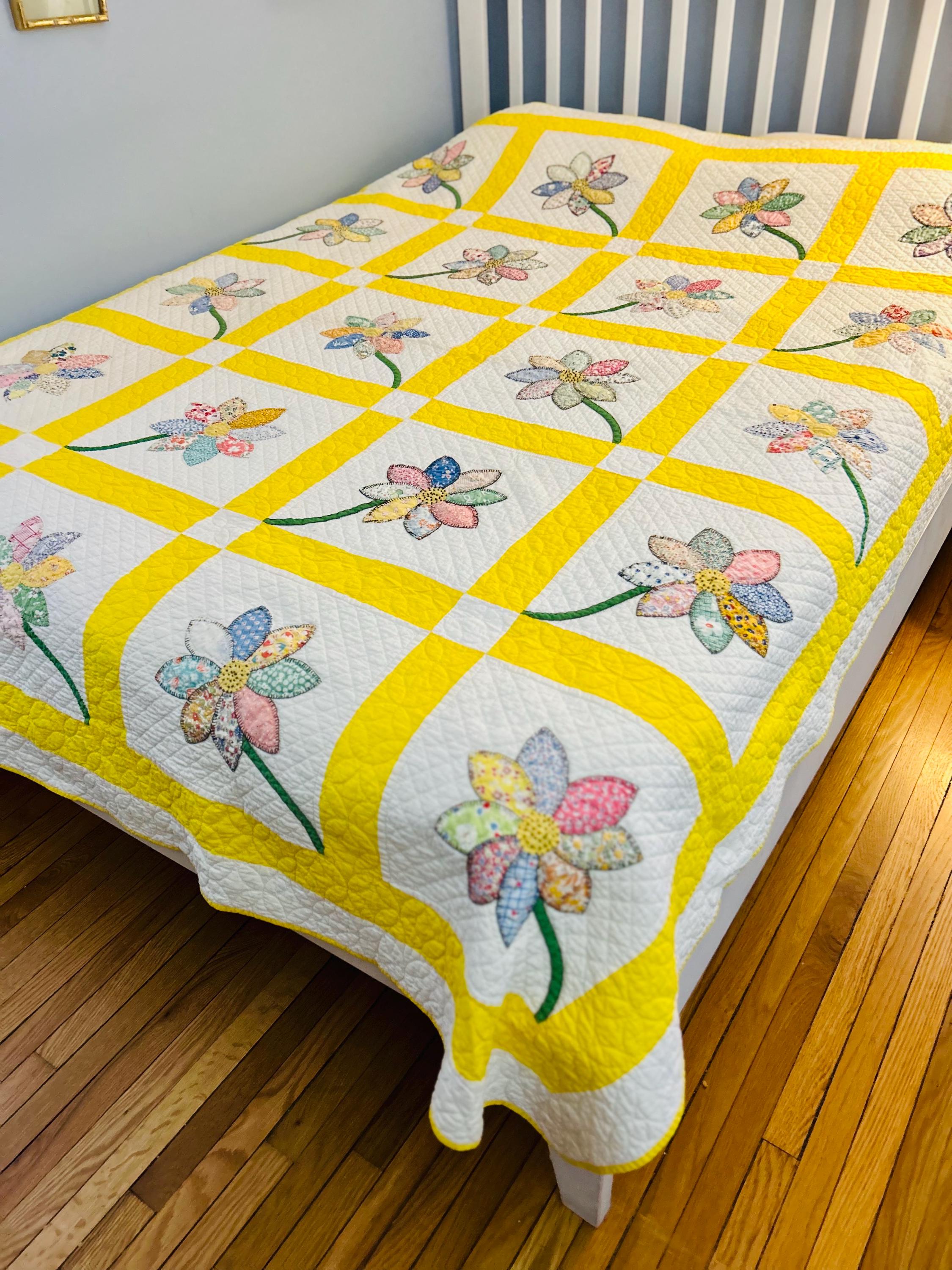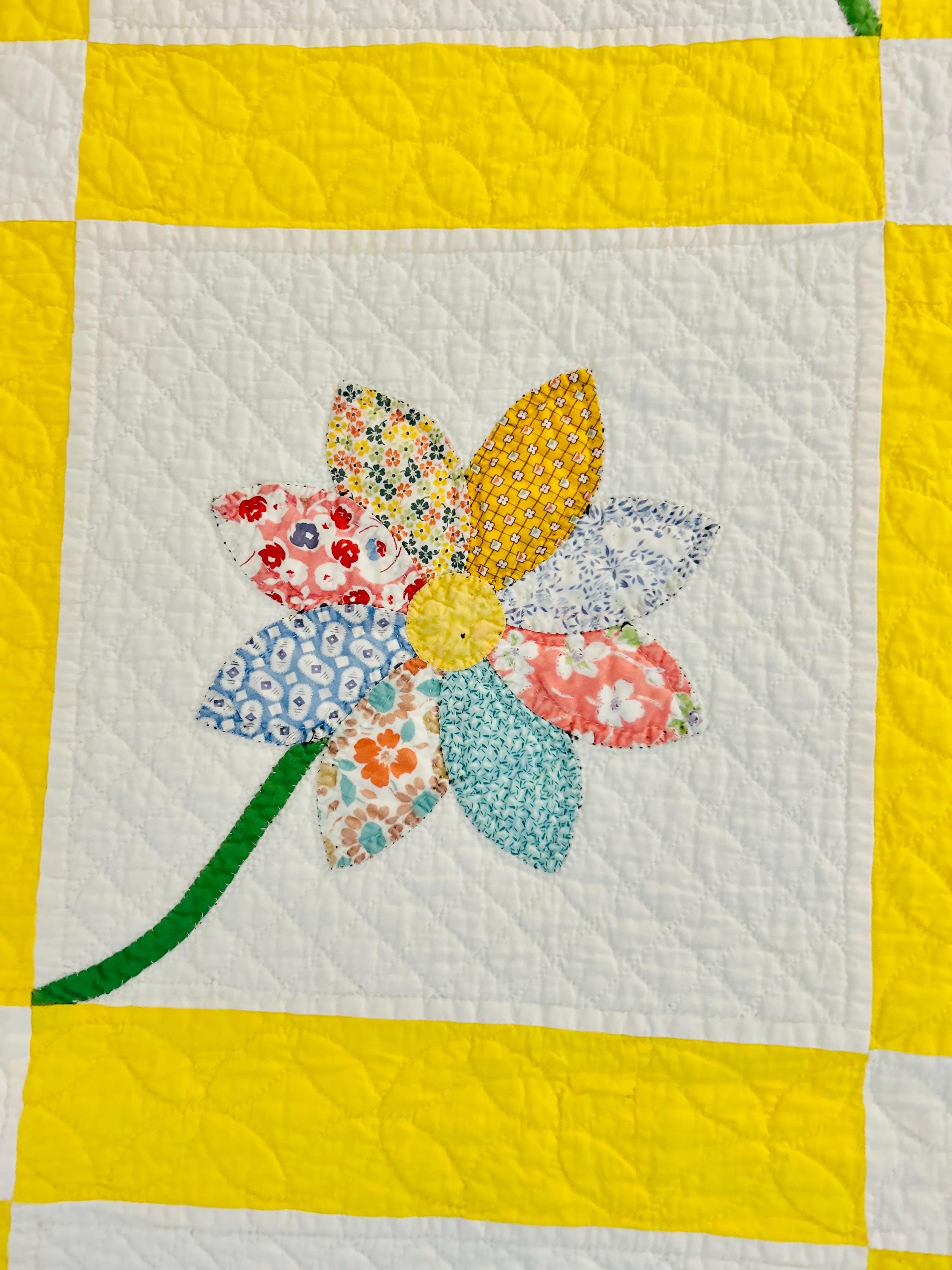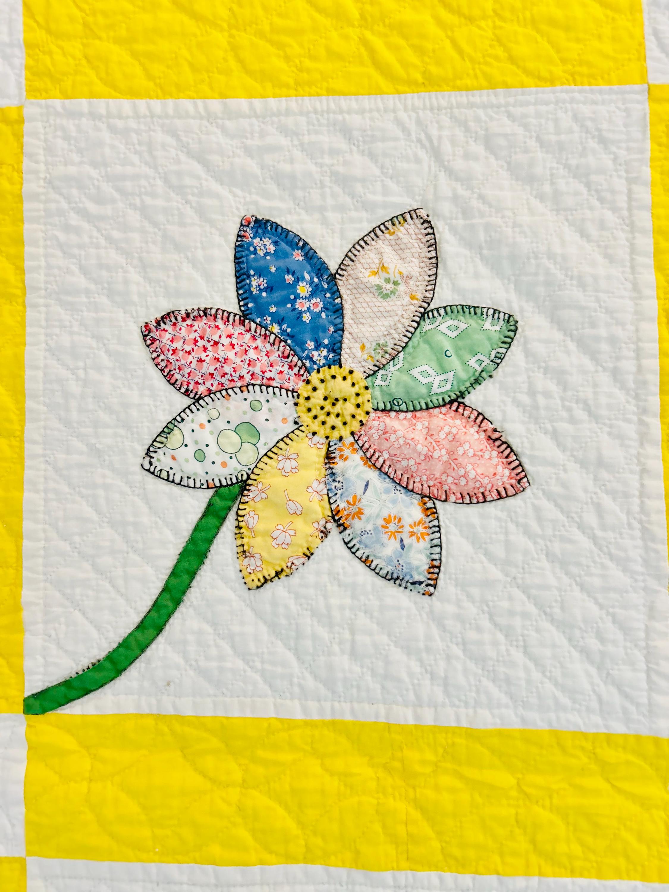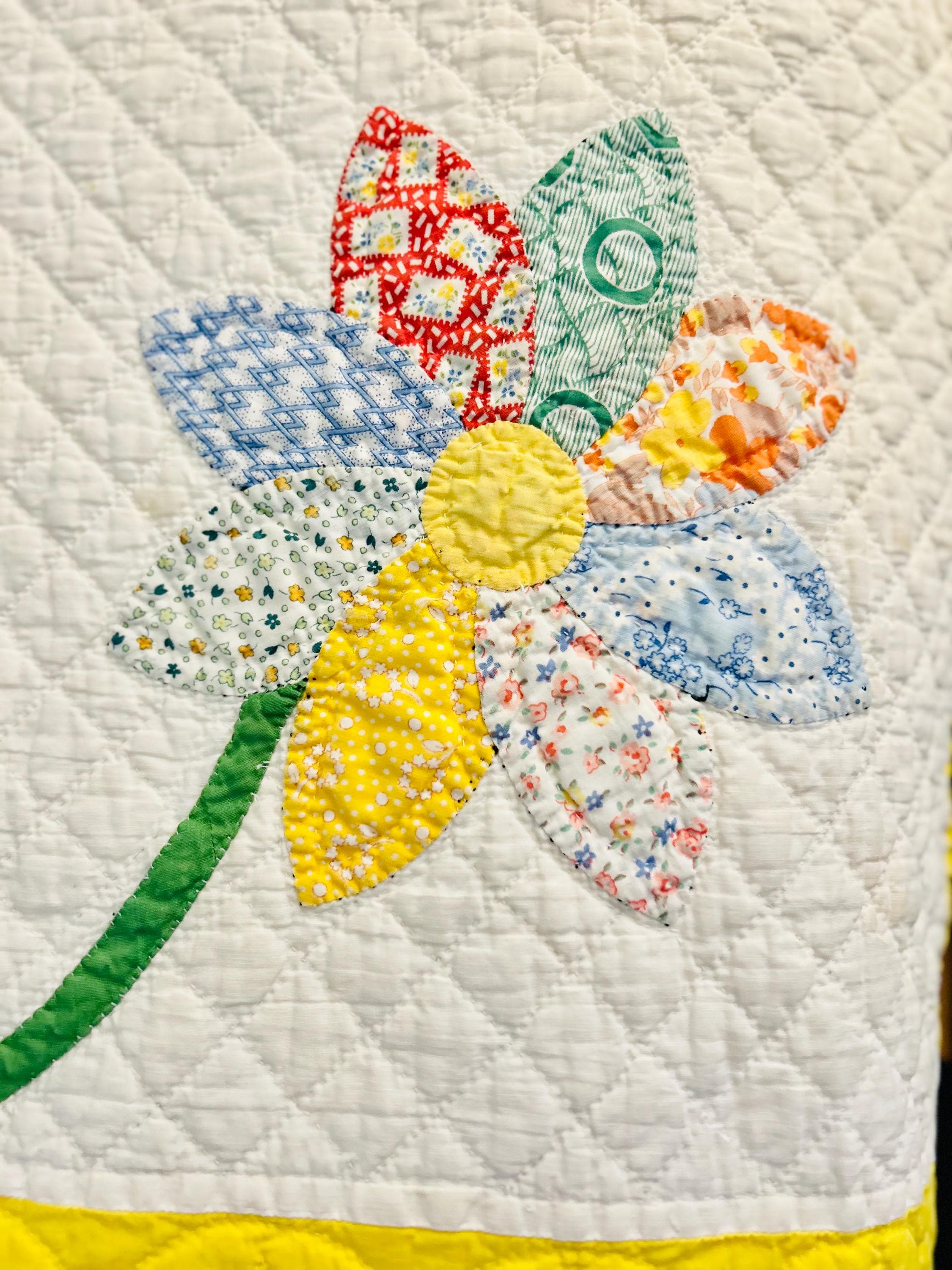 This wonderfully cheerful Scrappy Flower Applique Quilt, circa 1930s, is made from authentic feedsack and calico prints framed by bright yellow sashings. It is entirely hand-quilted in a cross-hatch around the flowers and in a repeating four-petal flower pattern in the sashings and along the four-sided border.