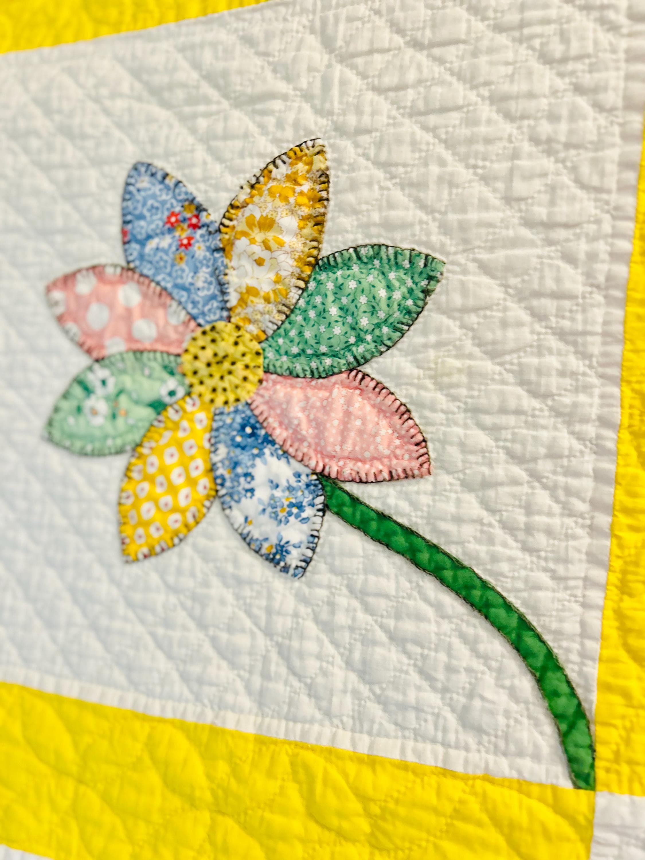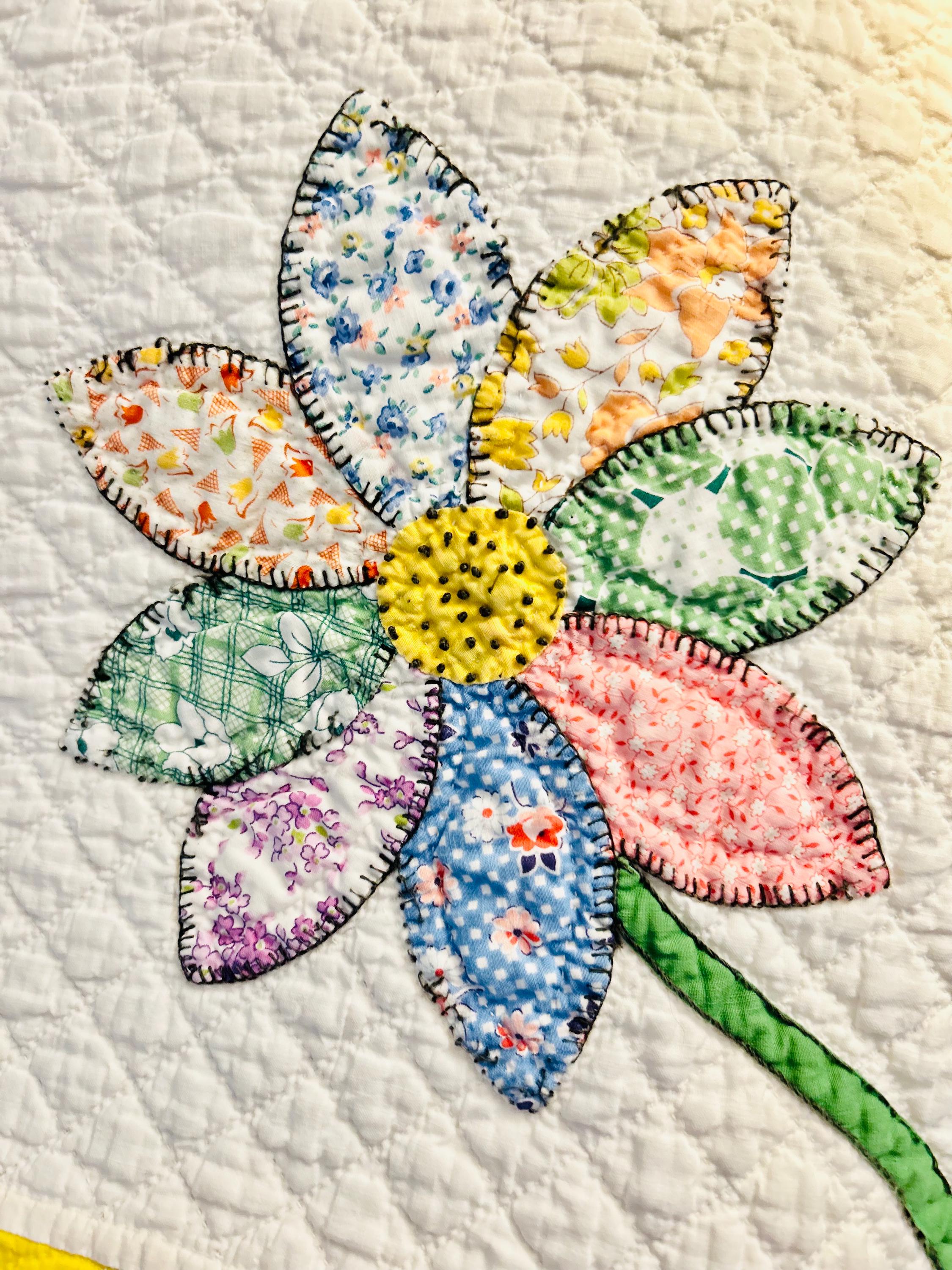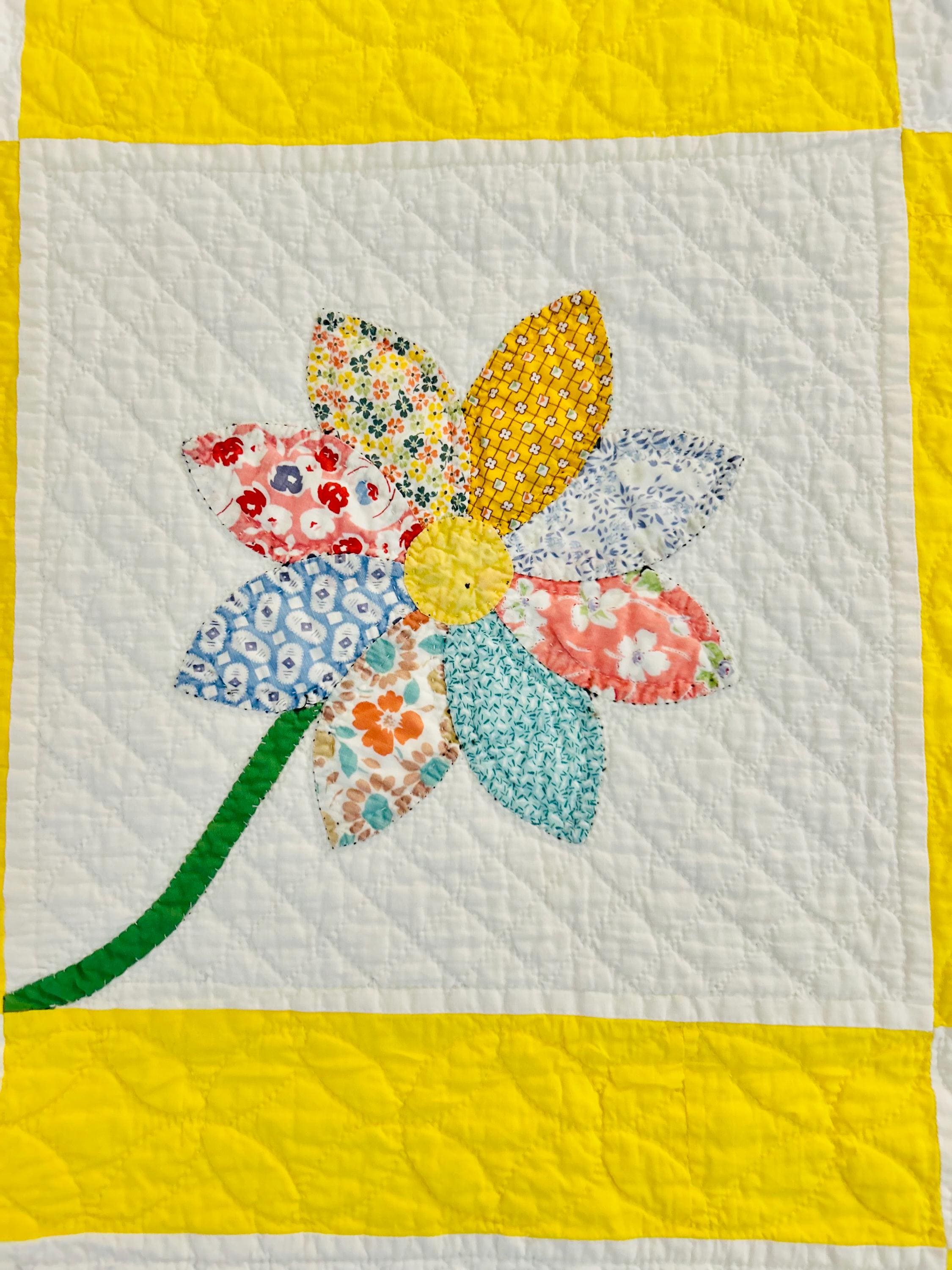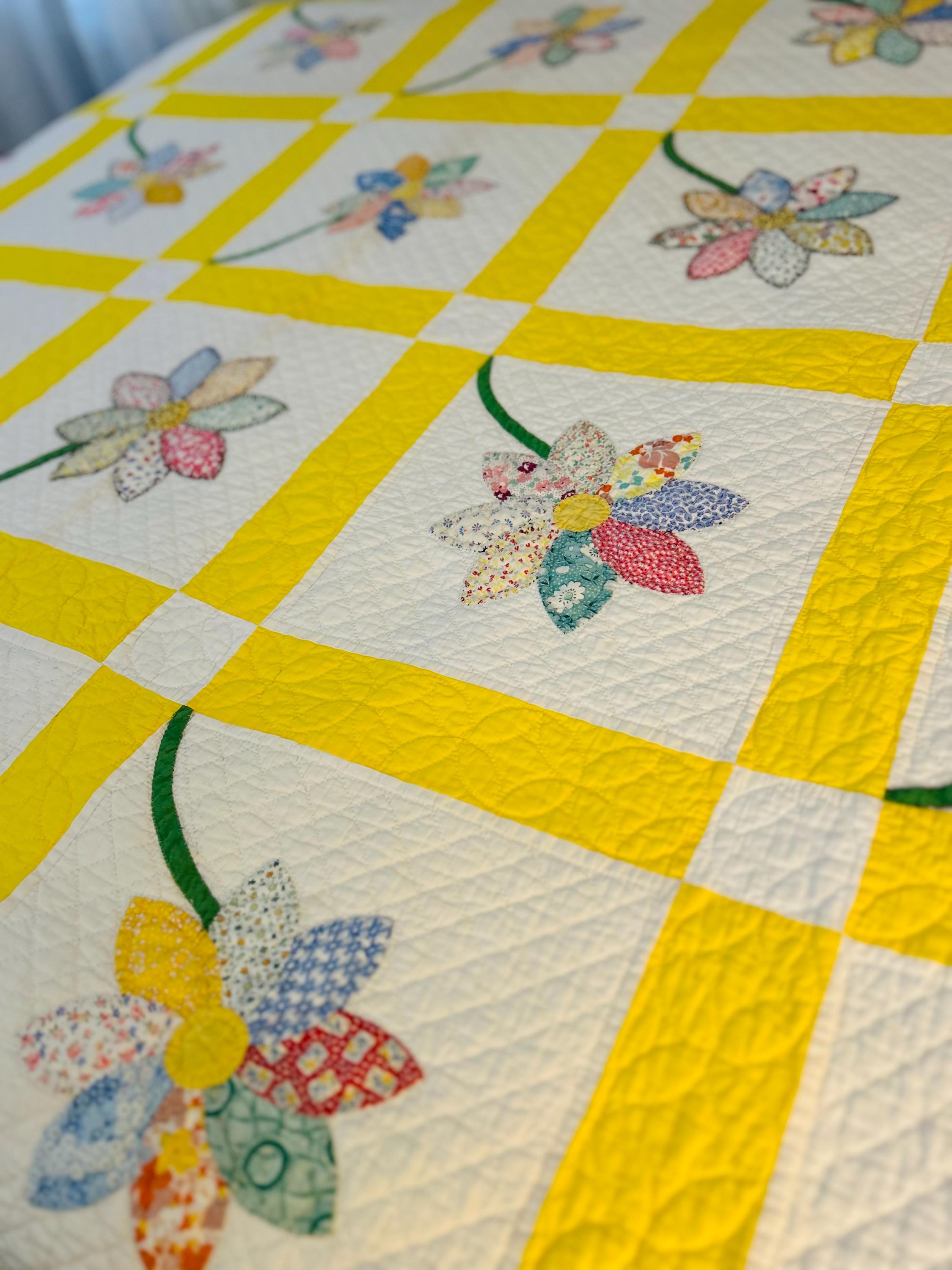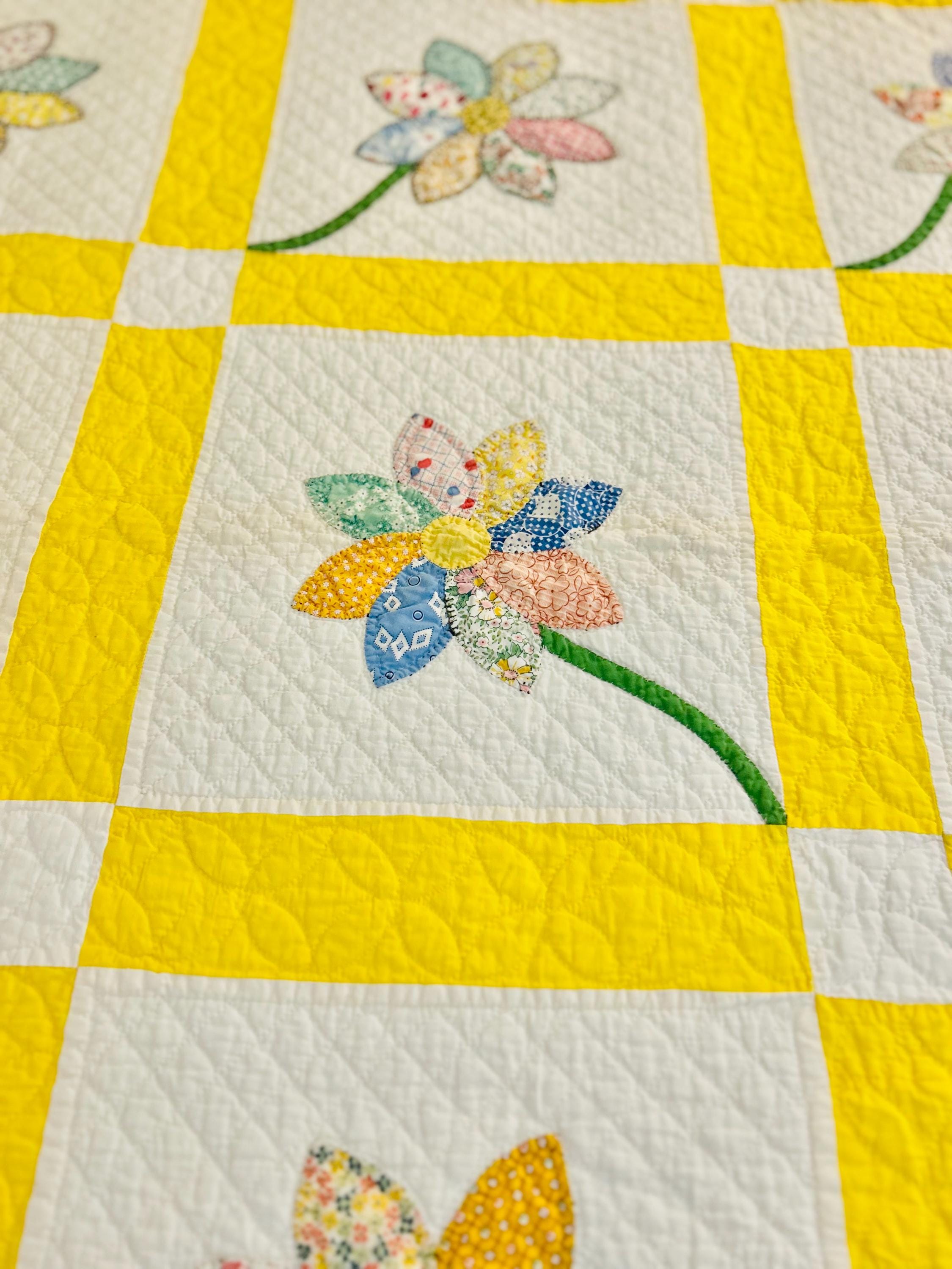 This wonderfully cheerful Scrappy Flower Applique Quilt, circa 1930s, is made from authentic feedsack and calico prints framed by bright yellow sashings. It is entirely hand-quilted in a cross-hatch around the flowers and in a repeating four-petal flower pattern in the sashings and along the four-sided border.