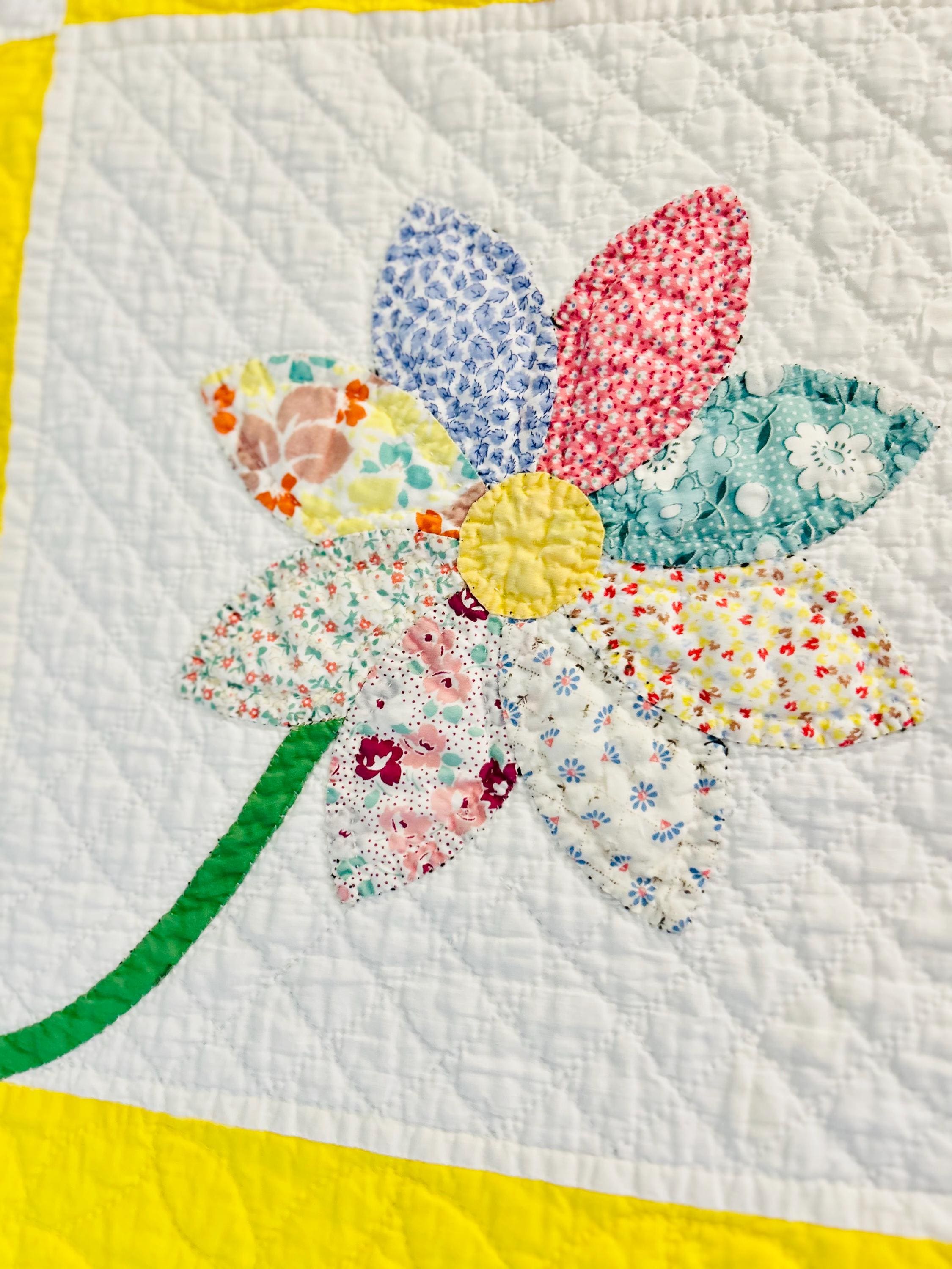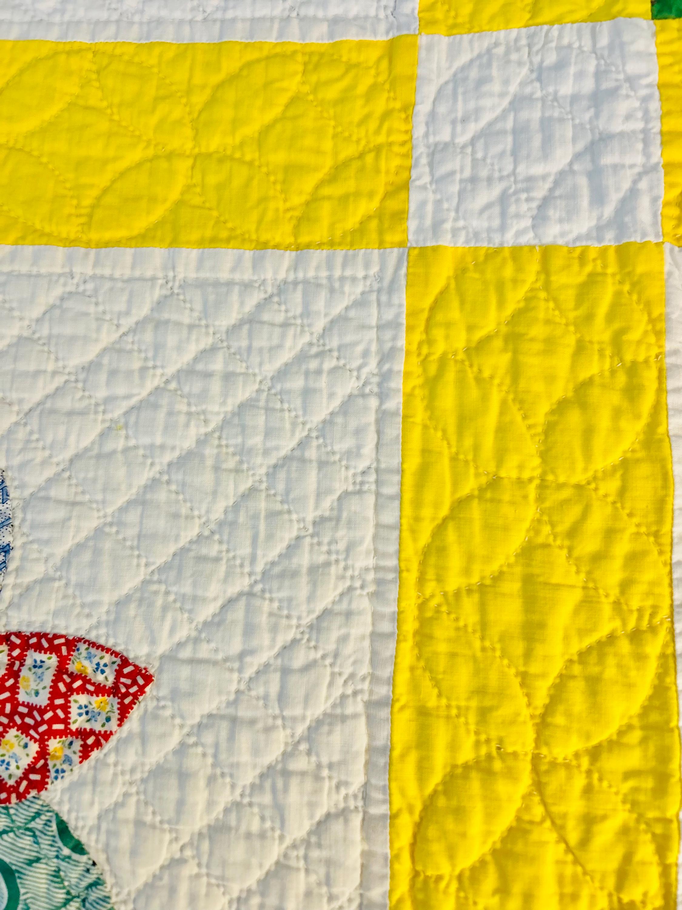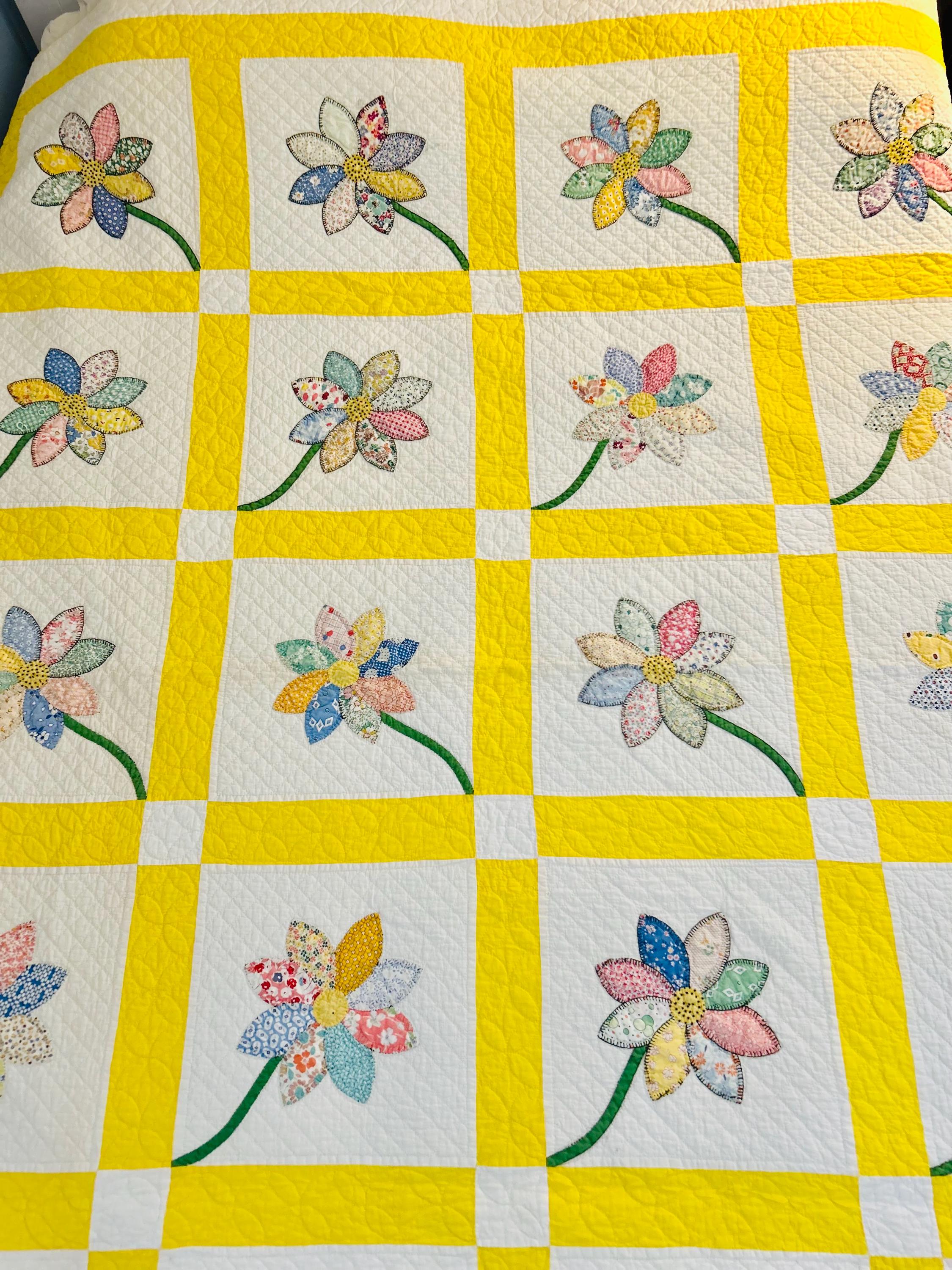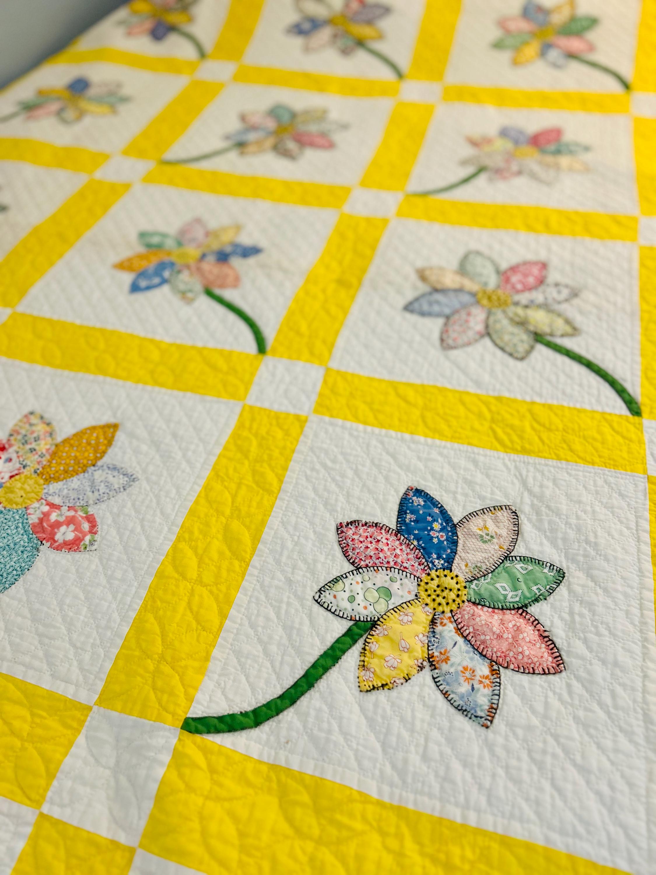 This wonderfully cheerful Scrappy Flower Applique Quilt, circa 1930s, is made from authentic feedsack and calico prints framed by bright yellow sashings. It is entirely hand-quilted in a cross-hatch around the flowers and in a repeating four-petal flower pattern in the sashings and along the four-sided border.