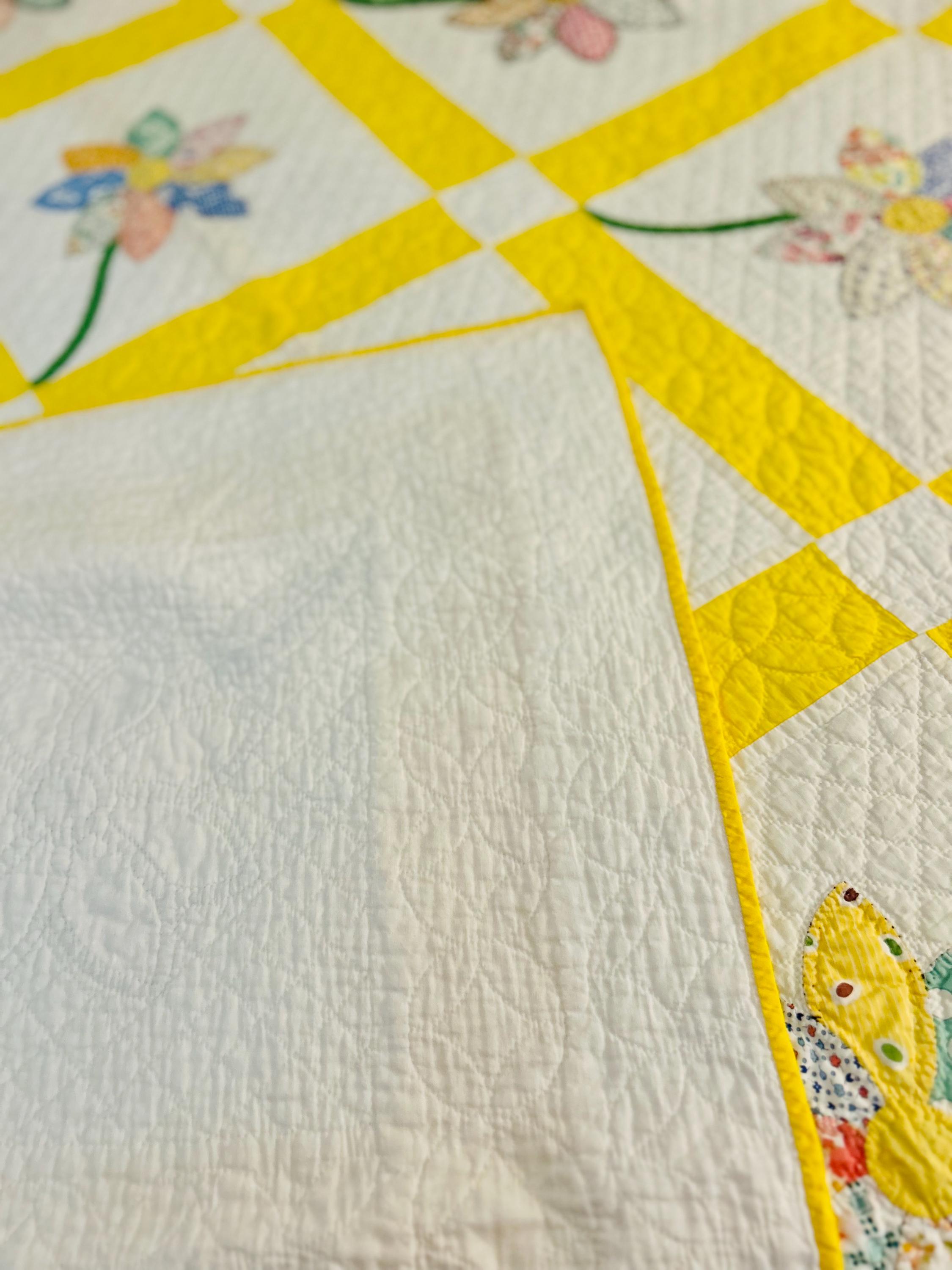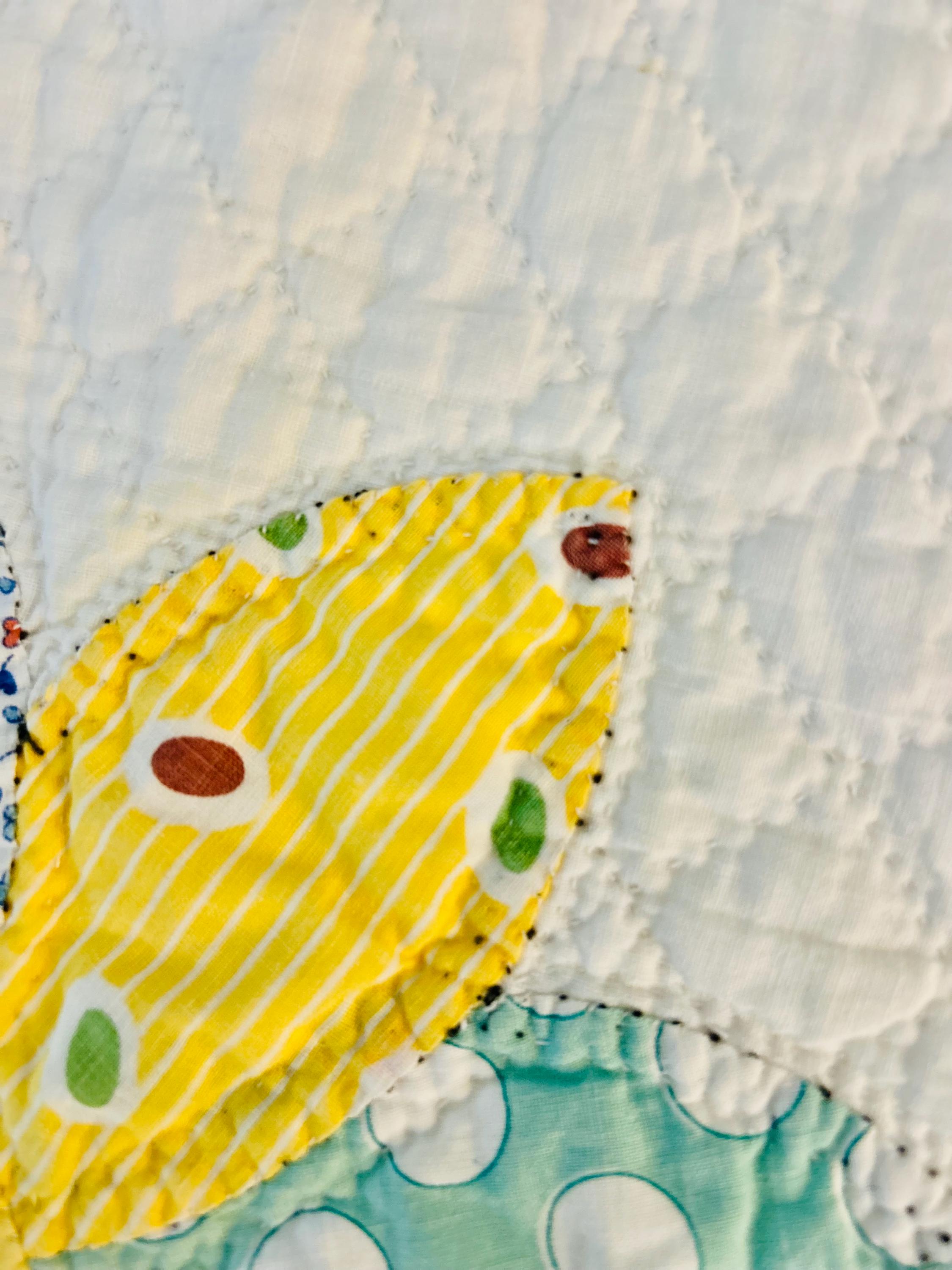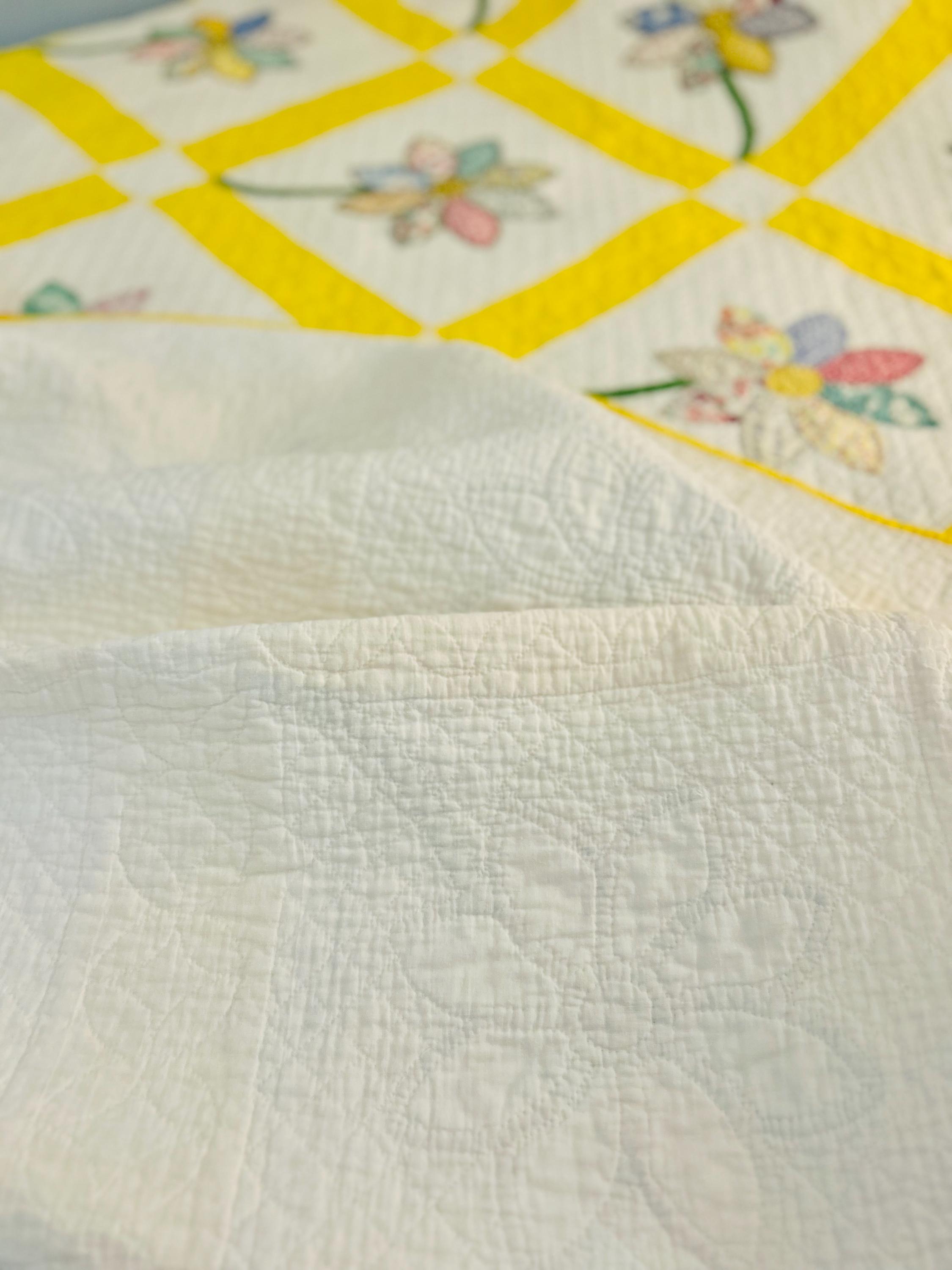 The back is bright white cotton while the binding is yellow cotton that has been machine-stitched to the front and hand-stitched to the back. The cotton batting is very lightweight.