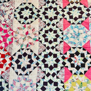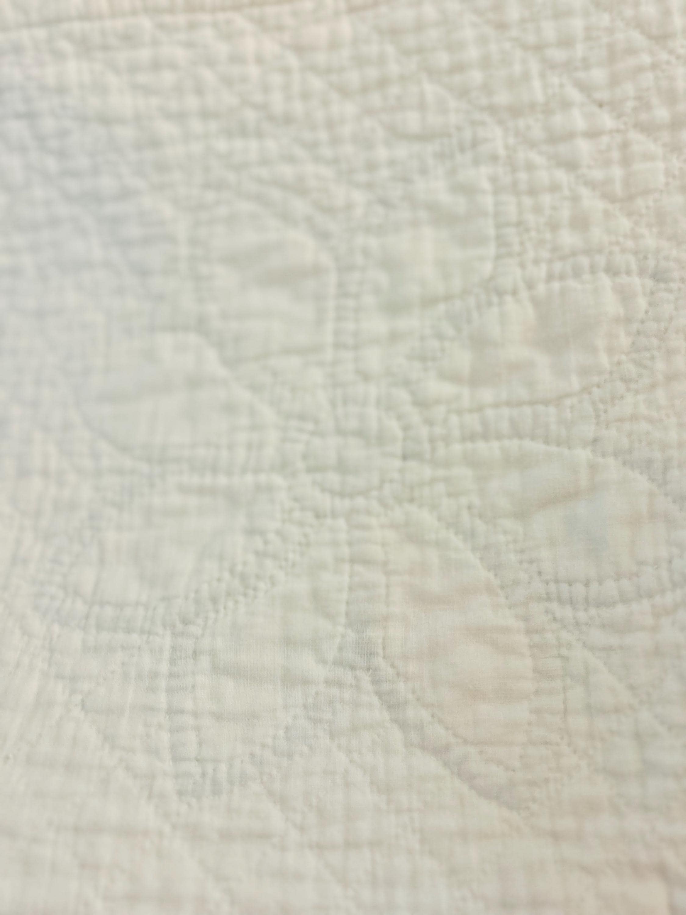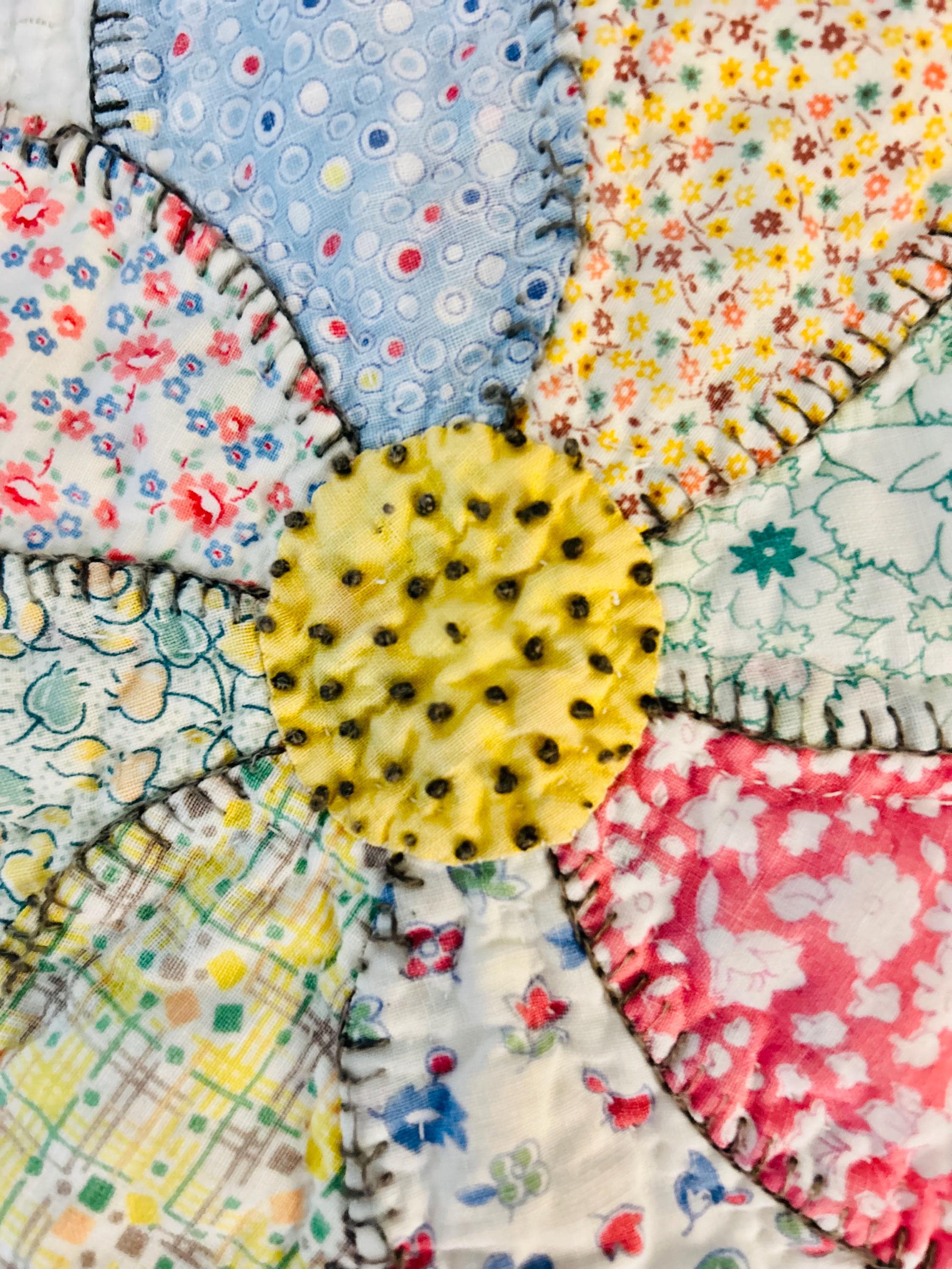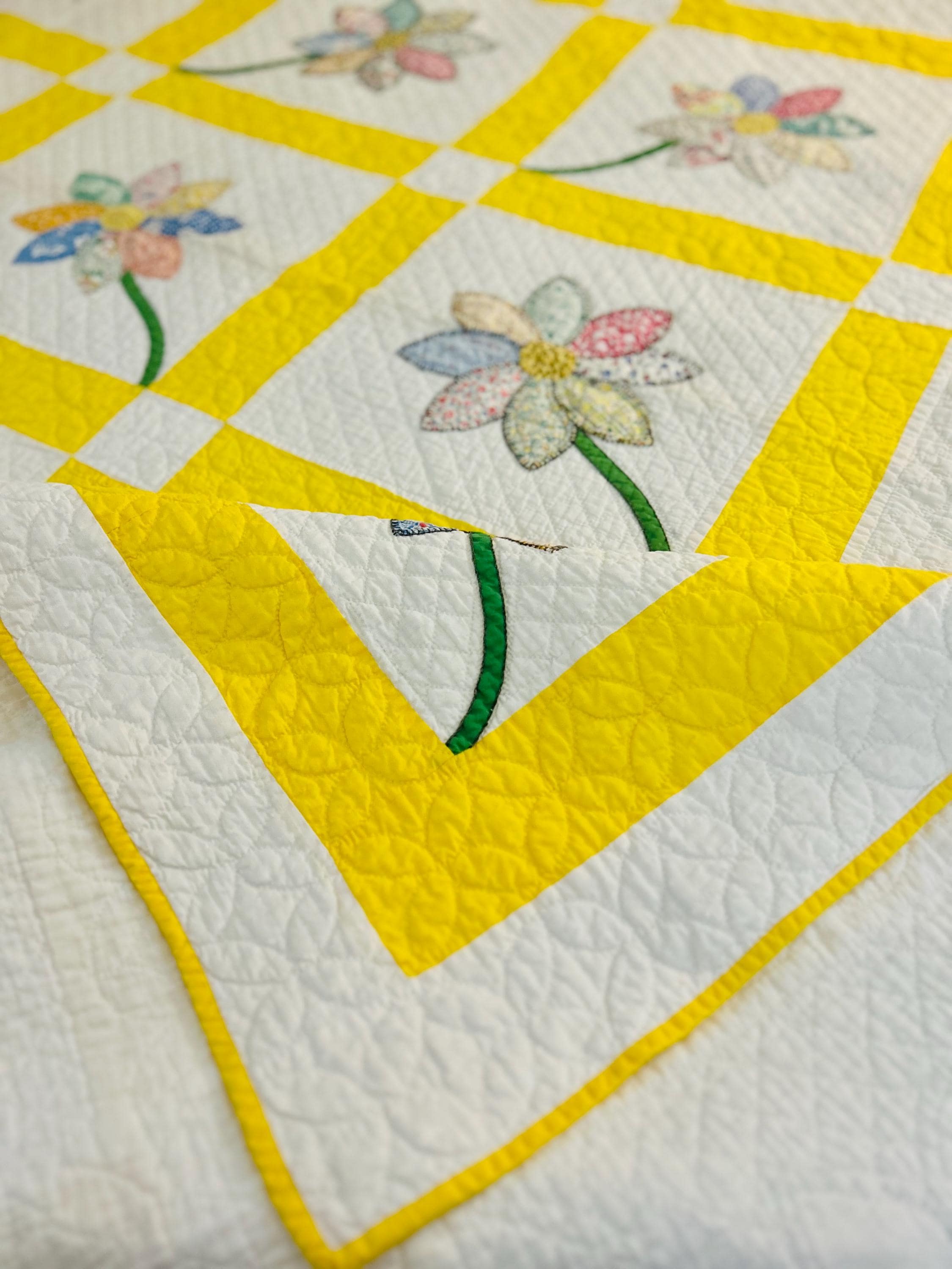 The back is bright white cotton while the binding is yellow cotton that has been machine-stitched to the front and hand-stitched to the back. The cotton batting is very lightweight.