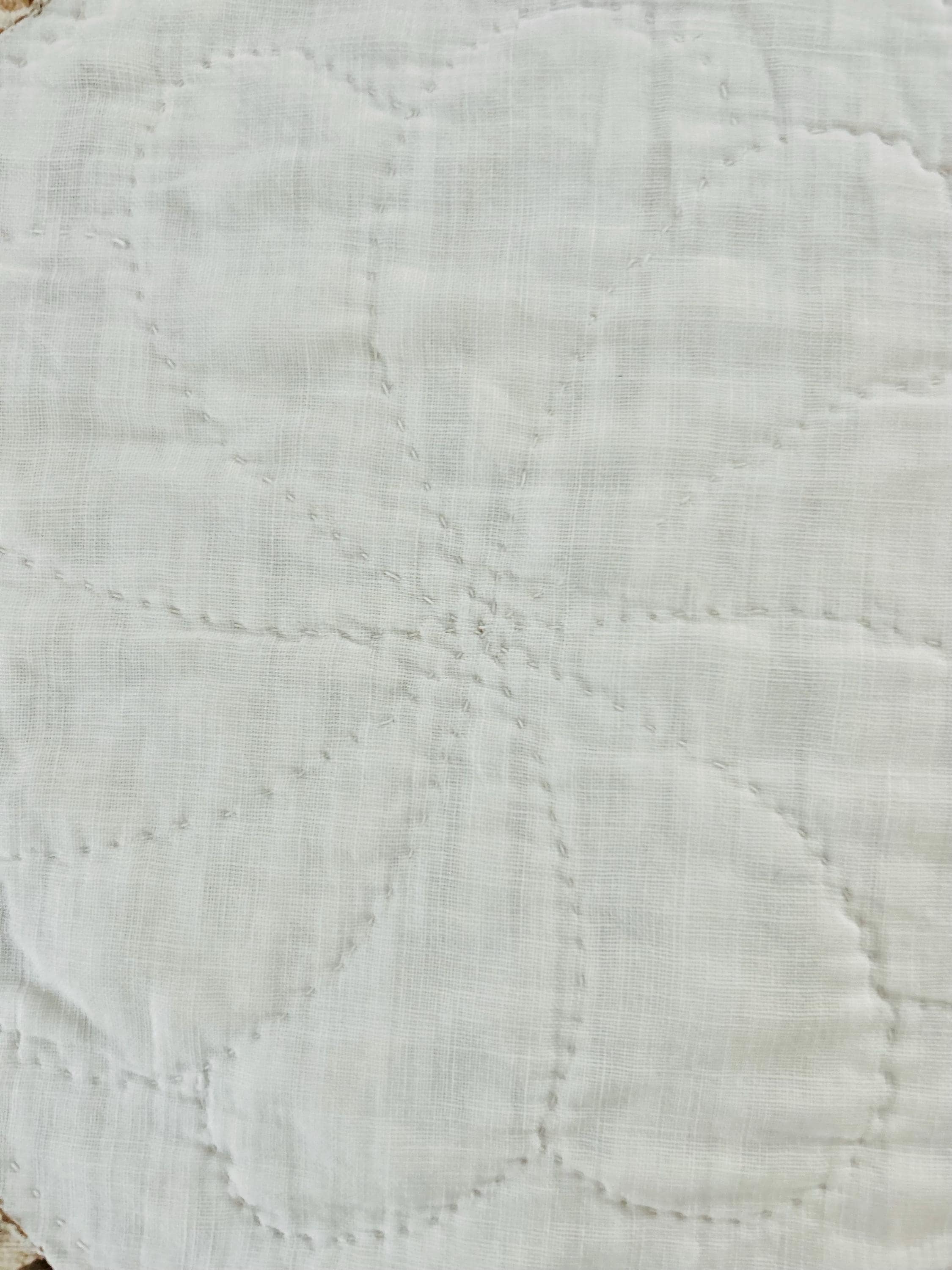 The back is white cotton as is the binding that has been machine stitched to both sides. The cotton batting is very lightweight.