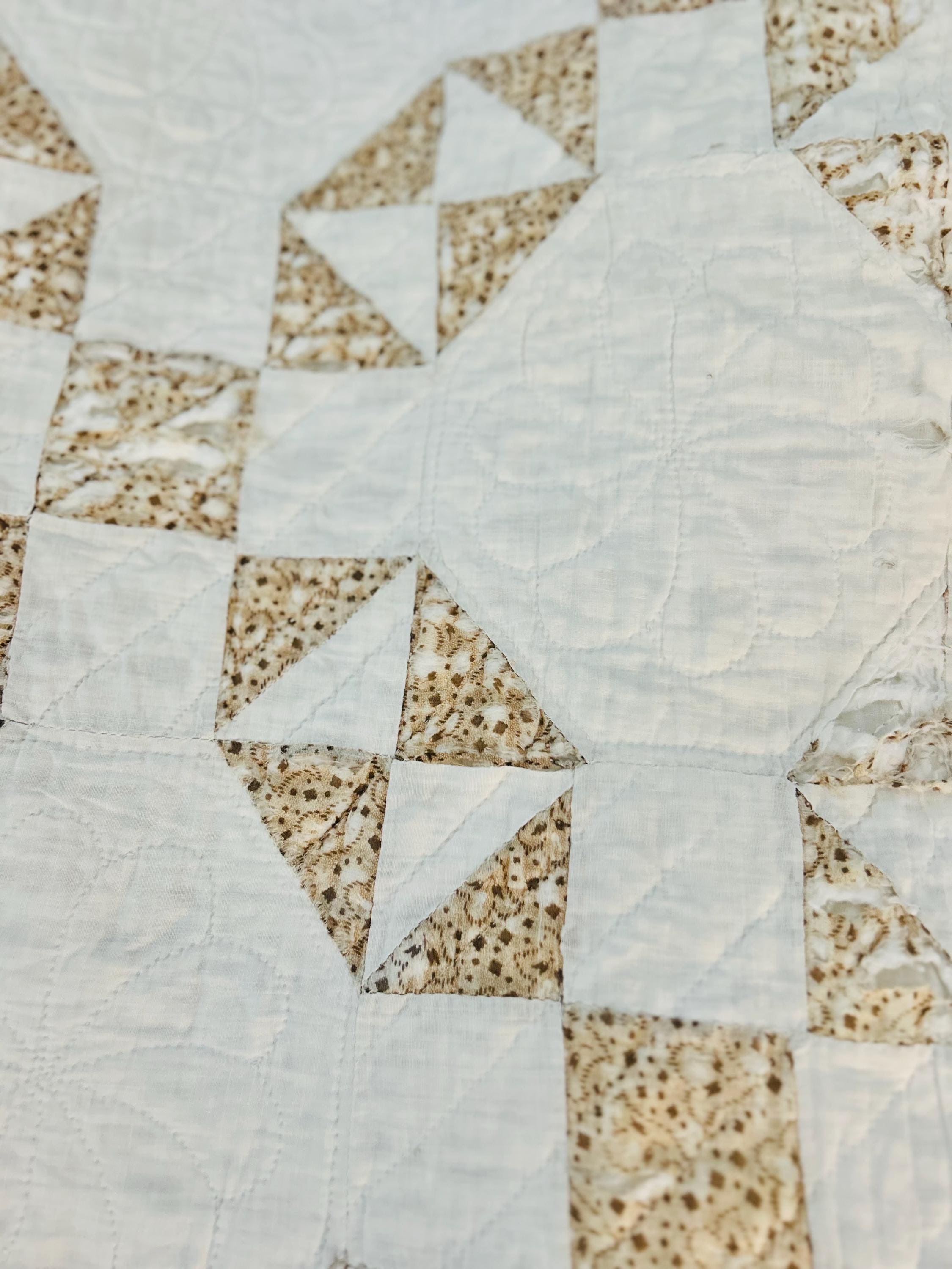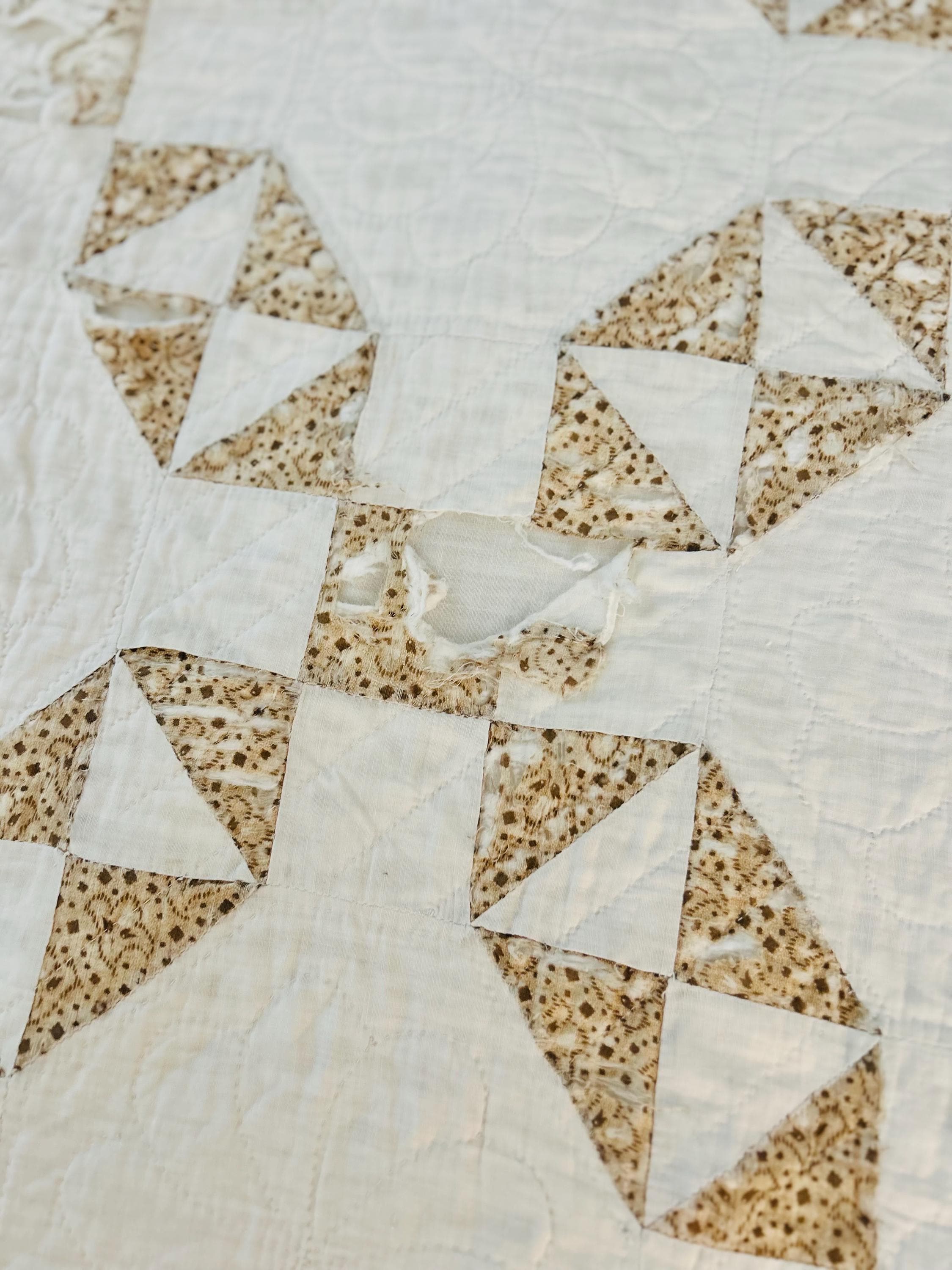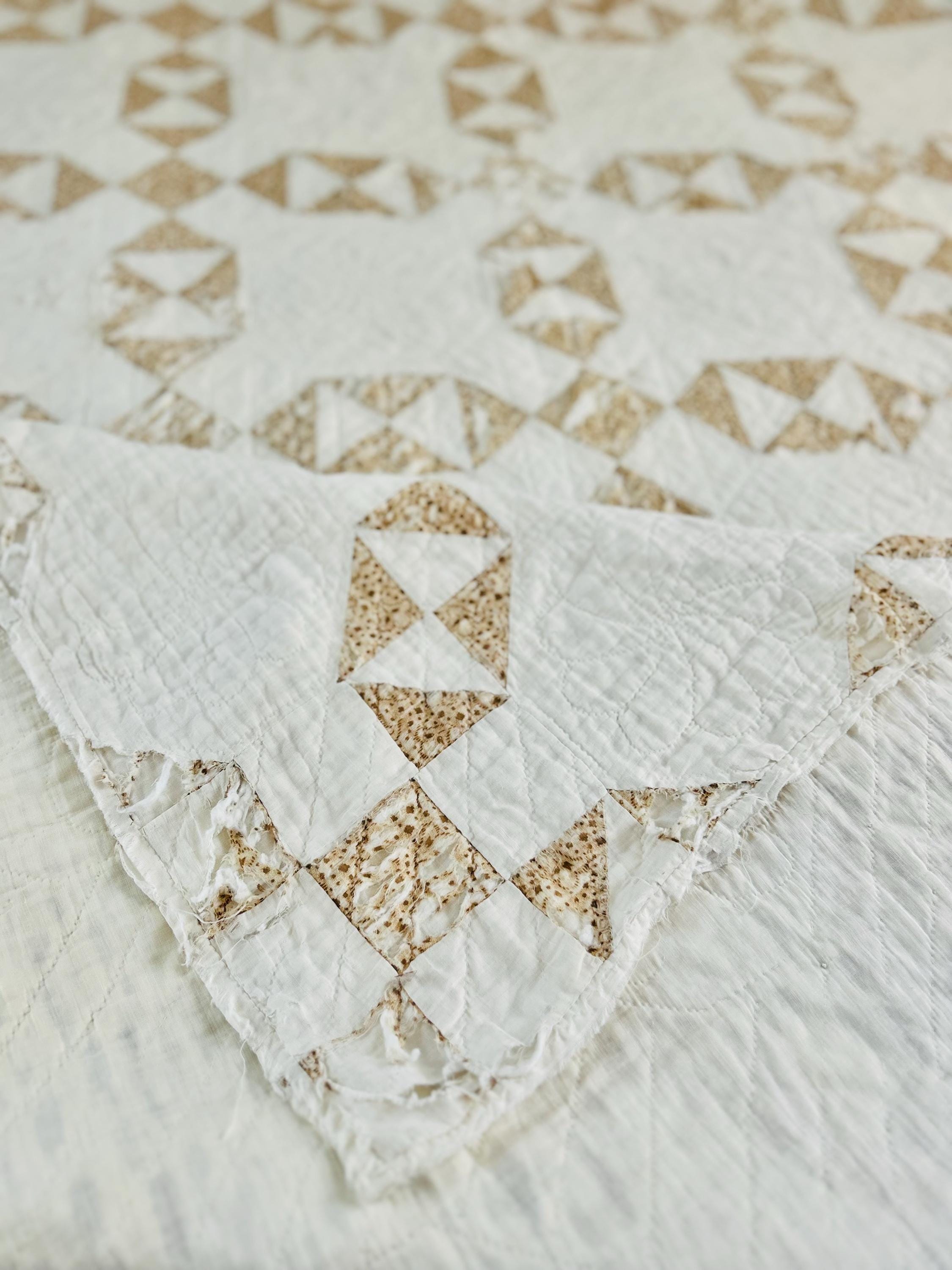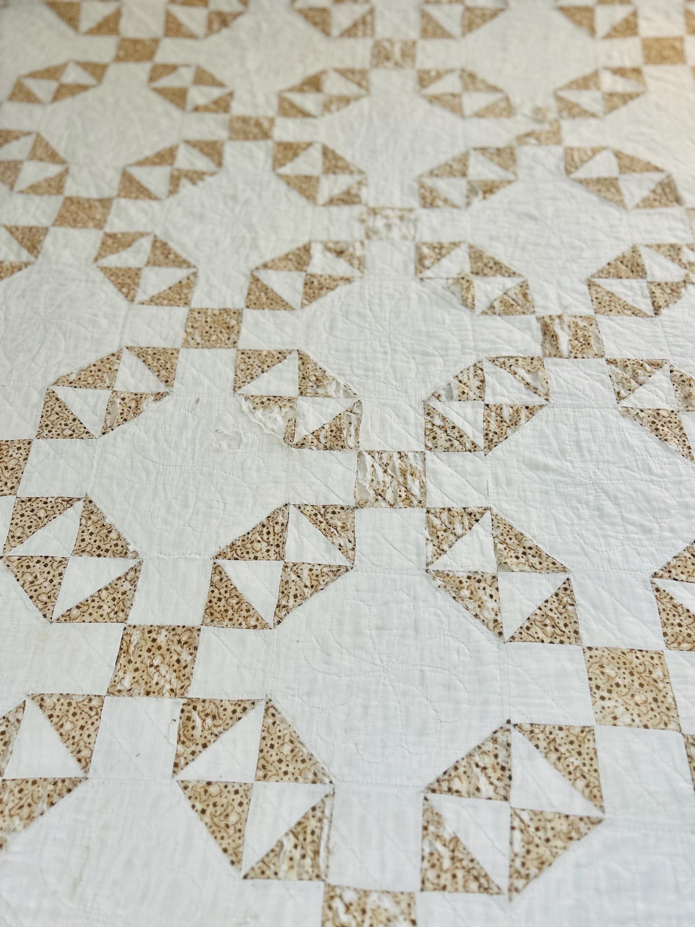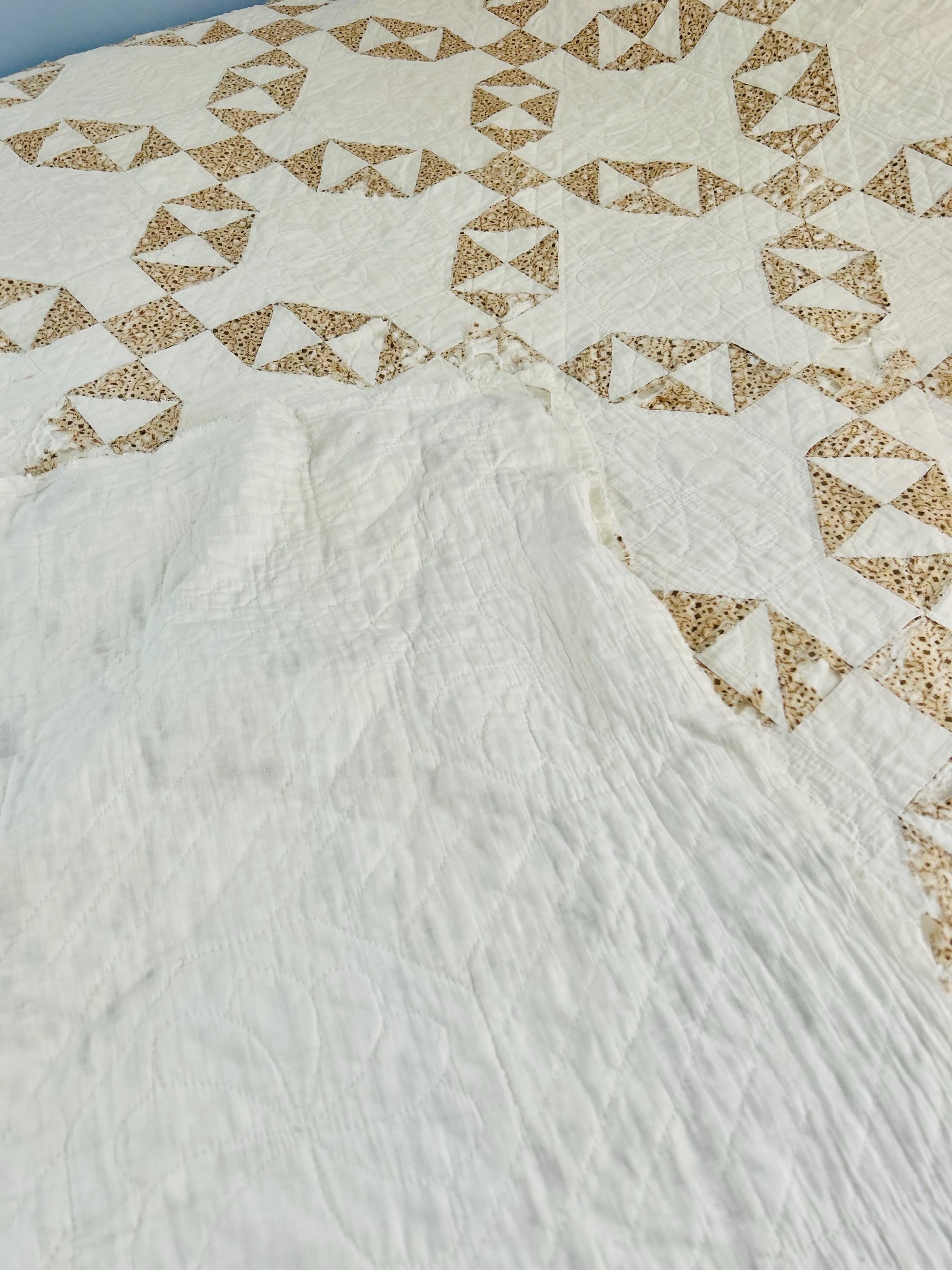 Unfortunately this quilt is in poor or cutter condition due to extensive fabric loss on many of the tan print blocks and a very frayed binding.