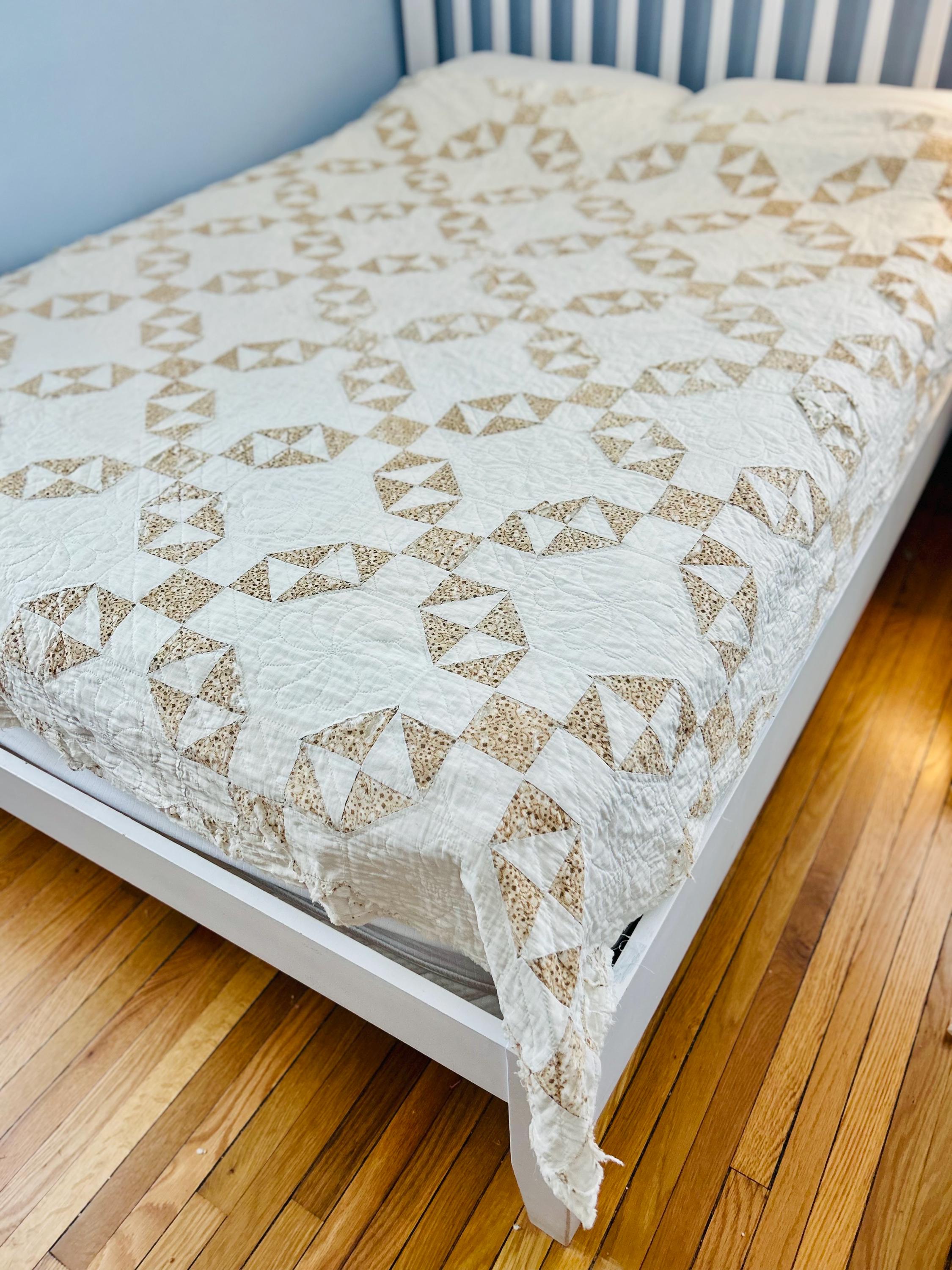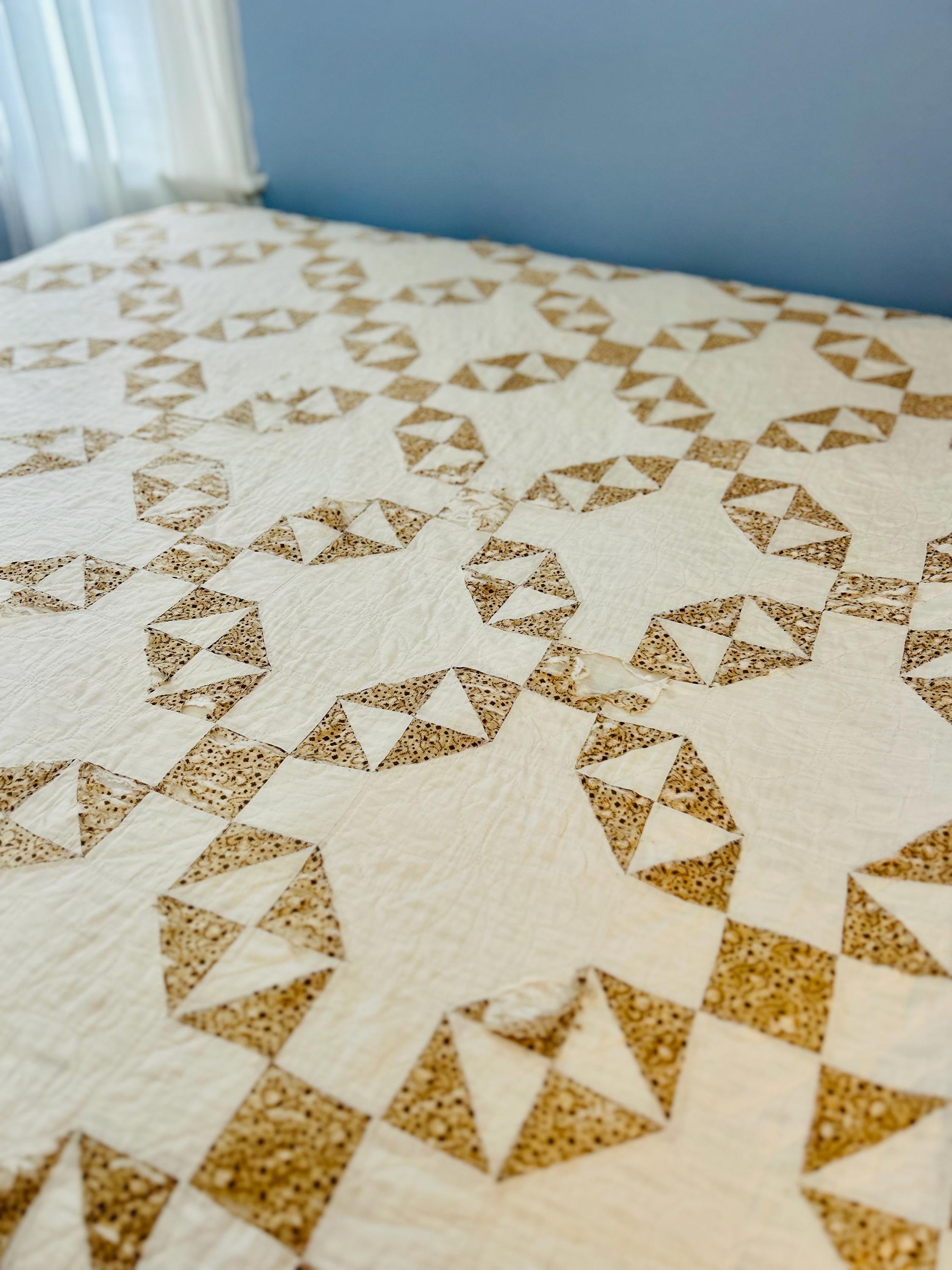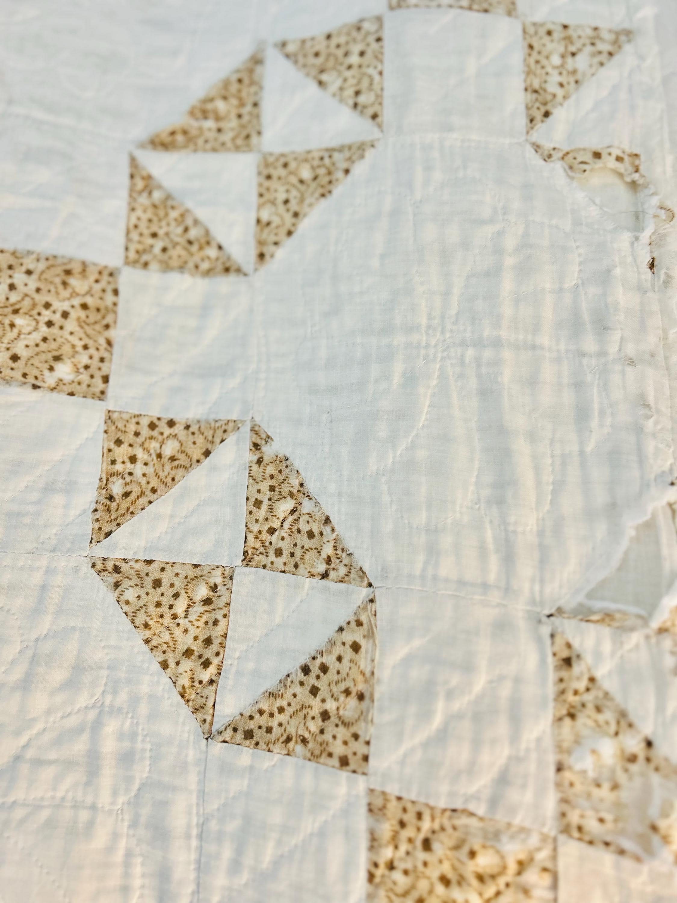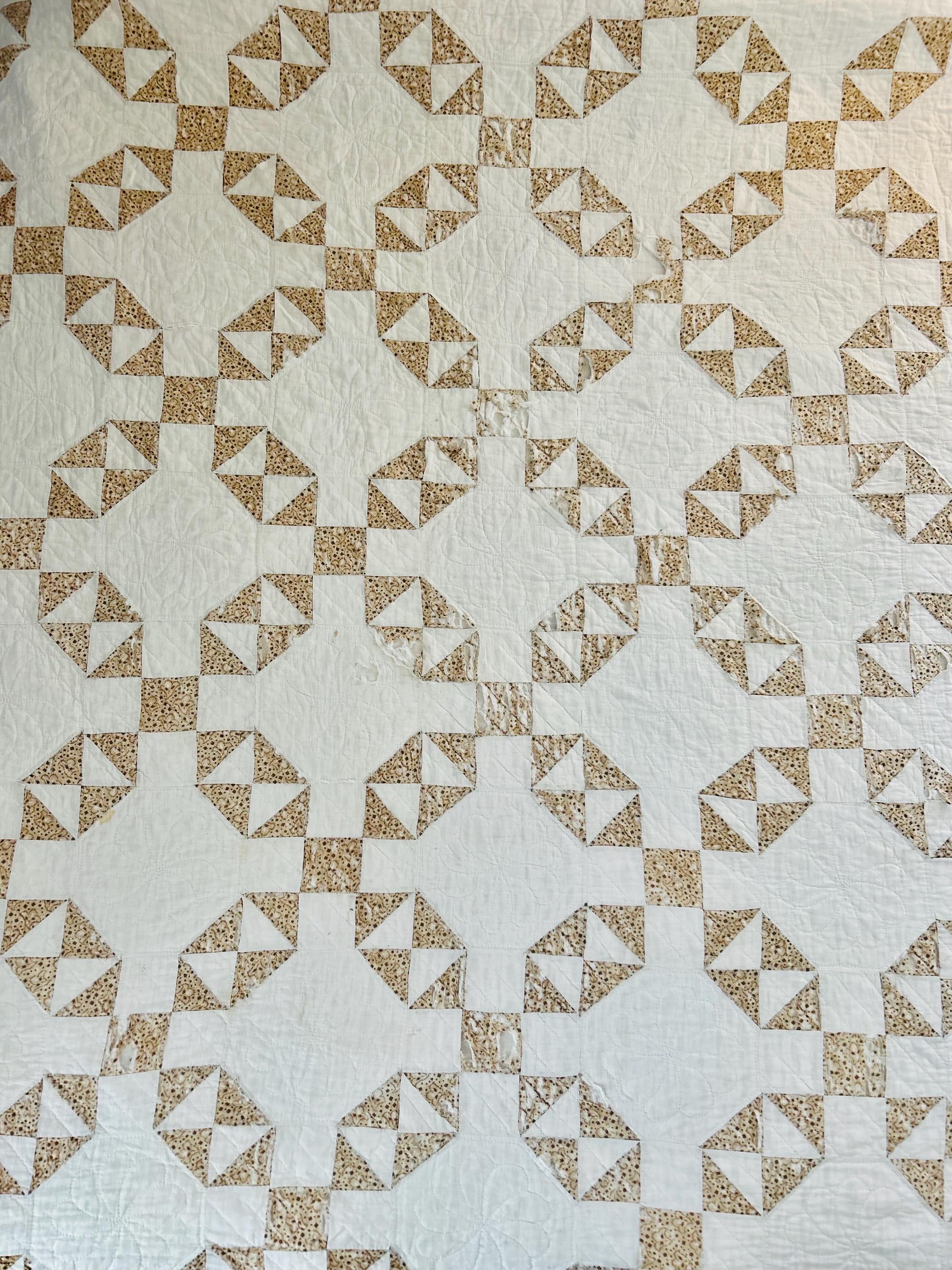 Unfortunately this quilt is in poor or cutter condition due to extensive fabric loss on many of the tan print blocks and a very frayed binding.