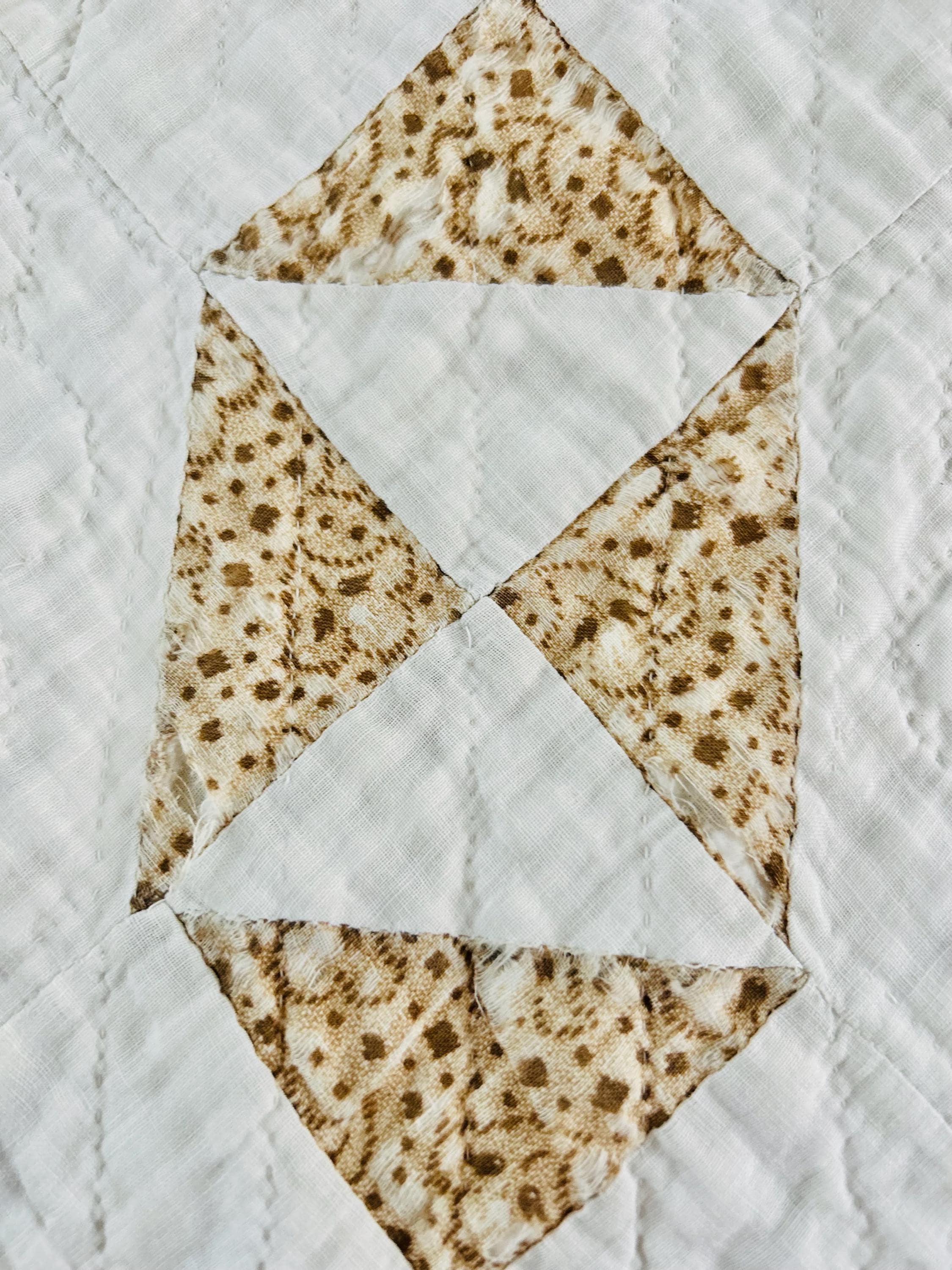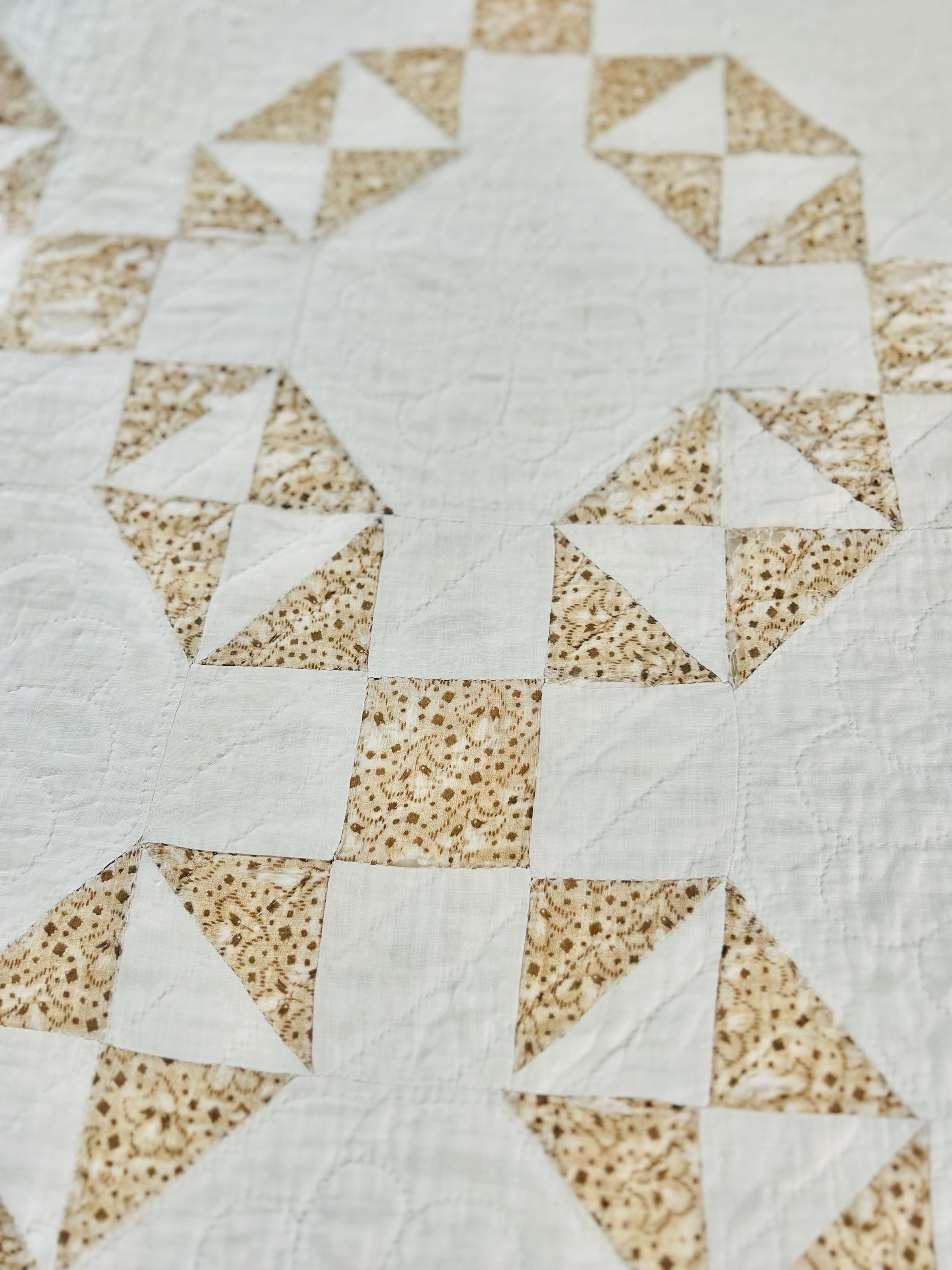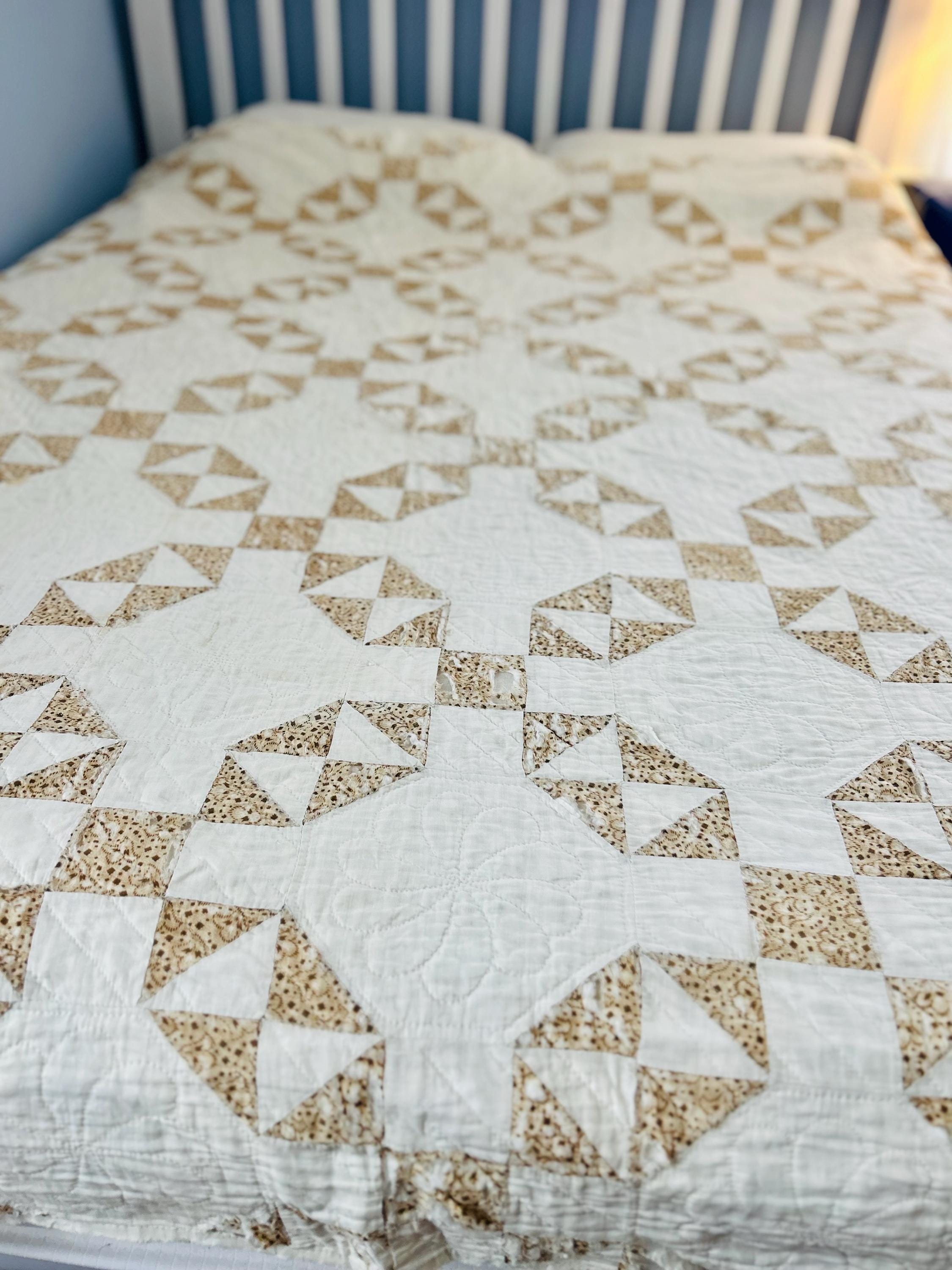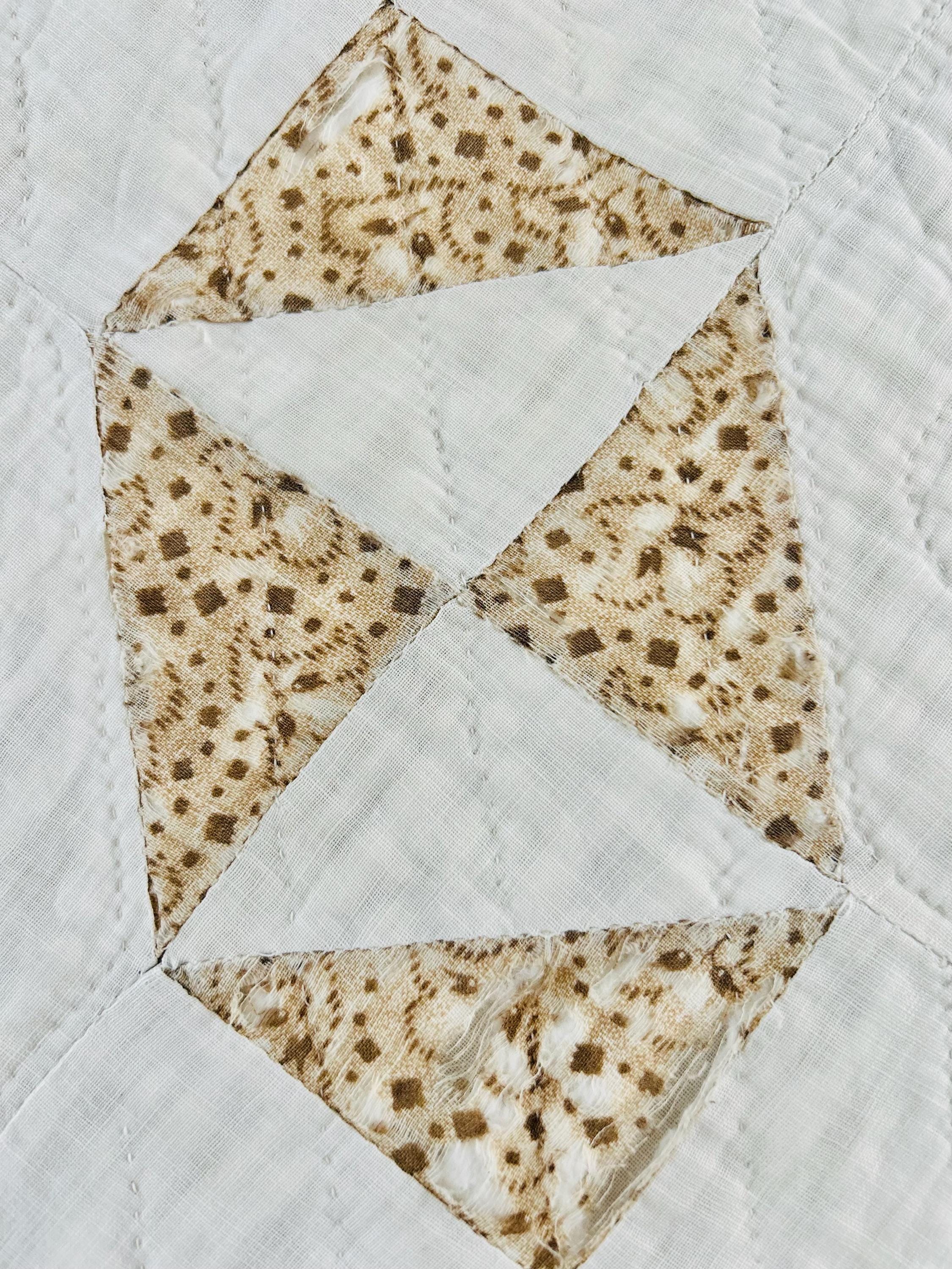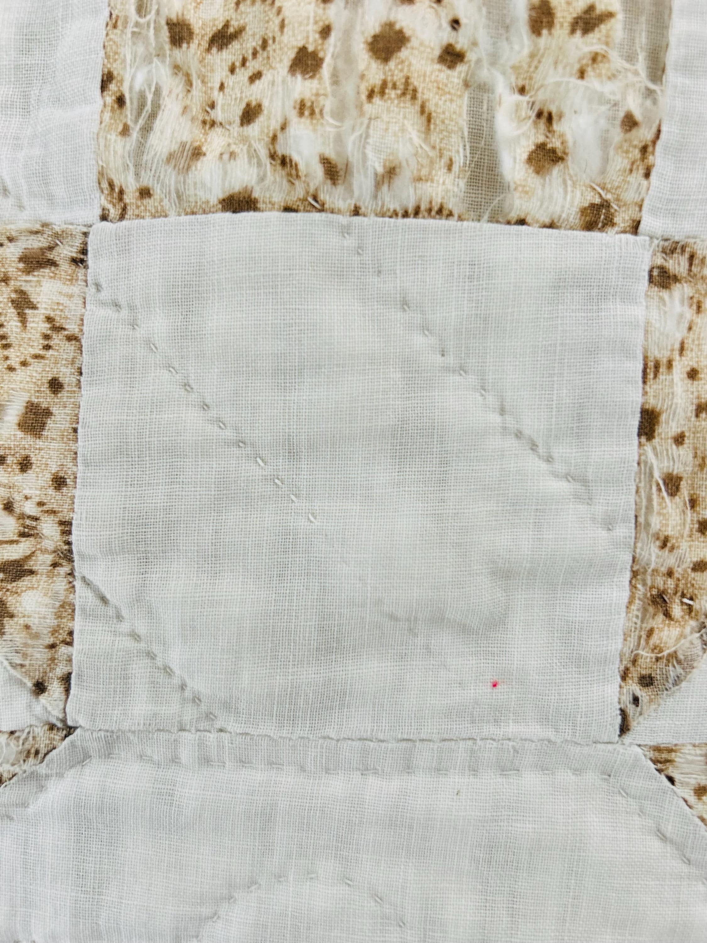 Unfortunately this quilt is in poor or cutter condition due to extensive fabric loss on many of the tan print blocks and a very frayed binding.