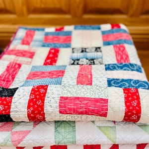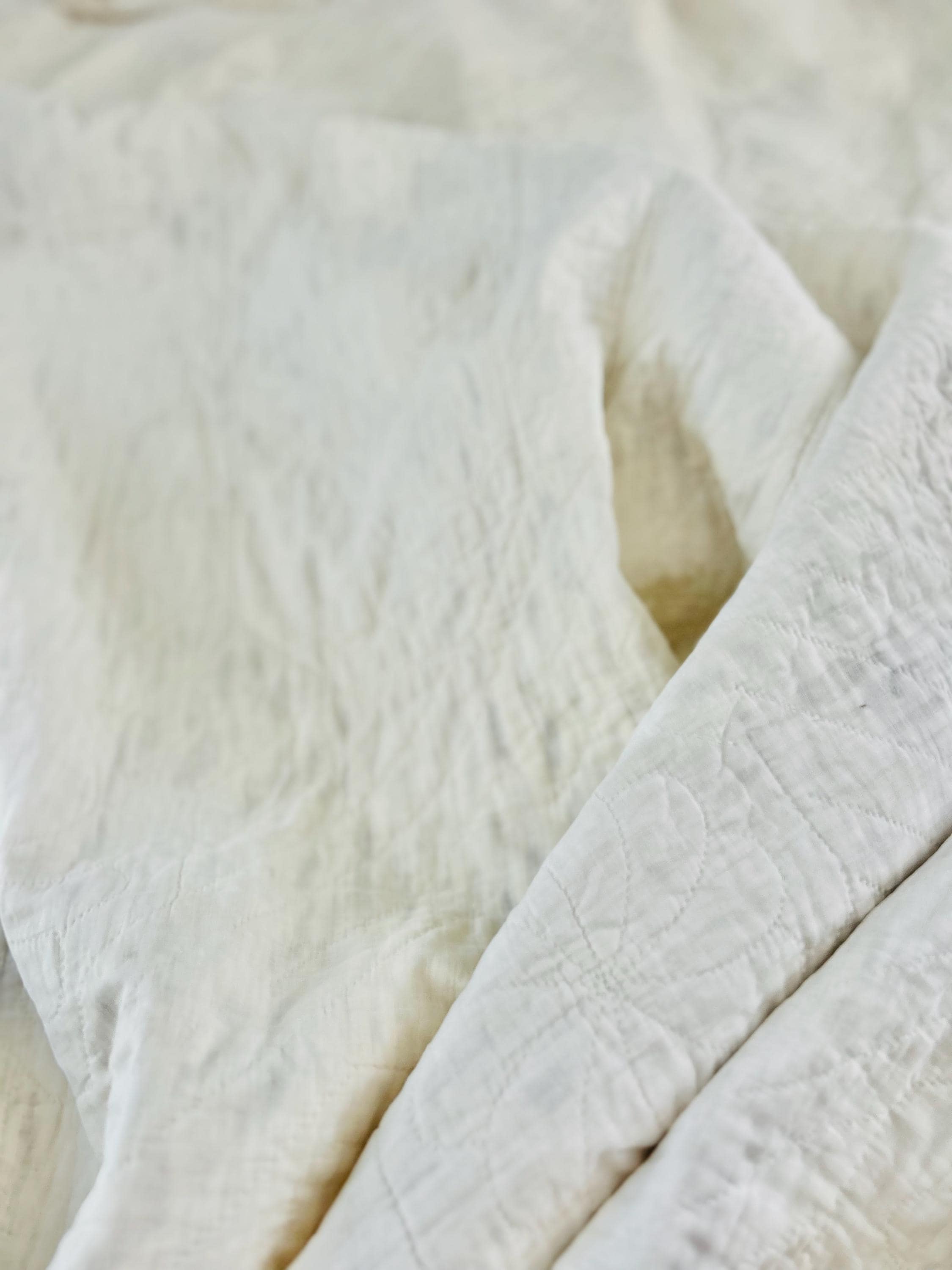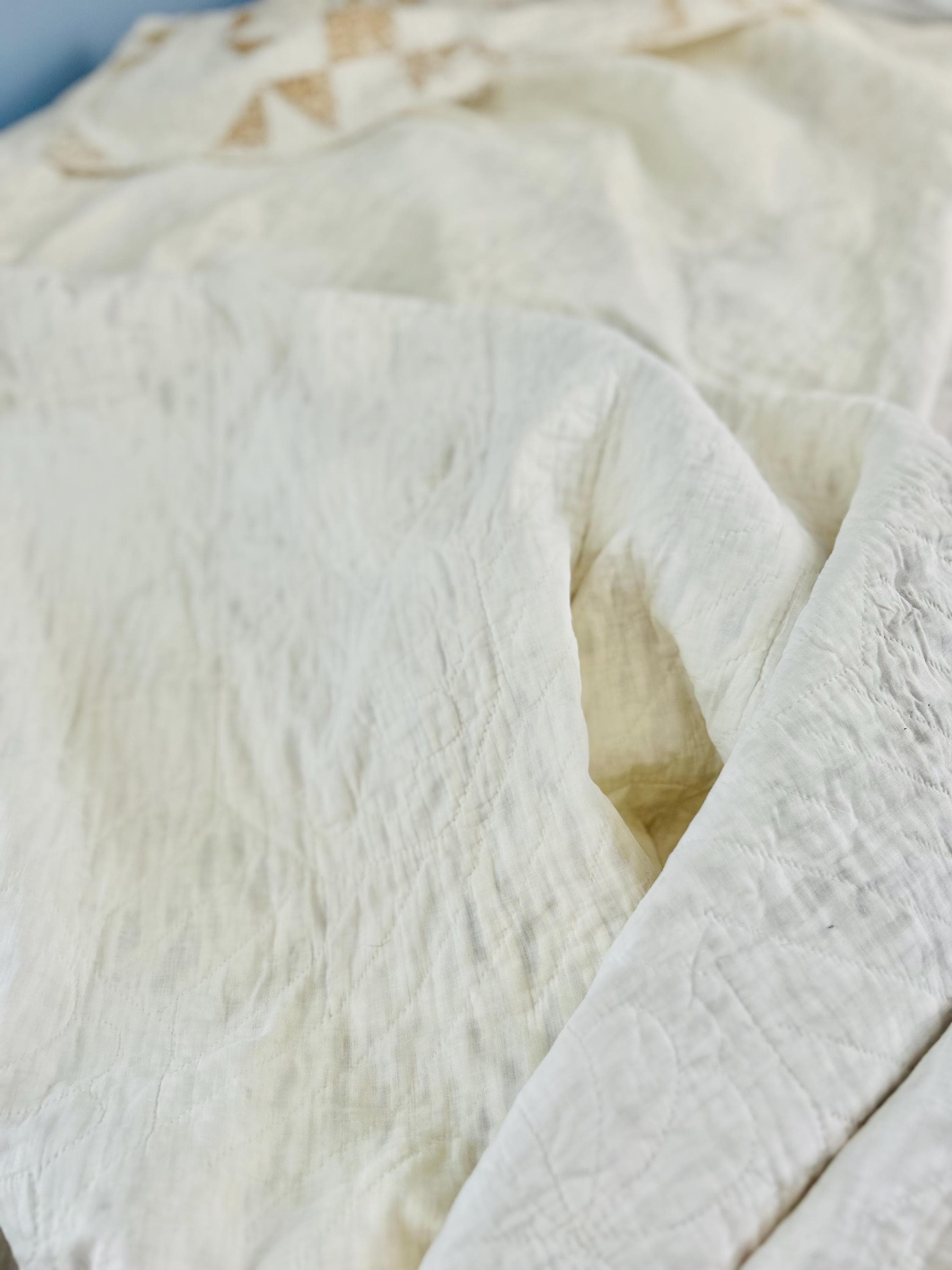 The quilt has been soaked, hand-washed and line-dried. It is clean and soft and measures 72 inches by 75 inches. From a smoke-free, pet-free home. Shown on a queen bed.