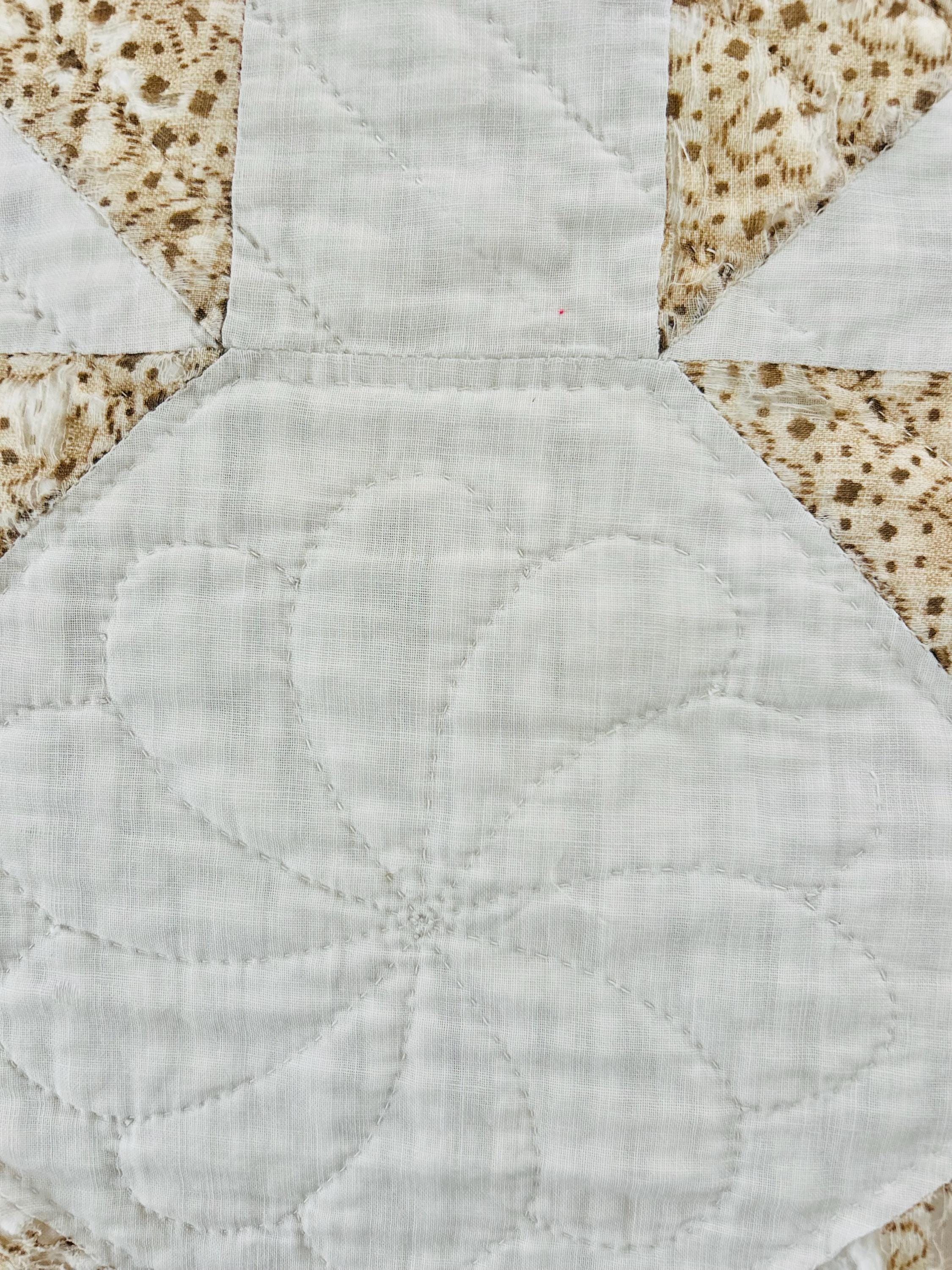 This lovely Old Maid's Puzzle Quilt, circa 1915-1930s, has been hand-quilted with precise rosettes in the white patches and in diagonals through the rest of the quilt.