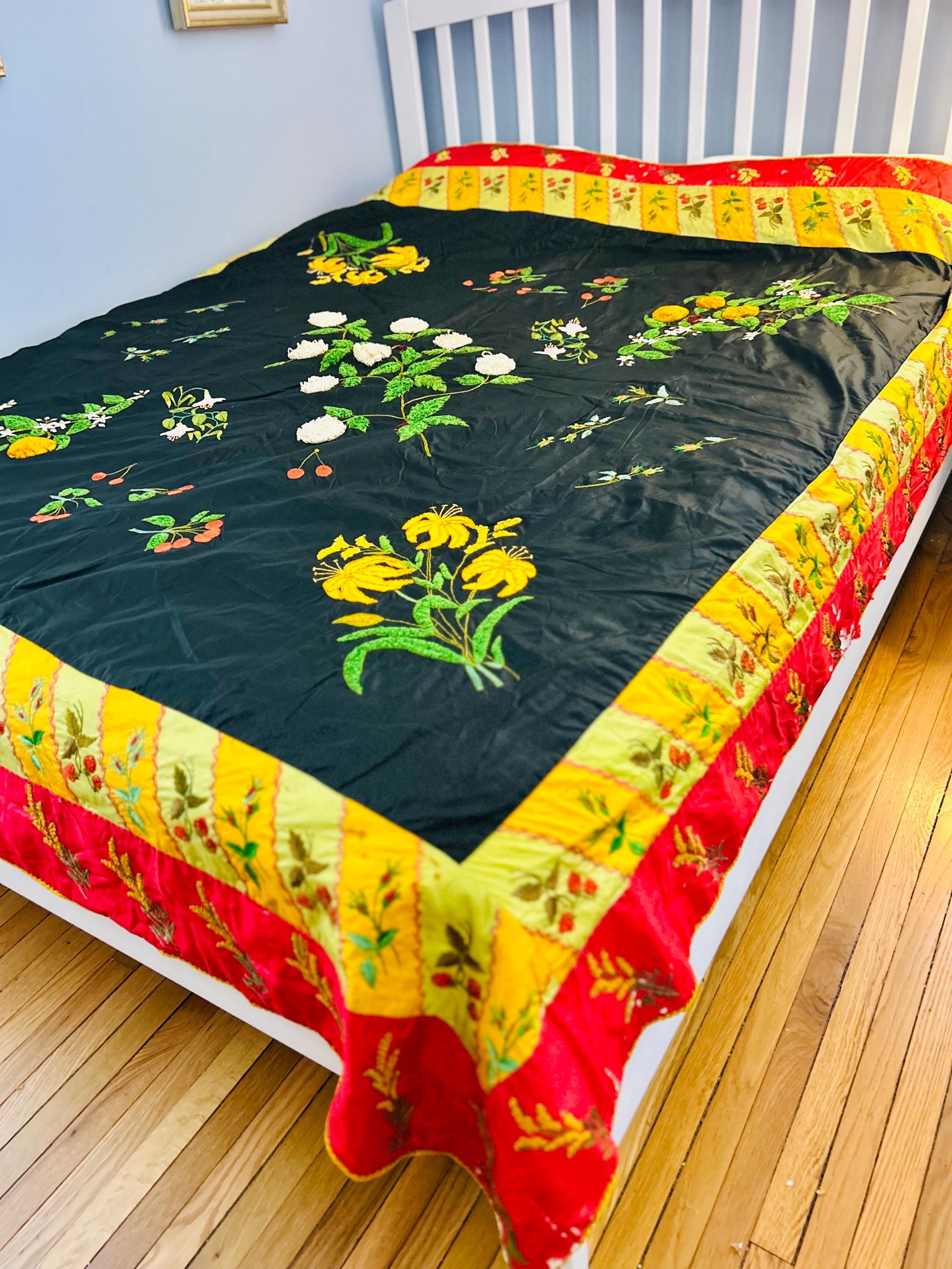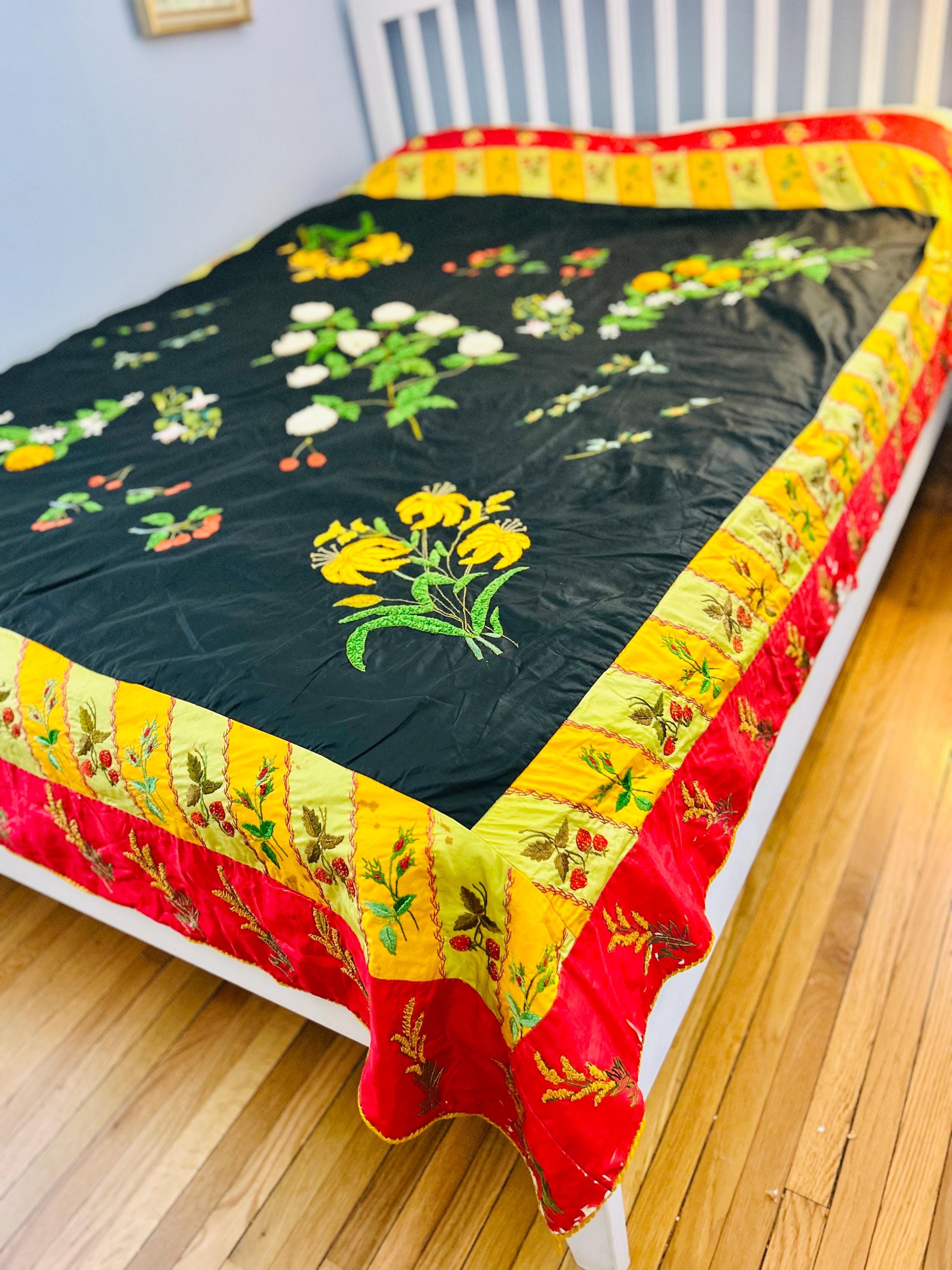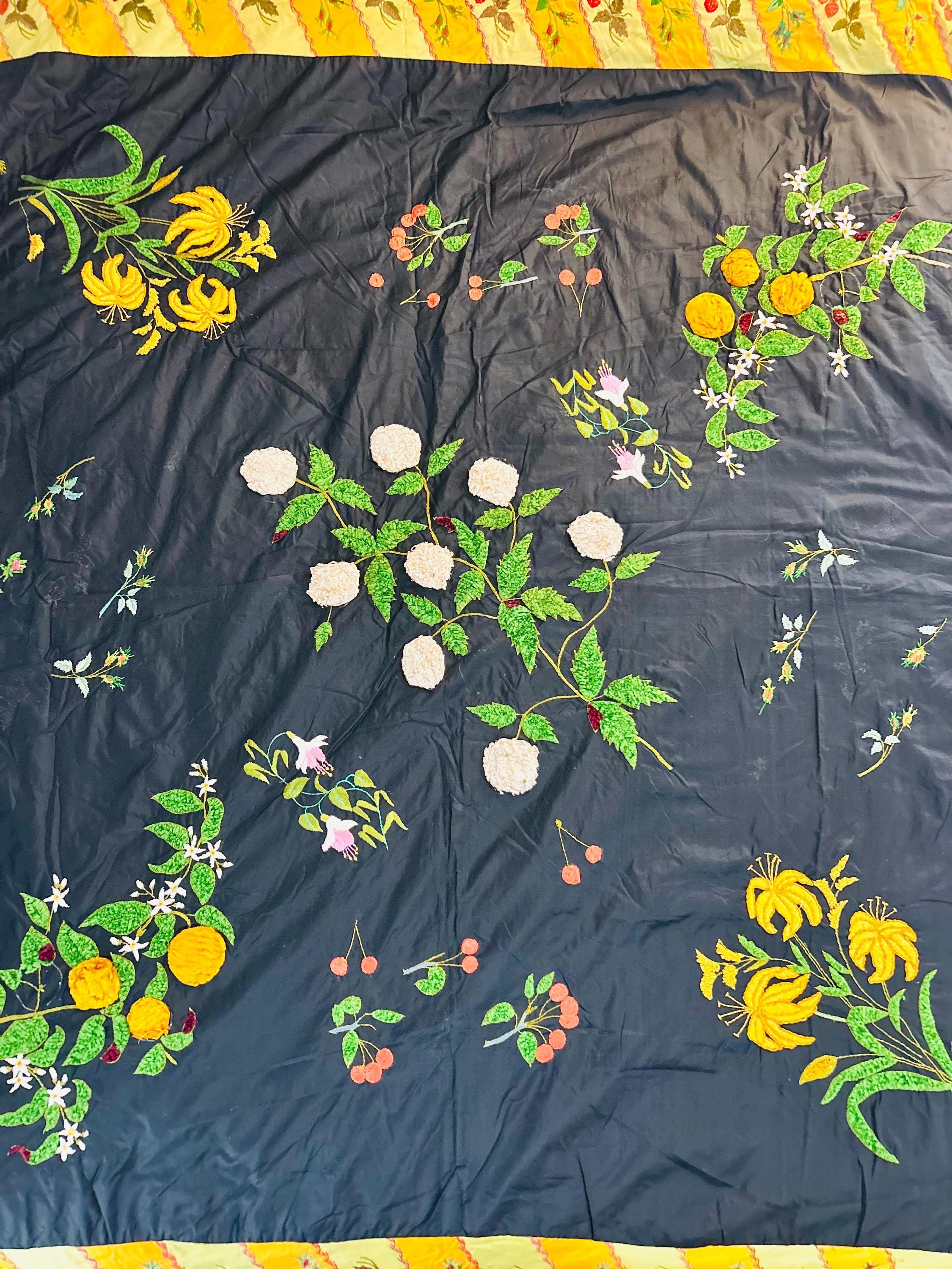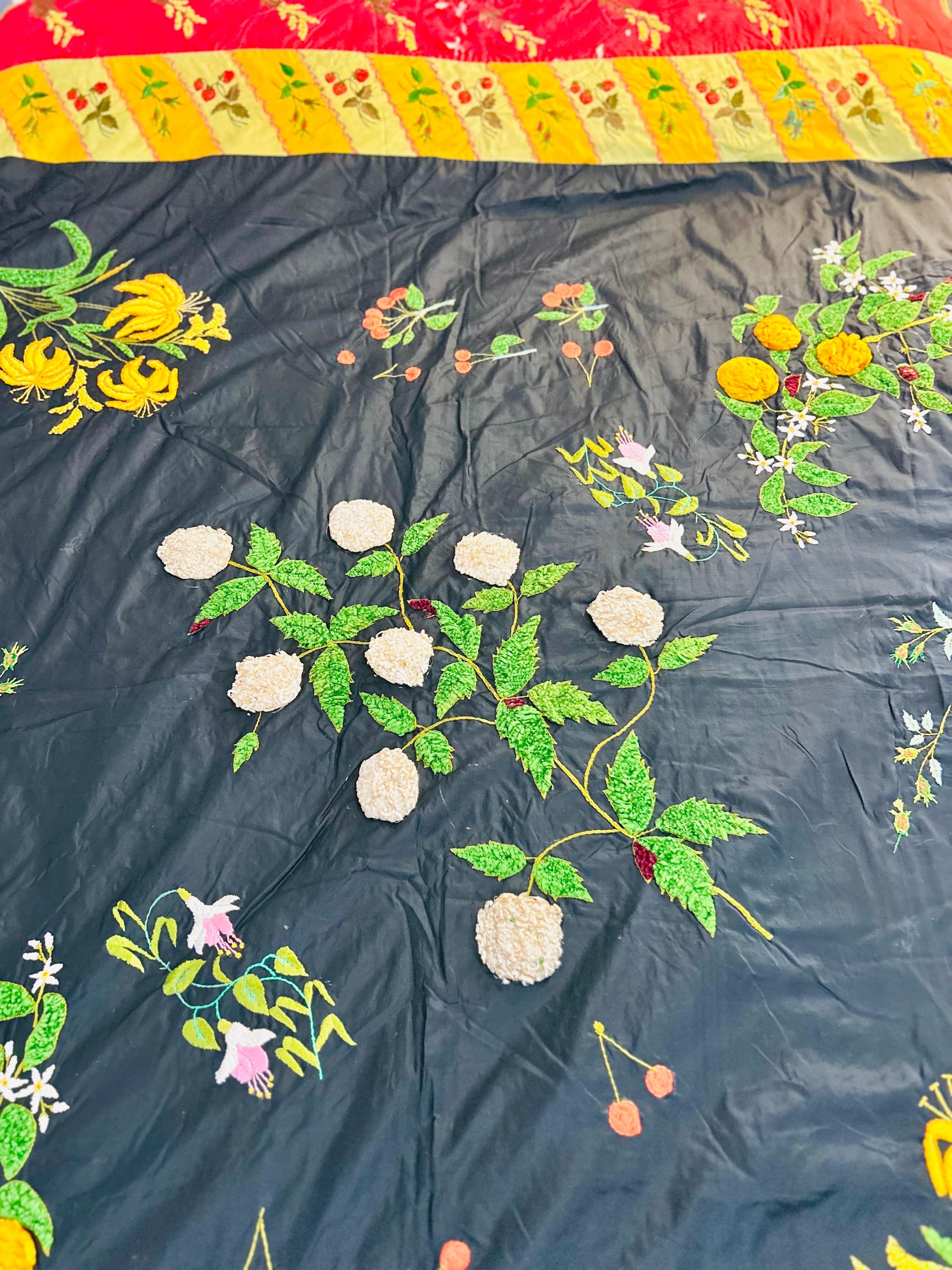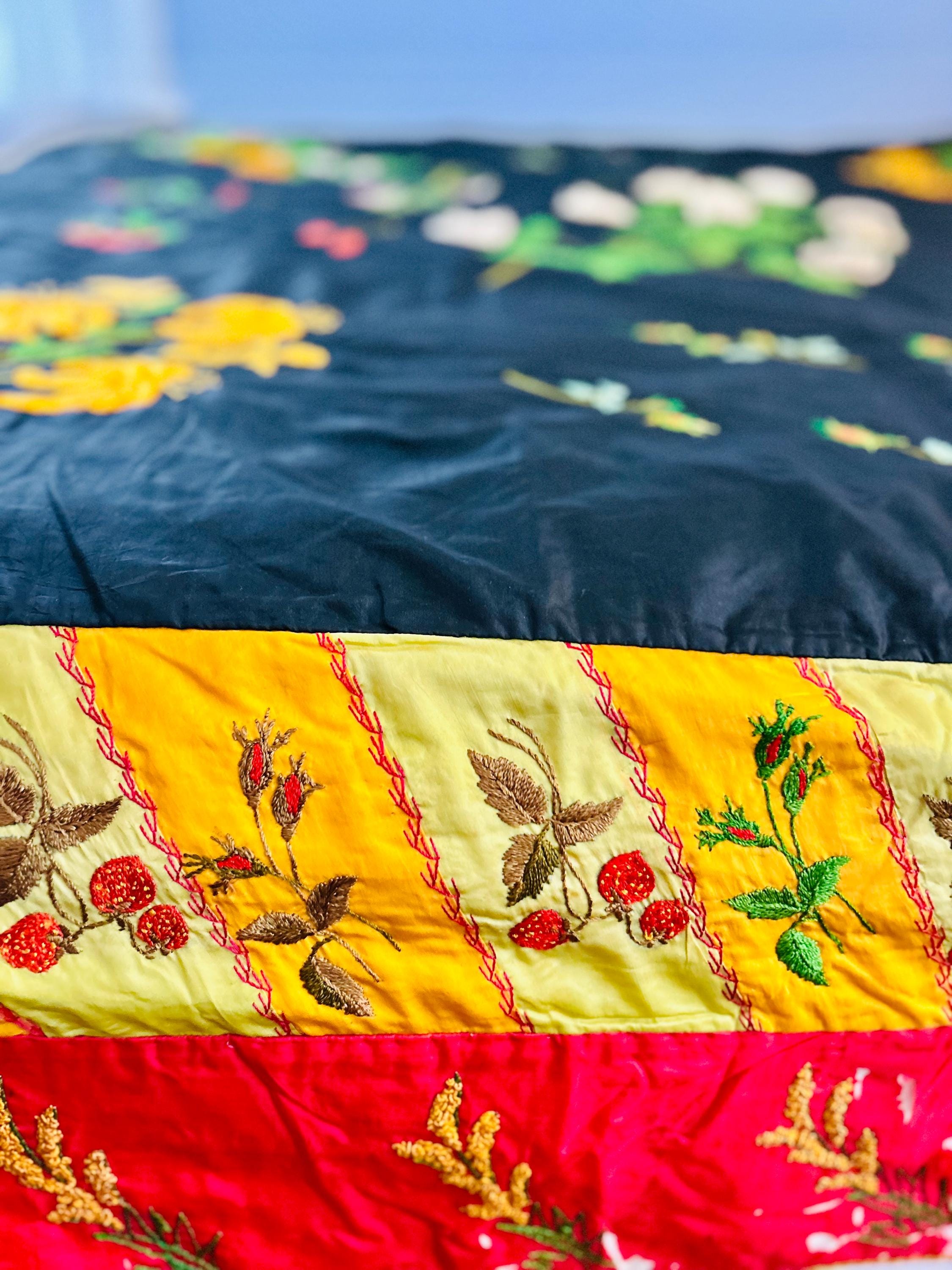 The border is beautifully worked with hand-embroidered, repeating strawberry vines on alternating red and yellow silk panels, which contrasts strikingly with the black silk body of the quilt, demonstrating an Art-Nouveau-influenced design not often found in surviving quilts.